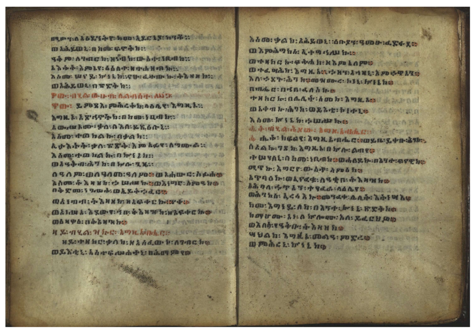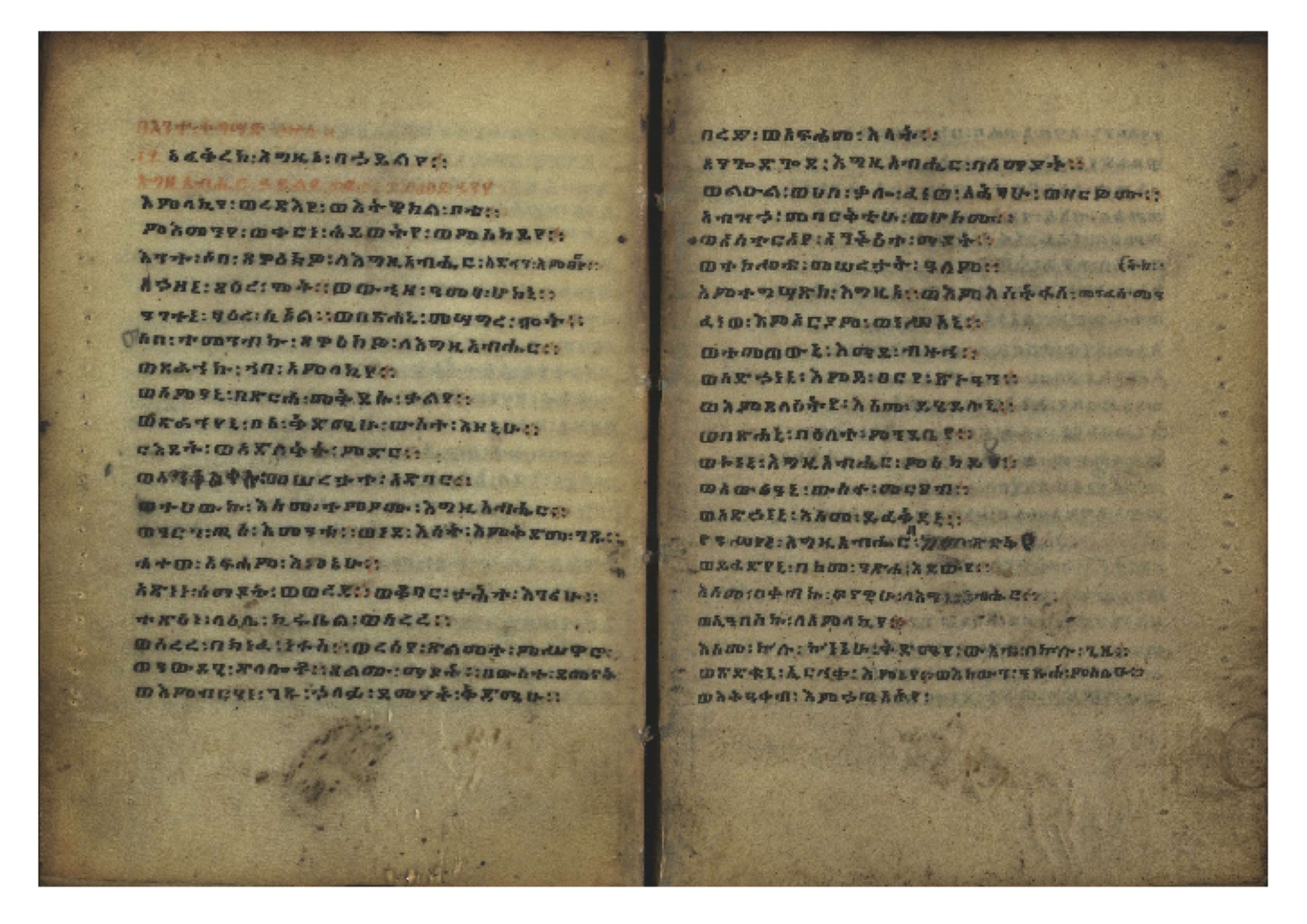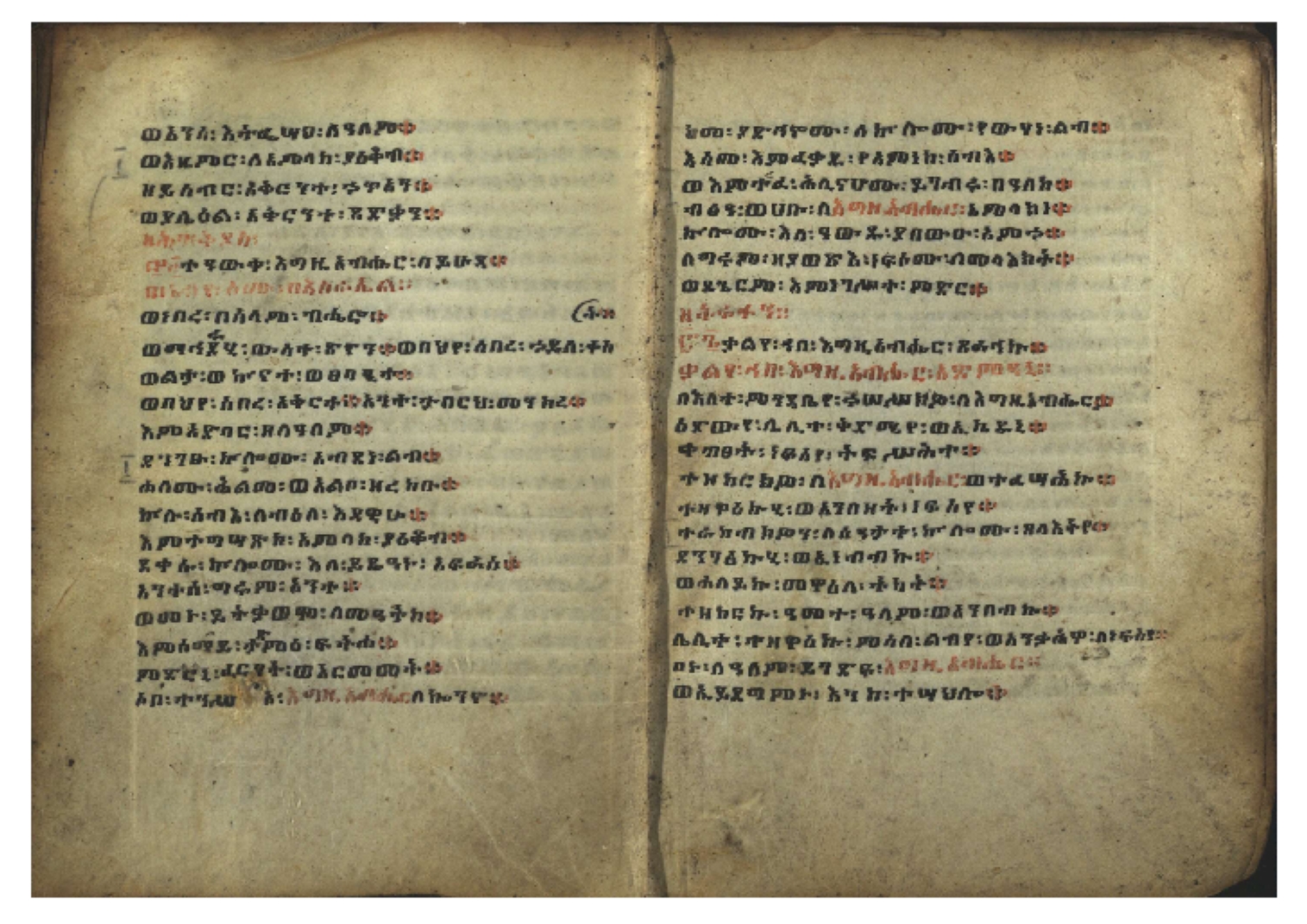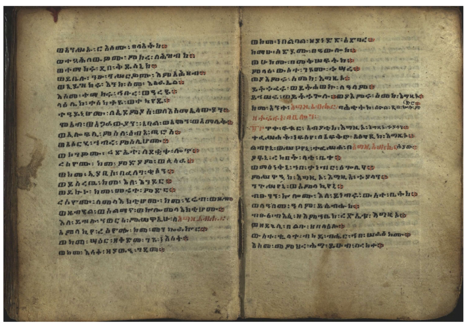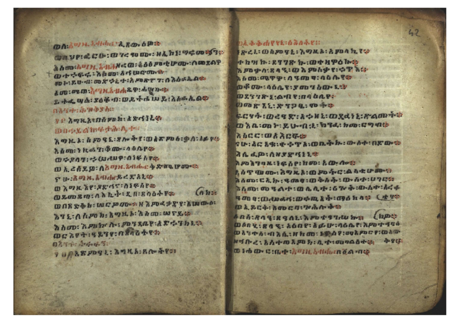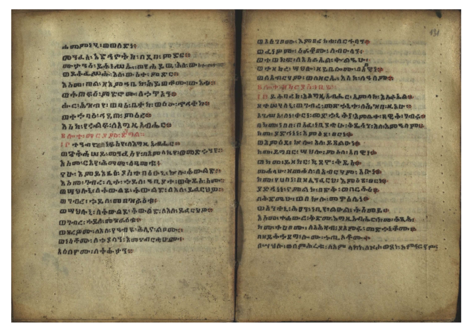 1. F. 1r–v: Mälkǝʾ-hymn to St Michael (Chaine nr. 119), written in an inaccurate hand. The words ሰላም፡ and ሚካኤል፡ are rubricated. Incipit: ሰላም፡ ለዝክረ፡ ስምከ፡ ምስለ፡ ስመ፡ ልዑል፡ ዘተሳተፈ። ወልደ፡ ያሬድ፡ ሄኖክ፡ በከመ፡ ጸሐፈ፡ ሶበ፡ እጼ<ውዕ፡> ስመከ፡ ከሲትየ፡ አፈ፡ ረዳኤ።. The text is incomplete. 2. Ff. 1v–2v: pen trials and other minor scribbles in pencil. 3. F. 156rb–v: Note on the commission of the manuscript, written in Amharic. It mentions the commissioner Aläqa Wäldä Śǝllase and the recipient Lǝǧǧ Abärra Nǝguse. Incipit: መጋቢት፡ ፲፩ቀን፡ አለቃ፡ ወልደ፡ ሥላሴ፡ ለልጅ፡ አበራ፡ ንጉሴ፡ የብራና፡ ዳዊት፡ ሲሸጥ፡ እማኝ፡ ቄስ፡ ኪዳኑ፡ የልጅ፡ አበራ፡ የሸቃ፡. ተእምራ(156v)ት፡ መድህን፡ አለቃ፡ ሐደረ፡ በሶስት፡ ብር፡ ታላድ፡ ሶሽጥ፡ በሶስት፡ ብር፡ ታላድ፡ ሺገዛ፡ ፈጣሚ፡ ብላ፡ ገብሩ፡. |