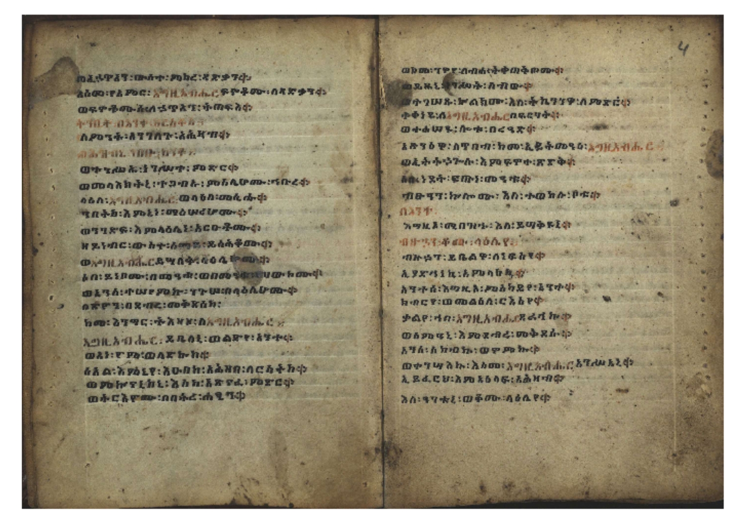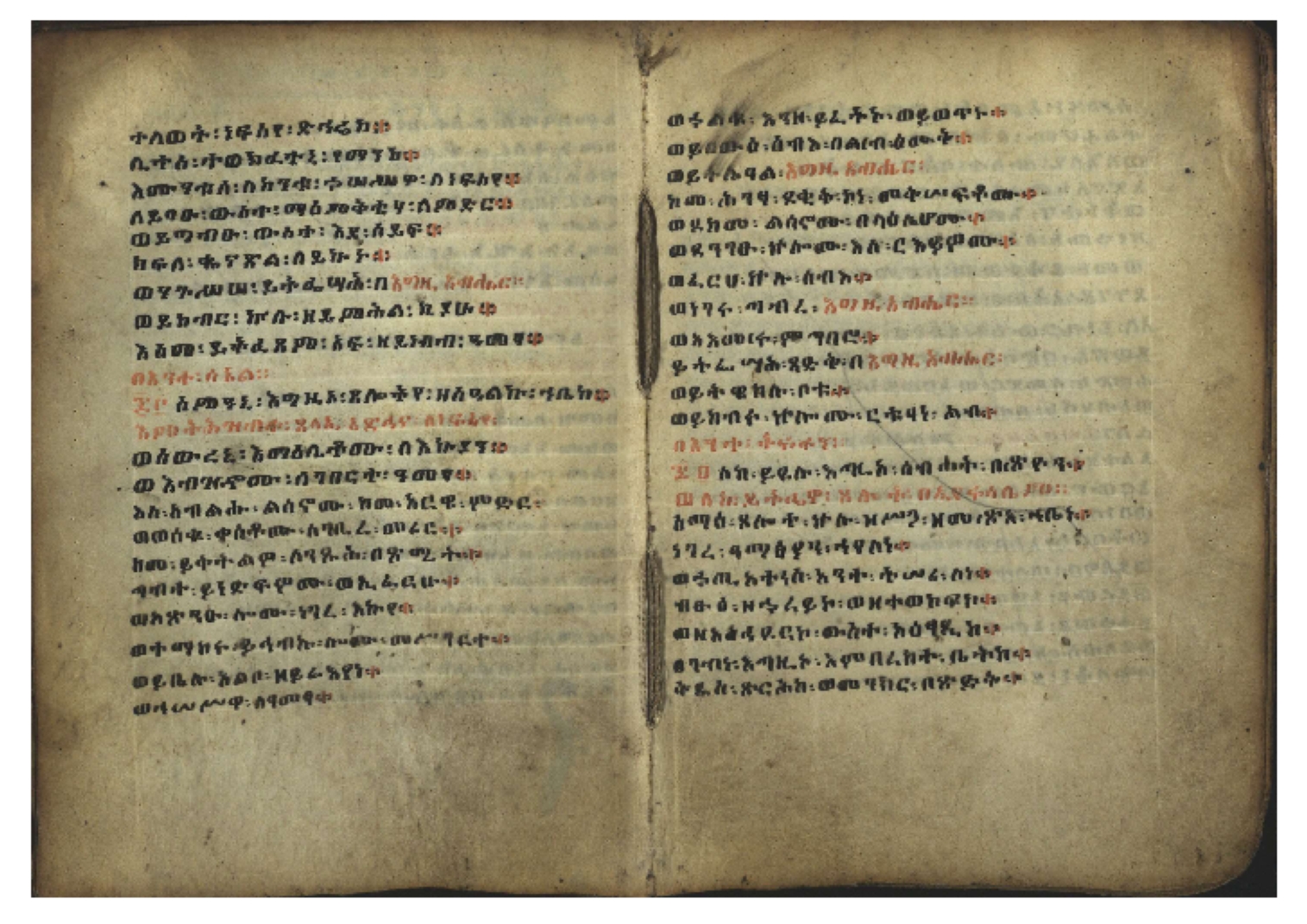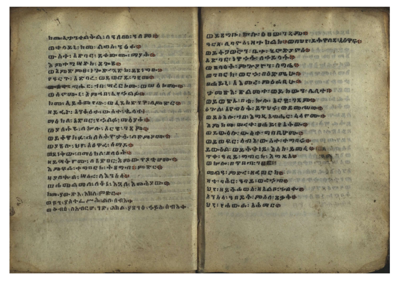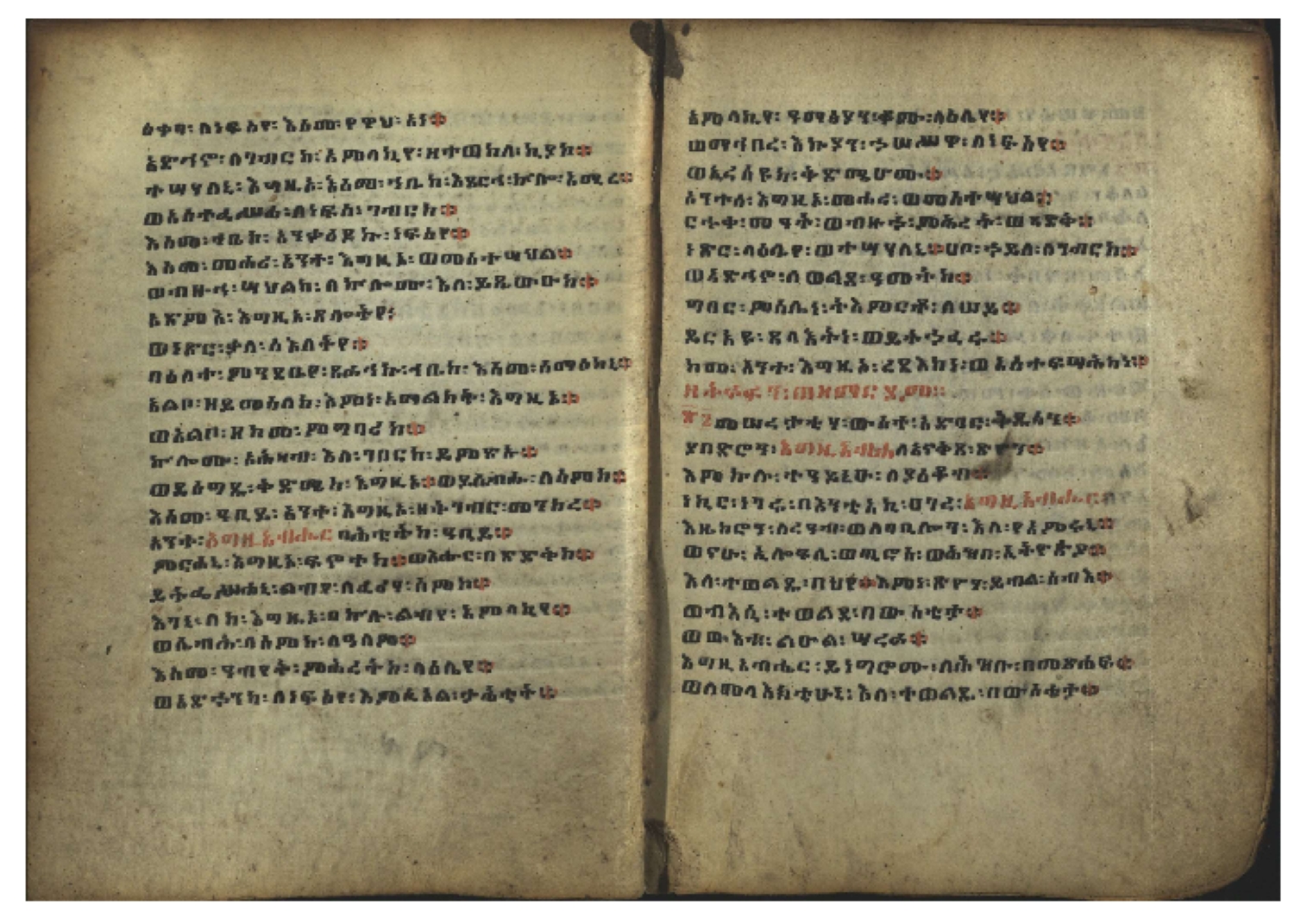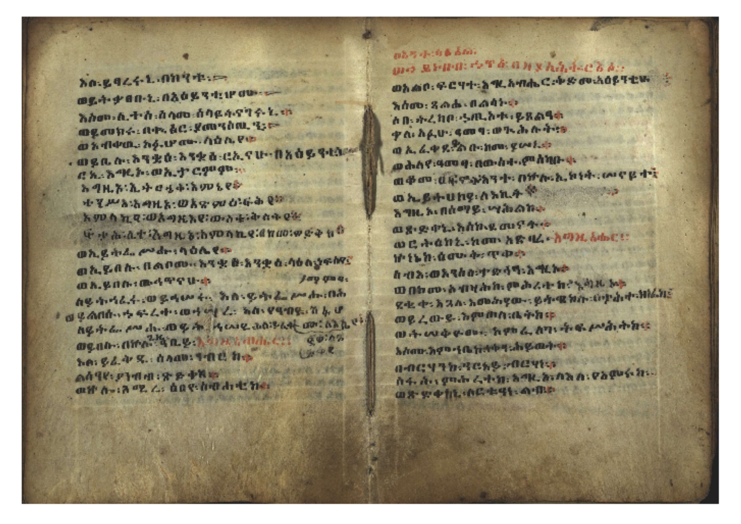 1. F. 1r–v: Mälkǝʾ-hymn to St Michael (Chaine nr. 119), written in an inaccurate hand. The words ሰላም፡ and ሚካኤል፡ are rubricated. Incipit: ሰላም፡ ለዝክረ፡ ስምከ፡ ምስለ፡ ስመ፡ ልዑል፡ ዘተሳተፈ። ወልደ፡ ያሬድ፡ ሄኖክ፡ በከመ፡ ጸሐፈ፡ ሶበ፡ እጼ<ውዕ፡> ስመከ፡ ከሲትየ፡ አፈ፡ ረዳኤ።. The text is incomplete. 2. Ff. 1v–2v: pen trials and other minor scribbles in pencil. 3. F. 156rb–v: Note on the commission of the manuscript, written in Amharic. It mentions the commissioner Aläqa Wäldä Śǝllase and the recipient Lǝǧǧ Abärra Nǝguse. Incipit: መጋቢት፡ ፲፩ቀን፡ አለቃ፡ ወልደ፡ ሥላሴ፡ ለልጅ፡ አበራ፡ ንጉሴ፡ የብራና፡ ዳዊት፡ ሲሸጥ፡ እማኝ፡ ቄስ፡ ኪዳኑ፡ የልጅ፡ አበራ፡ የሸቃ፡. ተእምራ(156v)ት፡ መድህን፡ አለቃ፡ ሐደረ፡ በሶስት፡ ብር፡ ታላድ፡ ሶሽጥ፡ በሶስት፡ ብር፡ ታላድ፡ ሺገዛ፡ ፈጣሚ፡ ብላ፡ ገብሩ፡. |