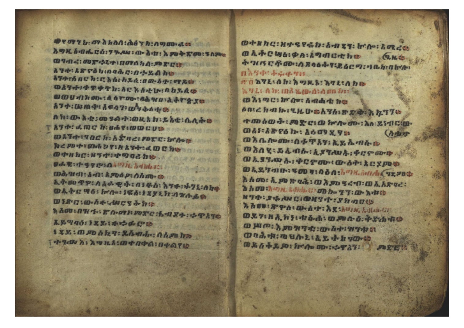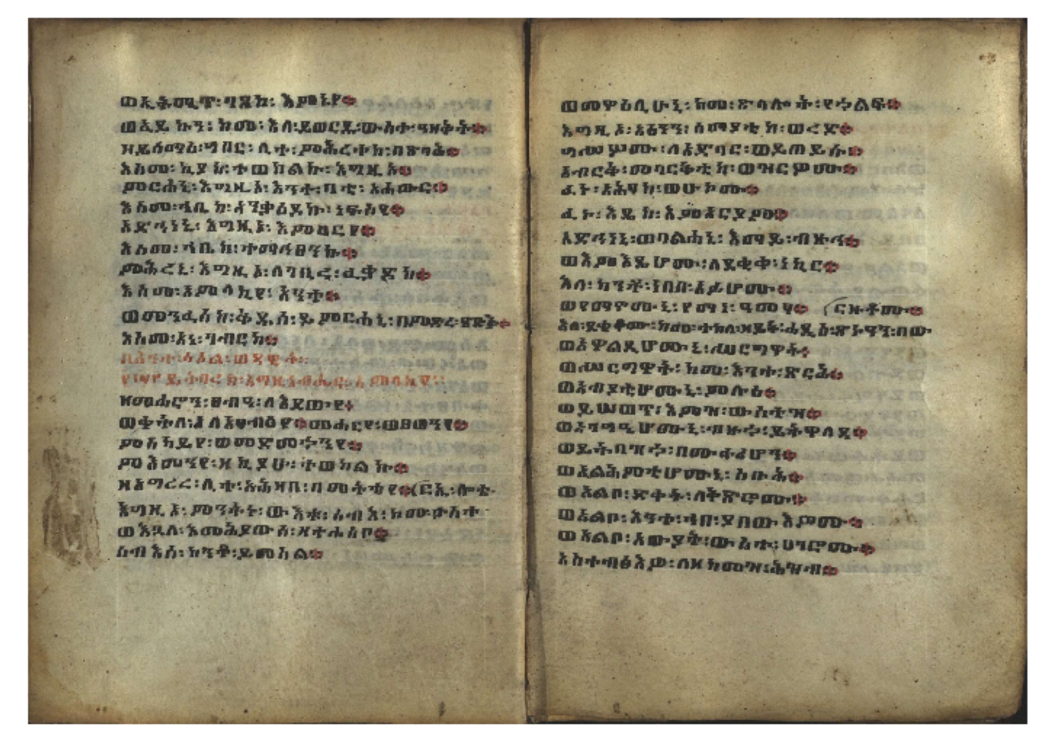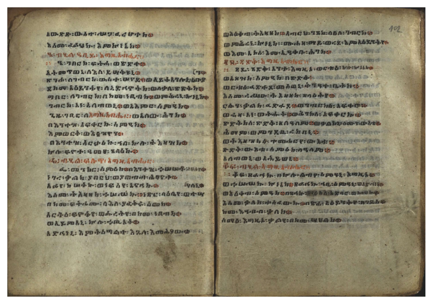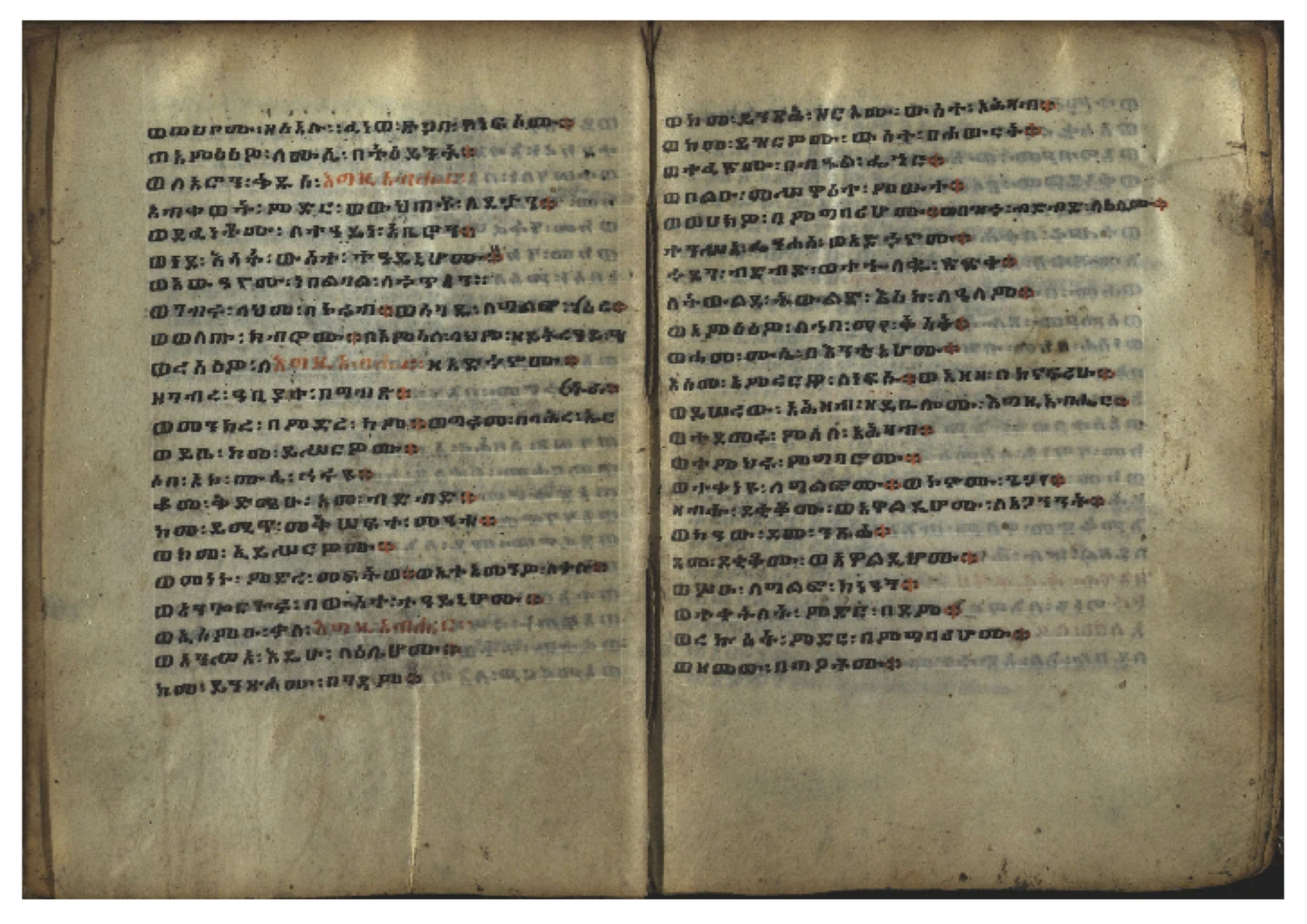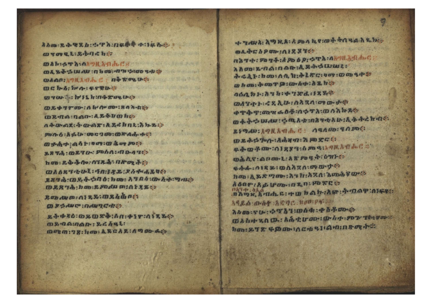1. F. 1r–v: Mälkǝʾ-hymn to St Michael (Chaine nr. 119), written in an inaccurate hand. The words ሰላም፡ and ሚካኤል፡ are rubricated. Incipit: ሰላም፡ ለዝክረ፡ ስምከ፡ ምስለ፡ ስመ፡ ልዑል፡ ዘተሳተፈ። ወልደ፡ ያሬድ፡ ሄኖክ፡ በከመ፡ ጸሐፈ፡ ሶበ፡ እጼ<ውዕ፡> ስመከ፡ ከሲትየ፡ አፈ፡ ረዳኤ።. The text is incomplete. 2. Ff. 1v–2v: pen trials and other minor scribbles in pencil. 3. F. 156rb–v: Note on the commission of the manuscript, written in Amharic. It mentions the commissioner Aläqa Wäldä Śǝllase and the recipient Lǝǧǧ Abärra Nǝguse. Incipit: መጋቢት፡ ፲፩ቀን፡ አለቃ፡ ወልደ፡ ሥላሴ፡ ለልጅ፡ አበራ፡ ንጉሴ፡ የብራና፡ ዳዊት፡ ሲሸጥ፡ እማኝ፡ ቄስ፡ ኪዳኑ፡ የልጅ፡ አበራ፡ የሸቃ፡. ተእምራ(156v)ት፡ መድህን፡ አለቃ፡ ሐደረ፡ በሶስት፡ ብር፡ ታላድ፡ ሶሽጥ፡ በሶስት፡ ብር፡ ታላድ፡ ሺገዛ፡ ፈጣሚ፡ ብላ፡ ገብሩ፡. |