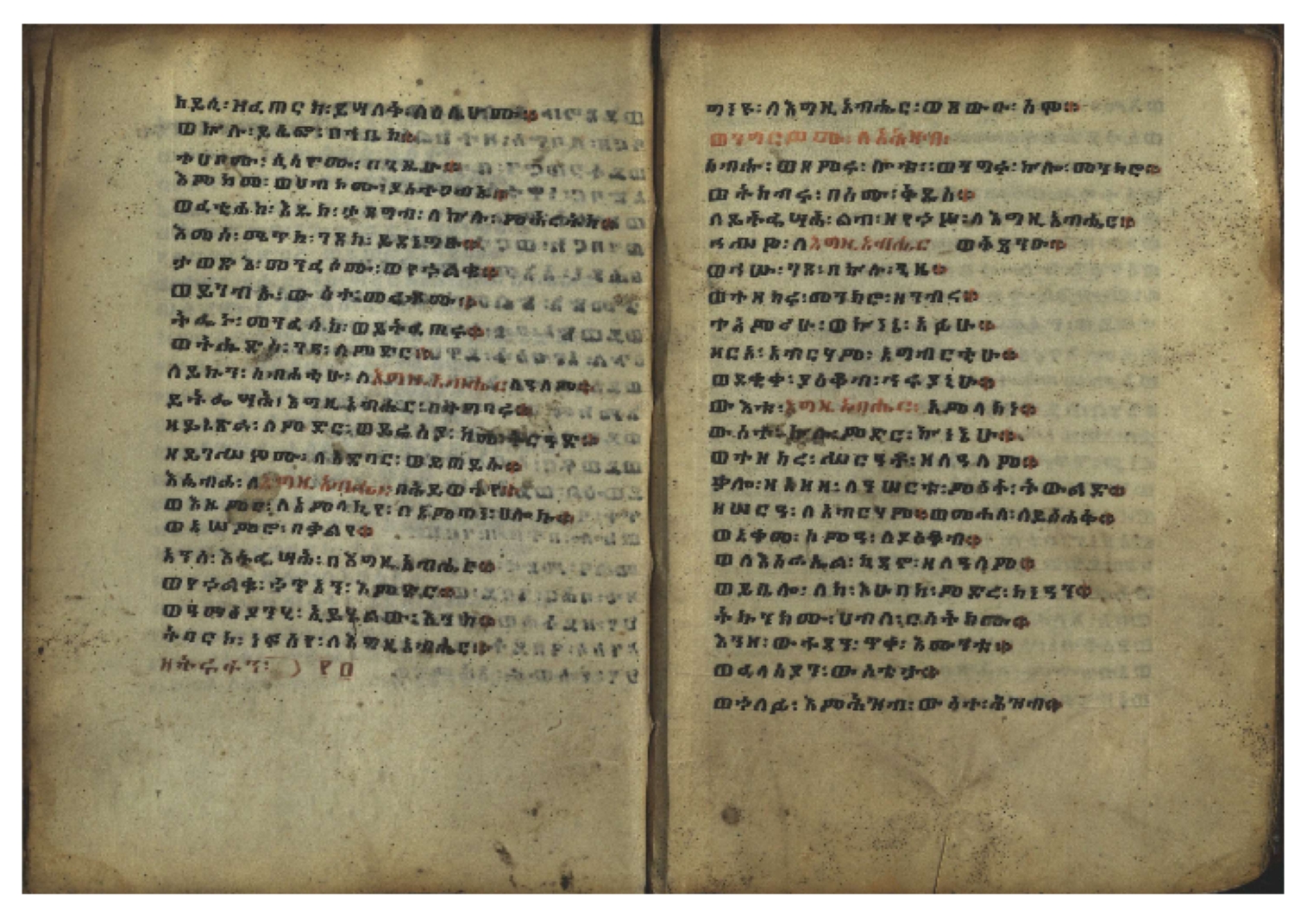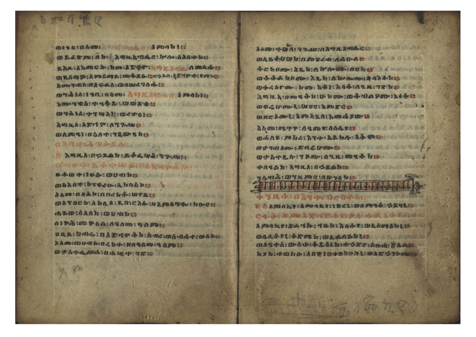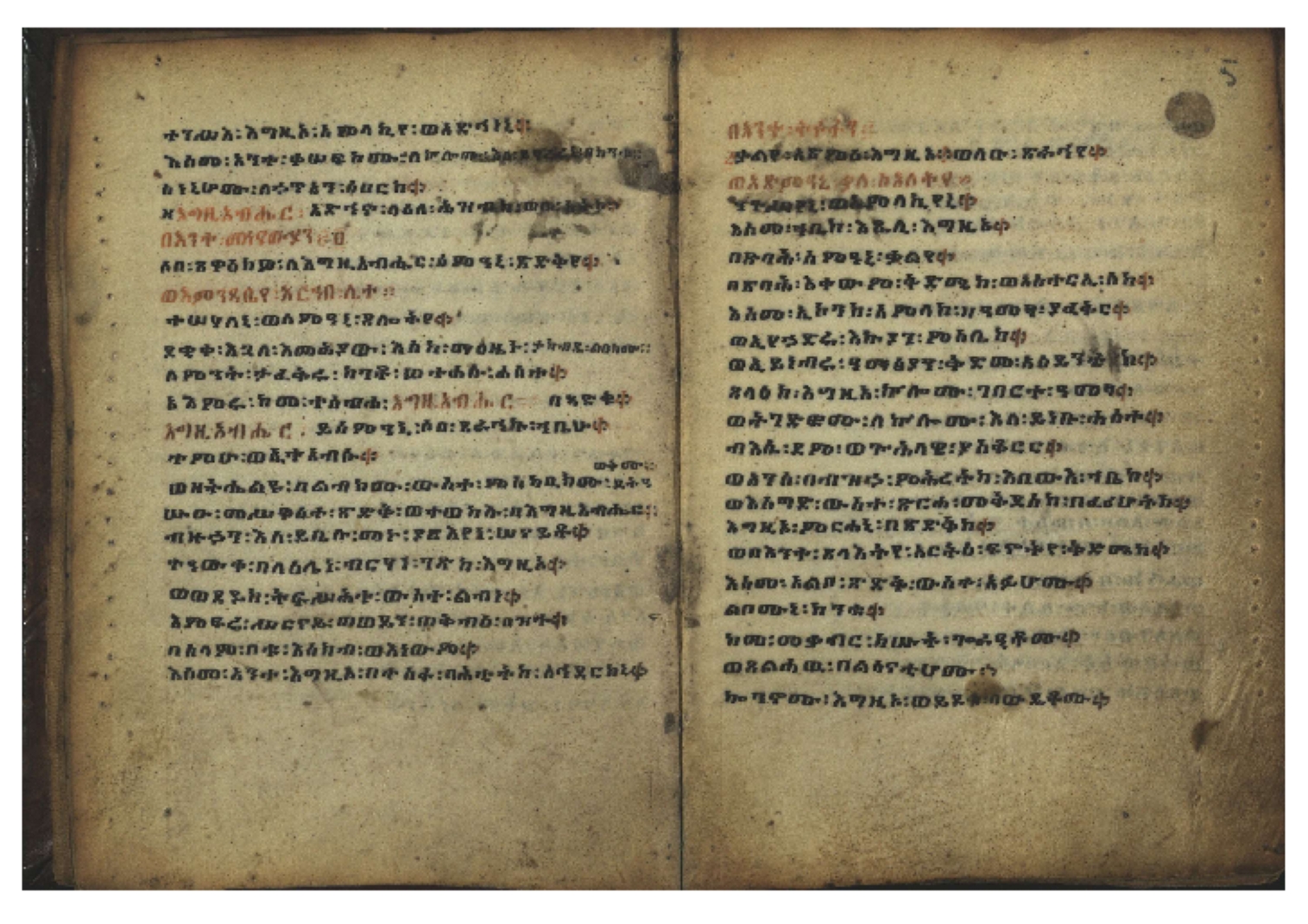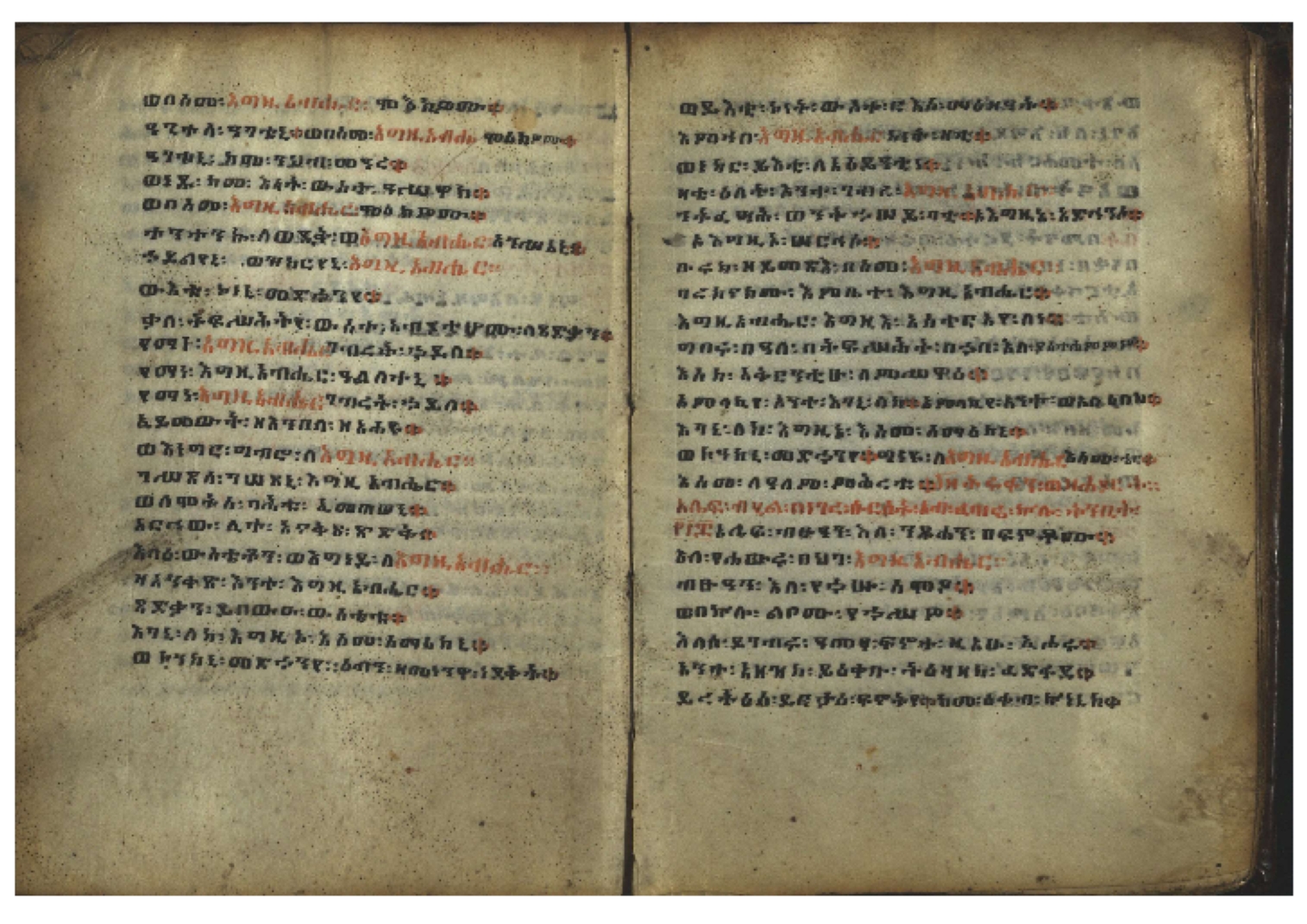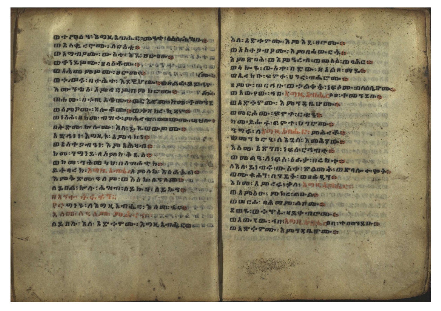 1. F. 1r–v: Mälkǝʾ-hymn to St Michael (Chaine nr. 119), written in an inaccurate hand. The words ሰላም፡ and ሚካኤል፡ are rubricated. Incipit: ሰላም፡ ለዝክረ፡ ስምከ፡ ምስለ፡ ስመ፡ ልዑል፡ ዘተሳተፈ። ወልደ፡ ያሬድ፡ ሄኖክ፡ በከመ፡ ጸሐፈ፡ ሶበ፡ እጼ<ውዕ፡> ስመከ፡ ከሲትየ፡ አፈ፡ ረዳኤ።. The text is incomplete. 2. Ff. 1v–2v: pen trials and other minor scribbles in pencil. 3. F. 156rb–v: Note on the commission of the manuscript, written in Amharic. It mentions the commissioner Aläqa Wäldä Śǝllase and the recipient Lǝǧǧ Abärra Nǝguse. Incipit: መጋቢት፡ ፲፩ቀን፡ አለቃ፡ ወልደ፡ ሥላሴ፡ ለልጅ፡ አበራ፡ ንጉሴ፡ የብራና፡ ዳዊት፡ ሲሸጥ፡ እማኝ፡ ቄስ፡ ኪዳኑ፡ የልጅ፡ አበራ፡ የሸቃ፡. ተእምራ(156v)ት፡ መድህን፡ አለቃ፡ ሐደረ፡ በሶስት፡ ብር፡ ታላድ፡ ሶሽጥ፡ በሶስት፡ ብር፡ ታላድ፡ ሺገዛ፡ ፈጣሚ፡ ብላ፡ ገብሩ፡. |