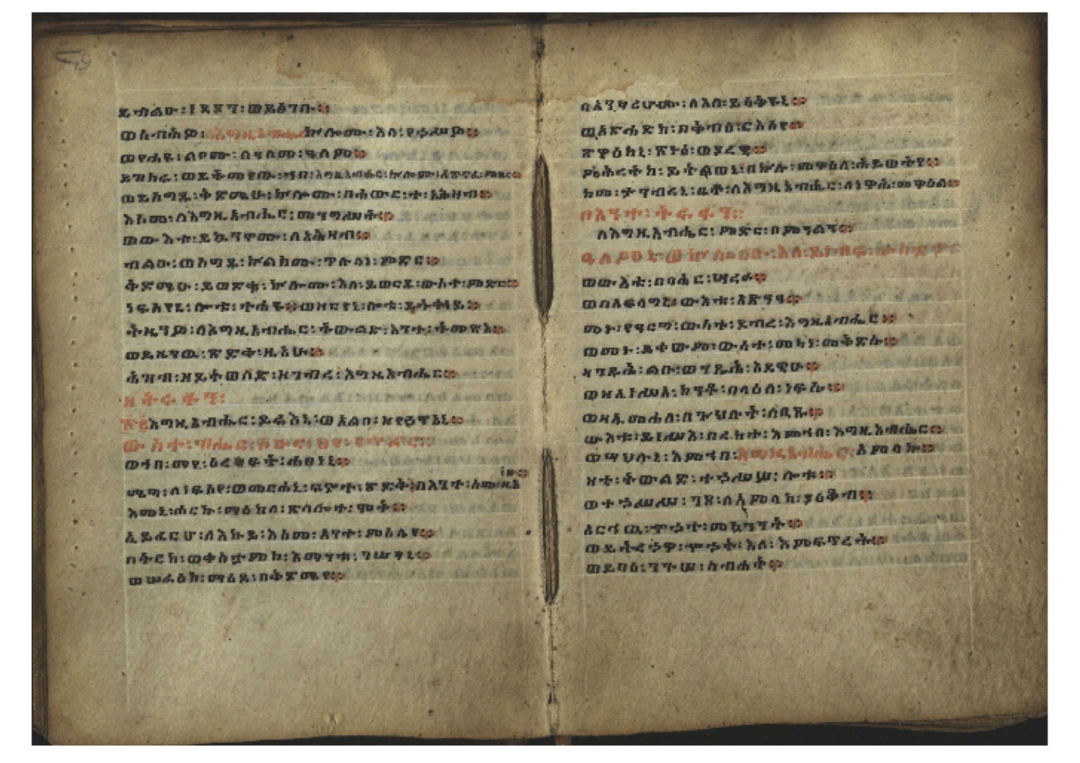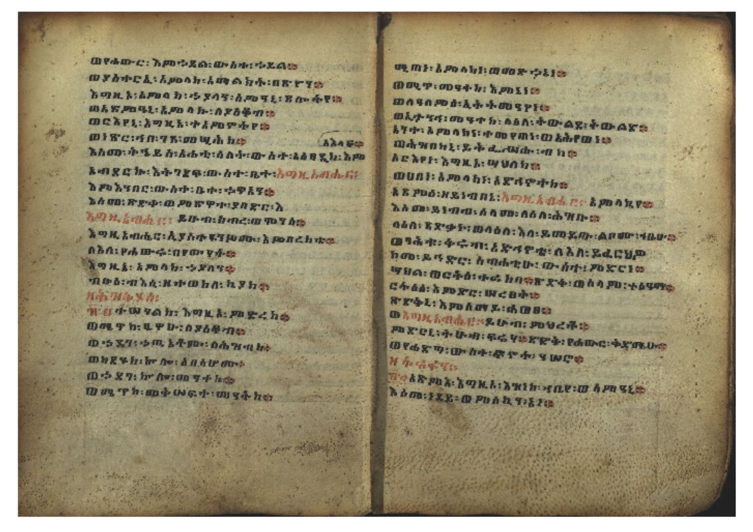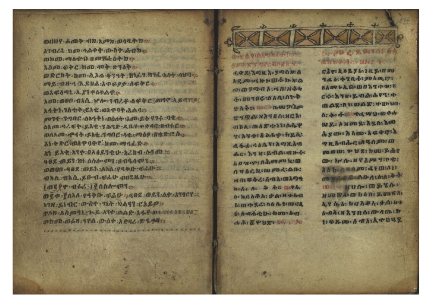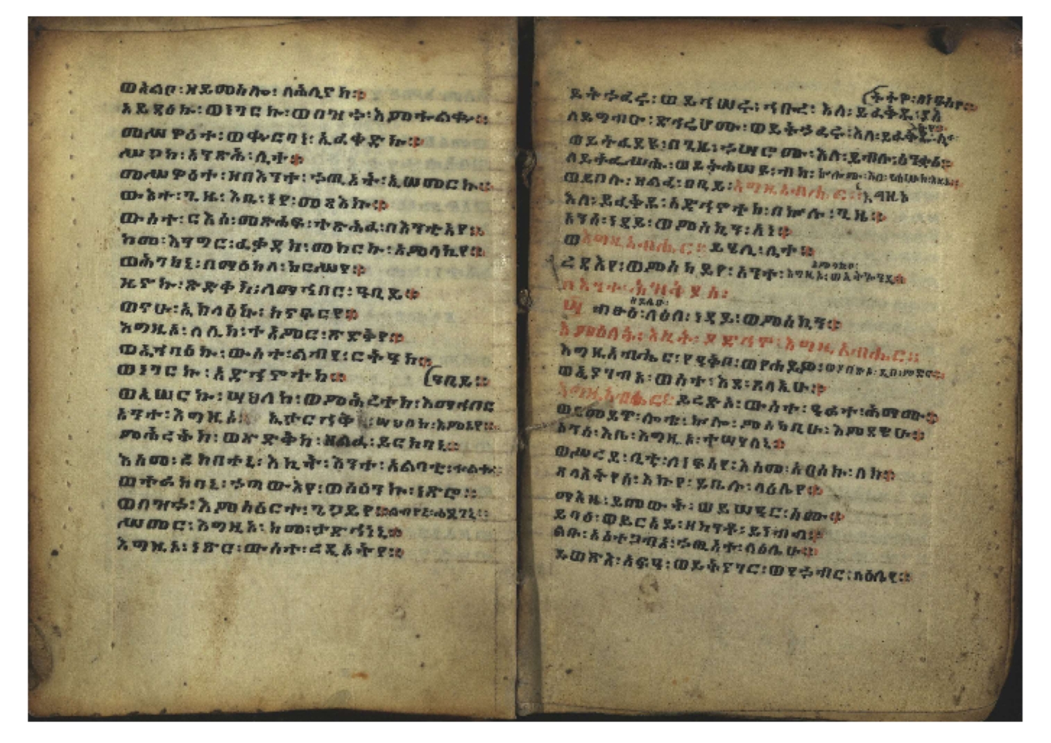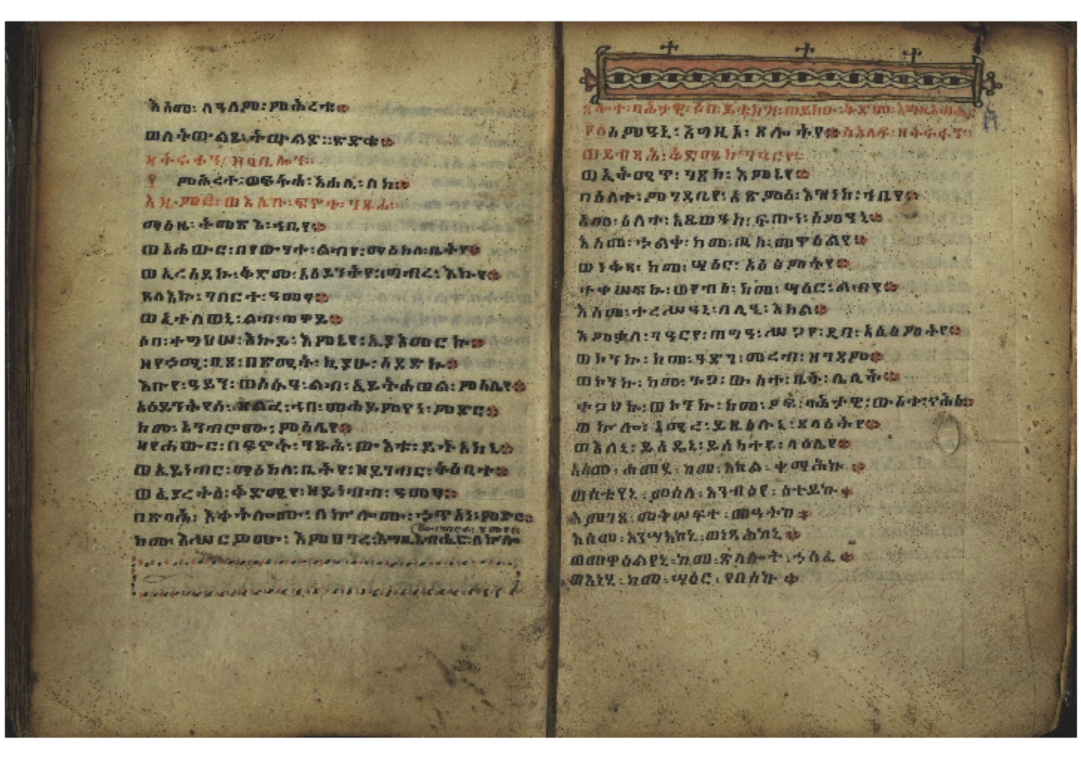 1. F. 1r–v: Mälkǝʾ-hymn to St Michael (Chaine nr. 119), written in an inaccurate hand. The words ሰላም፡ and ሚካኤል፡ are rubricated. Incipit: ሰላም፡ ለዝክረ፡ ስምከ፡ ምስለ፡ ስመ፡ ልዑል፡ ዘተሳተፈ። ወልደ፡ ያሬድ፡ ሄኖክ፡ በከመ፡ ጸሐፈ፡ ሶበ፡ እጼ<ውዕ፡> ስመከ፡ ከሲትየ፡ አፈ፡ ረዳኤ።. The text is incomplete. 2. Ff. 1v–2v: pen trials and other minor scribbles in pencil. 3. F. 156rb–v: Note on the commission of the manuscript, written in Amharic. It mentions the commissioner Aläqa Wäldä Śǝllase and the recipient Lǝǧǧ Abärra Nǝguse. Incipit: መጋቢት፡ ፲፩ቀን፡ አለቃ፡ ወልደ፡ ሥላሴ፡ ለልጅ፡ አበራ፡ ንጉሴ፡ የብራና፡ ዳዊት፡ ሲሸጥ፡ እማኝ፡ ቄስ፡ ኪዳኑ፡ የልጅ፡ አበራ፡ የሸቃ፡. ተእምራ(156v)ት፡ መድህን፡ አለቃ፡ ሐደረ፡ በሶስት፡ ብር፡ ታላድ፡ ሶሽጥ፡ በሶስት፡ ብር፡ ታላድ፡ ሺገዛ፡ ፈጣሚ፡ ብላ፡ ገብሩ፡. |