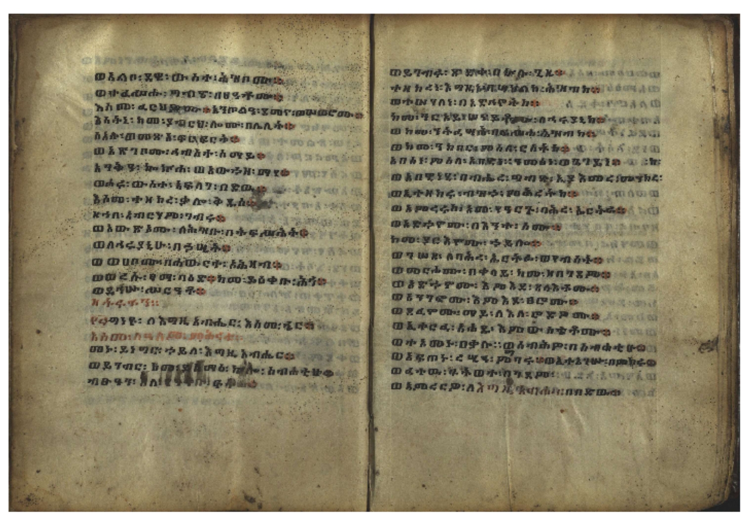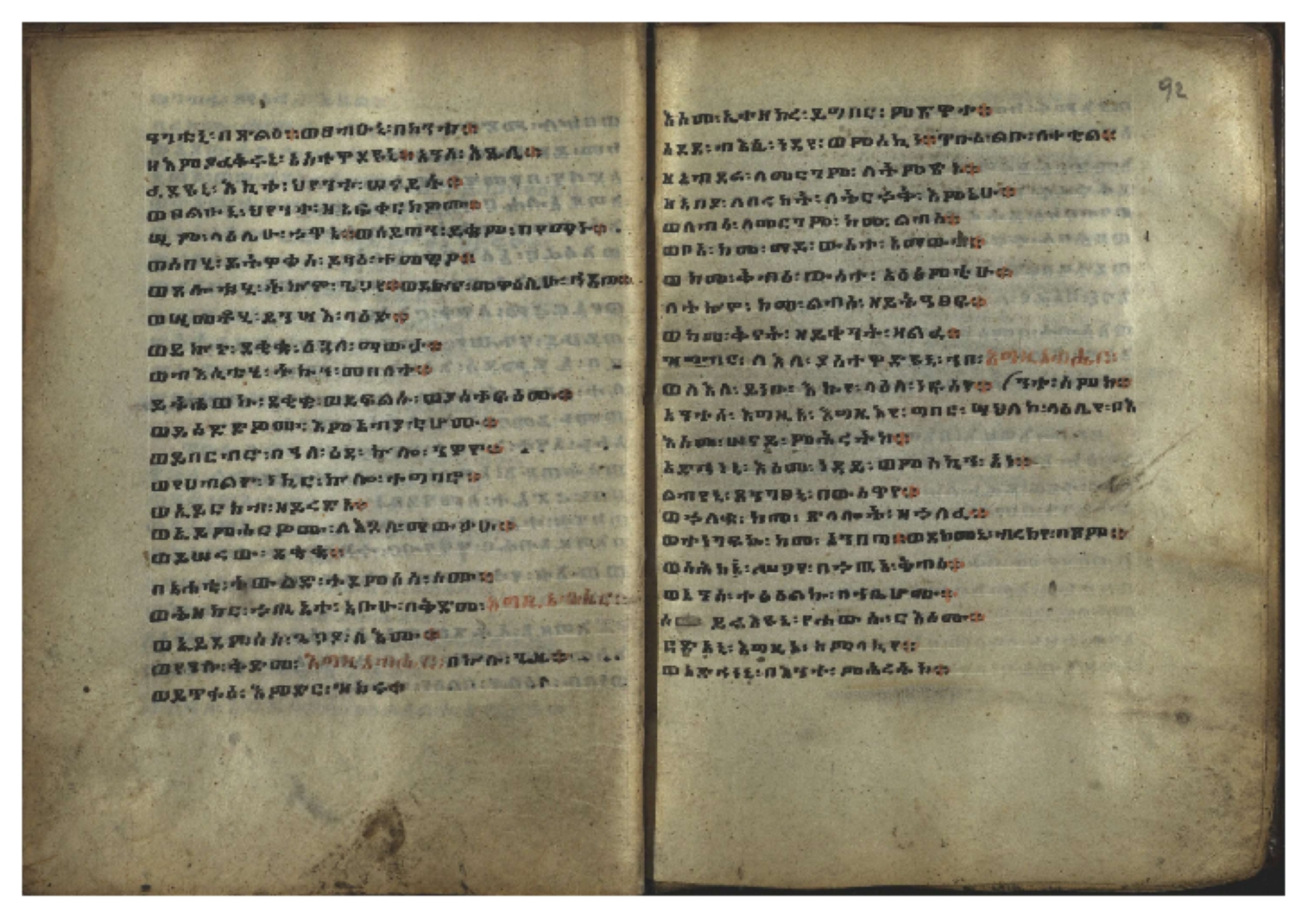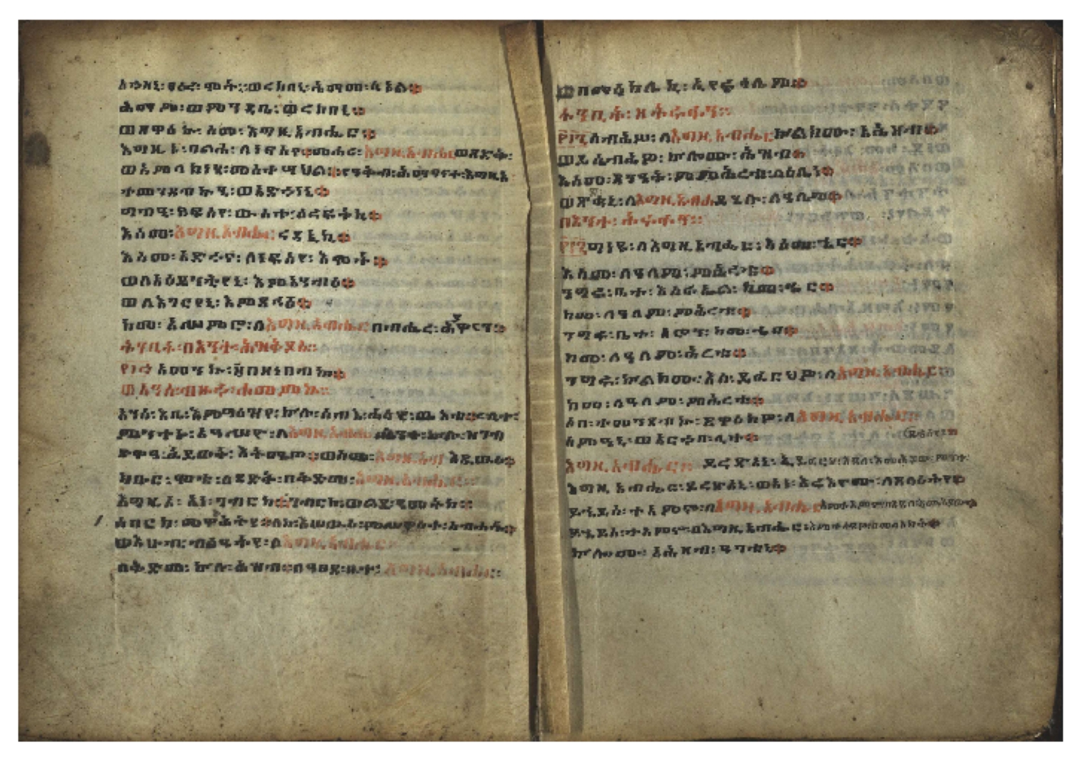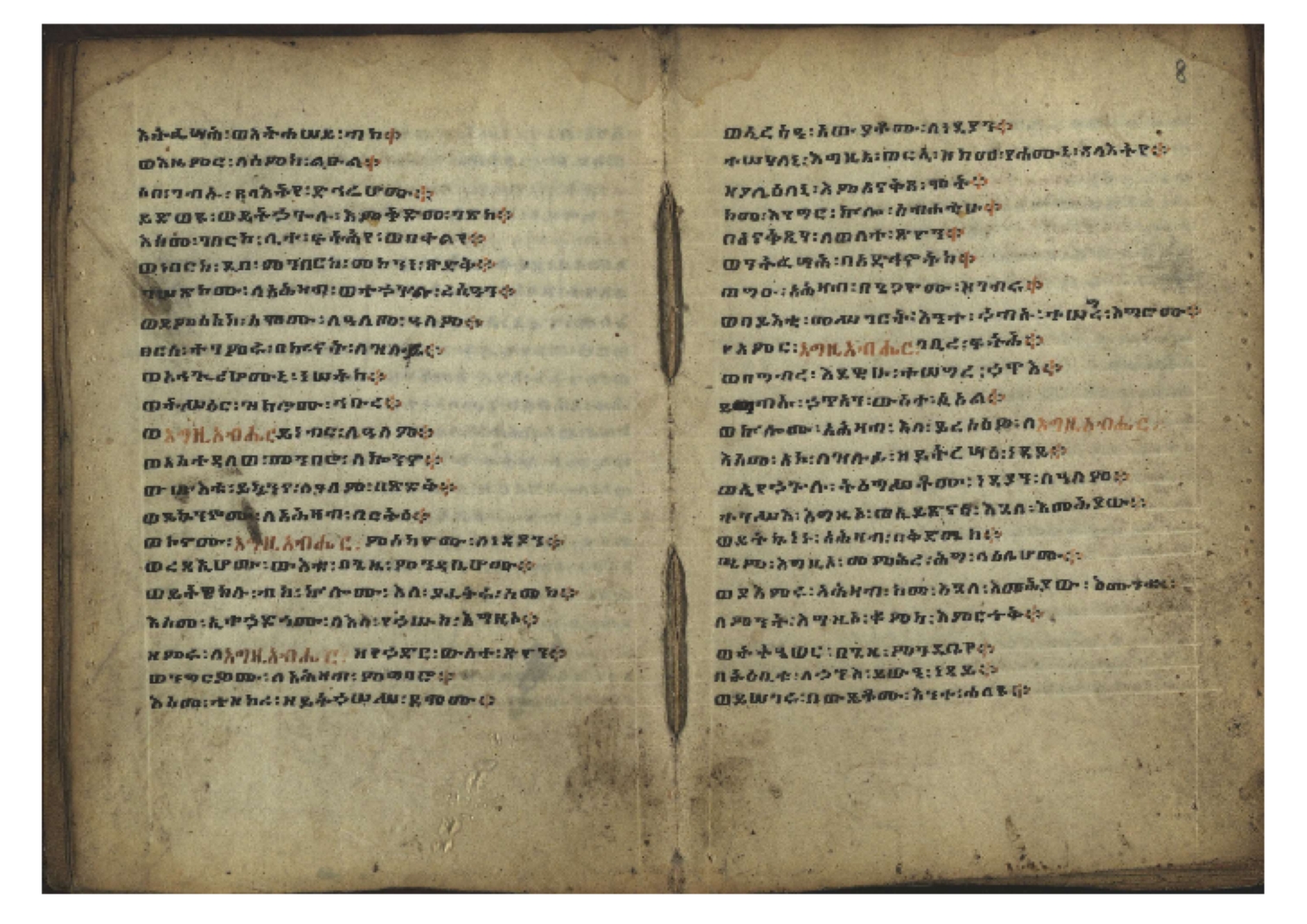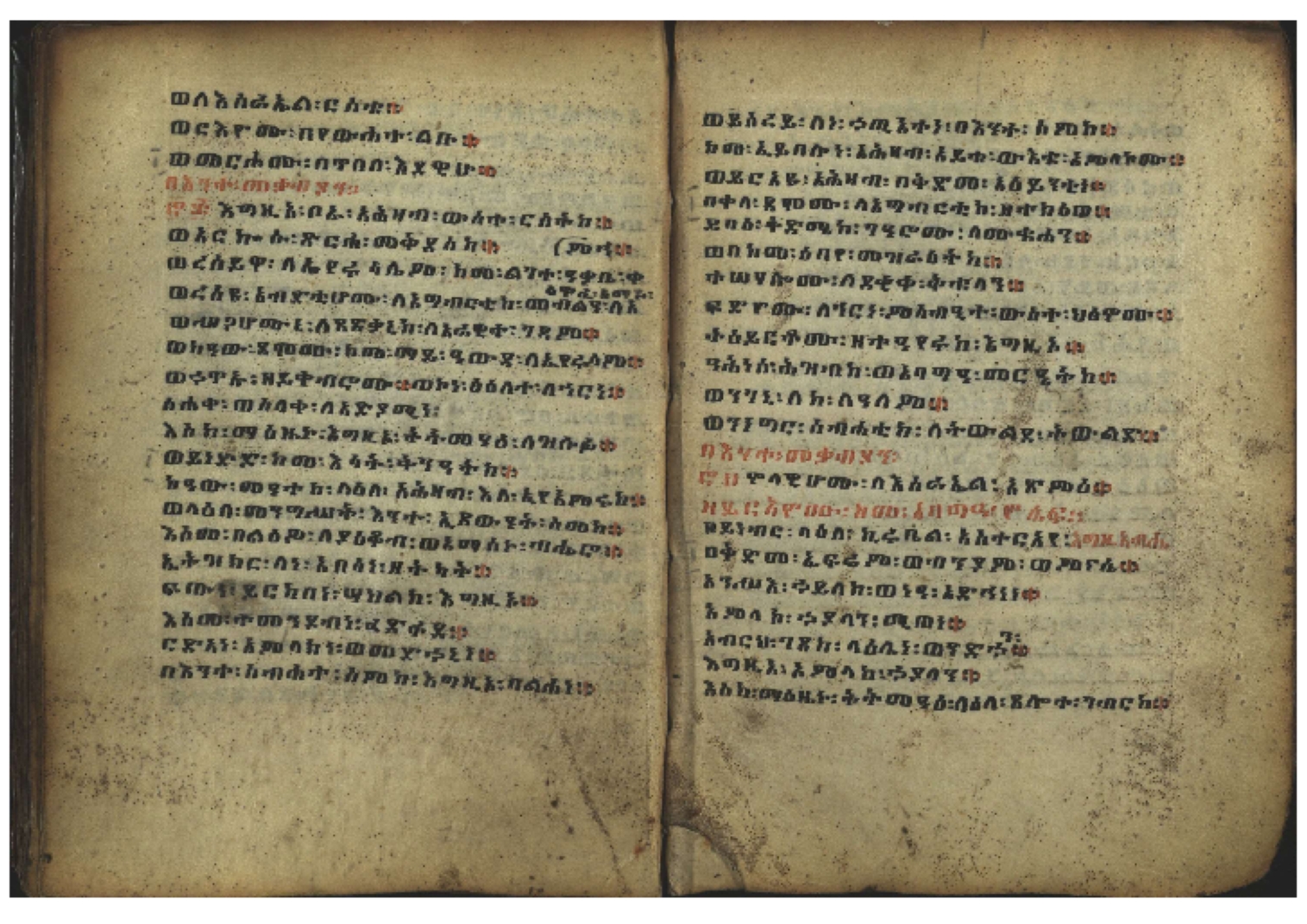 1. F. 1r–v: Mälkǝʾ-hymn to St Michael (Chaine nr. 119), written in an inaccurate hand. The words ሰላም፡ and ሚካኤል፡ are rubricated. Incipit: ሰላም፡ ለዝክረ፡ ስምከ፡ ምስለ፡ ስመ፡ ልዑል፡ ዘተሳተፈ። ወልደ፡ ያሬድ፡ ሄኖክ፡ በከመ፡ ጸሐፈ፡ ሶበ፡ እጼ<ውዕ፡> ስመከ፡ ከሲትየ፡ አፈ፡ ረዳኤ።. The text is incomplete. 2. Ff. 1v–2v: pen trials and other minor scribbles in pencil. 3. F. 156rb–v: Note on the commission of the manuscript, written in Amharic. It mentions the commissioner Aläqa Wäldä Śǝllase and the recipient Lǝǧǧ Abärra Nǝguse. Incipit: መጋቢት፡ ፲፩ቀን፡ አለቃ፡ ወልደ፡ ሥላሴ፡ ለልጅ፡ አበራ፡ ንጉሴ፡ የብራና፡ ዳዊት፡ ሲሸጥ፡ እማኝ፡ ቄስ፡ ኪዳኑ፡ የልጅ፡ አበራ፡ የሸቃ፡. ተእምራ(156v)ት፡ መድህን፡ አለቃ፡ ሐደረ፡ በሶስት፡ ብር፡ ታላድ፡ ሶሽጥ፡ በሶስት፡ ብር፡ ታላድ፡ ሺገዛ፡ ፈጣሚ፡ ብላ፡ ገብሩ፡. |