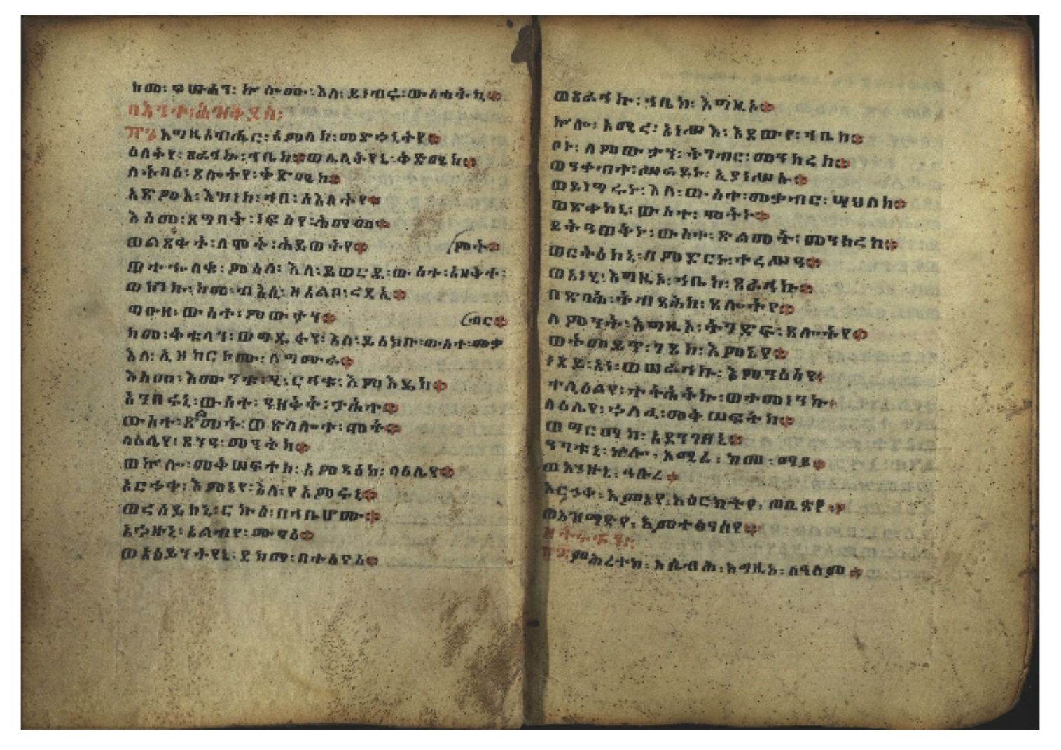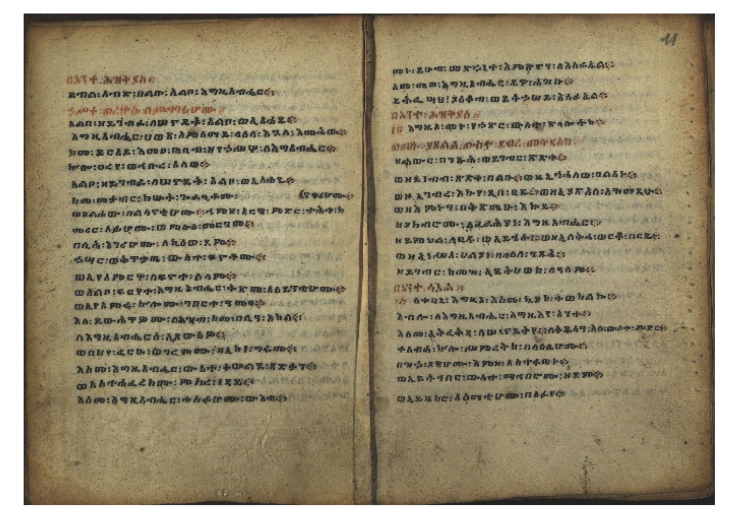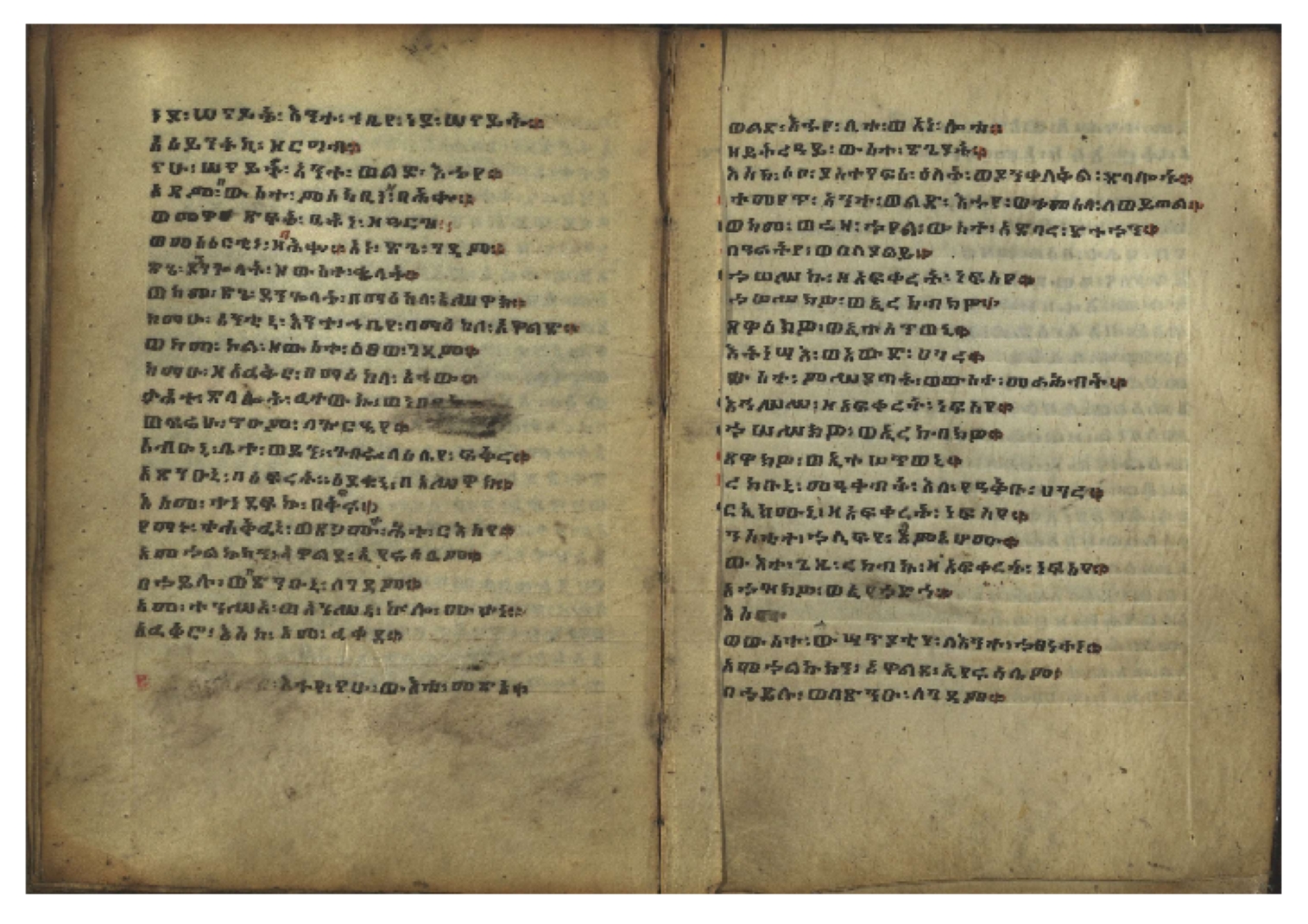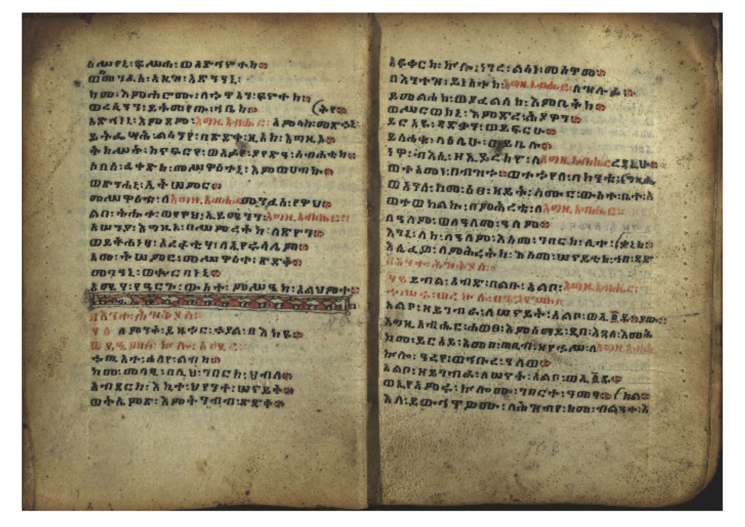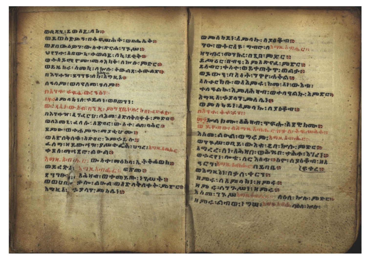 1. F. 1r–v: Mälkǝʾ-hymn to St Michael (Chaine nr. 119), written in an inaccurate hand. The words ሰላም፡ and ሚካኤል፡ are rubricated. Incipit: ሰላም፡ ለዝክረ፡ ስምከ፡ ምስለ፡ ስመ፡ ልዑል፡ ዘተሳተፈ። ወልደ፡ ያሬድ፡ ሄኖክ፡ በከመ፡ ጸሐፈ፡ ሶበ፡ እጼ<ውዕ፡> ስመከ፡ ከሲትየ፡ አፈ፡ ረዳኤ።. The text is incomplete. 2. Ff. 1v–2v: pen trials and other minor scribbles in pencil. 3. F. 156rb–v: Note on the commission of the manuscript, written in Amharic. It mentions the commissioner Aläqa Wäldä Śǝllase and the recipient Lǝǧǧ Abärra Nǝguse. Incipit: መጋቢት፡ ፲፩ቀን፡ አለቃ፡ ወልደ፡ ሥላሴ፡ ለልጅ፡ አበራ፡ ንጉሴ፡ የብራና፡ ዳዊት፡ ሲሸጥ፡ እማኝ፡ ቄስ፡ ኪዳኑ፡ የልጅ፡ አበራ፡ የሸቃ፡. ተእምራ(156v)ት፡ መድህን፡ አለቃ፡ ሐደረ፡ በሶስት፡ ብር፡ ታላድ፡ ሶሽጥ፡ በሶስት፡ ብር፡ ታላድ፡ ሺገዛ፡ ፈጣሚ፡ ብላ፡ ገብሩ፡. |