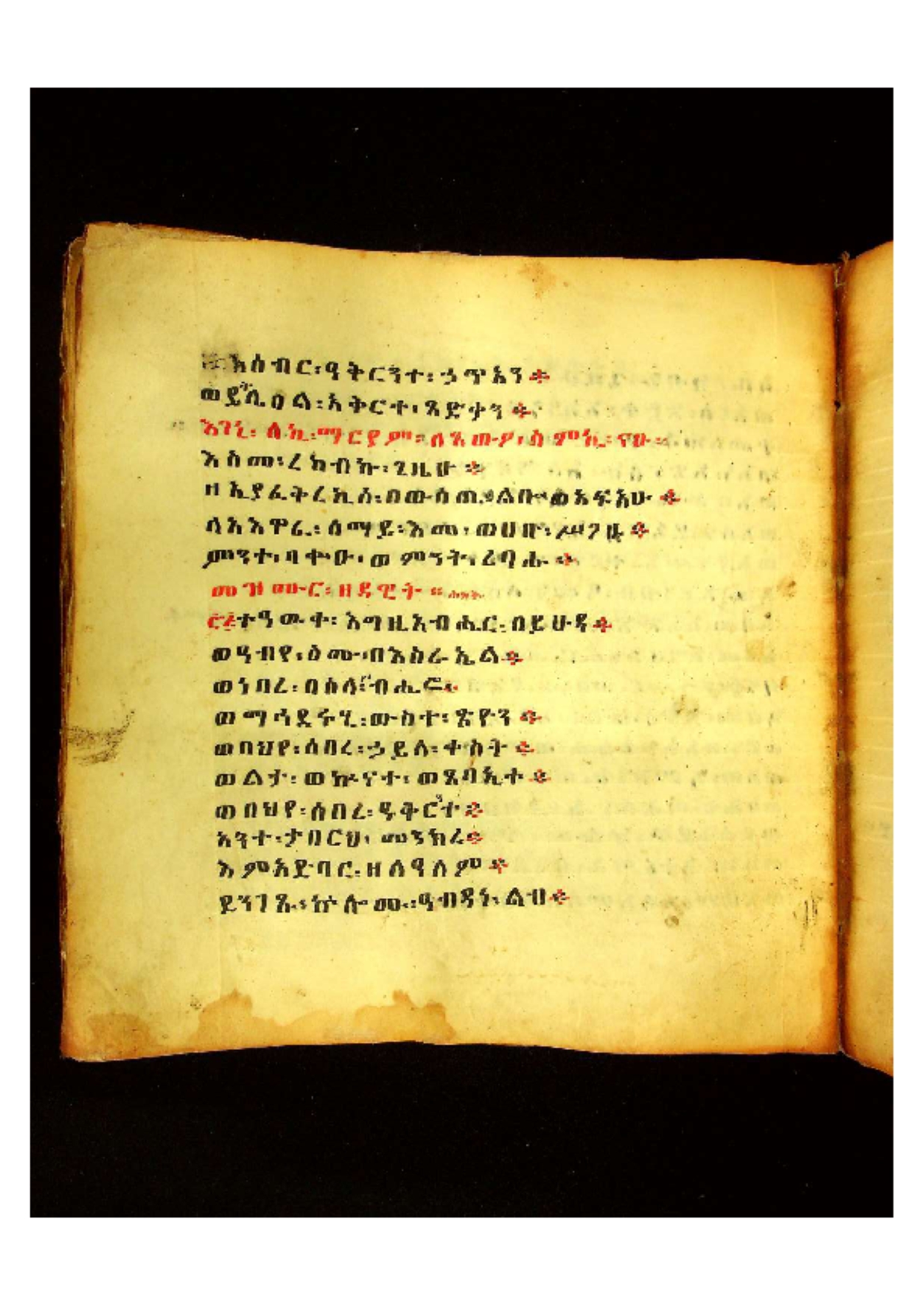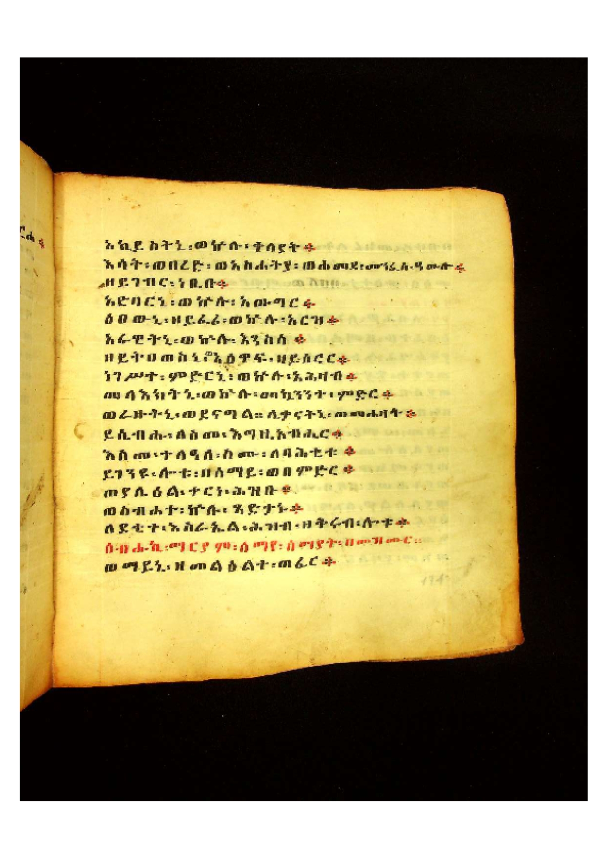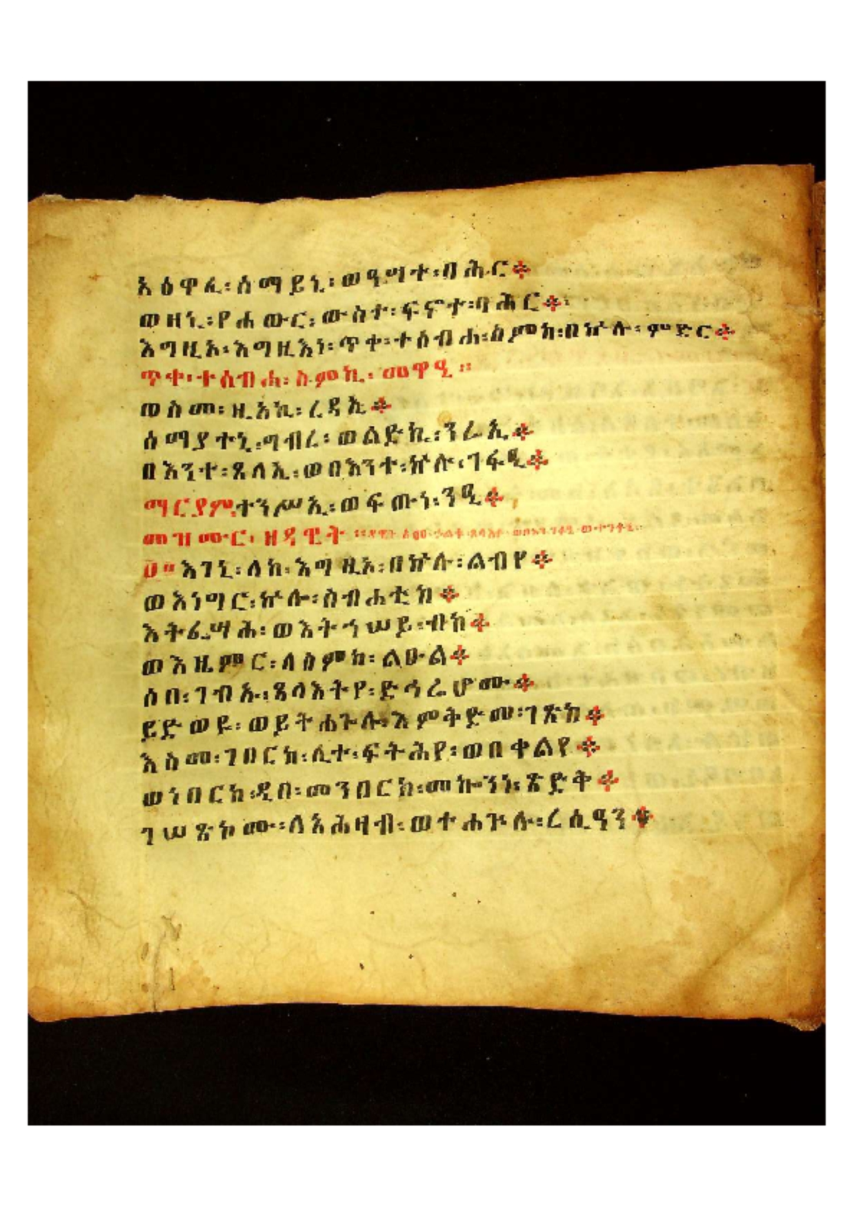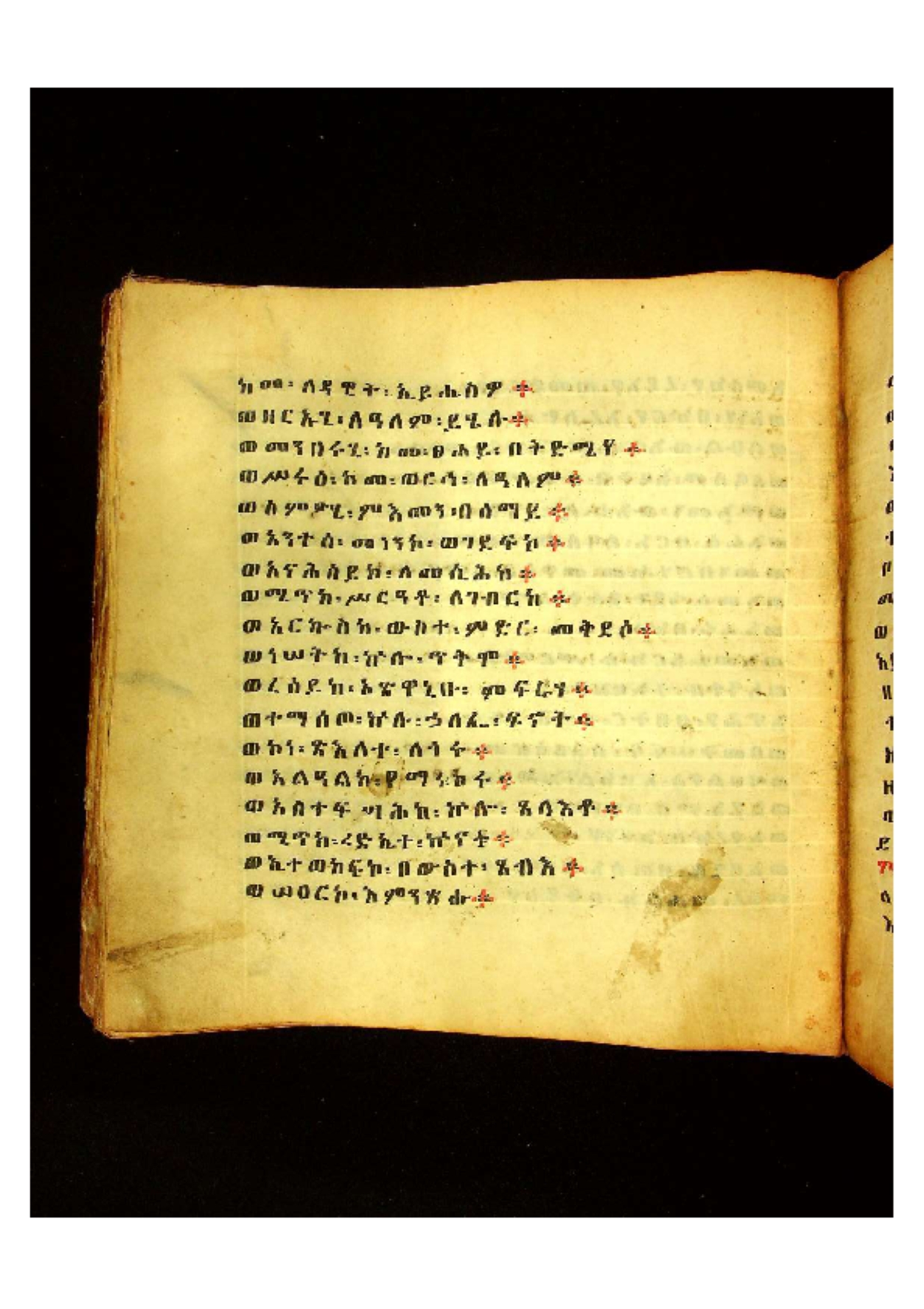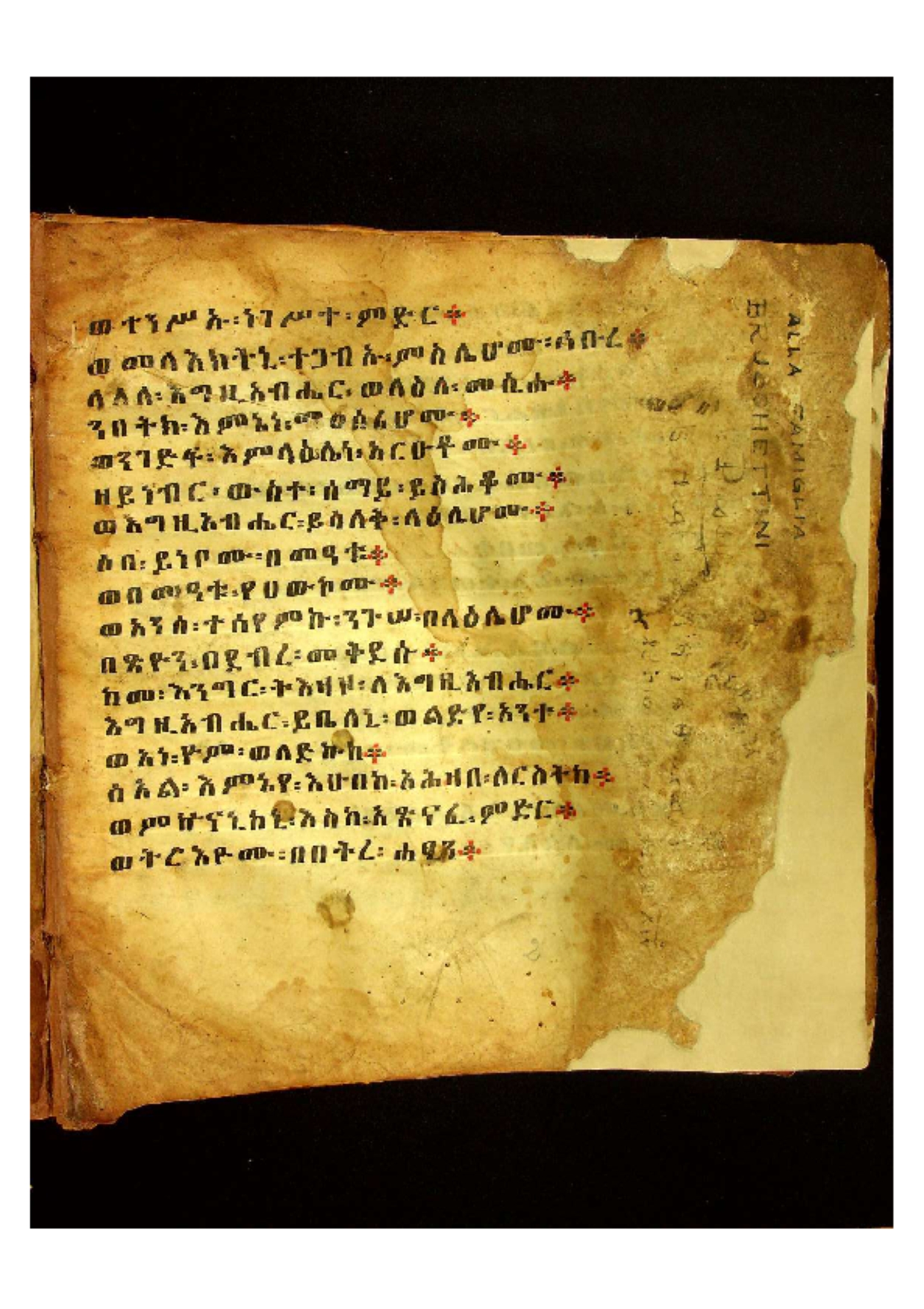 1. F. 2r: donation note written vertically in the outer margin, in black ink: “alla famiglia Bruschettini, Pussy […] Battaglia dell’Amba Aradam il 16 febbraio 1936 XIV”. The note, written in Italian and partly illegible, indicates the Bruschettini family as the receiver of the book and mentions the Battle of Amba Aradam, which took place on 16 February 1936. 2. F. 5r: note written in Italian in the outer upper margin, in red pencil: “Amba Aradam 16/2/XIV ore 17.30 P. Paloboni (?)”. This note also mentions the Battle of Amba Aradam, together with an individual whose name is partially unclear (P. Paloboni?). 3. F. 173v: supplication note written in small script in a mediocre hand, at the end of the “Psalms of David”: ዕቀበኒ፡ እምዓይነ፡ ደዌ፡ ወሞት፡ ለገብርከ፡ ደቅስዮስ፡, “protect me, your servant Däqsəyos, from the eye of infirmity and death”. The note mentions a certain Däqsəyos, indicated as “your servant” (possibly a later owner of the codex). 4. F. 173v: incipit of the Gəʿəz and Amharic prayer, perhaps a writing exercise. The note is written in an inaccurate calligraphy on the outer margin of the folio, next to the prayer. The entire text is የህፂ፡ ኖኅን፡ ከማየ[፡] አይኅ። እስራኤልን፡ ከፈርዖን፡ ዳዊትን፡ ከሳኦል፡ ከኢሎፍሊ። ኤ. 5. F. 190v: donation note, written in black ink in a mediocre hand. Text: ዝመጽሐፍ፡ ዘደብተራ፡ ኪሮስ፡ ዘወሀቦ፡ ለታቦተ፡ ሚካኤል፡ ኢትርስዑኒ፡ በአቡነ፡ ዘበሰማያት፡ ዘአቡየ፡ ገብረ፡ ማርያም፡ ወለእምየ፡ ወለተ፡ ሩፋኤል፡, “This book belongs to däbtära Kiros, who donated it to the tabot of [the church of St] Michael. Do not forget me for our Father who is in heaven. [It also belongs] to my father Gäbrä Maryam and my mother Wälättä Rufaʾel”. 6. F. 199v: writings executed in an inaccurate hand, perhaps the same of note 4. The note includes pen trials (ፈቲነ፡ ብርዕ፡ ዘፈረና፡ etc.), reproduces the explicit of the “Song of the songs” (ስብሐታተኪ፡ ማርያም፡ ከመ፡ እንተ፡ ሕልቀት፡ etc.) and the incipit of the “Praise of Mary” (ውዳሴ፡ ዘሰኑይ፡ ፈቀደ፡ እግዚእ፡ etc., partly rubricated). The writings also mention Däqsəyos, indicated as “your servant” (possibly a later owner of the codex) 7. F. 220ra–va: Genealogic note written on two columns. The note illustrates the family tree of King Yoḥannǝs I, who reigned from 1667 to 1682. The text is acephalous. Incipit: [ወለ]ደ፡ እምሐና፡ ብእሲቱ፡ አሦተ፡ ቅዱሳንሃ፡ ወአሦተ፡ ቅዱሳንኒ፡ እምነ፡ ጳውሊ፡ ብእሲሃ፡ ወለደቶሙ፡ ለአቤተኁን፡ ማእምሮ፡ ወለዘሥላሴ፡ ወአቤተኁን፡ ማእምሮኒ፡ ወለደ፡ አቃርዮስ፡ ወአቃርዮስኒ፡ ወለደ፡ እመቤት፡ እኅተ፡ ክርስቶስሃ፡. The text is published and translated in Proverbio D.V., 2000, ‘Inventario sommario dei manoscritti arabi, ebraici, etiopici – con notizia dei turchi – conservati presso la Biblioteca della Badia di Grottaferrata’. Atti della Accademia nazionale dei Lincei, Memorie, Classe di scienze morali, storiche e filologiche, serie IX, 12 (2000), 468–570 (here pp. 496–97, Appendice III). 8. F. 220va–b: Protective prayer against snakes, written on two columns. Incipit: በስመ፡ አብ፡ … ጸሎት፡ በእንተ፡ ዓርዌ፡ ምድር። ሶበ፡ በጽሐ፡ መልእክት፡ ሐሰውከ፡ በል፡ ፫ጊዜ፡ አኂዘከ፡ ዘፈረ፡ ልብሰ፡ ለእመ፡ ሀሎ፡ ርሑቀ፡ አስትዮ፡. The prayer is probably written in the same hand of note 7. 9. F. 220vb: Unidentified magic prayer containing asmat-names. Incipit: በስመ፡ አብ፡ … ኦላዘላህም፡ አህጉረ፡ ቀዳ[.]፡ ፍሖም፡ ሊስ፡ አፍሊስ፡ ምልክዮስ፡ ዘ[..]ማኤል፡ በዝንቱ፡ አስማቲከ፡ [.]ጽ[..] ኃይለ፡ በረድ፡ ወነፋስ፡ ከማሁ፡. |