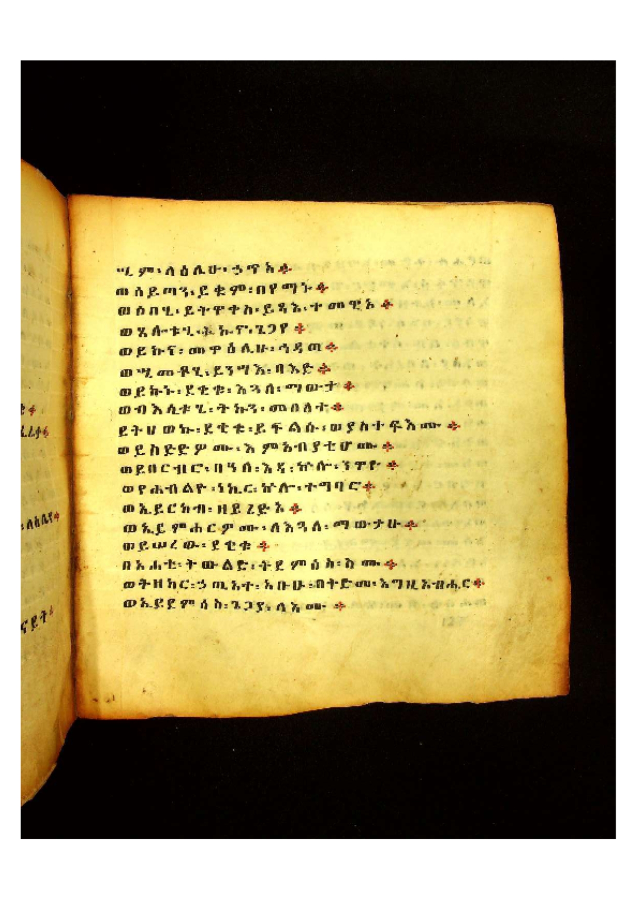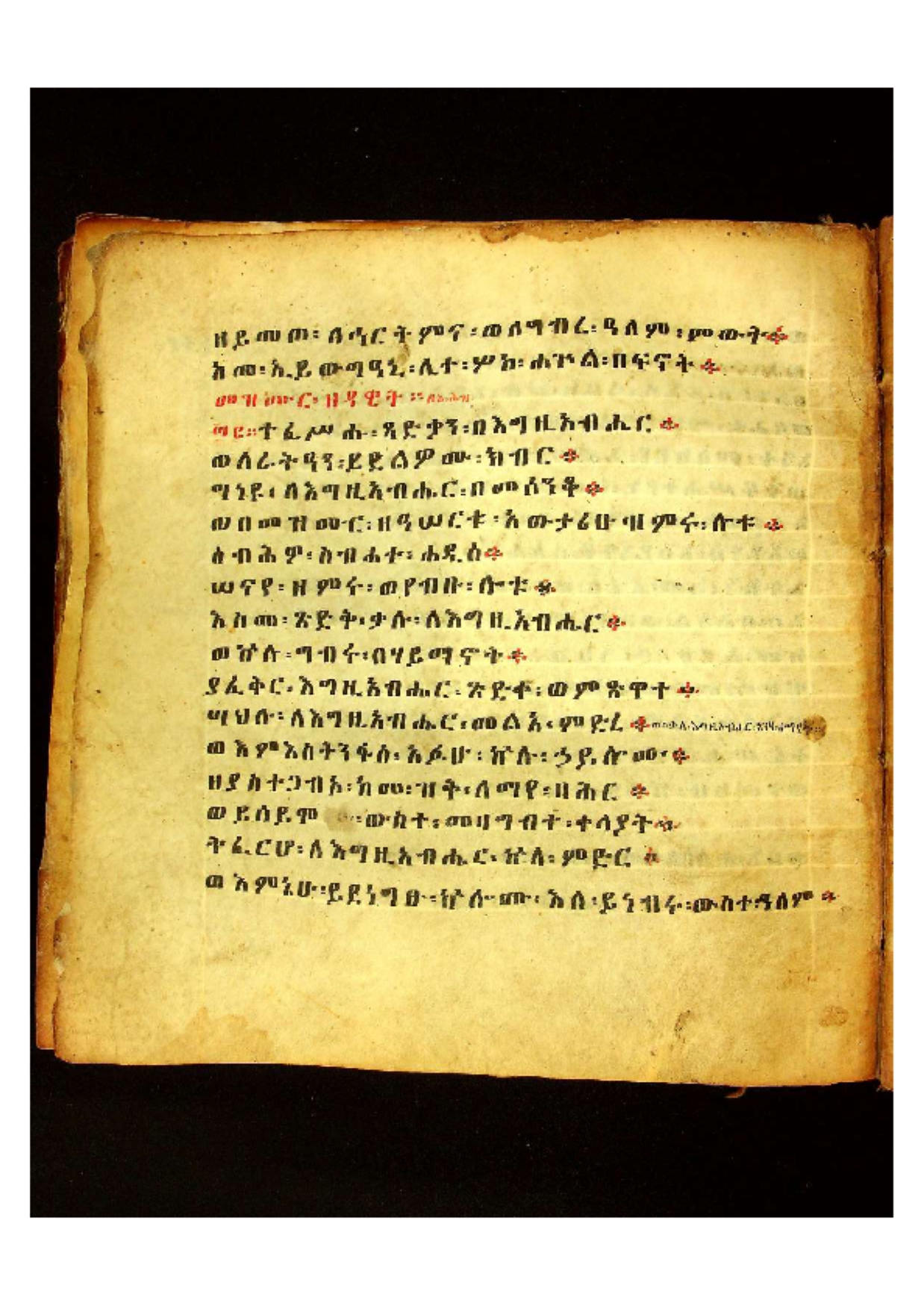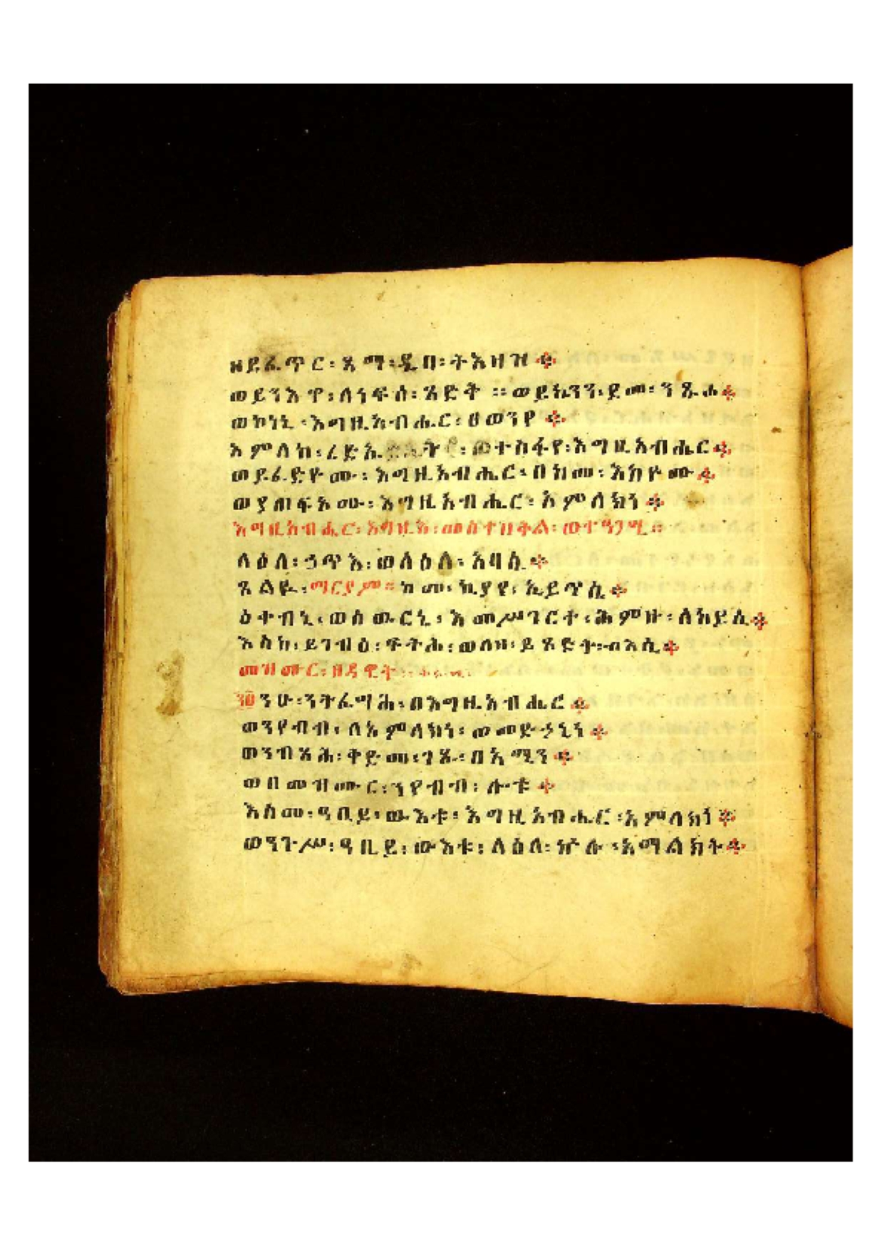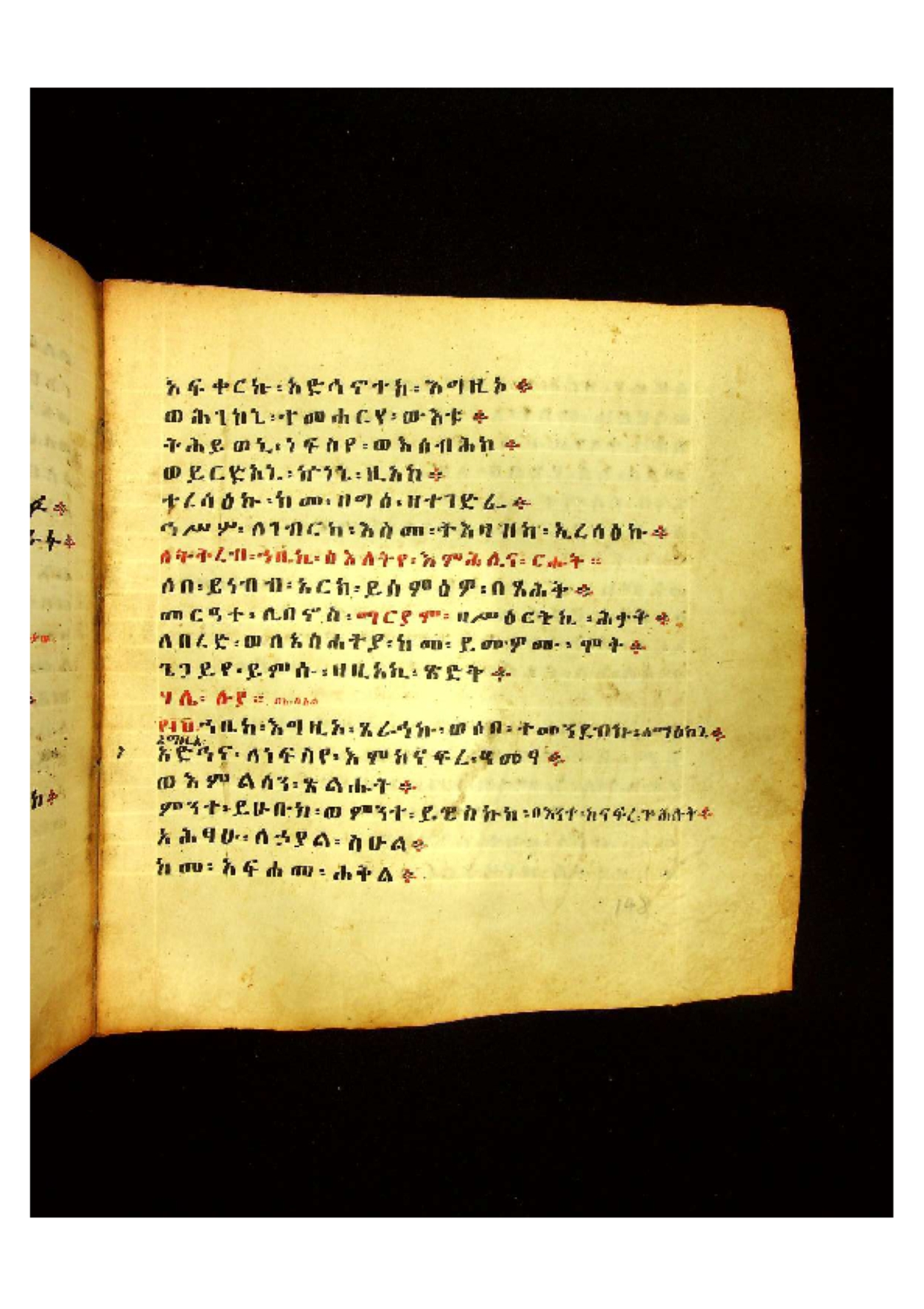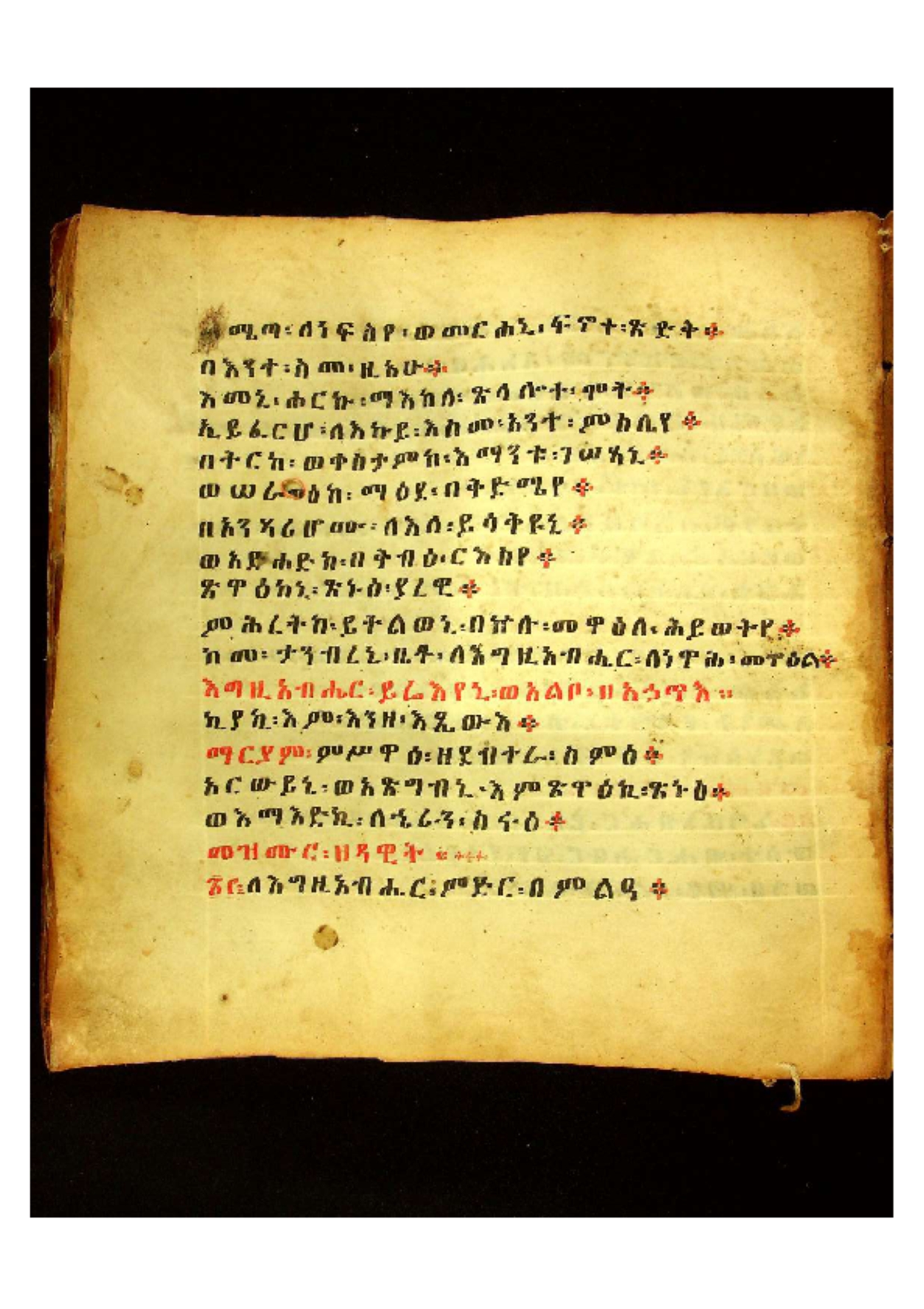 1. F. 2r: donation note written vertically in the outer margin, in black ink: “alla famiglia Bruschettini, Pussy […] Battaglia dell’Amba Aradam il 16 febbraio 1936 XIV”. The note, written in Italian and partly illegible, indicates the Bruschettini family as the receiver of the book and mentions the Battle of Amba Aradam, which took place on 16 February 1936. 2. F. 5r: note written in Italian in the outer upper margin, in red pencil: “Amba Aradam 16/2/XIV ore 17.30 P. Paloboni (?)”. This note also mentions the Battle of Amba Aradam, together with an individual whose name is partially unclear (P. Paloboni?). 3. F. 173v: supplication note written in small script in a mediocre hand, at the end of the “Psalms of David”: ዕቀበኒ፡ እምዓይነ፡ ደዌ፡ ወሞት፡ ለገብርከ፡ ደቅስዮስ፡, “protect me, your servant Däqsəyos, from the eye of infirmity and death”. The note mentions a certain Däqsəyos, indicated as “your servant” (possibly a later owner of the codex). 4. F. 173v: incipit of the Gəʿəz and Amharic prayer, perhaps a writing exercise. The note is written in an inaccurate calligraphy on the outer margin of the folio, next to the prayer. The entire text is የህፂ፡ ኖኅን፡ ከማየ[፡] አይኅ። እስራኤልን፡ ከፈርዖን፡ ዳዊትን፡ ከሳኦል፡ ከኢሎፍሊ። ኤ. 5. F. 190v: donation note, written in black ink in a mediocre hand. Text: ዝመጽሐፍ፡ ዘደብተራ፡ ኪሮስ፡ ዘወሀቦ፡ ለታቦተ፡ ሚካኤል፡ ኢትርስዑኒ፡ በአቡነ፡ ዘበሰማያት፡ ዘአቡየ፡ ገብረ፡ ማርያም፡ ወለእምየ፡ ወለተ፡ ሩፋኤል፡, “This book belongs to däbtära Kiros, who donated it to the tabot of [the church of St] Michael. Do not forget me for our Father who is in heaven. [It also belongs] to my father Gäbrä Maryam and my mother Wälättä Rufaʾel”. 6. F. 199v: writings executed in an inaccurate hand, perhaps the same of note 4. The note includes pen trials (ፈቲነ፡ ብርዕ፡ ዘፈረና፡ etc.), reproduces the explicit of the “Song of the songs” (ስብሐታተኪ፡ ማርያም፡ ከመ፡ እንተ፡ ሕልቀት፡ etc.) and the incipit of the “Praise of Mary” (ውዳሴ፡ ዘሰኑይ፡ ፈቀደ፡ እግዚእ፡ etc., partly rubricated). The writings also mention Däqsəyos, indicated as “your servant” (possibly a later owner of the codex) 7. F. 220ra–va: Genealogic note written on two columns. The note illustrates the family tree of King Yoḥannǝs I, who reigned from 1667 to 1682. The text is acephalous. Incipit: [ወለ]ደ፡ እምሐና፡ ብእሲቱ፡ አሦተ፡ ቅዱሳንሃ፡ ወአሦተ፡ ቅዱሳንኒ፡ እምነ፡ ጳውሊ፡ ብእሲሃ፡ ወለደቶሙ፡ ለአቤተኁን፡ ማእምሮ፡ ወለዘሥላሴ፡ ወአቤተኁን፡ ማእምሮኒ፡ ወለደ፡ አቃርዮስ፡ ወአቃርዮስኒ፡ ወለደ፡ እመቤት፡ እኅተ፡ ክርስቶስሃ፡. The text is published and translated in Proverbio D.V., 2000, ‘Inventario sommario dei manoscritti arabi, ebraici, etiopici – con notizia dei turchi – conservati presso la Biblioteca della Badia di Grottaferrata’. Atti della Accademia nazionale dei Lincei, Memorie, Classe di scienze morali, storiche e filologiche, serie IX, 12 (2000), 468–570 (here pp. 496–97, Appendice III). 8. F. 220va–b: Protective prayer against snakes, written on two columns. Incipit: በስመ፡ አብ፡ … ጸሎት፡ በእንተ፡ ዓርዌ፡ ምድር። ሶበ፡ በጽሐ፡ መልእክት፡ ሐሰውከ፡ በል፡ ፫ጊዜ፡ አኂዘከ፡ ዘፈረ፡ ልብሰ፡ ለእመ፡ ሀሎ፡ ርሑቀ፡ አስትዮ፡. The prayer is probably written in the same hand of note 7. 9. F. 220vb: Unidentified magic prayer containing asmat-names. Incipit: በስመ፡ አብ፡ … ኦላዘላህም፡ አህጉረ፡ ቀዳ[.]፡ ፍሖም፡ ሊስ፡ አፍሊስ፡ ምልክዮስ፡ ዘ[..]ማኤል፡ በዝንቱ፡ አስማቲከ፡ [.]ጽ[..] ኃይለ፡ በረድ፡ ወነፋስ፡ ከማሁ፡. |