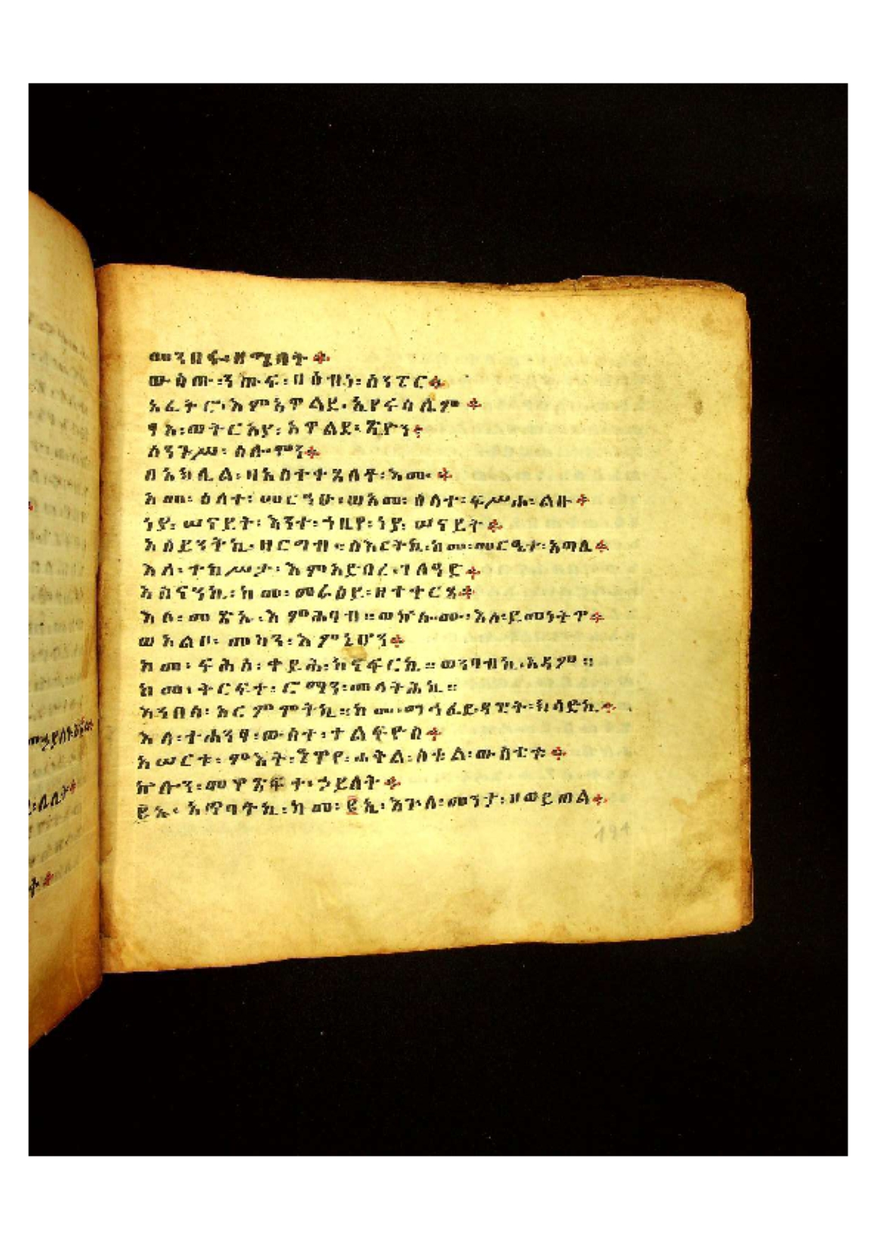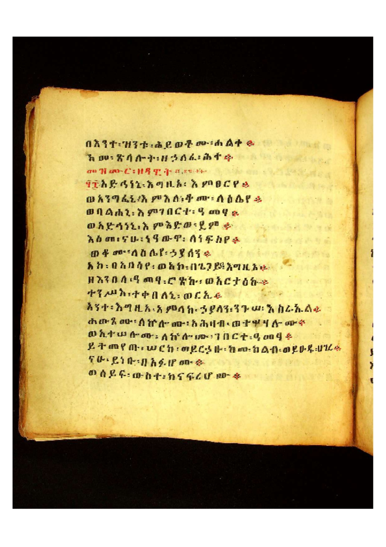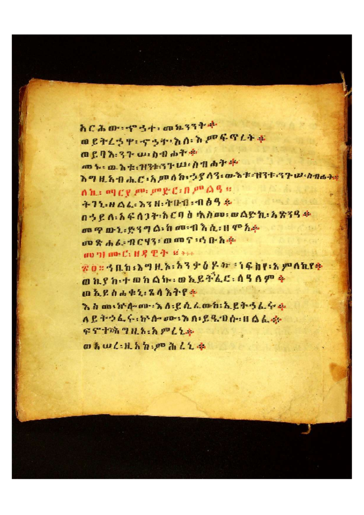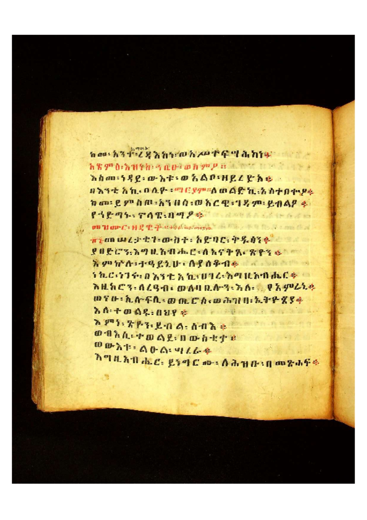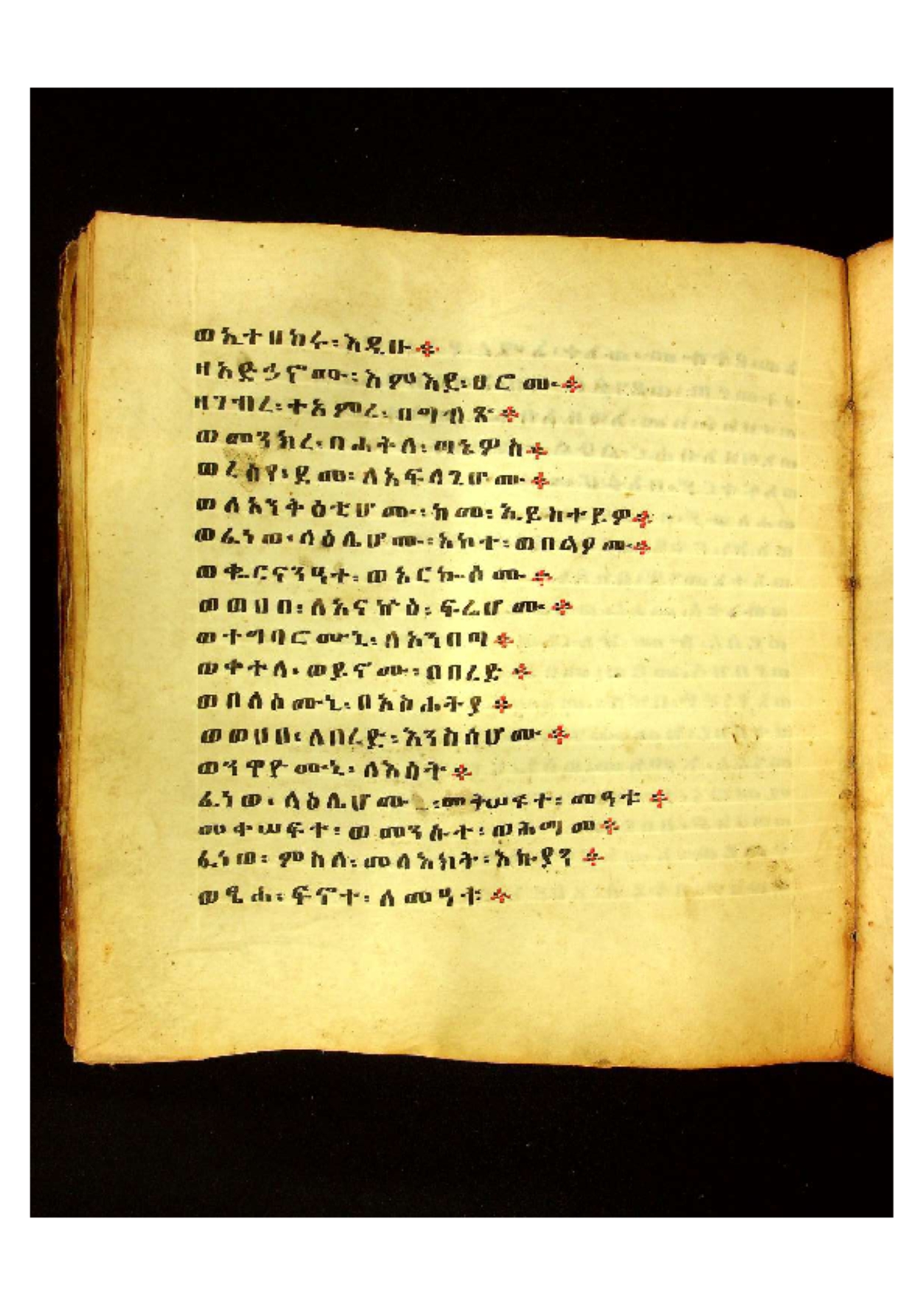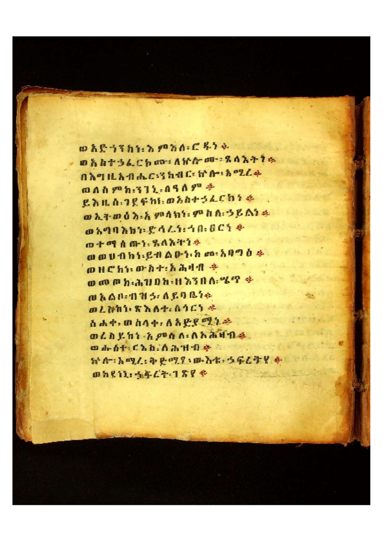 1. F. 2r: donation note written vertically in the outer margin, in black ink: “alla famiglia Bruschettini, Pussy […] Battaglia dell’Amba Aradam il 16 febbraio 1936 XIV”. The note, written in Italian and partly illegible, indicates the Bruschettini family as the receiver of the book and mentions the Battle of Amba Aradam, which took place on 16 February 1936. 2. F. 5r: note written in Italian in the outer upper margin, in red pencil: “Amba Aradam 16/2/XIV ore 17.30 P. Paloboni (?)”. This note also mentions the Battle of Amba Aradam, together with an individual whose name is partially unclear (P. Paloboni?). 3. F. 173v: supplication note written in small script in a mediocre hand, at the end of the “Psalms of David”: ዕቀበኒ፡ እምዓይነ፡ ደዌ፡ ወሞት፡ ለገብርከ፡ ደቅስዮስ፡, “protect me, your servant Däqsəyos, from the eye of infirmity and death”. The note mentions a certain Däqsəyos, indicated as “your servant” (possibly a later owner of the codex). 4. F. 173v: incipit of the Gəʿəz and Amharic prayer, perhaps a writing exercise. The note is written in an inaccurate calligraphy on the outer margin of the folio, next to the prayer. The entire text is የህፂ፡ ኖኅን፡ ከማየ[፡] አይኅ። እስራኤልን፡ ከፈርዖን፡ ዳዊትን፡ ከሳኦል፡ ከኢሎፍሊ። ኤ. 5. F. 190v: donation note, written in black ink in a mediocre hand. Text: ዝመጽሐፍ፡ ዘደብተራ፡ ኪሮስ፡ ዘወሀቦ፡ ለታቦተ፡ ሚካኤል፡ ኢትርስዑኒ፡ በአቡነ፡ ዘበሰማያት፡ ዘአቡየ፡ ገብረ፡ ማርያም፡ ወለእምየ፡ ወለተ፡ ሩፋኤል፡, “This book belongs to däbtära Kiros, who donated it to the tabot of [the church of St] Michael. Do not forget me for our Father who is in heaven. [It also belongs] to my father Gäbrä Maryam and my mother Wälättä Rufaʾel”. 6. F. 199v: writings executed in an inaccurate hand, perhaps the same of note 4. The note includes pen trials (ፈቲነ፡ ብርዕ፡ ዘፈረና፡ etc.), reproduces the explicit of the “Song of the songs” (ስብሐታተኪ፡ ማርያም፡ ከመ፡ እንተ፡ ሕልቀት፡ etc.) and the incipit of the “Praise of Mary” (ውዳሴ፡ ዘሰኑይ፡ ፈቀደ፡ እግዚእ፡ etc., partly rubricated). The writings also mention Däqsəyos, indicated as “your servant” (possibly a later owner of the codex) 7. F. 220ra–va: Genealogic note written on two columns. The note illustrates the family tree of King Yoḥannǝs I, who reigned from 1667 to 1682. The text is acephalous. Incipit: [ወለ]ደ፡ እምሐና፡ ብእሲቱ፡ አሦተ፡ ቅዱሳንሃ፡ ወአሦተ፡ ቅዱሳንኒ፡ እምነ፡ ጳውሊ፡ ብእሲሃ፡ ወለደቶሙ፡ ለአቤተኁን፡ ማእምሮ፡ ወለዘሥላሴ፡ ወአቤተኁን፡ ማእምሮኒ፡ ወለደ፡ አቃርዮስ፡ ወአቃርዮስኒ፡ ወለደ፡ እመቤት፡ እኅተ፡ ክርስቶስሃ፡. The text is published and translated in Proverbio D.V., 2000, ‘Inventario sommario dei manoscritti arabi, ebraici, etiopici – con notizia dei turchi – conservati presso la Biblioteca della Badia di Grottaferrata’. Atti della Accademia nazionale dei Lincei, Memorie, Classe di scienze morali, storiche e filologiche, serie IX, 12 (2000), 468–570 (here pp. 496–97, Appendice III). 8. F. 220va–b: Protective prayer against snakes, written on two columns. Incipit: በስመ፡ አብ፡ … ጸሎት፡ በእንተ፡ ዓርዌ፡ ምድር። ሶበ፡ በጽሐ፡ መልእክት፡ ሐሰውከ፡ በል፡ ፫ጊዜ፡ አኂዘከ፡ ዘፈረ፡ ልብሰ፡ ለእመ፡ ሀሎ፡ ርሑቀ፡ አስትዮ፡. The prayer is probably written in the same hand of note 7. 9. F. 220vb: Unidentified magic prayer containing asmat-names. Incipit: በስመ፡ አብ፡ … ኦላዘላህም፡ አህጉረ፡ ቀዳ[.]፡ ፍሖም፡ ሊስ፡ አፍሊስ፡ ምልክዮስ፡ ዘ[..]ማኤል፡ በዝንቱ፡ አስማቲከ፡ [.]ጽ[..] ኃይለ፡ በረድ፡ ወነፋስ፡ ከማሁ፡. |