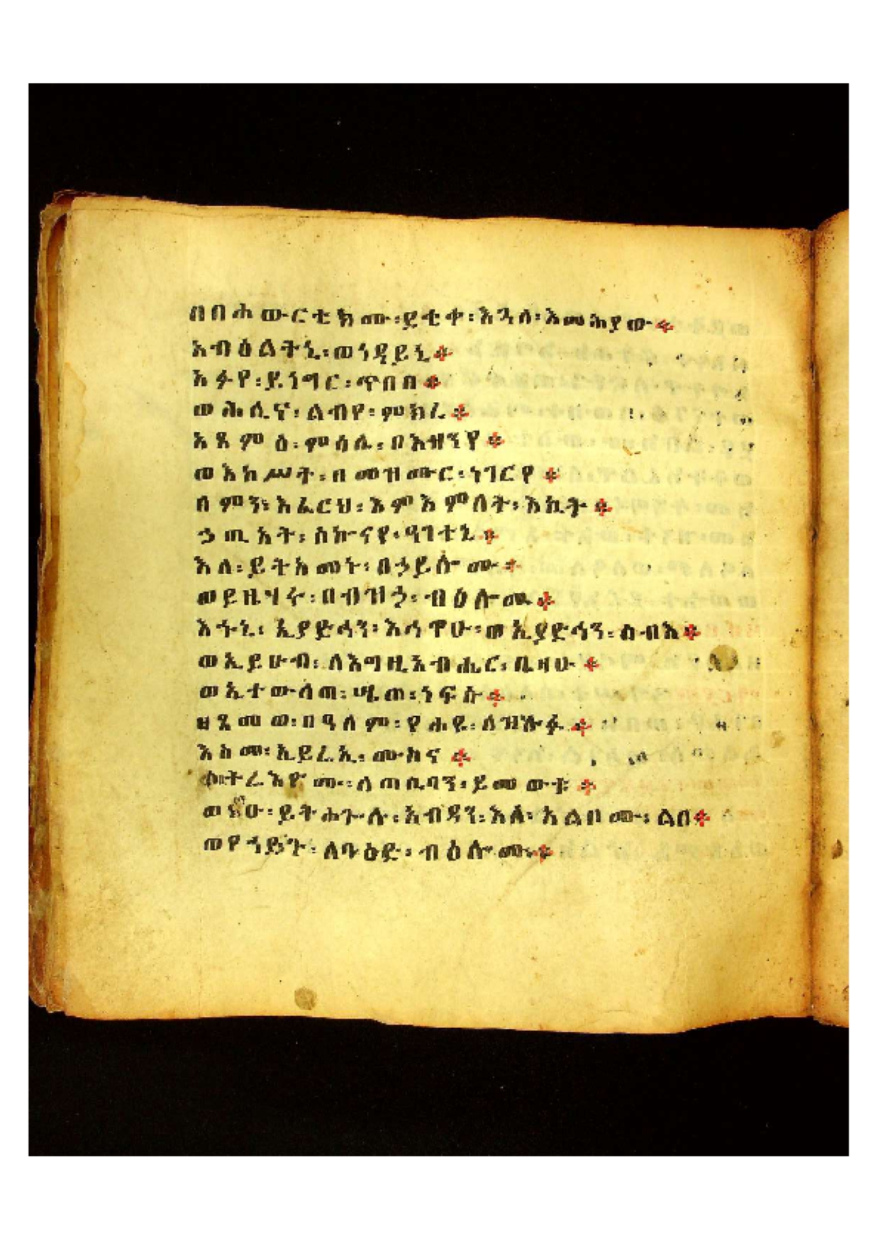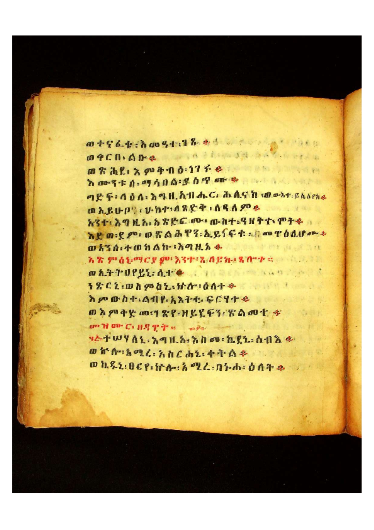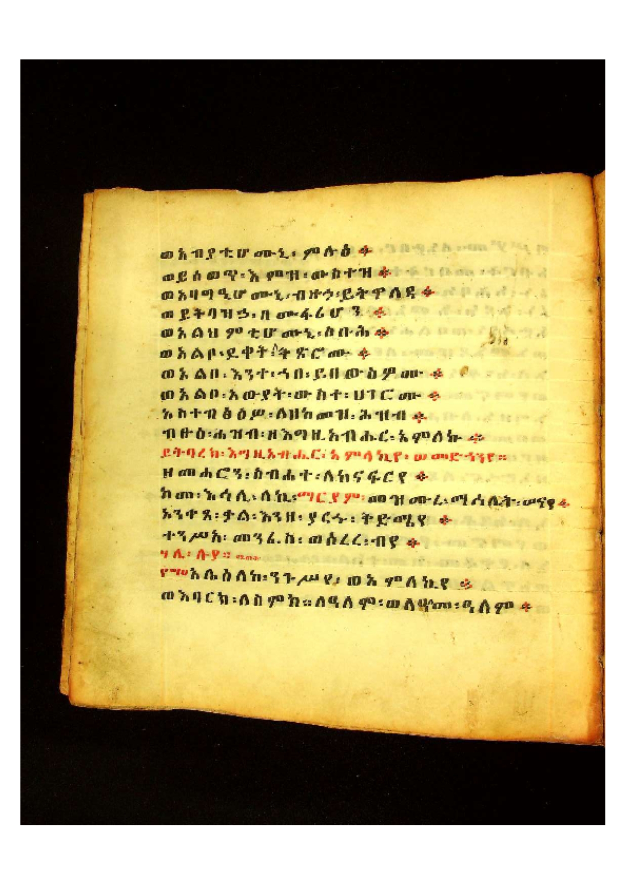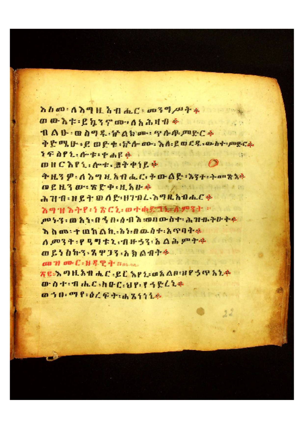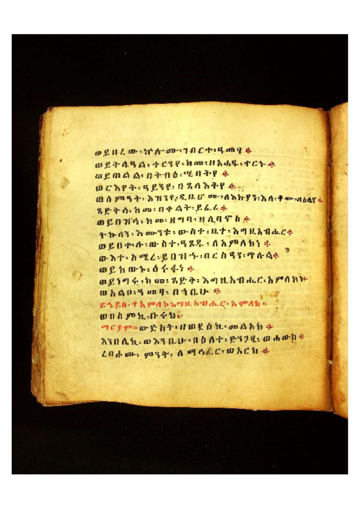 1. F. 2r: donation note written vertically in the outer margin, in black ink: “alla famiglia Bruschettini, Pussy […] Battaglia dell’Amba Aradam il 16 febbraio 1936 XIV”. The note, written in Italian and partly illegible, indicates the Bruschettini family as the receiver of the book and mentions the Battle of Amba Aradam, which took place on 16 February 1936. 2. F. 5r: note written in Italian in the outer upper margin, in red pencil: “Amba Aradam 16/2/XIV ore 17.30 P. Paloboni (?)”. This note also mentions the Battle of Amba Aradam, together with an individual whose name is partially unclear (P. Paloboni?). 3. F. 173v: supplication note written in small script in a mediocre hand, at the end of the “Psalms of David”: ዕቀበኒ፡ እምዓይነ፡ ደዌ፡ ወሞት፡ ለገብርከ፡ ደቅስዮስ፡, “protect me, your servant Däqsəyos, from the eye of infirmity and death”. The note mentions a certain Däqsəyos, indicated as “your servant” (possibly a later owner of the codex). 4. F. 173v: incipit of the Gəʿəz and Amharic prayer, perhaps a writing exercise. The note is written in an inaccurate calligraphy on the outer margin of the folio, next to the prayer. The entire text is የህፂ፡ ኖኅን፡ ከማየ[፡] አይኅ። እስራኤልን፡ ከፈርዖን፡ ዳዊትን፡ ከሳኦል፡ ከኢሎፍሊ። ኤ. 5. F. 190v: donation note, written in black ink in a mediocre hand. Text: ዝመጽሐፍ፡ ዘደብተራ፡ ኪሮስ፡ ዘወሀቦ፡ ለታቦተ፡ ሚካኤል፡ ኢትርስዑኒ፡ በአቡነ፡ ዘበሰማያት፡ ዘአቡየ፡ ገብረ፡ ማርያም፡ ወለእምየ፡ ወለተ፡ ሩፋኤል፡, “This book belongs to däbtära Kiros, who donated it to the tabot of [the church of St] Michael. Do not forget me for our Father who is in heaven. [It also belongs] to my father Gäbrä Maryam and my mother Wälättä Rufaʾel”. 6. F. 199v: writings executed in an inaccurate hand, perhaps the same of note 4. The note includes pen trials (ፈቲነ፡ ብርዕ፡ ዘፈረና፡ etc.), reproduces the explicit of the “Song of the songs” (ስብሐታተኪ፡ ማርያም፡ ከመ፡ እንተ፡ ሕልቀት፡ etc.) and the incipit of the “Praise of Mary” (ውዳሴ፡ ዘሰኑይ፡ ፈቀደ፡ እግዚእ፡ etc., partly rubricated). The writings also mention Däqsəyos, indicated as “your servant” (possibly a later owner of the codex) 7. F. 220ra–va: Genealogic note written on two columns. The note illustrates the family tree of King Yoḥannǝs I, who reigned from 1667 to 1682. The text is acephalous. Incipit: [ወለ]ደ፡ እምሐና፡ ብእሲቱ፡ አሦተ፡ ቅዱሳንሃ፡ ወአሦተ፡ ቅዱሳንኒ፡ እምነ፡ ጳውሊ፡ ብእሲሃ፡ ወለደቶሙ፡ ለአቤተኁን፡ ማእምሮ፡ ወለዘሥላሴ፡ ወአቤተኁን፡ ማእምሮኒ፡ ወለደ፡ አቃርዮስ፡ ወአቃርዮስኒ፡ ወለደ፡ እመቤት፡ እኅተ፡ ክርስቶስሃ፡. The text is published and translated in Proverbio D.V., 2000, ‘Inventario sommario dei manoscritti arabi, ebraici, etiopici – con notizia dei turchi – conservati presso la Biblioteca della Badia di Grottaferrata’. Atti della Accademia nazionale dei Lincei, Memorie, Classe di scienze morali, storiche e filologiche, serie IX, 12 (2000), 468–570 (here pp. 496–97, Appendice III). 8. F. 220va–b: Protective prayer against snakes, written on two columns. Incipit: በስመ፡ አብ፡ … ጸሎት፡ በእንተ፡ ዓርዌ፡ ምድር። ሶበ፡ በጽሐ፡ መልእክት፡ ሐሰውከ፡ በል፡ ፫ጊዜ፡ አኂዘከ፡ ዘፈረ፡ ልብሰ፡ ለእመ፡ ሀሎ፡ ርሑቀ፡ አስትዮ፡. The prayer is probably written in the same hand of note 7. 9. F. 220vb: Unidentified magic prayer containing asmat-names. Incipit: በስመ፡ አብ፡ … ኦላዘላህም፡ አህጉረ፡ ቀዳ[.]፡ ፍሖም፡ ሊስ፡ አፍሊስ፡ ምልክዮስ፡ ዘ[..]ማኤል፡ በዝንቱ፡ አስማቲከ፡ [.]ጽ[..] ኃይለ፡ በረድ፡ ወነፋስ፡ ከማሁ፡. |