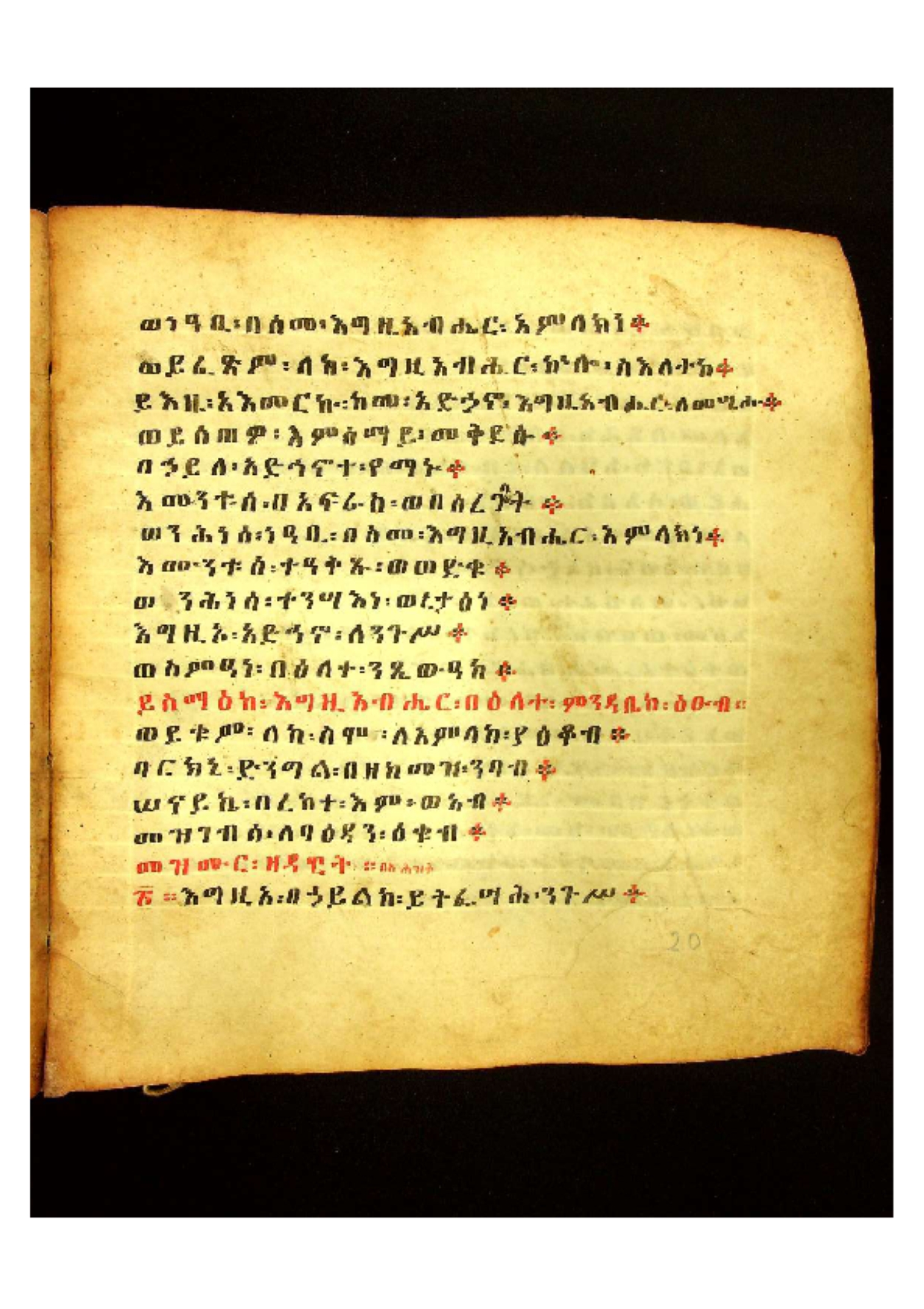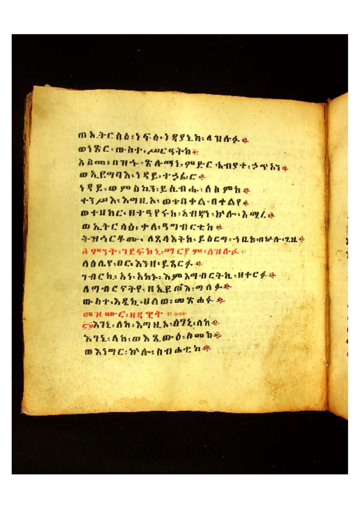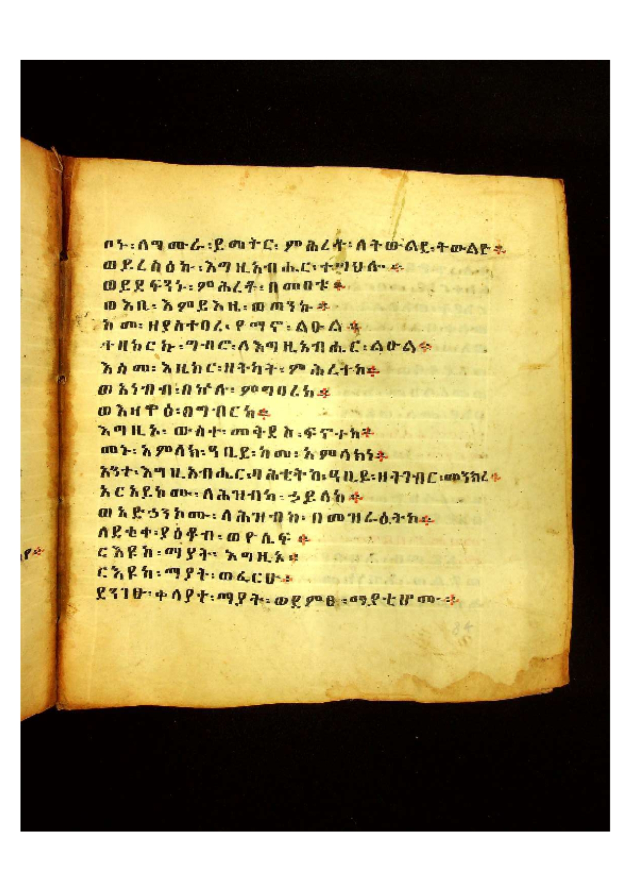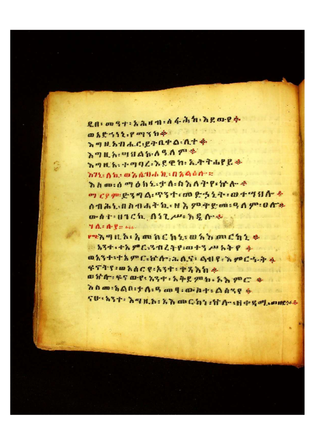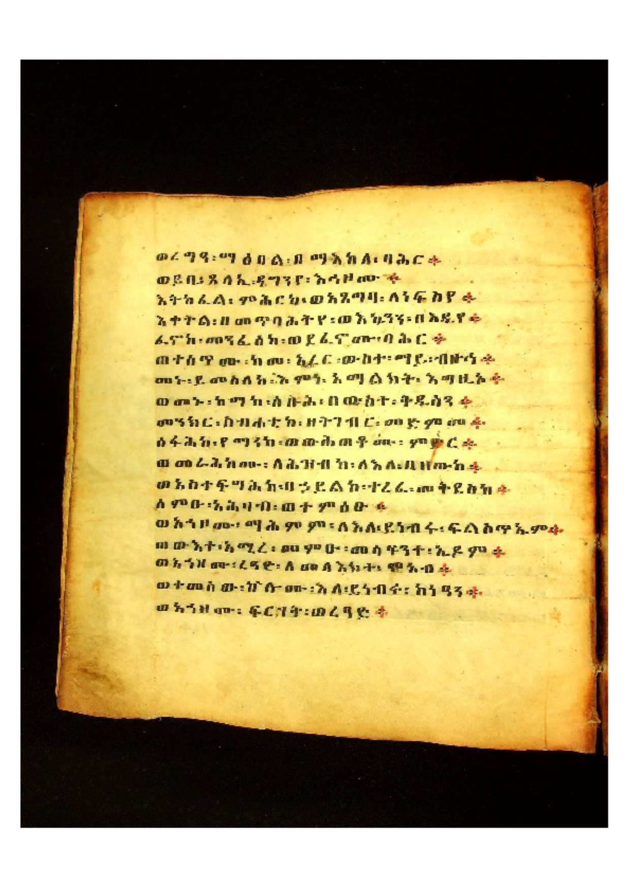 1. F. 2r: donation note written vertically in the outer margin, in black ink: “alla famiglia Bruschettini, Pussy […] Battaglia dell’Amba Aradam il 16 febbraio 1936 XIV”. The note, written in Italian and partly illegible, indicates the Bruschettini family as the receiver of the book and mentions the Battle of Amba Aradam, which took place on 16 February 1936. 2. F. 5r: note written in Italian in the outer upper margin, in red pencil: “Amba Aradam 16/2/XIV ore 17.30 P. Paloboni (?)”. This note also mentions the Battle of Amba Aradam, together with an individual whose name is partially unclear (P. Paloboni?). 3. F. 173v: supplication note written in small script in a mediocre hand, at the end of the “Psalms of David”: ዕቀበኒ፡ እምዓይነ፡ ደዌ፡ ወሞት፡ ለገብርከ፡ ደቅስዮስ፡, “protect me, your servant Däqsəyos, from the eye of infirmity and death”. The note mentions a certain Däqsəyos, indicated as “your servant” (possibly a later owner of the codex). 4. F. 173v: incipit of the Gəʿəz and Amharic prayer, perhaps a writing exercise. The note is written in an inaccurate calligraphy on the outer margin of the folio, next to the prayer. The entire text is የህፂ፡ ኖኅን፡ ከማየ[፡] አይኅ። እስራኤልን፡ ከፈርዖን፡ ዳዊትን፡ ከሳኦል፡ ከኢሎፍሊ። ኤ. 5. F. 190v: donation note, written in black ink in a mediocre hand. Text: ዝመጽሐፍ፡ ዘደብተራ፡ ኪሮስ፡ ዘወሀቦ፡ ለታቦተ፡ ሚካኤል፡ ኢትርስዑኒ፡ በአቡነ፡ ዘበሰማያት፡ ዘአቡየ፡ ገብረ፡ ማርያም፡ ወለእምየ፡ ወለተ፡ ሩፋኤል፡, “This book belongs to däbtära Kiros, who donated it to the tabot of [the church of St] Michael. Do not forget me for our Father who is in heaven. [It also belongs] to my father Gäbrä Maryam and my mother Wälättä Rufaʾel”. 6. F. 199v: writings executed in an inaccurate hand, perhaps the same of note 4. The note includes pen trials (ፈቲነ፡ ብርዕ፡ ዘፈረና፡ etc.), reproduces the explicit of the “Song of the songs” (ስብሐታተኪ፡ ማርያም፡ ከመ፡ እንተ፡ ሕልቀት፡ etc.) and the incipit of the “Praise of Mary” (ውዳሴ፡ ዘሰኑይ፡ ፈቀደ፡ እግዚእ፡ etc., partly rubricated). The writings also mention Däqsəyos, indicated as “your servant” (possibly a later owner of the codex) 7. F. 220ra–va: Genealogic note written on two columns. The note illustrates the family tree of King Yoḥannǝs I, who reigned from 1667 to 1682. The text is acephalous. Incipit: [ወለ]ደ፡ እምሐና፡ ብእሲቱ፡ አሦተ፡ ቅዱሳንሃ፡ ወአሦተ፡ ቅዱሳንኒ፡ እምነ፡ ጳውሊ፡ ብእሲሃ፡ ወለደቶሙ፡ ለአቤተኁን፡ ማእምሮ፡ ወለዘሥላሴ፡ ወአቤተኁን፡ ማእምሮኒ፡ ወለደ፡ አቃርዮስ፡ ወአቃርዮስኒ፡ ወለደ፡ እመቤት፡ እኅተ፡ ክርስቶስሃ፡. The text is published and translated in Proverbio D.V., 2000, ‘Inventario sommario dei manoscritti arabi, ebraici, etiopici – con notizia dei turchi – conservati presso la Biblioteca della Badia di Grottaferrata’. Atti della Accademia nazionale dei Lincei, Memorie, Classe di scienze morali, storiche e filologiche, serie IX, 12 (2000), 468–570 (here pp. 496–97, Appendice III). 8. F. 220va–b: Protective prayer against snakes, written on two columns. Incipit: በስመ፡ አብ፡ … ጸሎት፡ በእንተ፡ ዓርዌ፡ ምድር። ሶበ፡ በጽሐ፡ መልእክት፡ ሐሰውከ፡ በል፡ ፫ጊዜ፡ አኂዘከ፡ ዘፈረ፡ ልብሰ፡ ለእመ፡ ሀሎ፡ ርሑቀ፡ አስትዮ፡. The prayer is probably written in the same hand of note 7. 9. F. 220vb: Unidentified magic prayer containing asmat-names. Incipit: በስመ፡ አብ፡ … ኦላዘላህም፡ አህጉረ፡ ቀዳ[.]፡ ፍሖም፡ ሊስ፡ አፍሊስ፡ ምልክዮስ፡ ዘ[..]ማኤል፡ በዝንቱ፡ አስማቲከ፡ [.]ጽ[..] ኃይለ፡ በረድ፡ ወነፋስ፡ ከማሁ፡. |