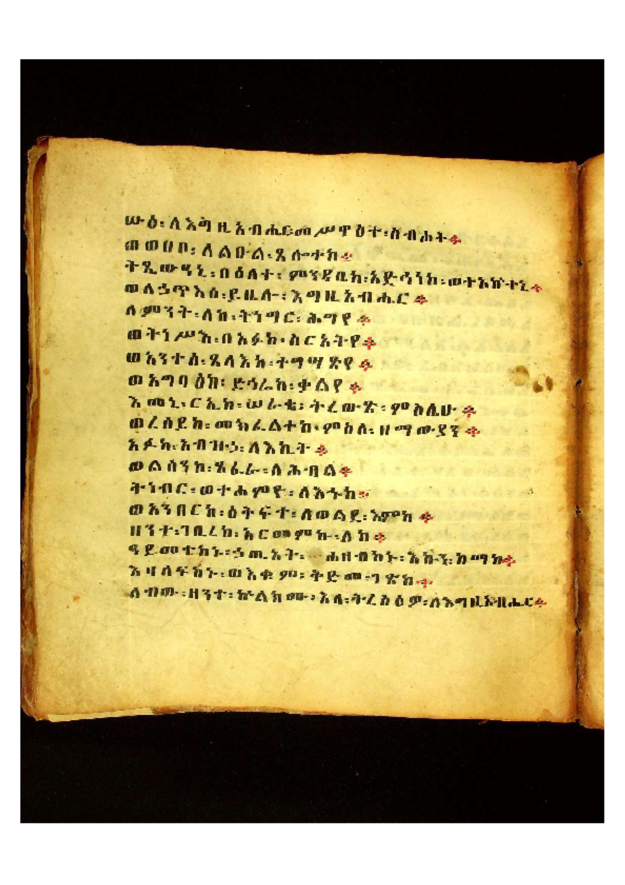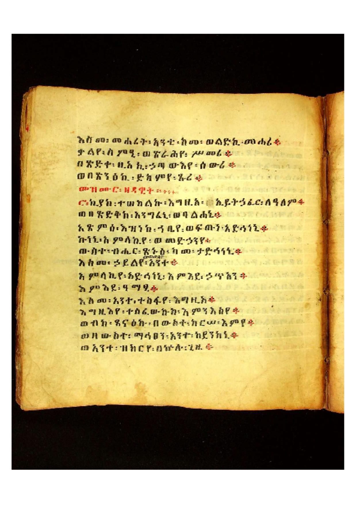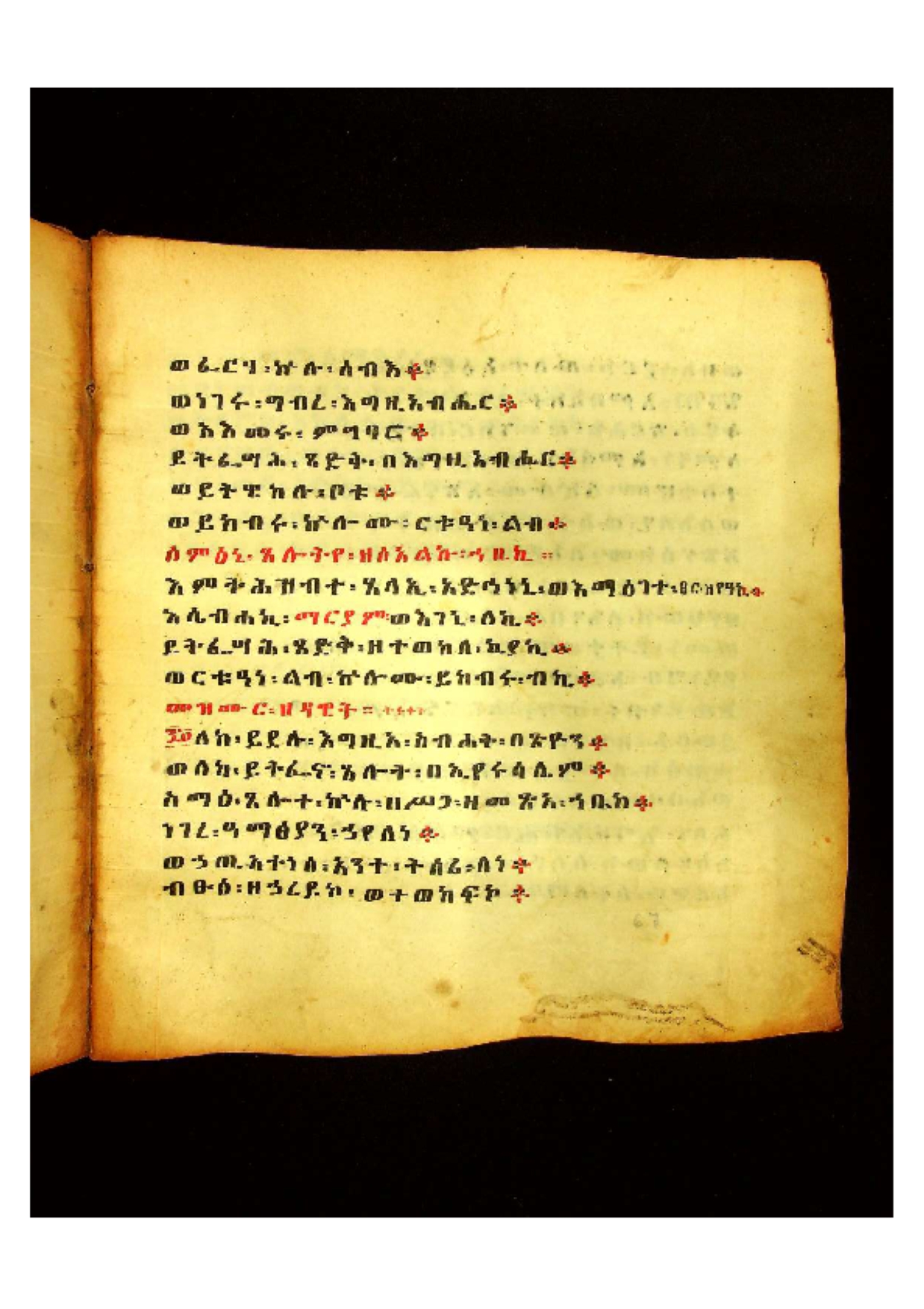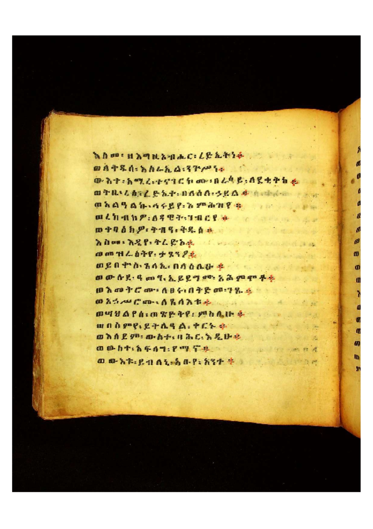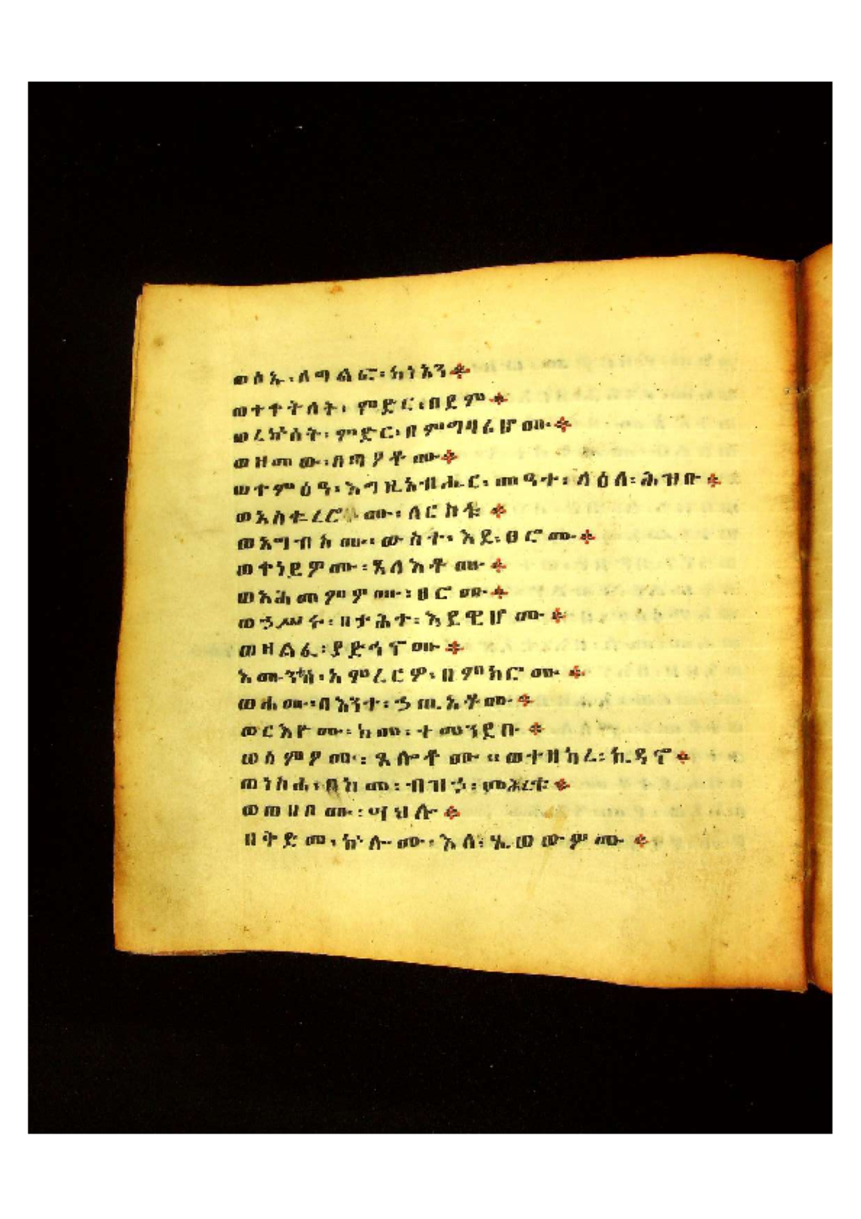 1. F. 2r: donation note written vertically in the outer margin, in black ink: “alla famiglia Bruschettini, Pussy […] Battaglia dell’Amba Aradam il 16 febbraio 1936 XIV”. The note, written in Italian and partly illegible, indicates the Bruschettini family as the receiver of the book and mentions the Battle of Amba Aradam, which took place on 16 February 1936. 2. F. 5r: note written in Italian in the outer upper margin, in red pencil: “Amba Aradam 16/2/XIV ore 17.30 P. Paloboni (?)”. This note also mentions the Battle of Amba Aradam, together with an individual whose name is partially unclear (P. Paloboni?). 3. F. 173v: supplication note written in small script in a mediocre hand, at the end of the “Psalms of David”: ዕቀበኒ፡ እምዓይነ፡ ደዌ፡ ወሞት፡ ለገብርከ፡ ደቅስዮስ፡, “protect me, your servant Däqsəyos, from the eye of infirmity and death”. The note mentions a certain Däqsəyos, indicated as “your servant” (possibly a later owner of the codex). 4. F. 173v: incipit of the Gəʿəz and Amharic prayer, perhaps a writing exercise. The note is written in an inaccurate calligraphy on the outer margin of the folio, next to the prayer. The entire text is የህፂ፡ ኖኅን፡ ከማየ[፡] አይኅ። እስራኤልን፡ ከፈርዖን፡ ዳዊትን፡ ከሳኦል፡ ከኢሎፍሊ። ኤ. 5. F. 190v: donation note, written in black ink in a mediocre hand. Text: ዝመጽሐፍ፡ ዘደብተራ፡ ኪሮስ፡ ዘወሀቦ፡ ለታቦተ፡ ሚካኤል፡ ኢትርስዑኒ፡ በአቡነ፡ ዘበሰማያት፡ ዘአቡየ፡ ገብረ፡ ማርያም፡ ወለእምየ፡ ወለተ፡ ሩፋኤል፡, “This book belongs to däbtära Kiros, who donated it to the tabot of [the church of St] Michael. Do not forget me for our Father who is in heaven. [It also belongs] to my father Gäbrä Maryam and my mother Wälättä Rufaʾel”. 6. F. 199v: writings executed in an inaccurate hand, perhaps the same of note 4. The note includes pen trials (ፈቲነ፡ ብርዕ፡ ዘፈረና፡ etc.), reproduces the explicit of the “Song of the songs” (ስብሐታተኪ፡ ማርያም፡ ከመ፡ እንተ፡ ሕልቀት፡ etc.) and the incipit of the “Praise of Mary” (ውዳሴ፡ ዘሰኑይ፡ ፈቀደ፡ እግዚእ፡ etc., partly rubricated). The writings also mention Däqsəyos, indicated as “your servant” (possibly a later owner of the codex) 7. F. 220ra–va: Genealogic note written on two columns. The note illustrates the family tree of King Yoḥannǝs I, who reigned from 1667 to 1682. The text is acephalous. Incipit: [ወለ]ደ፡ እምሐና፡ ብእሲቱ፡ አሦተ፡ ቅዱሳንሃ፡ ወአሦተ፡ ቅዱሳንኒ፡ እምነ፡ ጳውሊ፡ ብእሲሃ፡ ወለደቶሙ፡ ለአቤተኁን፡ ማእምሮ፡ ወለዘሥላሴ፡ ወአቤተኁን፡ ማእምሮኒ፡ ወለደ፡ አቃርዮስ፡ ወአቃርዮስኒ፡ ወለደ፡ እመቤት፡ እኅተ፡ ክርስቶስሃ፡. The text is published and translated in Proverbio D.V., 2000, ‘Inventario sommario dei manoscritti arabi, ebraici, etiopici – con notizia dei turchi – conservati presso la Biblioteca della Badia di Grottaferrata’. Atti della Accademia nazionale dei Lincei, Memorie, Classe di scienze morali, storiche e filologiche, serie IX, 12 (2000), 468–570 (here pp. 496–97, Appendice III). 8. F. 220va–b: Protective prayer against snakes, written on two columns. Incipit: በስመ፡ አብ፡ … ጸሎት፡ በእንተ፡ ዓርዌ፡ ምድር። ሶበ፡ በጽሐ፡ መልእክት፡ ሐሰውከ፡ በል፡ ፫ጊዜ፡ አኂዘከ፡ ዘፈረ፡ ልብሰ፡ ለእመ፡ ሀሎ፡ ርሑቀ፡ አስትዮ፡. The prayer is probably written in the same hand of note 7. 9. F. 220vb: Unidentified magic prayer containing asmat-names. Incipit: በስመ፡ አብ፡ … ኦላዘላህም፡ አህጉረ፡ ቀዳ[.]፡ ፍሖም፡ ሊስ፡ አፍሊስ፡ ምልክዮስ፡ ዘ[..]ማኤል፡ በዝንቱ፡ አስማቲከ፡ [.]ጽ[..] ኃይለ፡ በረድ፡ ወነፋስ፡ ከማሁ፡. |