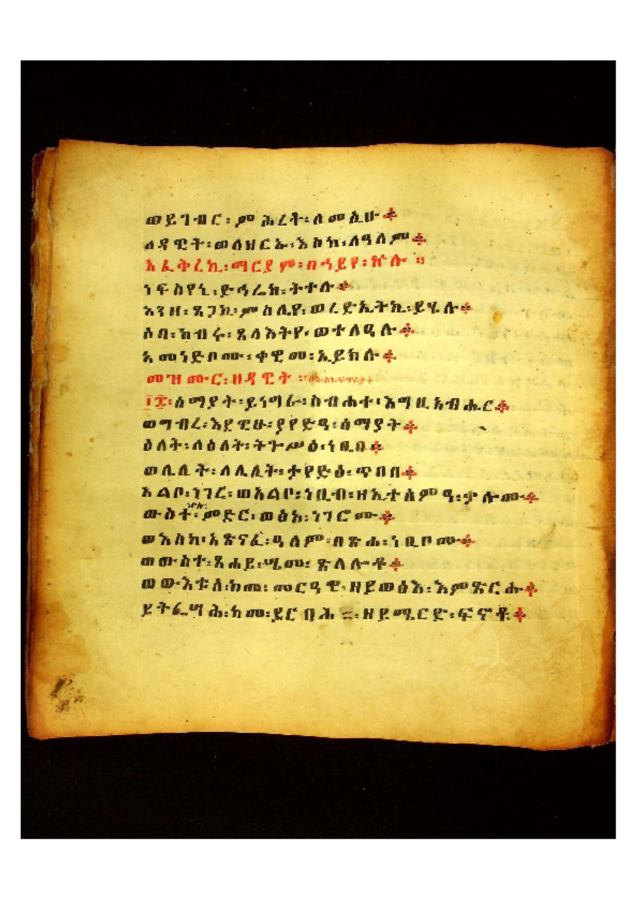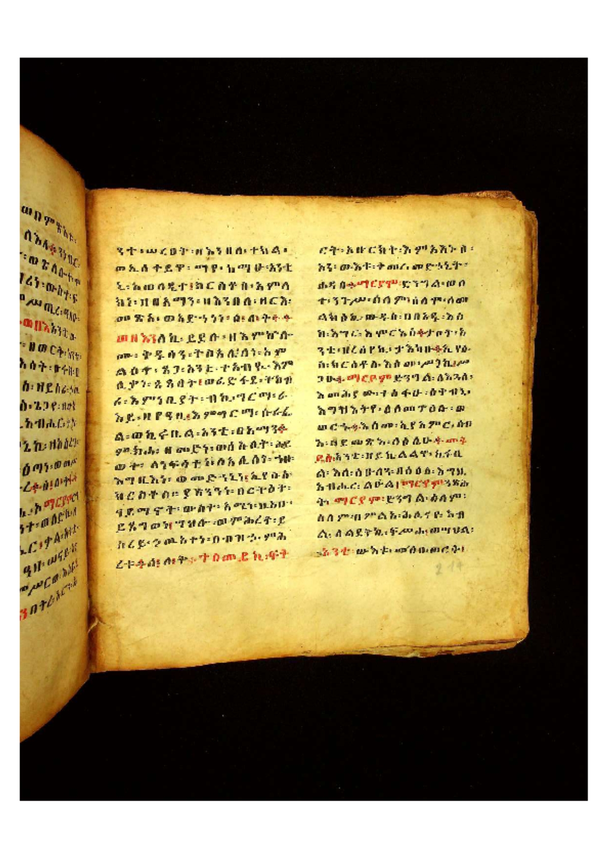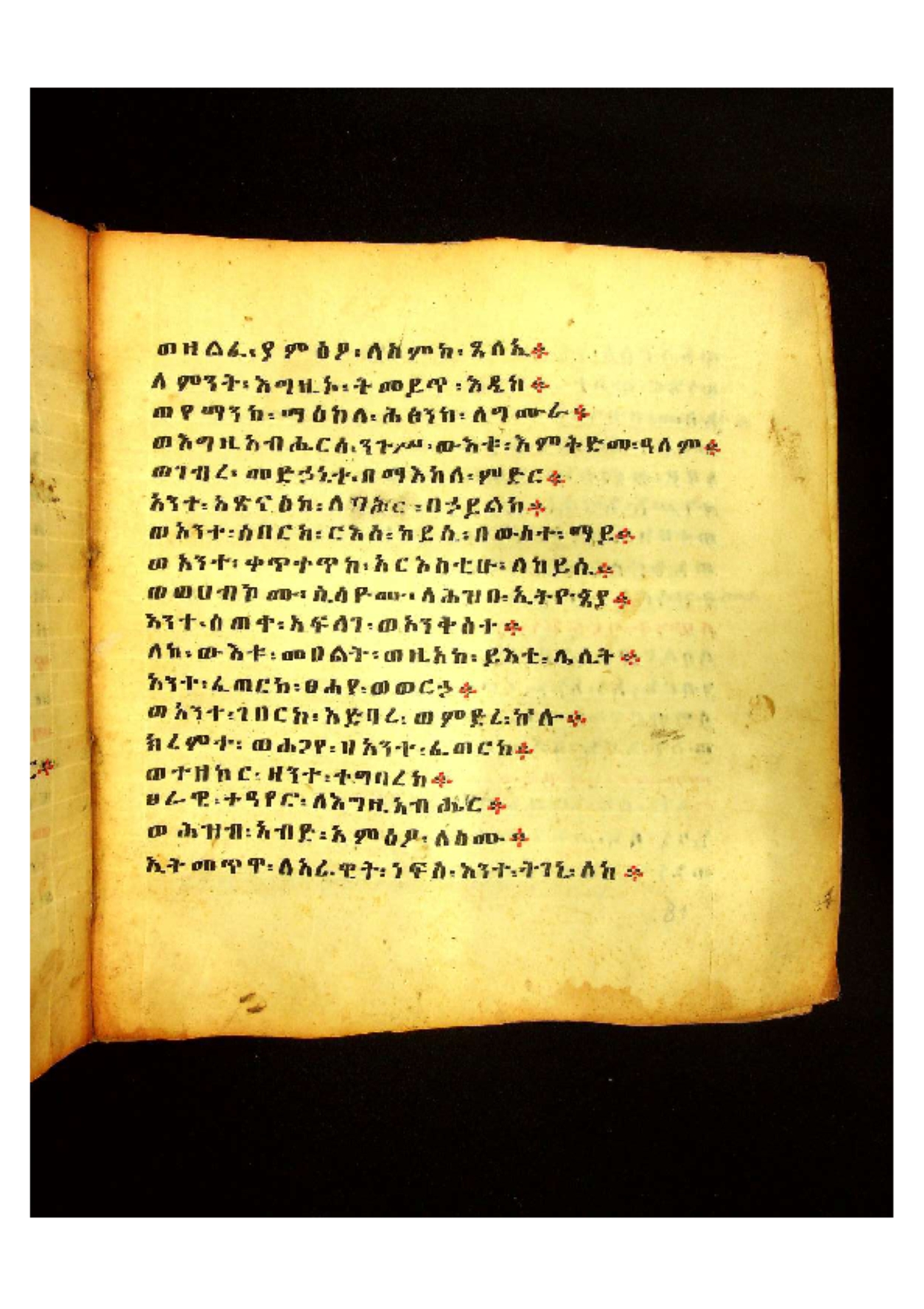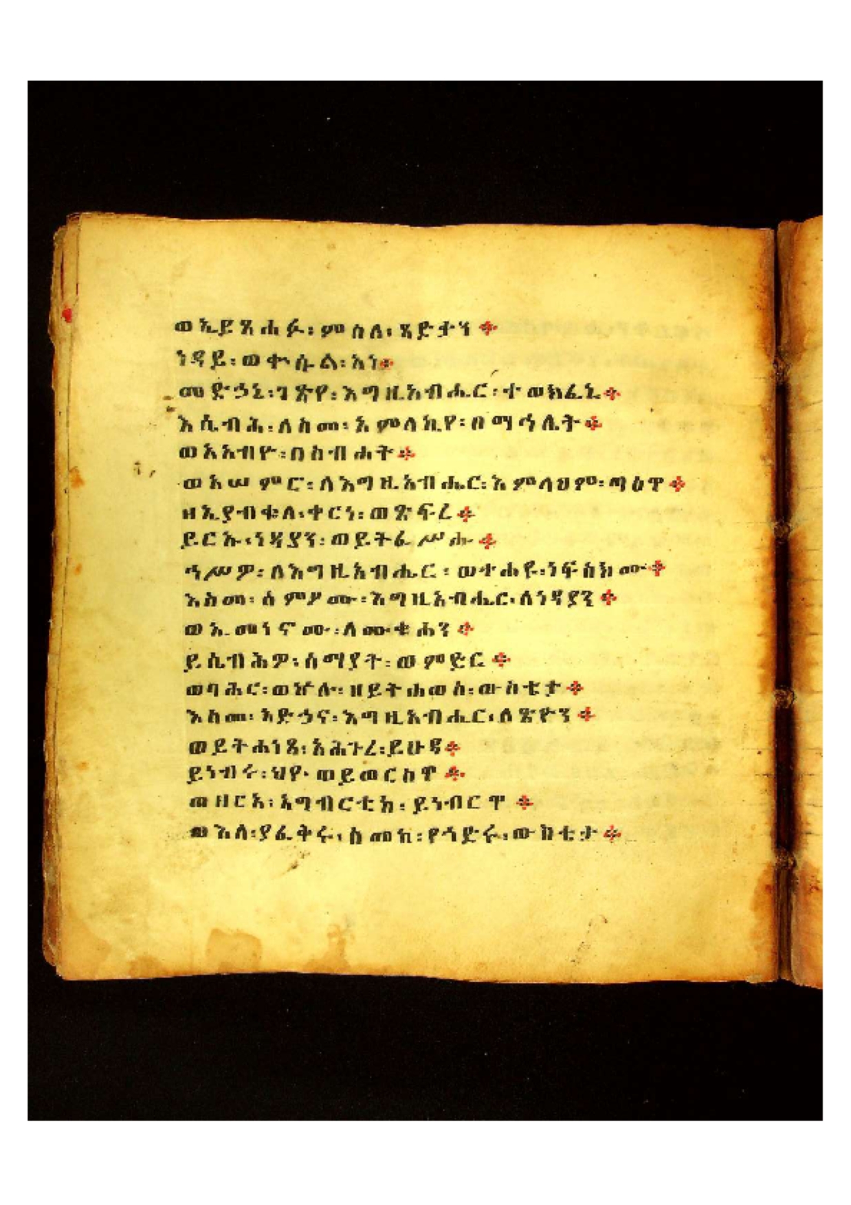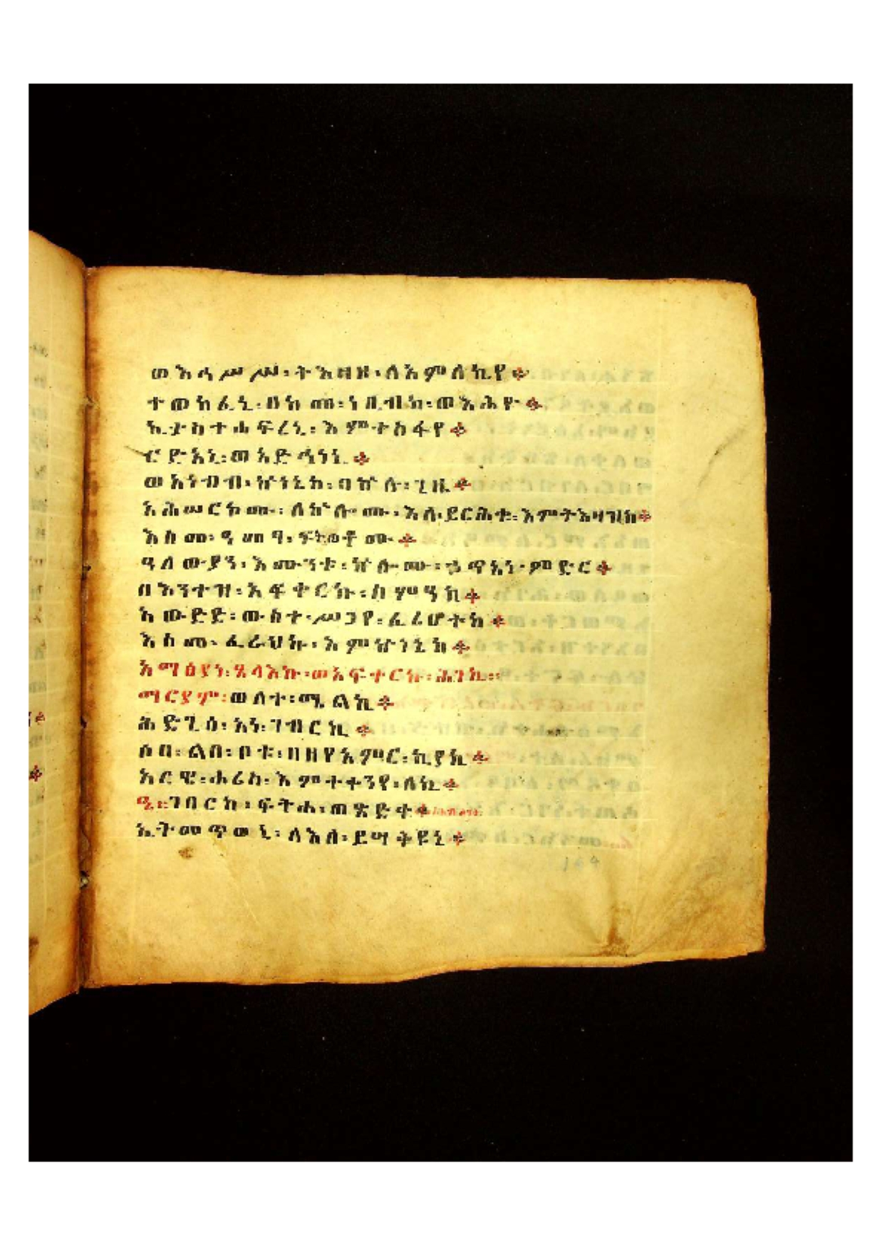 1. F. 2r: donation note written vertically in the outer margin, in black ink: “alla famiglia Bruschettini, Pussy […] Battaglia dell’Amba Aradam il 16 febbraio 1936 XIV”. The note, written in Italian and partly illegible, indicates the Bruschettini family as the receiver of the book and mentions the Battle of Amba Aradam, which took place on 16 February 1936. 2. F. 5r: note written in Italian in the outer upper margin, in red pencil: “Amba Aradam 16/2/XIV ore 17.30 P. Paloboni (?)”. This note also mentions the Battle of Amba Aradam, together with an individual whose name is partially unclear (P. Paloboni?). 3. F. 173v: supplication note written in small script in a mediocre hand, at the end of the “Psalms of David”: ዕቀበኒ፡ እምዓይነ፡ ደዌ፡ ወሞት፡ ለገብርከ፡ ደቅስዮስ፡, “protect me, your servant Däqsəyos, from the eye of infirmity and death”. The note mentions a certain Däqsəyos, indicated as “your servant” (possibly a later owner of the codex). 4. F. 173v: incipit of the Gəʿəz and Amharic prayer, perhaps a writing exercise. The note is written in an inaccurate calligraphy on the outer margin of the folio, next to the prayer. The entire text is የህፂ፡ ኖኅን፡ ከማየ[፡] አይኅ። እስራኤልን፡ ከፈርዖን፡ ዳዊትን፡ ከሳኦል፡ ከኢሎፍሊ። ኤ. 5. F. 190v: donation note, written in black ink in a mediocre hand. Text: ዝመጽሐፍ፡ ዘደብተራ፡ ኪሮስ፡ ዘወሀቦ፡ ለታቦተ፡ ሚካኤል፡ ኢትርስዑኒ፡ በአቡነ፡ ዘበሰማያት፡ ዘአቡየ፡ ገብረ፡ ማርያም፡ ወለእምየ፡ ወለተ፡ ሩፋኤል፡, “This book belongs to däbtära Kiros, who donated it to the tabot of [the church of St] Michael. Do not forget me for our Father who is in heaven. [It also belongs] to my father Gäbrä Maryam and my mother Wälättä Rufaʾel”. 6. F. 199v: writings executed in an inaccurate hand, perhaps the same of note 4. The note includes pen trials (ፈቲነ፡ ብርዕ፡ ዘፈረና፡ etc.), reproduces the explicit of the “Song of the songs” (ስብሐታተኪ፡ ማርያም፡ ከመ፡ እንተ፡ ሕልቀት፡ etc.) and the incipit of the “Praise of Mary” (ውዳሴ፡ ዘሰኑይ፡ ፈቀደ፡ እግዚእ፡ etc., partly rubricated). The writings also mention Däqsəyos, indicated as “your servant” (possibly a later owner of the codex) 7. F. 220ra–va: Genealogic note written on two columns. The note illustrates the family tree of King Yoḥannǝs I, who reigned from 1667 to 1682. The text is acephalous. Incipit: [ወለ]ደ፡ እምሐና፡ ብእሲቱ፡ አሦተ፡ ቅዱሳንሃ፡ ወአሦተ፡ ቅዱሳንኒ፡ እምነ፡ ጳውሊ፡ ብእሲሃ፡ ወለደቶሙ፡ ለአቤተኁን፡ ማእምሮ፡ ወለዘሥላሴ፡ ወአቤተኁን፡ ማእምሮኒ፡ ወለደ፡ አቃርዮስ፡ ወአቃርዮስኒ፡ ወለደ፡ እመቤት፡ እኅተ፡ ክርስቶስሃ፡. The text is published and translated in Proverbio D.V., 2000, ‘Inventario sommario dei manoscritti arabi, ebraici, etiopici – con notizia dei turchi – conservati presso la Biblioteca della Badia di Grottaferrata’. Atti della Accademia nazionale dei Lincei, Memorie, Classe di scienze morali, storiche e filologiche, serie IX, 12 (2000), 468–570 (here pp. 496–97, Appendice III). 8. F. 220va–b: Protective prayer against snakes, written on two columns. Incipit: በስመ፡ አብ፡ … ጸሎት፡ በእንተ፡ ዓርዌ፡ ምድር። ሶበ፡ በጽሐ፡ መልእክት፡ ሐሰውከ፡ በል፡ ፫ጊዜ፡ አኂዘከ፡ ዘፈረ፡ ልብሰ፡ ለእመ፡ ሀሎ፡ ርሑቀ፡ አስትዮ፡. The prayer is probably written in the same hand of note 7. 9. F. 220vb: Unidentified magic prayer containing asmat-names. Incipit: በስመ፡ አብ፡ … ኦላዘላህም፡ አህጉረ፡ ቀዳ[.]፡ ፍሖም፡ ሊስ፡ አፍሊስ፡ ምልክዮስ፡ ዘ[..]ማኤል፡ በዝንቱ፡ አስማቲከ፡ [.]ጽ[..] ኃይለ፡ በረድ፡ ወነፋስ፡ ከማሁ፡. |