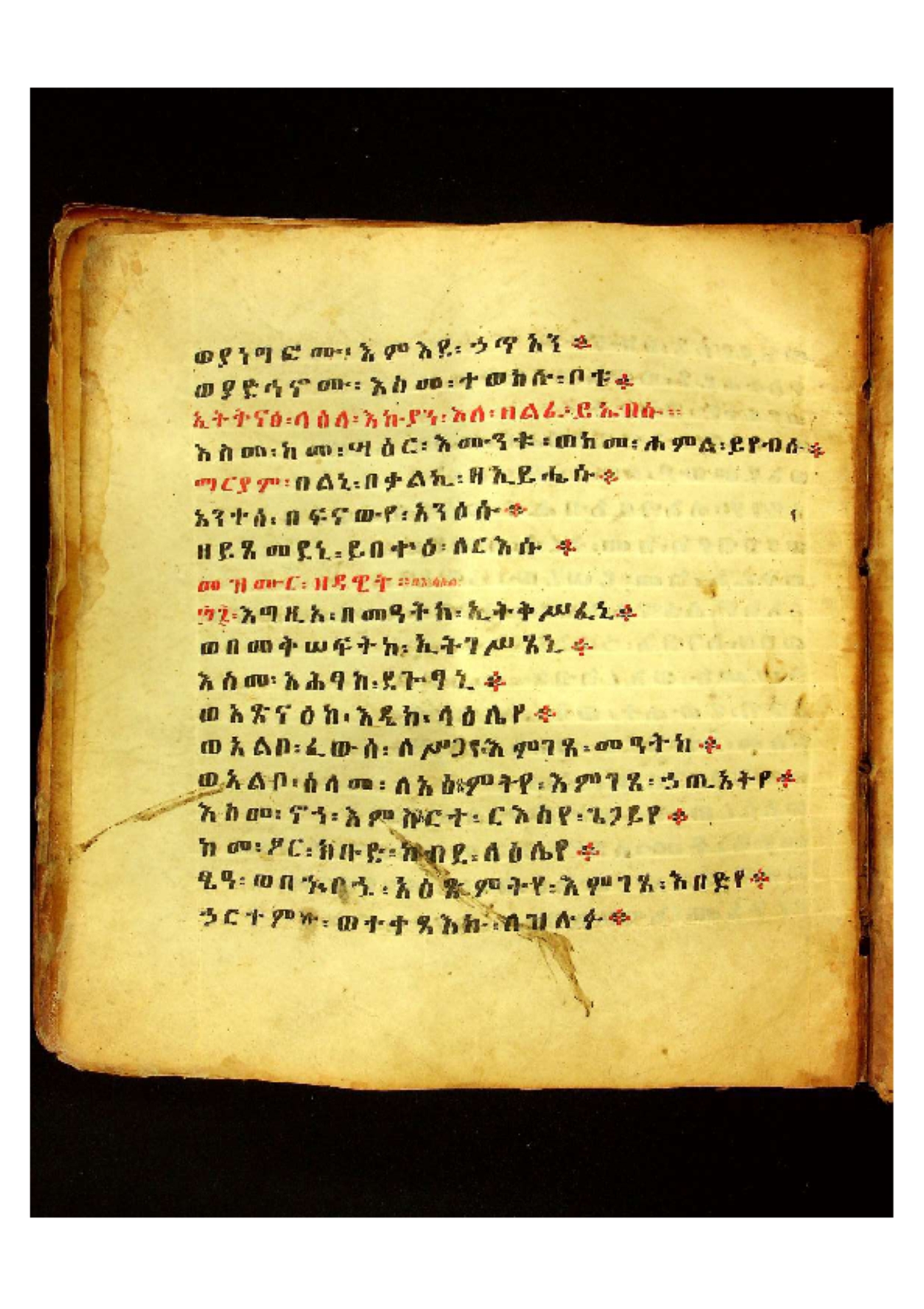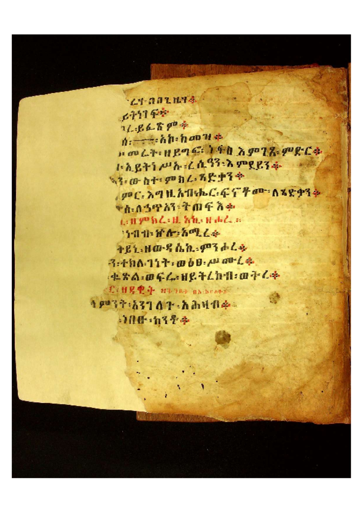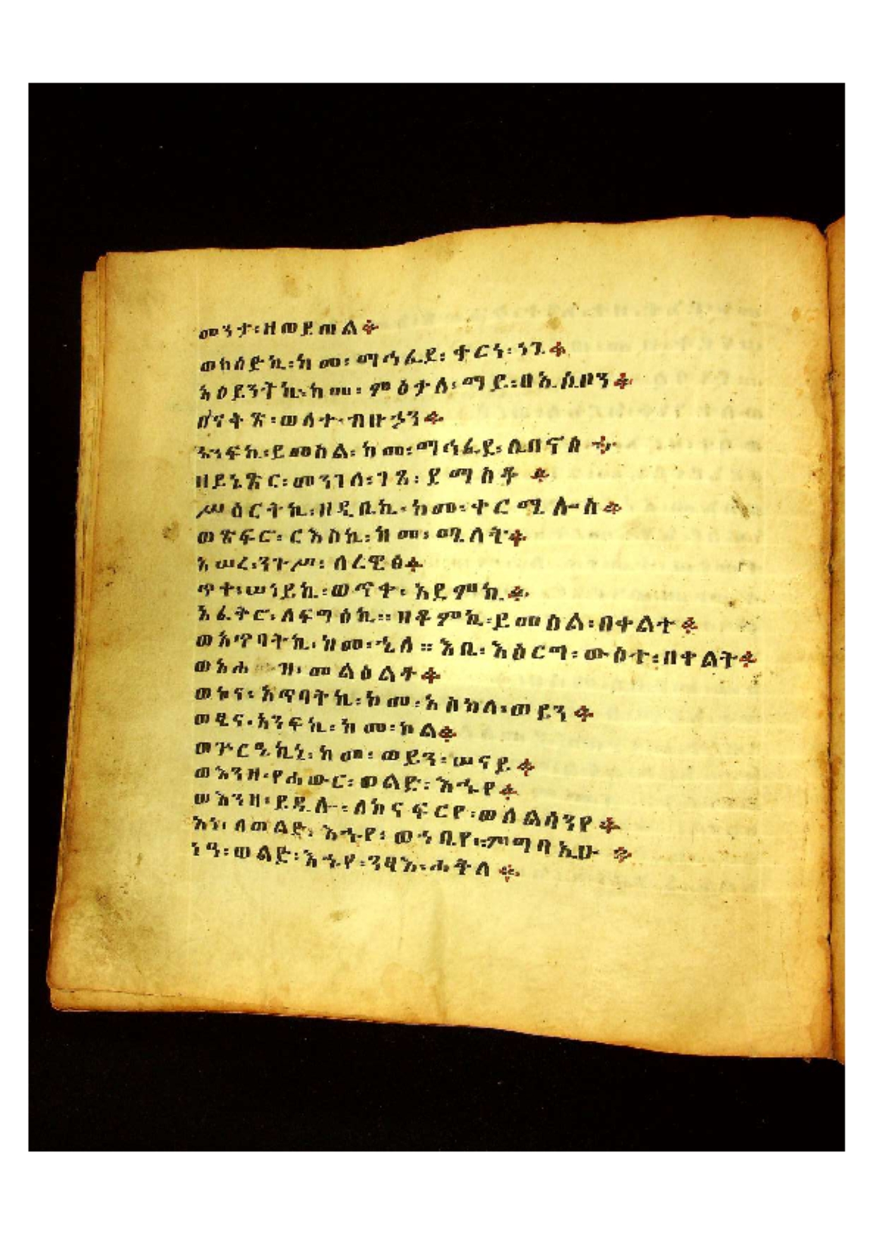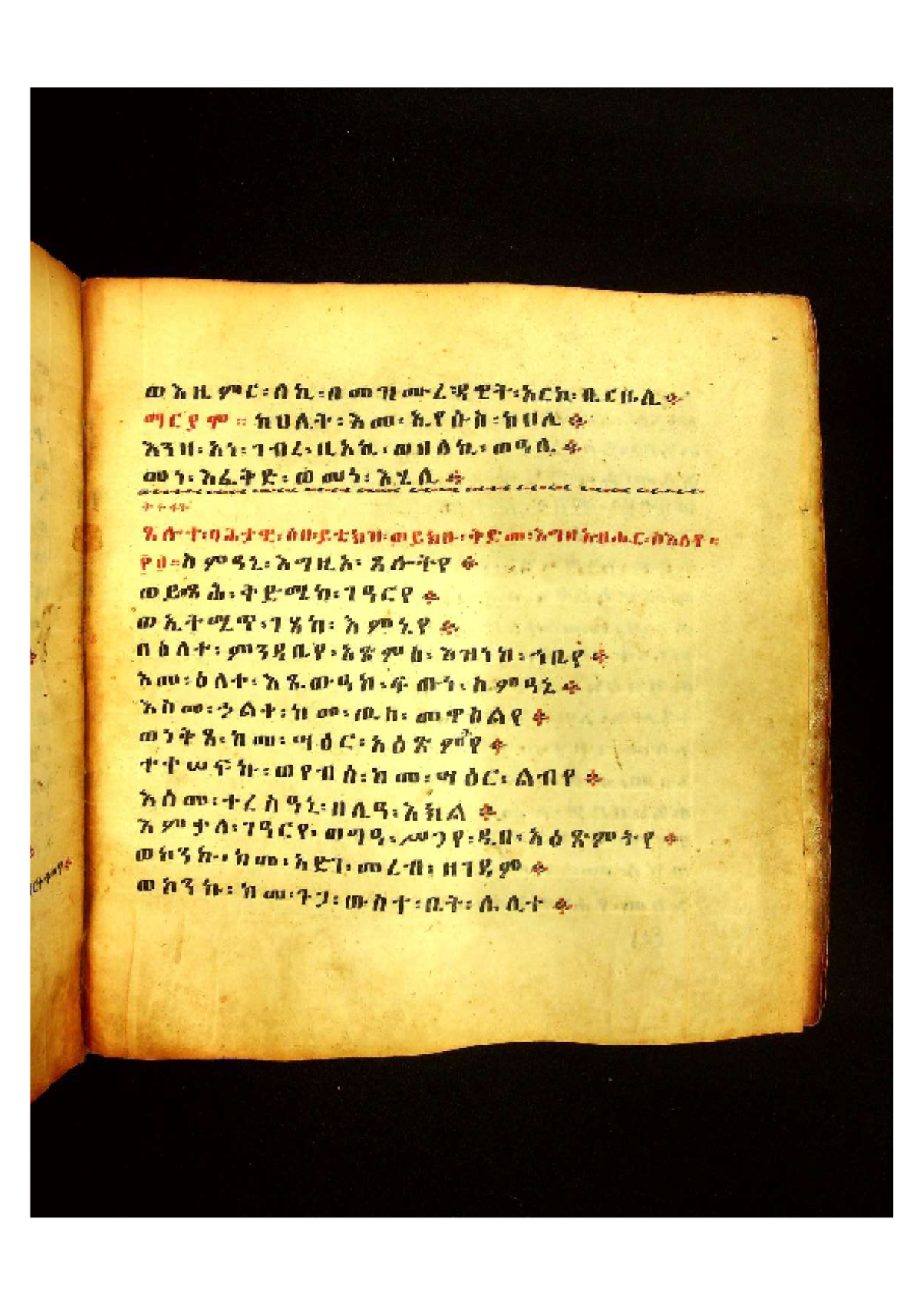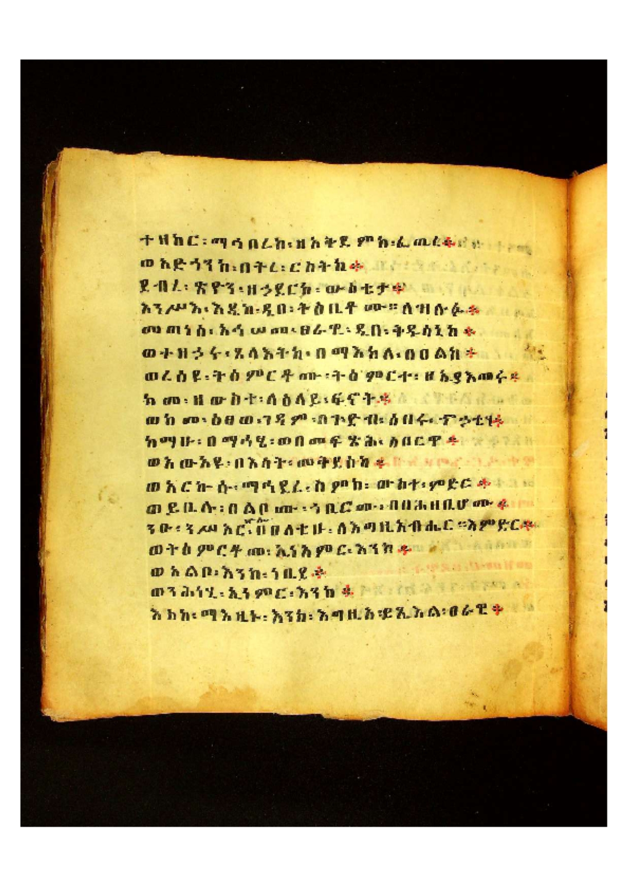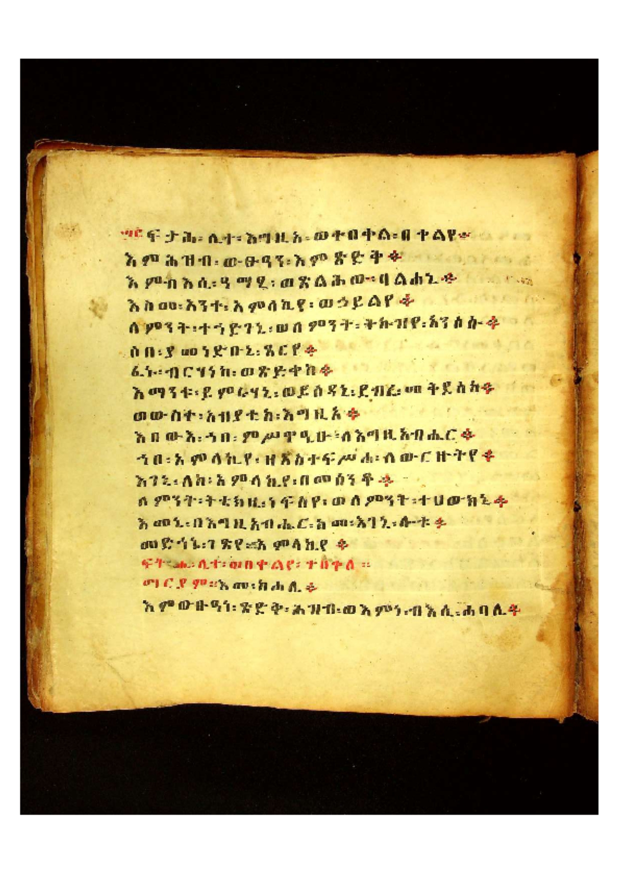 1. F. 2r: donation note written vertically in the outer margin, in black ink: “alla famiglia Bruschettini, Pussy […] Battaglia dell’Amba Aradam il 16 febbraio 1936 XIV”. The note, written in Italian and partly illegible, indicates the Bruschettini family as the receiver of the book and mentions the Battle of Amba Aradam, which took place on 16 February 1936. 2. F. 5r: note written in Italian in the outer upper margin, in red pencil: “Amba Aradam 16/2/XIV ore 17.30 P. Paloboni (?)”. This note also mentions the Battle of Amba Aradam, together with an individual whose name is partially unclear (P. Paloboni?). 3. F. 173v: supplication note written in small script in a mediocre hand, at the end of the “Psalms of David”: ዕቀበኒ፡ እምዓይነ፡ ደዌ፡ ወሞት፡ ለገብርከ፡ ደቅስዮስ፡, “protect me, your servant Däqsəyos, from the eye of infirmity and death”. The note mentions a certain Däqsəyos, indicated as “your servant” (possibly a later owner of the codex). 4. F. 173v: incipit of the Gəʿəz and Amharic prayer, perhaps a writing exercise. The note is written in an inaccurate calligraphy on the outer margin of the folio, next to the prayer. The entire text is የህፂ፡ ኖኅን፡ ከማየ[፡] አይኅ። እስራኤልን፡ ከፈርዖን፡ ዳዊትን፡ ከሳኦል፡ ከኢሎፍሊ። ኤ. 5. F. 190v: donation note, written in black ink in a mediocre hand. Text: ዝመጽሐፍ፡ ዘደብተራ፡ ኪሮስ፡ ዘወሀቦ፡ ለታቦተ፡ ሚካኤል፡ ኢትርስዑኒ፡ በአቡነ፡ ዘበሰማያት፡ ዘአቡየ፡ ገብረ፡ ማርያም፡ ወለእምየ፡ ወለተ፡ ሩፋኤል፡, “This book belongs to däbtära Kiros, who donated it to the tabot of [the church of St] Michael. Do not forget me for our Father who is in heaven. [It also belongs] to my father Gäbrä Maryam and my mother Wälättä Rufaʾel”. 6. F. 199v: writings executed in an inaccurate hand, perhaps the same of note 4. The note includes pen trials (ፈቲነ፡ ብርዕ፡ ዘፈረና፡ etc.), reproduces the explicit of the “Song of the songs” (ስብሐታተኪ፡ ማርያም፡ ከመ፡ እንተ፡ ሕልቀት፡ etc.) and the incipit of the “Praise of Mary” (ውዳሴ፡ ዘሰኑይ፡ ፈቀደ፡ እግዚእ፡ etc., partly rubricated). The writings also mention Däqsəyos, indicated as “your servant” (possibly a later owner of the codex) 7. F. 220ra–va: Genealogic note written on two columns. The note illustrates the family tree of King Yoḥannǝs I, who reigned from 1667 to 1682. The text is acephalous. Incipit: [ወለ]ደ፡ እምሐና፡ ብእሲቱ፡ አሦተ፡ ቅዱሳንሃ፡ ወአሦተ፡ ቅዱሳንኒ፡ እምነ፡ ጳውሊ፡ ብእሲሃ፡ ወለደቶሙ፡ ለአቤተኁን፡ ማእምሮ፡ ወለዘሥላሴ፡ ወአቤተኁን፡ ማእምሮኒ፡ ወለደ፡ አቃርዮስ፡ ወአቃርዮስኒ፡ ወለደ፡ እመቤት፡ እኅተ፡ ክርስቶስሃ፡. The text is published and translated in Proverbio D.V., 2000, ‘Inventario sommario dei manoscritti arabi, ebraici, etiopici – con notizia dei turchi – conservati presso la Biblioteca della Badia di Grottaferrata’. Atti della Accademia nazionale dei Lincei, Memorie, Classe di scienze morali, storiche e filologiche, serie IX, 12 (2000), 468–570 (here pp. 496–97, Appendice III). 8. F. 220va–b: Protective prayer against snakes, written on two columns. Incipit: በስመ፡ አብ፡ … ጸሎት፡ በእንተ፡ ዓርዌ፡ ምድር። ሶበ፡ በጽሐ፡ መልእክት፡ ሐሰውከ፡ በል፡ ፫ጊዜ፡ አኂዘከ፡ ዘፈረ፡ ልብሰ፡ ለእመ፡ ሀሎ፡ ርሑቀ፡ አስትዮ፡. The prayer is probably written in the same hand of note 7. 9. F. 220vb: Unidentified magic prayer containing asmat-names. Incipit: በስመ፡ አብ፡ … ኦላዘላህም፡ አህጉረ፡ ቀዳ[.]፡ ፍሖም፡ ሊስ፡ አፍሊስ፡ ምልክዮስ፡ ዘ[..]ማኤል፡ በዝንቱ፡ አስማቲከ፡ [.]ጽ[..] ኃይለ፡ በረድ፡ ወነፋስ፡ ከማሁ፡. |