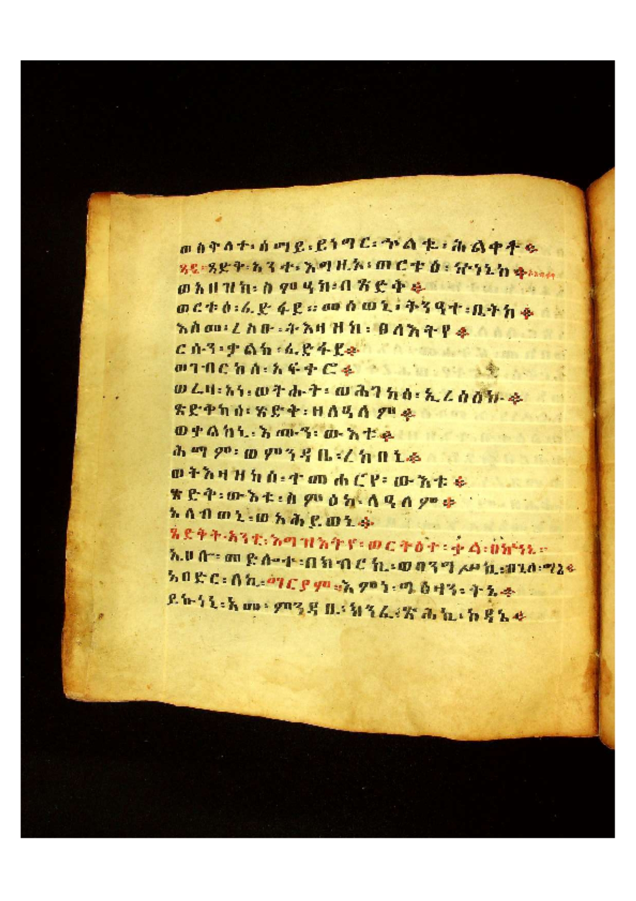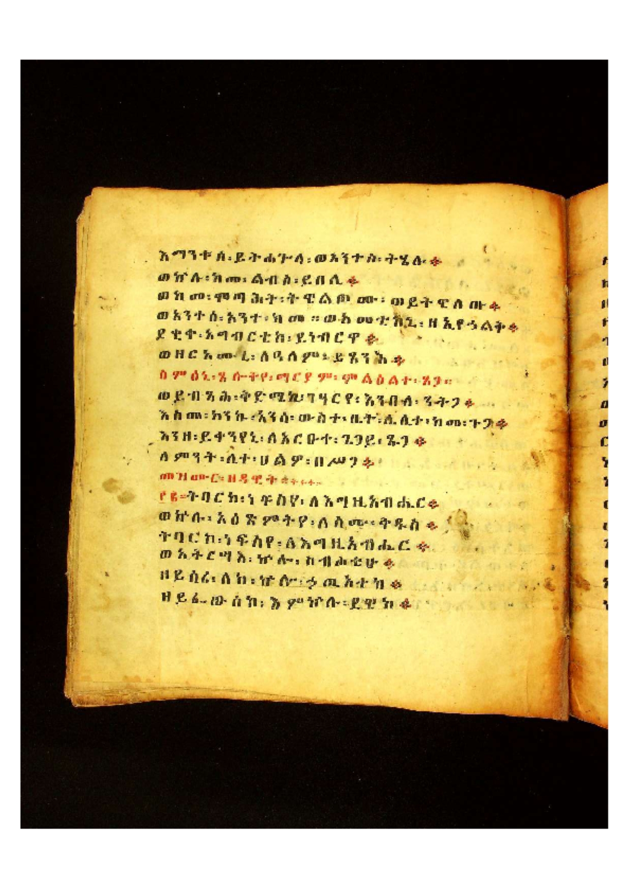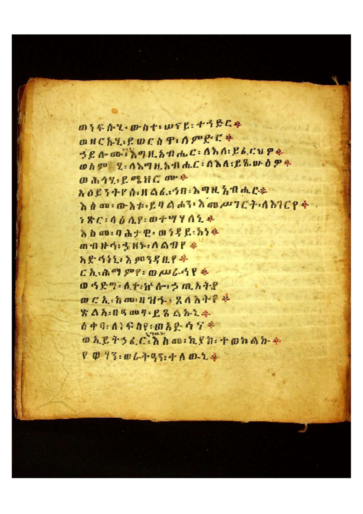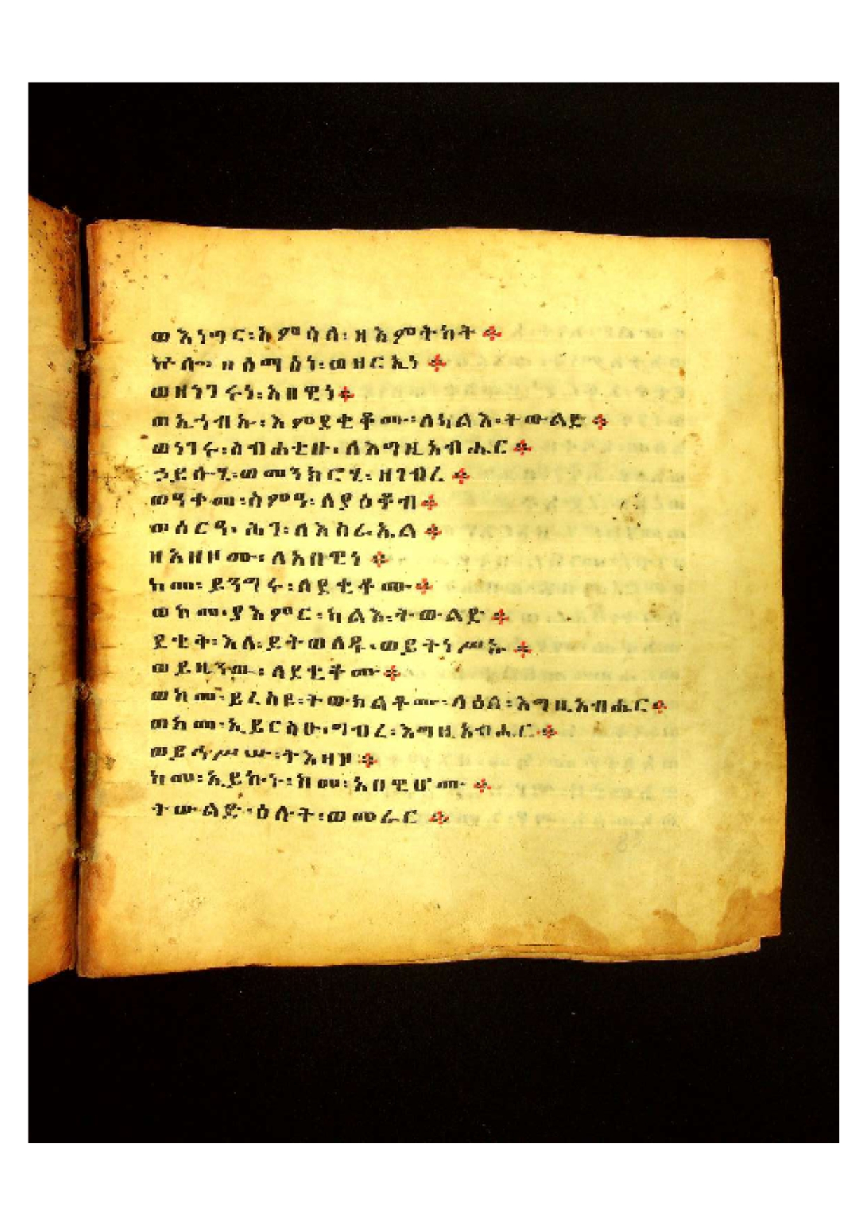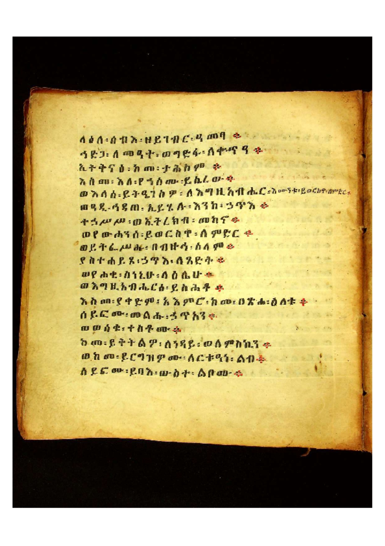 1. F. 2r: donation note written vertically in the outer margin, in black ink: “alla famiglia Bruschettini, Pussy […] Battaglia dell’Amba Aradam il 16 febbraio 1936 XIV”. The note, written in Italian and partly illegible, indicates the Bruschettini family as the receiver of the book and mentions the Battle of Amba Aradam, which took place on 16 February 1936. 2. F. 5r: note written in Italian in the outer upper margin, in red pencil: “Amba Aradam 16/2/XIV ore 17.30 P. Paloboni (?)”. This note also mentions the Battle of Amba Aradam, together with an individual whose name is partially unclear (P. Paloboni?). 3. F. 173v: supplication note written in small script in a mediocre hand, at the end of the “Psalms of David”: ዕቀበኒ፡ እምዓይነ፡ ደዌ፡ ወሞት፡ ለገብርከ፡ ደቅስዮስ፡, “protect me, your servant Däqsəyos, from the eye of infirmity and death”. The note mentions a certain Däqsəyos, indicated as “your servant” (possibly a later owner of the codex). 4. F. 173v: incipit of the Gəʿəz and Amharic prayer, perhaps a writing exercise. The note is written in an inaccurate calligraphy on the outer margin of the folio, next to the prayer. The entire text is የህፂ፡ ኖኅን፡ ከማየ[፡] አይኅ። እስራኤልን፡ ከፈርዖን፡ ዳዊትን፡ ከሳኦል፡ ከኢሎፍሊ። ኤ. 5. F. 190v: donation note, written in black ink in a mediocre hand. Text: ዝመጽሐፍ፡ ዘደብተራ፡ ኪሮስ፡ ዘወሀቦ፡ ለታቦተ፡ ሚካኤል፡ ኢትርስዑኒ፡ በአቡነ፡ ዘበሰማያት፡ ዘአቡየ፡ ገብረ፡ ማርያም፡ ወለእምየ፡ ወለተ፡ ሩፋኤል፡, “This book belongs to däbtära Kiros, who donated it to the tabot of [the church of St] Michael. Do not forget me for our Father who is in heaven. [It also belongs] to my father Gäbrä Maryam and my mother Wälättä Rufaʾel”. 6. F. 199v: writings executed in an inaccurate hand, perhaps the same of note 4. The note includes pen trials (ፈቲነ፡ ብርዕ፡ ዘፈረና፡ etc.), reproduces the explicit of the “Song of the songs” (ስብሐታተኪ፡ ማርያም፡ ከመ፡ እንተ፡ ሕልቀት፡ etc.) and the incipit of the “Praise of Mary” (ውዳሴ፡ ዘሰኑይ፡ ፈቀደ፡ እግዚእ፡ etc., partly rubricated). The writings also mention Däqsəyos, indicated as “your servant” (possibly a later owner of the codex) 7. F. 220ra–va: Genealogic note written on two columns. The note illustrates the family tree of King Yoḥannǝs I, who reigned from 1667 to 1682. The text is acephalous. Incipit: [ወለ]ደ፡ እምሐና፡ ብእሲቱ፡ አሦተ፡ ቅዱሳንሃ፡ ወአሦተ፡ ቅዱሳንኒ፡ እምነ፡ ጳውሊ፡ ብእሲሃ፡ ወለደቶሙ፡ ለአቤተኁን፡ ማእምሮ፡ ወለዘሥላሴ፡ ወአቤተኁን፡ ማእምሮኒ፡ ወለደ፡ አቃርዮስ፡ ወአቃርዮስኒ፡ ወለደ፡ እመቤት፡ እኅተ፡ ክርስቶስሃ፡. The text is published and translated in Proverbio D.V., 2000, ‘Inventario sommario dei manoscritti arabi, ebraici, etiopici – con notizia dei turchi – conservati presso la Biblioteca della Badia di Grottaferrata’. Atti della Accademia nazionale dei Lincei, Memorie, Classe di scienze morali, storiche e filologiche, serie IX, 12 (2000), 468–570 (here pp. 496–97, Appendice III). 8. F. 220va–b: Protective prayer against snakes, written on two columns. Incipit: በስመ፡ አብ፡ … ጸሎት፡ በእንተ፡ ዓርዌ፡ ምድር። ሶበ፡ በጽሐ፡ መልእክት፡ ሐሰውከ፡ በል፡ ፫ጊዜ፡ አኂዘከ፡ ዘፈረ፡ ልብሰ፡ ለእመ፡ ሀሎ፡ ርሑቀ፡ አስትዮ፡. The prayer is probably written in the same hand of note 7. 9. F. 220vb: Unidentified magic prayer containing asmat-names. Incipit: በስመ፡ አብ፡ … ኦላዘላህም፡ አህጉረ፡ ቀዳ[.]፡ ፍሖም፡ ሊስ፡ አፍሊስ፡ ምልክዮስ፡ ዘ[..]ማኤል፡ በዝንቱ፡ አስማቲከ፡ [.]ጽ[..] ኃይለ፡ በረድ፡ ወነፋስ፡ ከማሁ፡. |