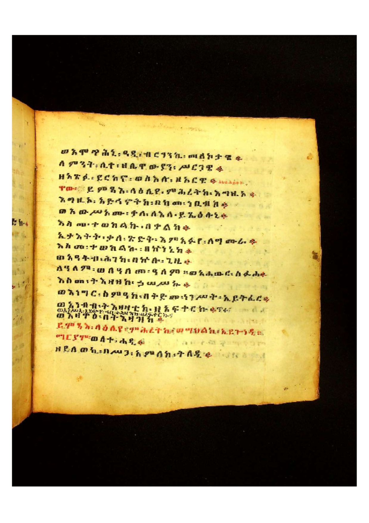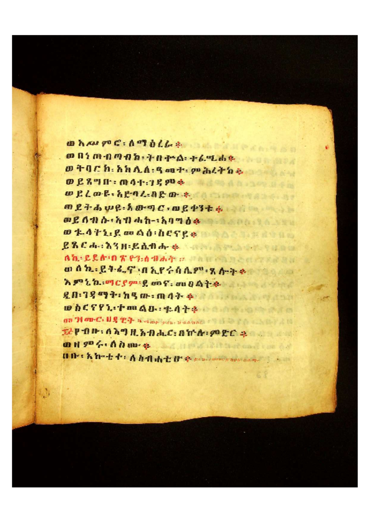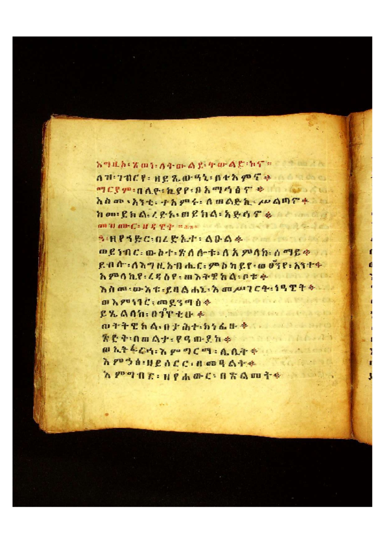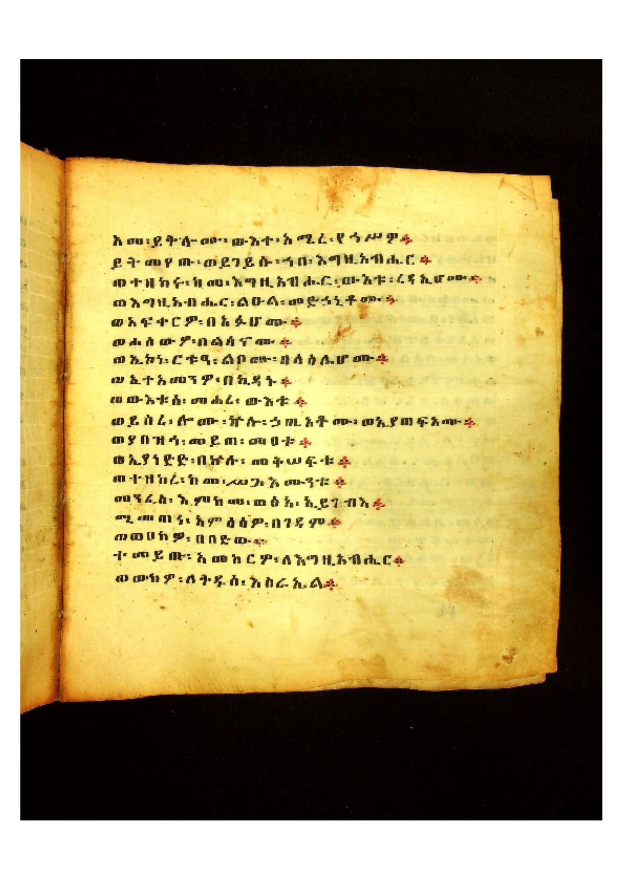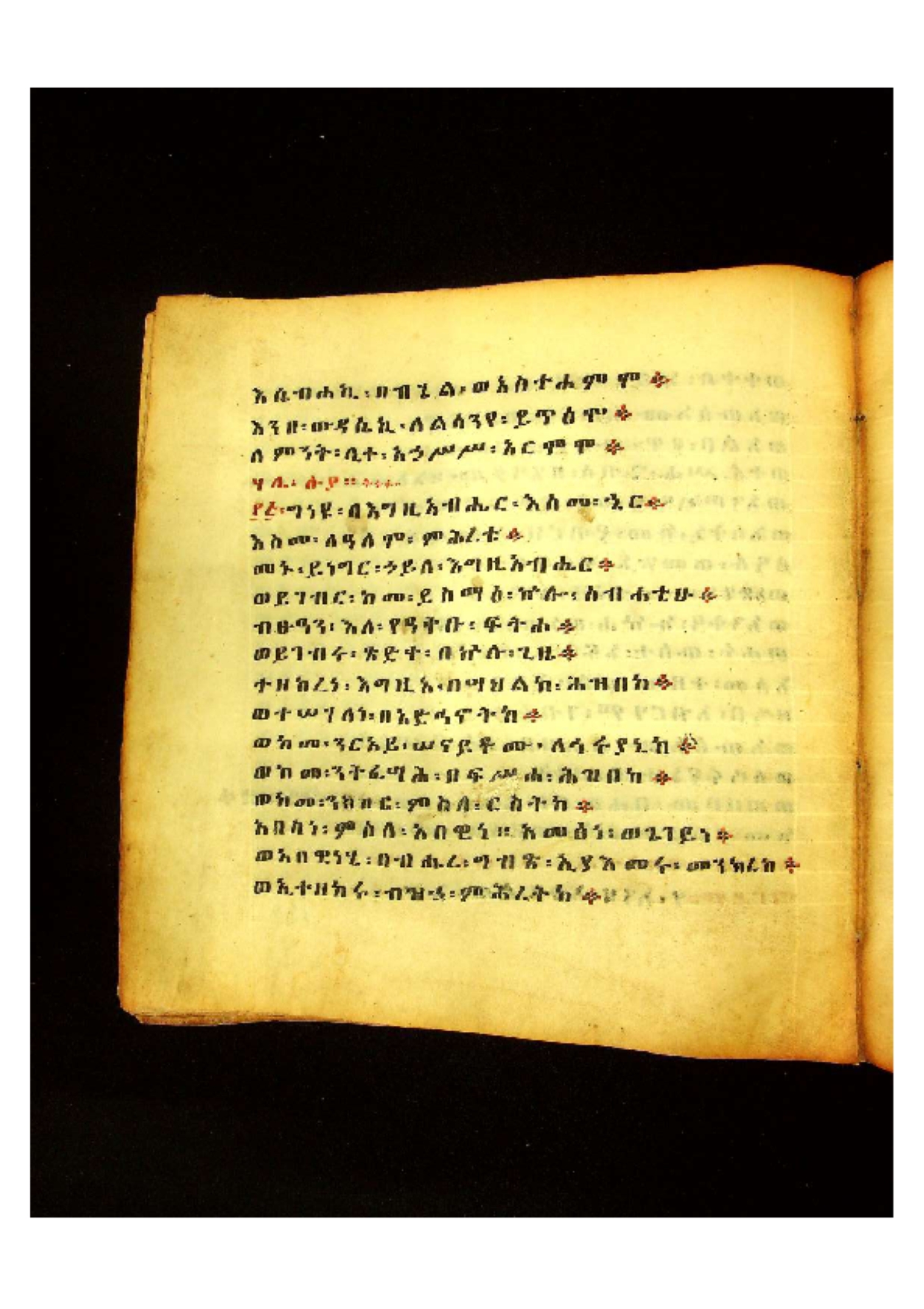 1. F. 2r: donation note written vertically in the outer margin, in black ink: “alla famiglia Bruschettini, Pussy […] Battaglia dell’Amba Aradam il 16 febbraio 1936 XIV”. The note, written in Italian and partly illegible, indicates the Bruschettini family as the receiver of the book and mentions the Battle of Amba Aradam, which took place on 16 February 1936. 2. F. 5r: note written in Italian in the outer upper margin, in red pencil: “Amba Aradam 16/2/XIV ore 17.30 P. Paloboni (?)”. This note also mentions the Battle of Amba Aradam, together with an individual whose name is partially unclear (P. Paloboni?). 3. F. 173v: supplication note written in small script in a mediocre hand, at the end of the “Psalms of David”: ዕቀበኒ፡ እምዓይነ፡ ደዌ፡ ወሞት፡ ለገብርከ፡ ደቅስዮስ፡, “protect me, your servant Däqsəyos, from the eye of infirmity and death”. The note mentions a certain Däqsəyos, indicated as “your servant” (possibly a later owner of the codex). 4. F. 173v: incipit of the Gəʿəz and Amharic prayer, perhaps a writing exercise. The note is written in an inaccurate calligraphy on the outer margin of the folio, next to the prayer. The entire text is የህፂ፡ ኖኅን፡ ከማየ[፡] አይኅ። እስራኤልን፡ ከፈርዖን፡ ዳዊትን፡ ከሳኦል፡ ከኢሎፍሊ። ኤ. 5. F. 190v: donation note, written in black ink in a mediocre hand. Text: ዝመጽሐፍ፡ ዘደብተራ፡ ኪሮስ፡ ዘወሀቦ፡ ለታቦተ፡ ሚካኤል፡ ኢትርስዑኒ፡ በአቡነ፡ ዘበሰማያት፡ ዘአቡየ፡ ገብረ፡ ማርያም፡ ወለእምየ፡ ወለተ፡ ሩፋኤል፡, “This book belongs to däbtära Kiros, who donated it to the tabot of [the church of St] Michael. Do not forget me for our Father who is in heaven. [It also belongs] to my father Gäbrä Maryam and my mother Wälättä Rufaʾel”. 6. F. 199v: writings executed in an inaccurate hand, perhaps the same of note 4. The note includes pen trials (ፈቲነ፡ ብርዕ፡ ዘፈረና፡ etc.), reproduces the explicit of the “Song of the songs” (ስብሐታተኪ፡ ማርያም፡ ከመ፡ እንተ፡ ሕልቀት፡ etc.) and the incipit of the “Praise of Mary” (ውዳሴ፡ ዘሰኑይ፡ ፈቀደ፡ እግዚእ፡ etc., partly rubricated). The writings also mention Däqsəyos, indicated as “your servant” (possibly a later owner of the codex) 7. F. 220ra–va: Genealogic note written on two columns. The note illustrates the family tree of King Yoḥannǝs I, who reigned from 1667 to 1682. The text is acephalous. Incipit: [ወለ]ደ፡ እምሐና፡ ብእሲቱ፡ አሦተ፡ ቅዱሳንሃ፡ ወአሦተ፡ ቅዱሳንኒ፡ እምነ፡ ጳውሊ፡ ብእሲሃ፡ ወለደቶሙ፡ ለአቤተኁን፡ ማእምሮ፡ ወለዘሥላሴ፡ ወአቤተኁን፡ ማእምሮኒ፡ ወለደ፡ አቃርዮስ፡ ወአቃርዮስኒ፡ ወለደ፡ እመቤት፡ እኅተ፡ ክርስቶስሃ፡. The text is published and translated in Proverbio D.V., 2000, ‘Inventario sommario dei manoscritti arabi, ebraici, etiopici – con notizia dei turchi – conservati presso la Biblioteca della Badia di Grottaferrata’. Atti della Accademia nazionale dei Lincei, Memorie, Classe di scienze morali, storiche e filologiche, serie IX, 12 (2000), 468–570 (here pp. 496–97, Appendice III). 8. F. 220va–b: Protective prayer against snakes, written on two columns. Incipit: በስመ፡ አብ፡ … ጸሎት፡ በእንተ፡ ዓርዌ፡ ምድር። ሶበ፡ በጽሐ፡ መልእክት፡ ሐሰውከ፡ በል፡ ፫ጊዜ፡ አኂዘከ፡ ዘፈረ፡ ልብሰ፡ ለእመ፡ ሀሎ፡ ርሑቀ፡ አስትዮ፡. The prayer is probably written in the same hand of note 7. 9. F. 220vb: Unidentified magic prayer containing asmat-names. Incipit: በስመ፡ አብ፡ … ኦላዘላህም፡ አህጉረ፡ ቀዳ[.]፡ ፍሖም፡ ሊስ፡ አፍሊስ፡ ምልክዮስ፡ ዘ[..]ማኤል፡ በዝንቱ፡ አስማቲከ፡ [.]ጽ[..] ኃይለ፡ በረድ፡ ወነፋስ፡ ከማሁ፡. |