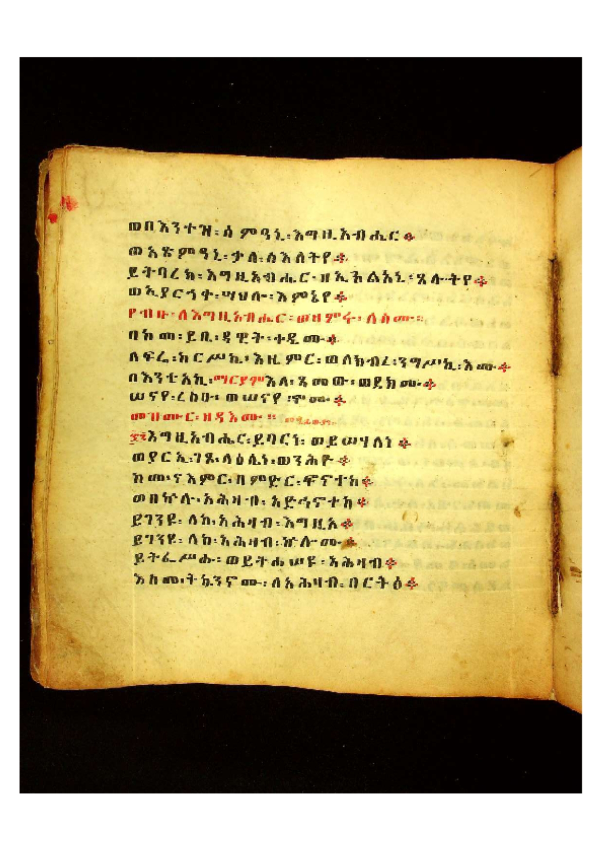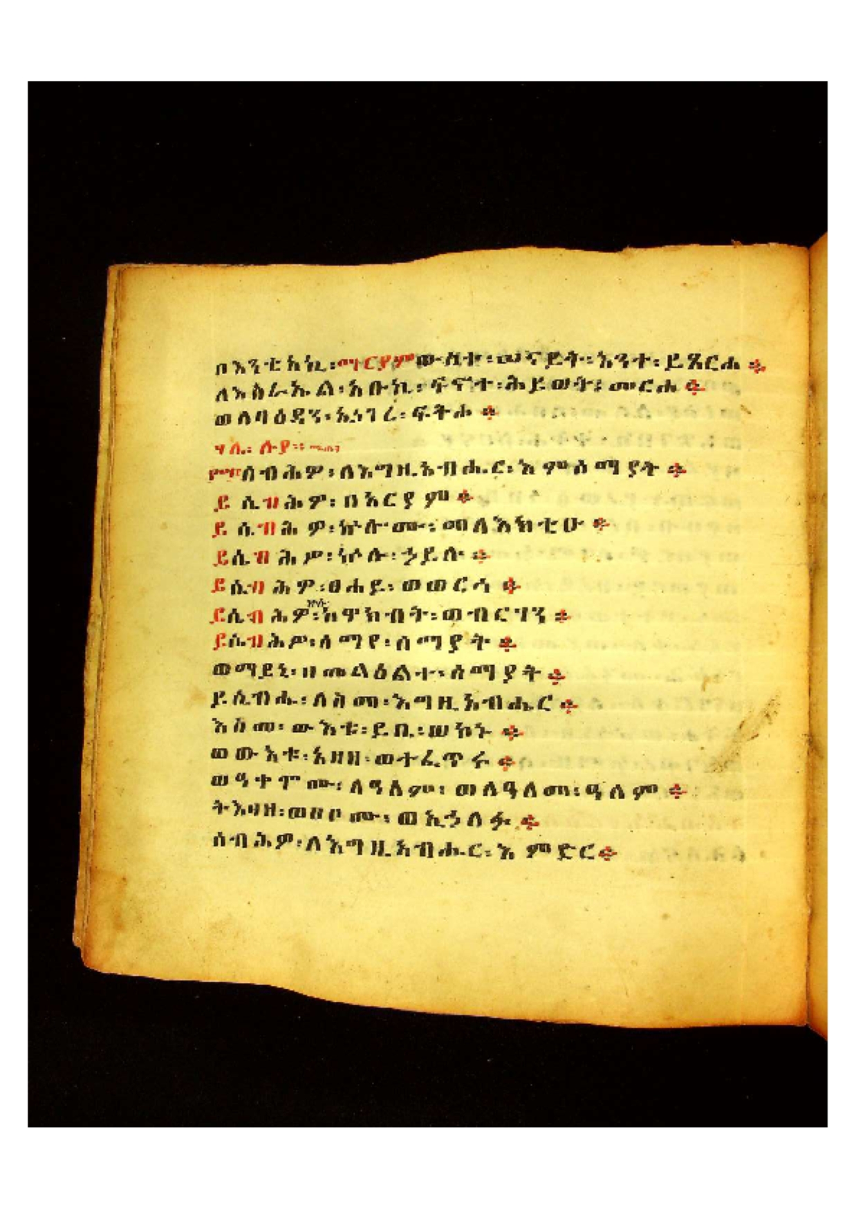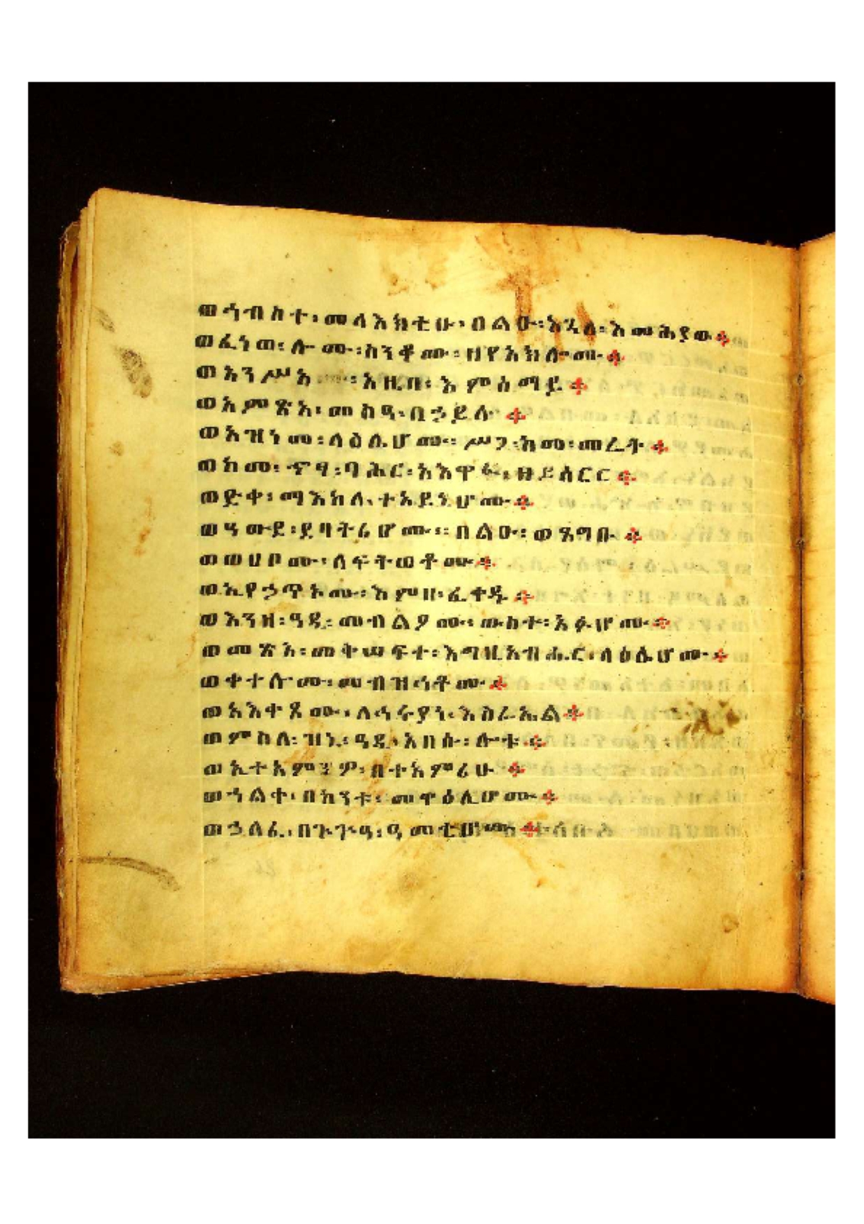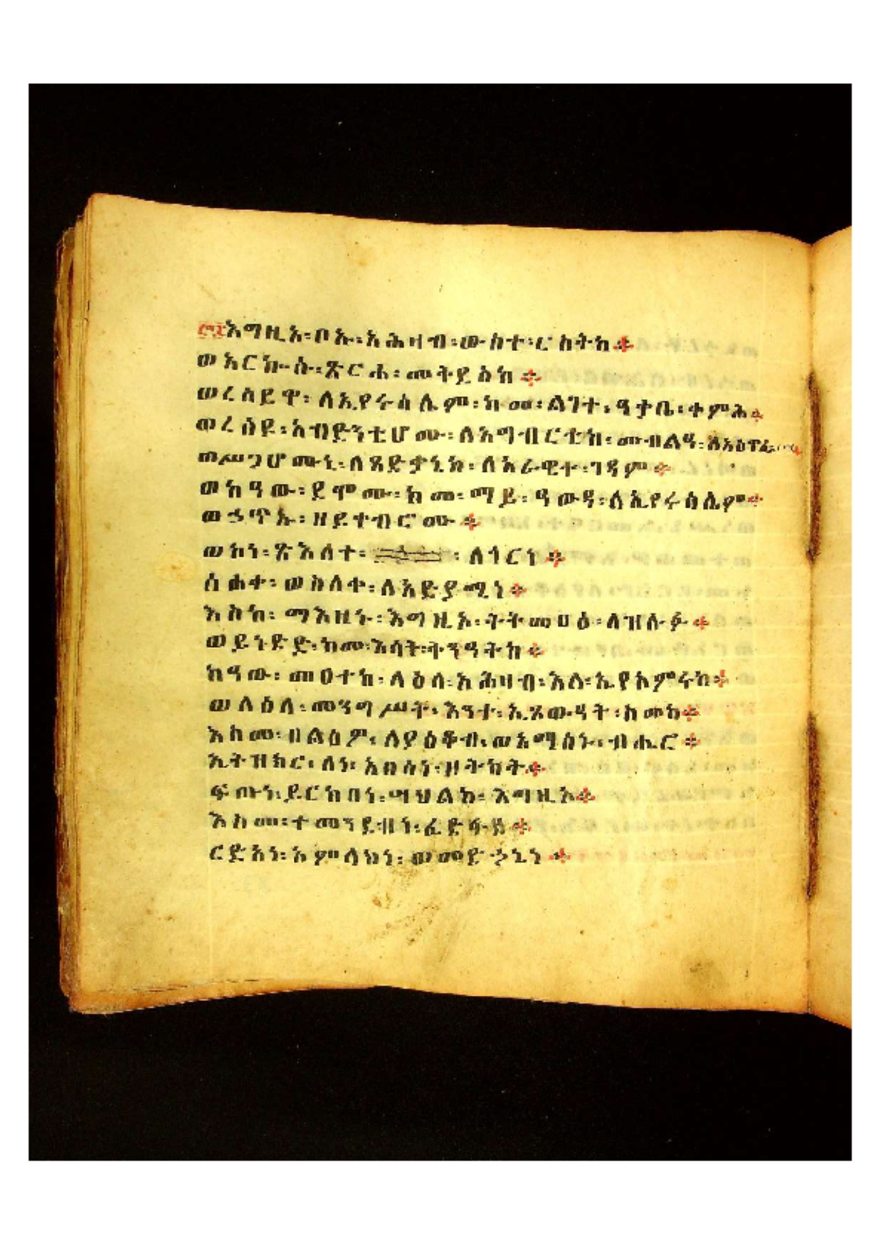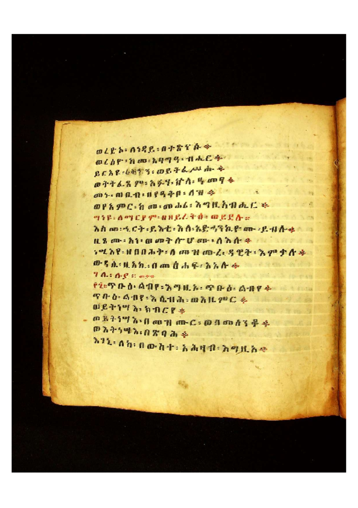 1. F. 2r: donation note written vertically in the outer margin, in black ink: “alla famiglia Bruschettini, Pussy […] Battaglia dell’Amba Aradam il 16 febbraio 1936 XIV”. The note, written in Italian and partly illegible, indicates the Bruschettini family as the receiver of the book and mentions the Battle of Amba Aradam, which took place on 16 February 1936. 2. F. 5r: note written in Italian in the outer upper margin, in red pencil: “Amba Aradam 16/2/XIV ore 17.30 P. Paloboni (?)”. This note also mentions the Battle of Amba Aradam, together with an individual whose name is partially unclear (P. Paloboni?). 3. F. 173v: supplication note written in small script in a mediocre hand, at the end of the “Psalms of David”: ዕቀበኒ፡ እምዓይነ፡ ደዌ፡ ወሞት፡ ለገብርከ፡ ደቅስዮስ፡, “protect me, your servant Däqsəyos, from the eye of infirmity and death”. The note mentions a certain Däqsəyos, indicated as “your servant” (possibly a later owner of the codex). 4. F. 173v: incipit of the Gəʿəz and Amharic prayer, perhaps a writing exercise. The note is written in an inaccurate calligraphy on the outer margin of the folio, next to the prayer. The entire text is የህፂ፡ ኖኅን፡ ከማየ[፡] አይኅ። እስራኤልን፡ ከፈርዖን፡ ዳዊትን፡ ከሳኦል፡ ከኢሎፍሊ። ኤ. 5. F. 190v: donation note, written in black ink in a mediocre hand. Text: ዝመጽሐፍ፡ ዘደብተራ፡ ኪሮስ፡ ዘወሀቦ፡ ለታቦተ፡ ሚካኤል፡ ኢትርስዑኒ፡ በአቡነ፡ ዘበሰማያት፡ ዘአቡየ፡ ገብረ፡ ማርያም፡ ወለእምየ፡ ወለተ፡ ሩፋኤል፡, “This book belongs to däbtära Kiros, who donated it to the tabot of [the church of St] Michael. Do not forget me for our Father who is in heaven. [It also belongs] to my father Gäbrä Maryam and my mother Wälättä Rufaʾel”. 6. F. 199v: writings executed in an inaccurate hand, perhaps the same of note 4. The note includes pen trials (ፈቲነ፡ ብርዕ፡ ዘፈረና፡ etc.), reproduces the explicit of the “Song of the songs” (ስብሐታተኪ፡ ማርያም፡ ከመ፡ እንተ፡ ሕልቀት፡ etc.) and the incipit of the “Praise of Mary” (ውዳሴ፡ ዘሰኑይ፡ ፈቀደ፡ እግዚእ፡ etc., partly rubricated). The writings also mention Däqsəyos, indicated as “your servant” (possibly a later owner of the codex) 7. F. 220ra–va: Genealogic note written on two columns. The note illustrates the family tree of King Yoḥannǝs I, who reigned from 1667 to 1682. The text is acephalous. Incipit: [ወለ]ደ፡ እምሐና፡ ብእሲቱ፡ አሦተ፡ ቅዱሳንሃ፡ ወአሦተ፡ ቅዱሳንኒ፡ እምነ፡ ጳውሊ፡ ብእሲሃ፡ ወለደቶሙ፡ ለአቤተኁን፡ ማእምሮ፡ ወለዘሥላሴ፡ ወአቤተኁን፡ ማእምሮኒ፡ ወለደ፡ አቃርዮስ፡ ወአቃርዮስኒ፡ ወለደ፡ እመቤት፡ እኅተ፡ ክርስቶስሃ፡. The text is published and translated in Proverbio D.V., 2000, ‘Inventario sommario dei manoscritti arabi, ebraici, etiopici – con notizia dei turchi – conservati presso la Biblioteca della Badia di Grottaferrata’. Atti della Accademia nazionale dei Lincei, Memorie, Classe di scienze morali, storiche e filologiche, serie IX, 12 (2000), 468–570 (here pp. 496–97, Appendice III). 8. F. 220va–b: Protective prayer against snakes, written on two columns. Incipit: በስመ፡ አብ፡ … ጸሎት፡ በእንተ፡ ዓርዌ፡ ምድር። ሶበ፡ በጽሐ፡ መልእክት፡ ሐሰውከ፡ በል፡ ፫ጊዜ፡ አኂዘከ፡ ዘፈረ፡ ልብሰ፡ ለእመ፡ ሀሎ፡ ርሑቀ፡ አስትዮ፡. The prayer is probably written in the same hand of note 7. 9. F. 220vb: Unidentified magic prayer containing asmat-names. Incipit: በስመ፡ አብ፡ … ኦላዘላህም፡ አህጉረ፡ ቀዳ[.]፡ ፍሖም፡ ሊስ፡ አፍሊስ፡ ምልክዮስ፡ ዘ[..]ማኤል፡ በዝንቱ፡ አስማቲከ፡ [.]ጽ[..] ኃይለ፡ በረድ፡ ወነፋስ፡ ከማሁ፡. |