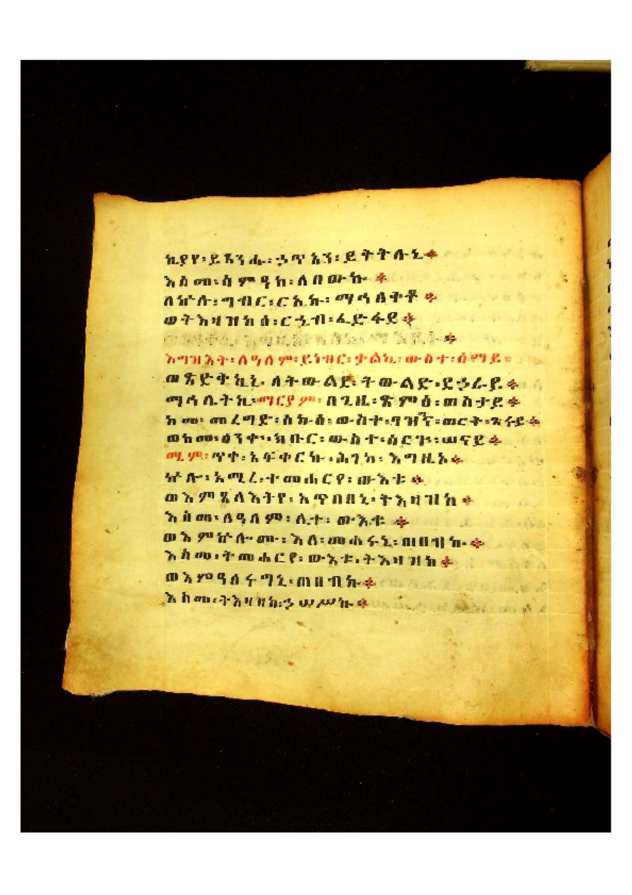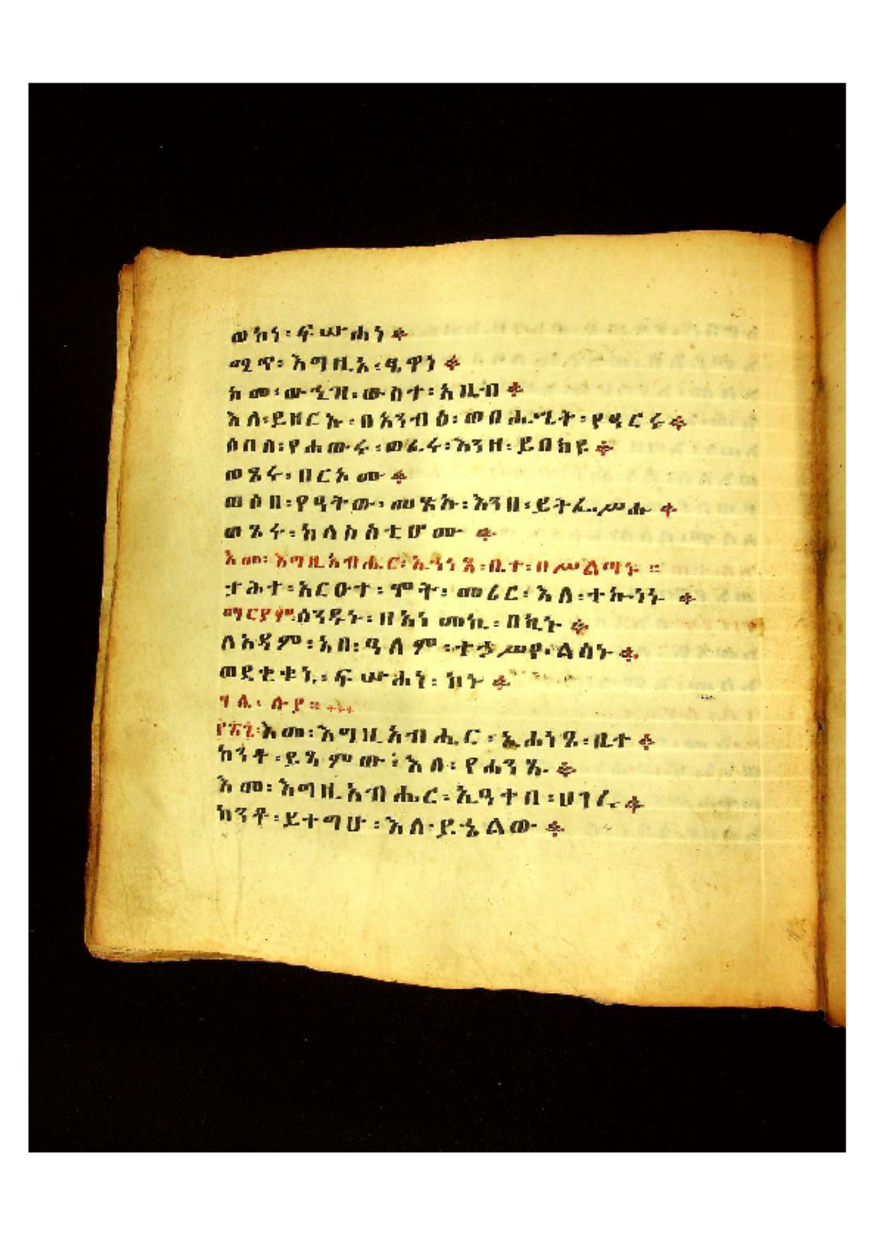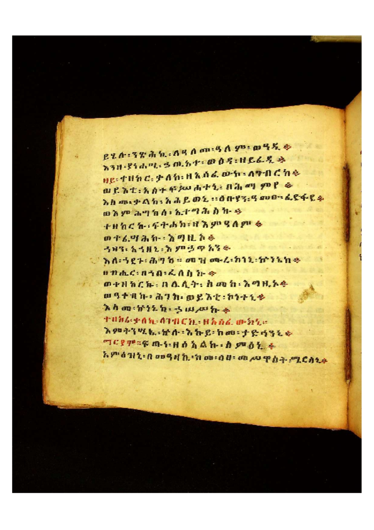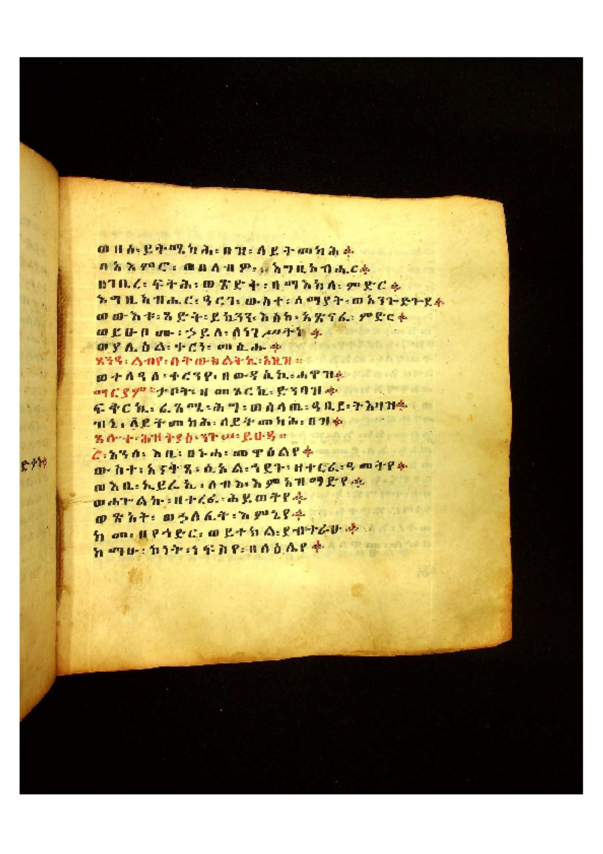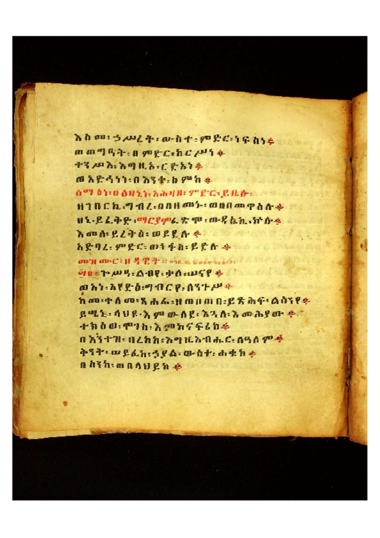 1. F. 2r: donation note written vertically in the outer margin, in black ink: “alla famiglia Bruschettini, Pussy […] Battaglia dell’Amba Aradam il 16 febbraio 1936 XIV”. The note, written in Italian and partly illegible, indicates the Bruschettini family as the receiver of the book and mentions the Battle of Amba Aradam, which took place on 16 February 1936. 2. F. 5r: note written in Italian in the outer upper margin, in red pencil: “Amba Aradam 16/2/XIV ore 17.30 P. Paloboni (?)”. This note also mentions the Battle of Amba Aradam, together with an individual whose name is partially unclear (P. Paloboni?). 3. F. 173v: supplication note written in small script in a mediocre hand, at the end of the “Psalms of David”: ዕቀበኒ፡ እምዓይነ፡ ደዌ፡ ወሞት፡ ለገብርከ፡ ደቅስዮስ፡, “protect me, your servant Däqsəyos, from the eye of infirmity and death”. The note mentions a certain Däqsəyos, indicated as “your servant” (possibly a later owner of the codex). 4. F. 173v: incipit of the Gəʿəz and Amharic prayer, perhaps a writing exercise. The note is written in an inaccurate calligraphy on the outer margin of the folio, next to the prayer. The entire text is የህፂ፡ ኖኅን፡ ከማየ[፡] አይኅ። እስራኤልን፡ ከፈርዖን፡ ዳዊትን፡ ከሳኦል፡ ከኢሎፍሊ። ኤ. 5. F. 190v: donation note, written in black ink in a mediocre hand. Text: ዝመጽሐፍ፡ ዘደብተራ፡ ኪሮስ፡ ዘወሀቦ፡ ለታቦተ፡ ሚካኤል፡ ኢትርስዑኒ፡ በአቡነ፡ ዘበሰማያት፡ ዘአቡየ፡ ገብረ፡ ማርያም፡ ወለእምየ፡ ወለተ፡ ሩፋኤል፡, “This book belongs to däbtära Kiros, who donated it to the tabot of [the church of St] Michael. Do not forget me for our Father who is in heaven. [It also belongs] to my father Gäbrä Maryam and my mother Wälättä Rufaʾel”. 6. F. 199v: writings executed in an inaccurate hand, perhaps the same of note 4. The note includes pen trials (ፈቲነ፡ ብርዕ፡ ዘፈረና፡ etc.), reproduces the explicit of the “Song of the songs” (ስብሐታተኪ፡ ማርያም፡ ከመ፡ እንተ፡ ሕልቀት፡ etc.) and the incipit of the “Praise of Mary” (ውዳሴ፡ ዘሰኑይ፡ ፈቀደ፡ እግዚእ፡ etc., partly rubricated). The writings also mention Däqsəyos, indicated as “your servant” (possibly a later owner of the codex) 7. F. 220ra–va: Genealogic note written on two columns. The note illustrates the family tree of King Yoḥannǝs I, who reigned from 1667 to 1682. The text is acephalous. Incipit: [ወለ]ደ፡ እምሐና፡ ብእሲቱ፡ አሦተ፡ ቅዱሳንሃ፡ ወአሦተ፡ ቅዱሳንኒ፡ እምነ፡ ጳውሊ፡ ብእሲሃ፡ ወለደቶሙ፡ ለአቤተኁን፡ ማእምሮ፡ ወለዘሥላሴ፡ ወአቤተኁን፡ ማእምሮኒ፡ ወለደ፡ አቃርዮስ፡ ወአቃርዮስኒ፡ ወለደ፡ እመቤት፡ እኅተ፡ ክርስቶስሃ፡. The text is published and translated in Proverbio D.V., 2000, ‘Inventario sommario dei manoscritti arabi, ebraici, etiopici – con notizia dei turchi – conservati presso la Biblioteca della Badia di Grottaferrata’. Atti della Accademia nazionale dei Lincei, Memorie, Classe di scienze morali, storiche e filologiche, serie IX, 12 (2000), 468–570 (here pp. 496–97, Appendice III). 8. F. 220va–b: Protective prayer against snakes, written on two columns. Incipit: በስመ፡ አብ፡ … ጸሎት፡ በእንተ፡ ዓርዌ፡ ምድር። ሶበ፡ በጽሐ፡ መልእክት፡ ሐሰውከ፡ በል፡ ፫ጊዜ፡ አኂዘከ፡ ዘፈረ፡ ልብሰ፡ ለእመ፡ ሀሎ፡ ርሑቀ፡ አስትዮ፡. The prayer is probably written in the same hand of note 7. 9. F. 220vb: Unidentified magic prayer containing asmat-names. Incipit: በስመ፡ አብ፡ … ኦላዘላህም፡ አህጉረ፡ ቀዳ[.]፡ ፍሖም፡ ሊስ፡ አፍሊስ፡ ምልክዮስ፡ ዘ[..]ማኤል፡ በዝንቱ፡ አስማቲከ፡ [.]ጽ[..] ኃይለ፡ በረድ፡ ወነፋስ፡ ከማሁ፡. |