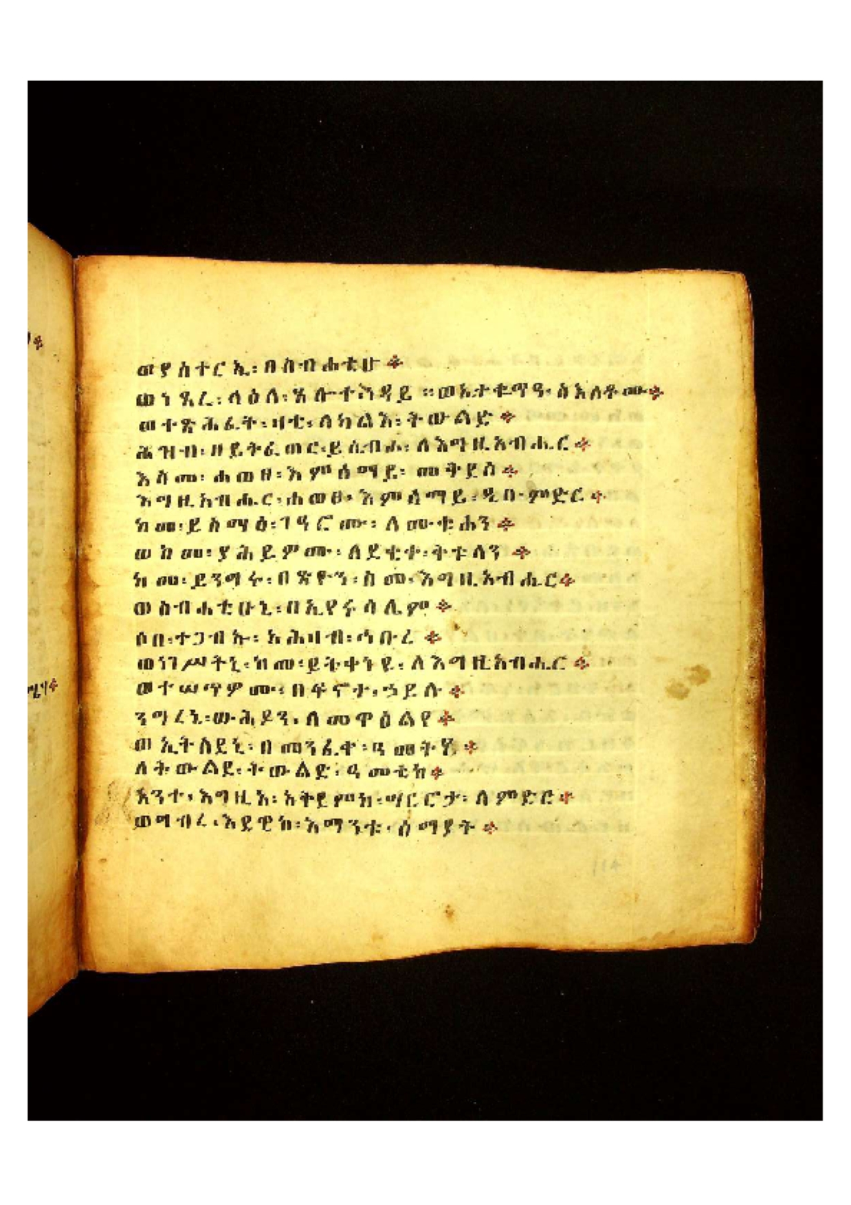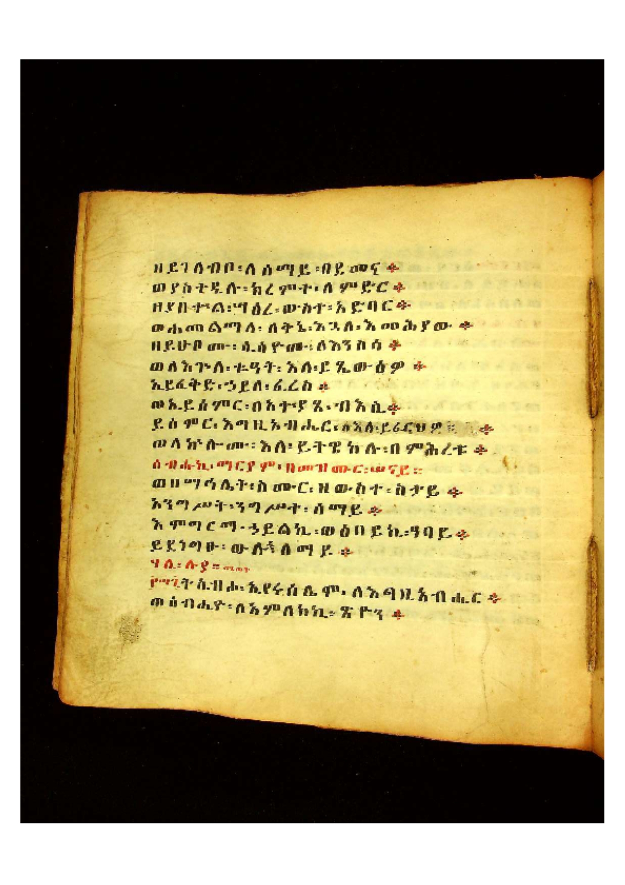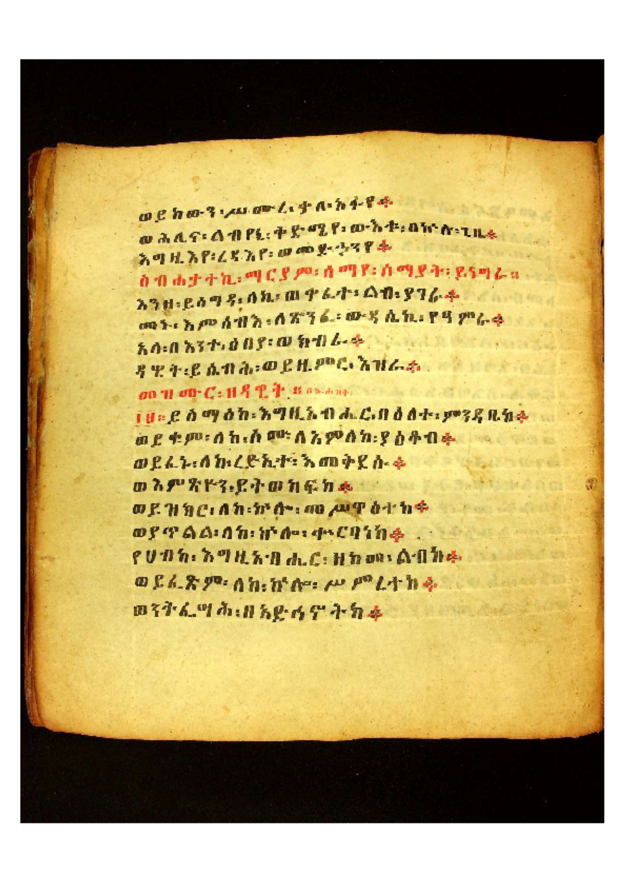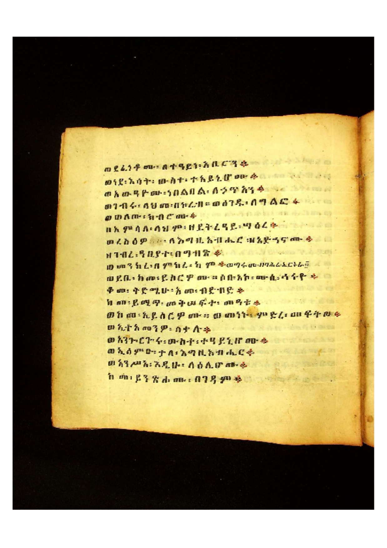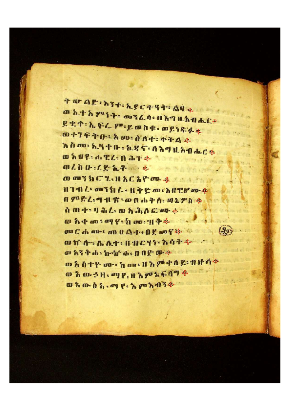 1. F. 2r: donation note written vertically in the outer margin, in black ink: “alla famiglia Bruschettini, Pussy […] Battaglia dell’Amba Aradam il 16 febbraio 1936 XIV”. The note, written in Italian and partly illegible, indicates the Bruschettini family as the receiver of the book and mentions the Battle of Amba Aradam, which took place on 16 February 1936. 2. F. 5r: note written in Italian in the outer upper margin, in red pencil: “Amba Aradam 16/2/XIV ore 17.30 P. Paloboni (?)”. This note also mentions the Battle of Amba Aradam, together with an individual whose name is partially unclear (P. Paloboni?). 3. F. 173v: supplication note written in small script in a mediocre hand, at the end of the “Psalms of David”: ዕቀበኒ፡ እምዓይነ፡ ደዌ፡ ወሞት፡ ለገብርከ፡ ደቅስዮስ፡, “protect me, your servant Däqsəyos, from the eye of infirmity and death”. The note mentions a certain Däqsəyos, indicated as “your servant” (possibly a later owner of the codex). 4. F. 173v: incipit of the Gəʿəz and Amharic prayer, perhaps a writing exercise. The note is written in an inaccurate calligraphy on the outer margin of the folio, next to the prayer. The entire text is የህፂ፡ ኖኅን፡ ከማየ[፡] አይኅ። እስራኤልን፡ ከፈርዖን፡ ዳዊትን፡ ከሳኦል፡ ከኢሎፍሊ። ኤ. 5. F. 190v: donation note, written in black ink in a mediocre hand. Text: ዝመጽሐፍ፡ ዘደብተራ፡ ኪሮስ፡ ዘወሀቦ፡ ለታቦተ፡ ሚካኤል፡ ኢትርስዑኒ፡ በአቡነ፡ ዘበሰማያት፡ ዘአቡየ፡ ገብረ፡ ማርያም፡ ወለእምየ፡ ወለተ፡ ሩፋኤል፡, “This book belongs to däbtära Kiros, who donated it to the tabot of [the church of St] Michael. Do not forget me for our Father who is in heaven. [It also belongs] to my father Gäbrä Maryam and my mother Wälättä Rufaʾel”. 6. F. 199v: writings executed in an inaccurate hand, perhaps the same of note 4. The note includes pen trials (ፈቲነ፡ ብርዕ፡ ዘፈረና፡ etc.), reproduces the explicit of the “Song of the songs” (ስብሐታተኪ፡ ማርያም፡ ከመ፡ እንተ፡ ሕልቀት፡ etc.) and the incipit of the “Praise of Mary” (ውዳሴ፡ ዘሰኑይ፡ ፈቀደ፡ እግዚእ፡ etc., partly rubricated). The writings also mention Däqsəyos, indicated as “your servant” (possibly a later owner of the codex) 7. F. 220ra–va: Genealogic note written on two columns. The note illustrates the family tree of King Yoḥannǝs I, who reigned from 1667 to 1682. The text is acephalous. Incipit: [ወለ]ደ፡ እምሐና፡ ብእሲቱ፡ አሦተ፡ ቅዱሳንሃ፡ ወአሦተ፡ ቅዱሳንኒ፡ እምነ፡ ጳውሊ፡ ብእሲሃ፡ ወለደቶሙ፡ ለአቤተኁን፡ ማእምሮ፡ ወለዘሥላሴ፡ ወአቤተኁን፡ ማእምሮኒ፡ ወለደ፡ አቃርዮስ፡ ወአቃርዮስኒ፡ ወለደ፡ እመቤት፡ እኅተ፡ ክርስቶስሃ፡. The text is published and translated in Proverbio D.V., 2000, ‘Inventario sommario dei manoscritti arabi, ebraici, etiopici – con notizia dei turchi – conservati presso la Biblioteca della Badia di Grottaferrata’. Atti della Accademia nazionale dei Lincei, Memorie, Classe di scienze morali, storiche e filologiche, serie IX, 12 (2000), 468–570 (here pp. 496–97, Appendice III). 8. F. 220va–b: Protective prayer against snakes, written on two columns. Incipit: በስመ፡ አብ፡ … ጸሎት፡ በእንተ፡ ዓርዌ፡ ምድር። ሶበ፡ በጽሐ፡ መልእክት፡ ሐሰውከ፡ በል፡ ፫ጊዜ፡ አኂዘከ፡ ዘፈረ፡ ልብሰ፡ ለእመ፡ ሀሎ፡ ርሑቀ፡ አስትዮ፡. The prayer is probably written in the same hand of note 7. 9. F. 220vb: Unidentified magic prayer containing asmat-names. Incipit: በስመ፡ አብ፡ … ኦላዘላህም፡ አህጉረ፡ ቀዳ[.]፡ ፍሖም፡ ሊስ፡ አፍሊስ፡ ምልክዮስ፡ ዘ[..]ማኤል፡ በዝንቱ፡ አስማቲከ፡ [.]ጽ[..] ኃይለ፡ በረድ፡ ወነፋስ፡ ከማሁ፡. |
