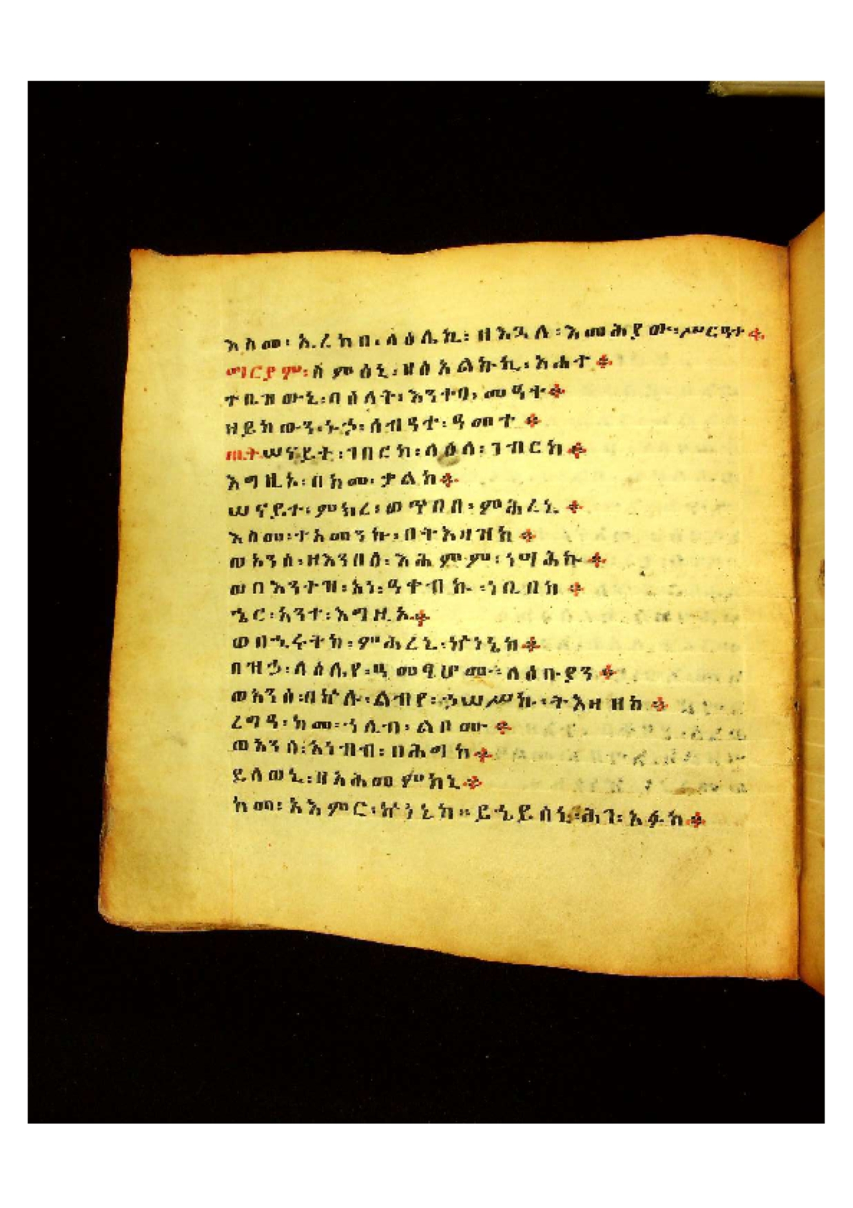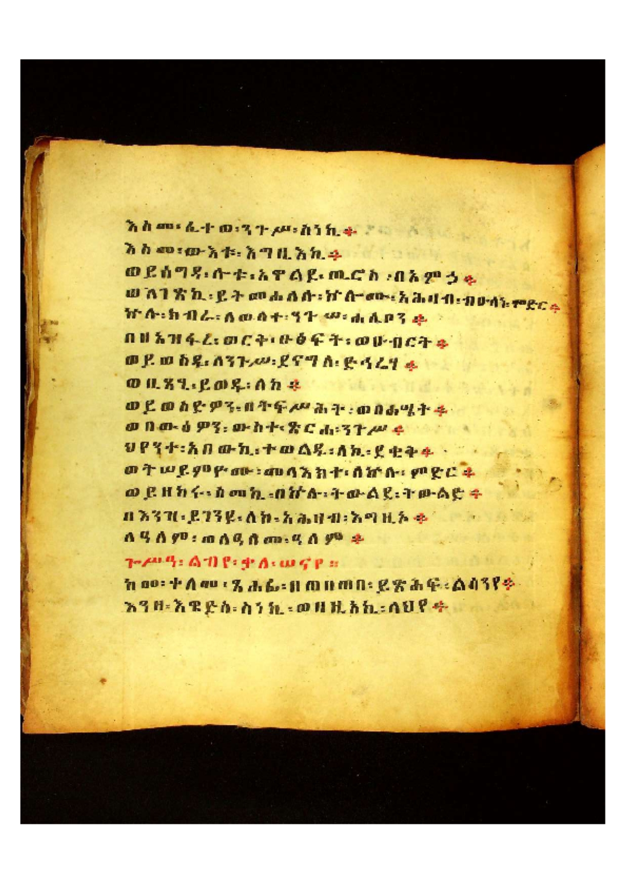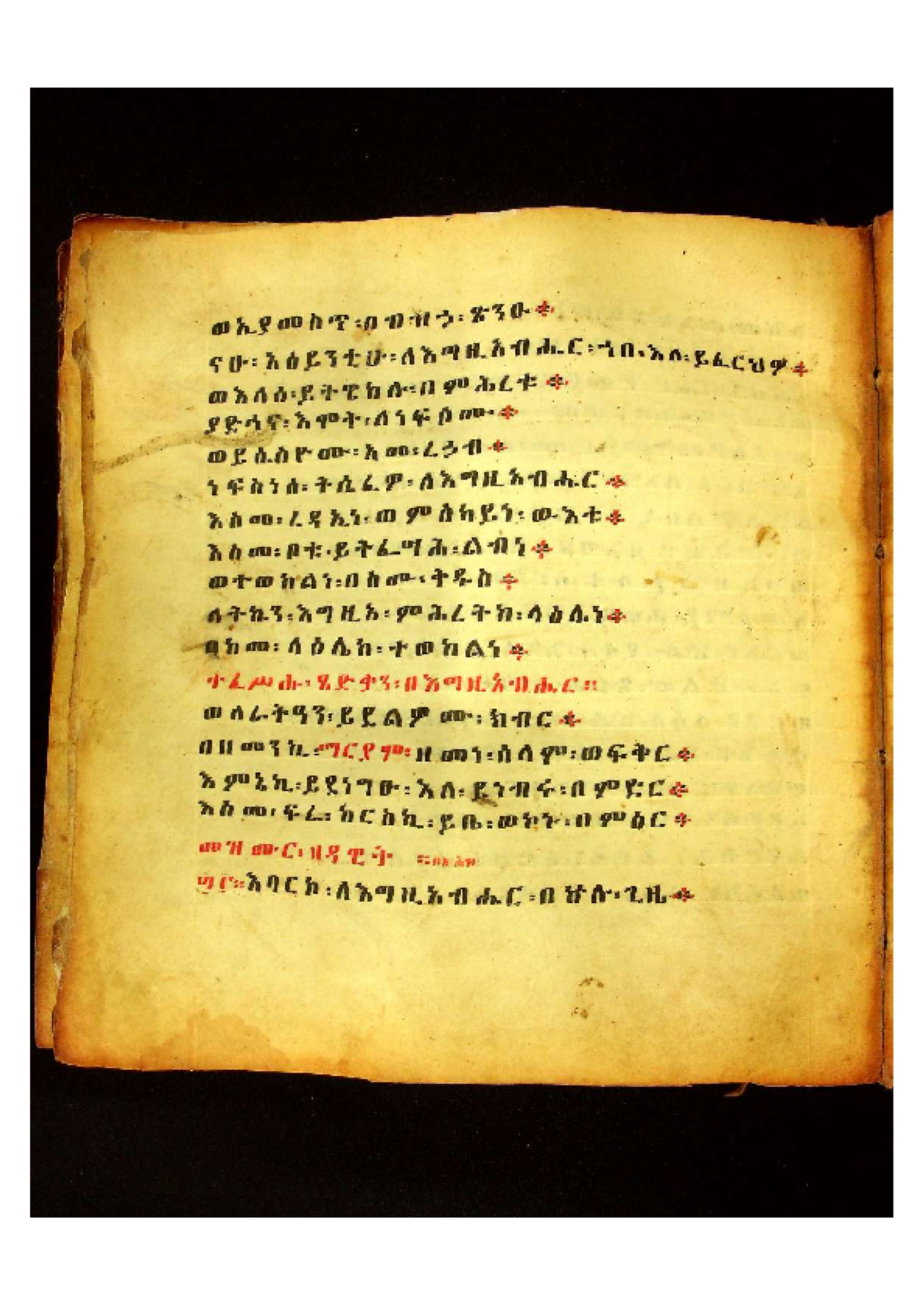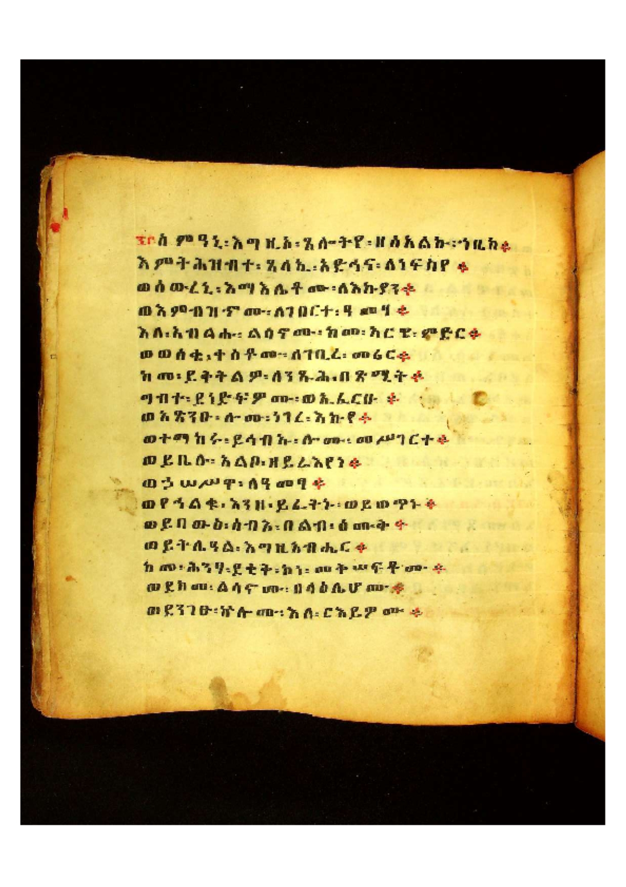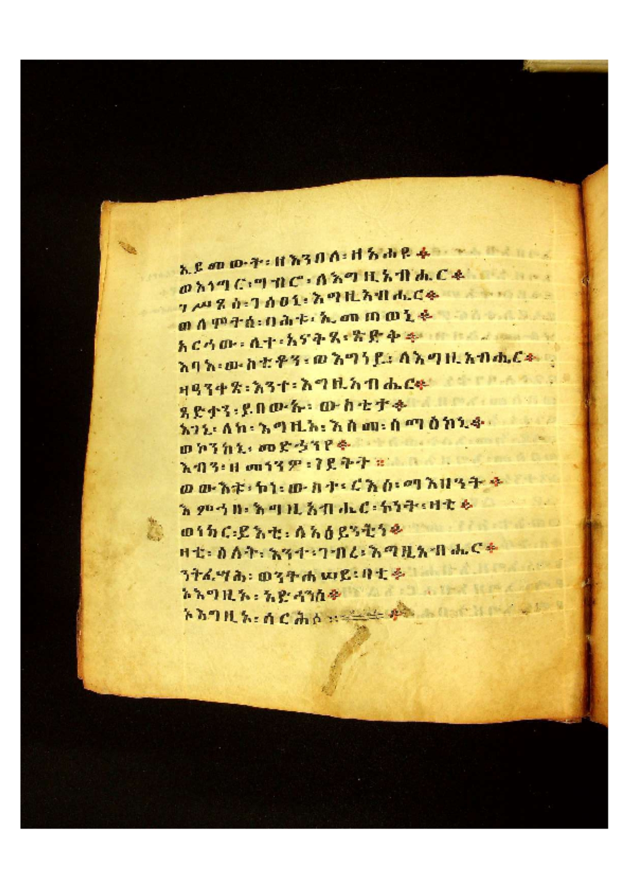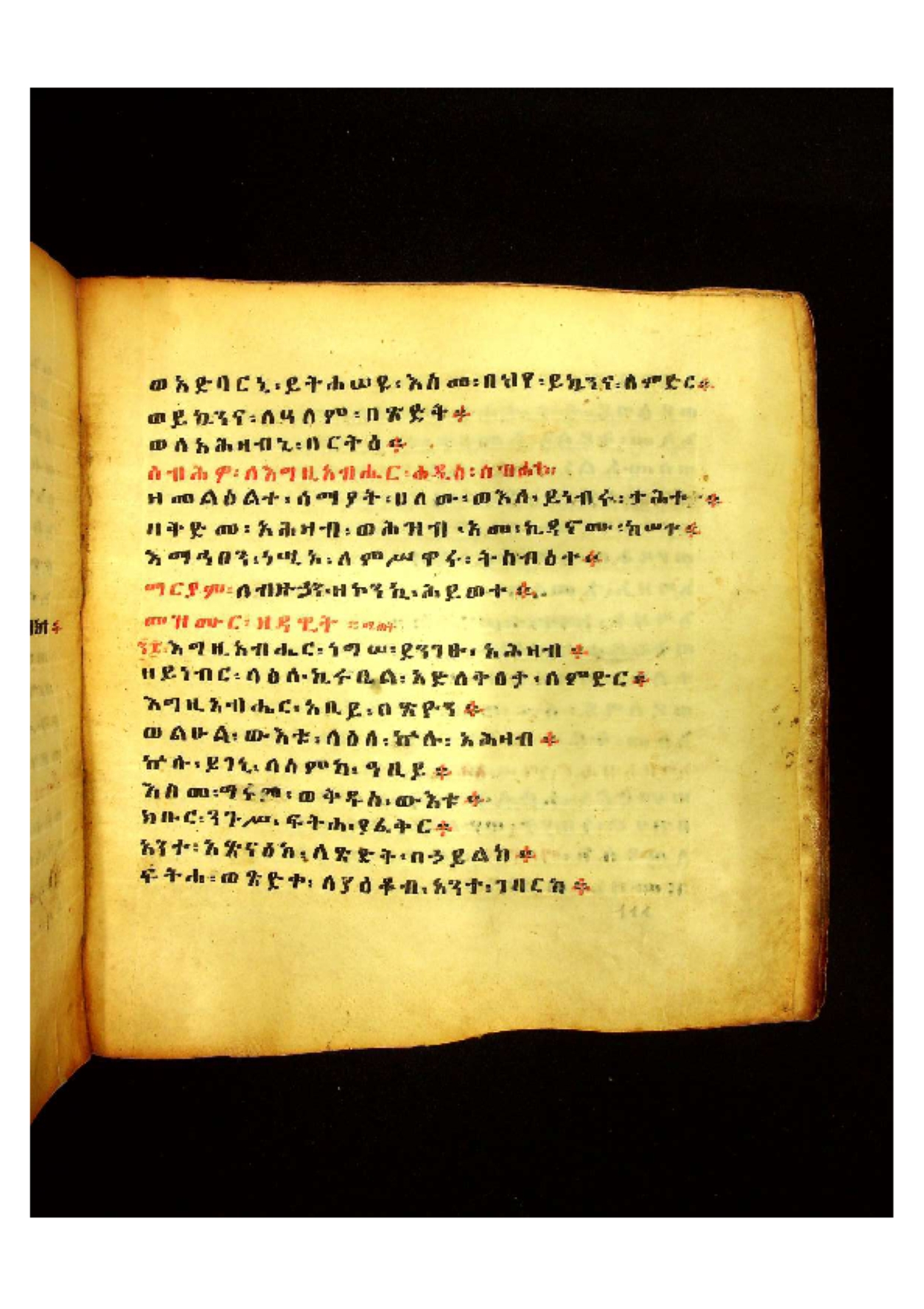 1. F. 2r: donation note written vertically in the outer margin, in black ink: “alla famiglia Bruschettini, Pussy […] Battaglia dell’Amba Aradam il 16 febbraio 1936 XIV”. The note, written in Italian and partly illegible, indicates the Bruschettini family as the receiver of the book and mentions the Battle of Amba Aradam, which took place on 16 February 1936. 2. F. 5r: note written in Italian in the outer upper margin, in red pencil: “Amba Aradam 16/2/XIV ore 17.30 P. Paloboni (?)”. This note also mentions the Battle of Amba Aradam, together with an individual whose name is partially unclear (P. Paloboni?). 3. F. 173v: supplication note written in small script in a mediocre hand, at the end of the “Psalms of David”: ዕቀበኒ፡ እምዓይነ፡ ደዌ፡ ወሞት፡ ለገብርከ፡ ደቅስዮስ፡, “protect me, your servant Däqsəyos, from the eye of infirmity and death”. The note mentions a certain Däqsəyos, indicated as “your servant” (possibly a later owner of the codex). 4. F. 173v: incipit of the Gəʿəz and Amharic prayer, perhaps a writing exercise. The note is written in an inaccurate calligraphy on the outer margin of the folio, next to the prayer. The entire text is የህፂ፡ ኖኅን፡ ከማየ[፡] አይኅ። እስራኤልን፡ ከፈርዖን፡ ዳዊትን፡ ከሳኦል፡ ከኢሎፍሊ። ኤ. 5. F. 190v: donation note, written in black ink in a mediocre hand. Text: ዝመጽሐፍ፡ ዘደብተራ፡ ኪሮስ፡ ዘወሀቦ፡ ለታቦተ፡ ሚካኤል፡ ኢትርስዑኒ፡ በአቡነ፡ ዘበሰማያት፡ ዘአቡየ፡ ገብረ፡ ማርያም፡ ወለእምየ፡ ወለተ፡ ሩፋኤል፡, “This book belongs to däbtära Kiros, who donated it to the tabot of [the church of St] Michael. Do not forget me for our Father who is in heaven. [It also belongs] to my father Gäbrä Maryam and my mother Wälättä Rufaʾel”. 6. F. 199v: writings executed in an inaccurate hand, perhaps the same of note 4. The note includes pen trials (ፈቲነ፡ ብርዕ፡ ዘፈረና፡ etc.), reproduces the explicit of the “Song of the songs” (ስብሐታተኪ፡ ማርያም፡ ከመ፡ እንተ፡ ሕልቀት፡ etc.) and the incipit of the “Praise of Mary” (ውዳሴ፡ ዘሰኑይ፡ ፈቀደ፡ እግዚእ፡ etc., partly rubricated). The writings also mention Däqsəyos, indicated as “your servant” (possibly a later owner of the codex) 7. F. 220ra–va: Genealogic note written on two columns. The note illustrates the family tree of King Yoḥannǝs I, who reigned from 1667 to 1682. The text is acephalous. Incipit: [ወለ]ደ፡ እምሐና፡ ብእሲቱ፡ አሦተ፡ ቅዱሳንሃ፡ ወአሦተ፡ ቅዱሳንኒ፡ እምነ፡ ጳውሊ፡ ብእሲሃ፡ ወለደቶሙ፡ ለአቤተኁን፡ ማእምሮ፡ ወለዘሥላሴ፡ ወአቤተኁን፡ ማእምሮኒ፡ ወለደ፡ አቃርዮስ፡ ወአቃርዮስኒ፡ ወለደ፡ እመቤት፡ እኅተ፡ ክርስቶስሃ፡. The text is published and translated in Proverbio D.V., 2000, ‘Inventario sommario dei manoscritti arabi, ebraici, etiopici – con notizia dei turchi – conservati presso la Biblioteca della Badia di Grottaferrata’. Atti della Accademia nazionale dei Lincei, Memorie, Classe di scienze morali, storiche e filologiche, serie IX, 12 (2000), 468–570 (here pp. 496–97, Appendice III). 8. F. 220va–b: Protective prayer against snakes, written on two columns. Incipit: በስመ፡ አብ፡ … ጸሎት፡ በእንተ፡ ዓርዌ፡ ምድር። ሶበ፡ በጽሐ፡ መልእክት፡ ሐሰውከ፡ በል፡ ፫ጊዜ፡ አኂዘከ፡ ዘፈረ፡ ልብሰ፡ ለእመ፡ ሀሎ፡ ርሑቀ፡ አስትዮ፡. The prayer is probably written in the same hand of note 7. 9. F. 220vb: Unidentified magic prayer containing asmat-names. Incipit: በስመ፡ አብ፡ … ኦላዘላህም፡ አህጉረ፡ ቀዳ[.]፡ ፍሖም፡ ሊስ፡ አፍሊስ፡ ምልክዮስ፡ ዘ[..]ማኤል፡ በዝንቱ፡ አስማቲከ፡ [.]ጽ[..] ኃይለ፡ በረድ፡ ወነፋስ፡ ከማሁ፡. |