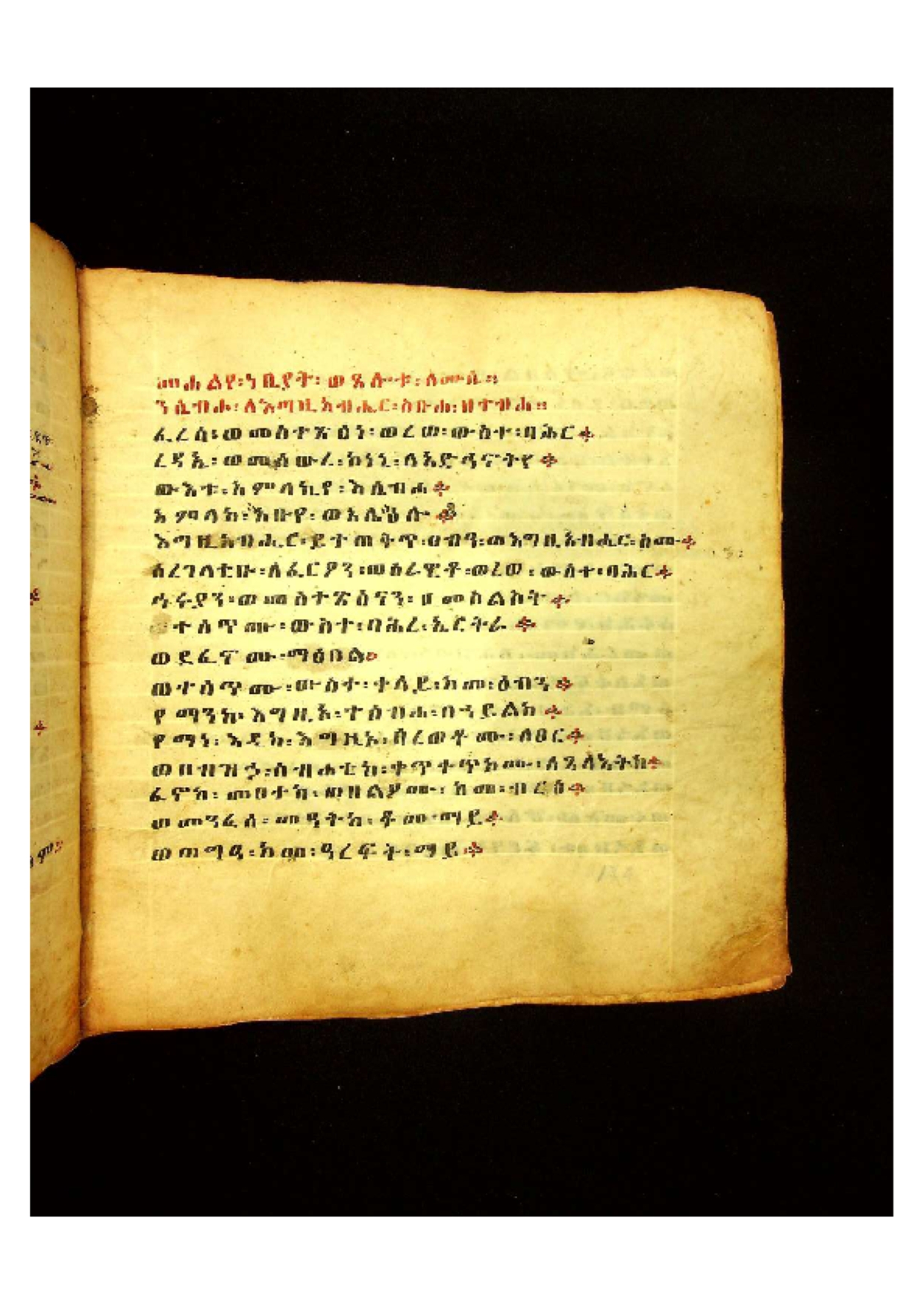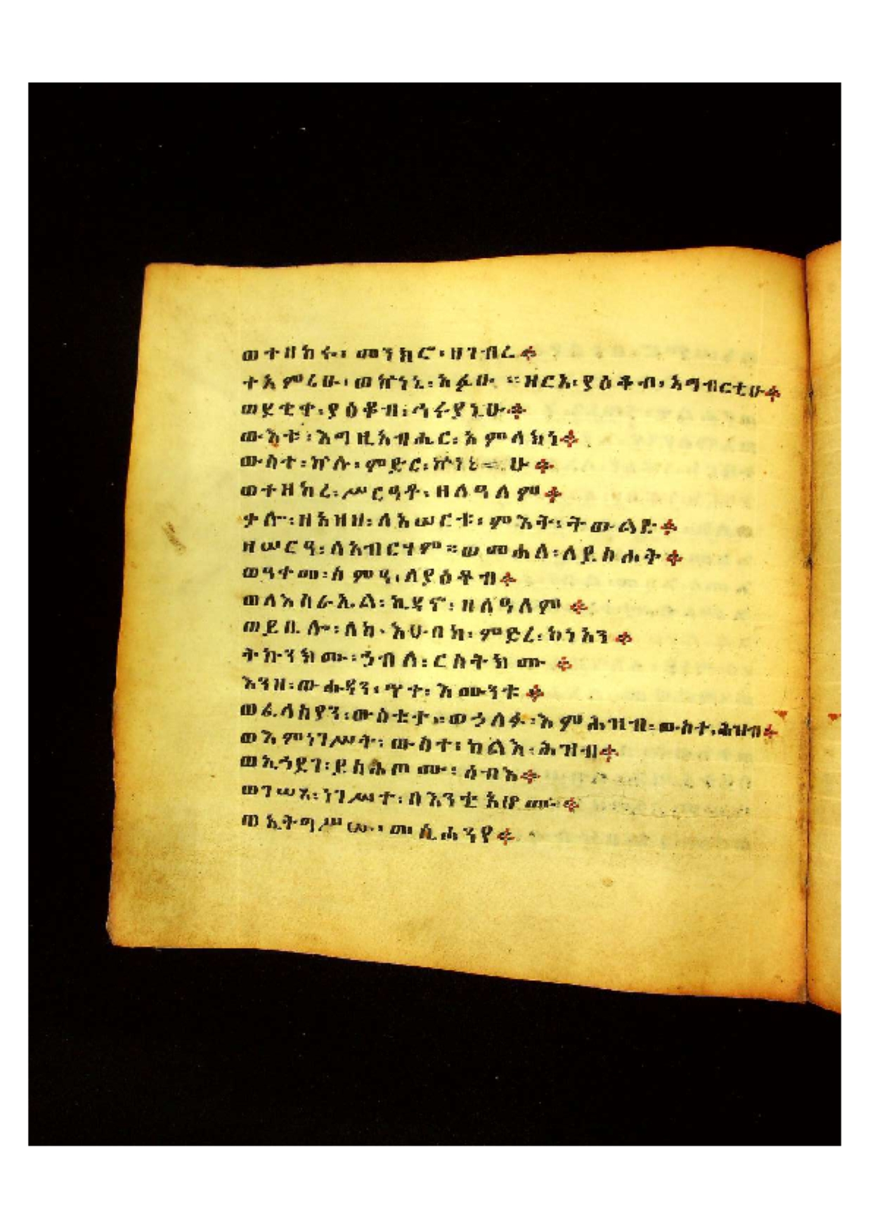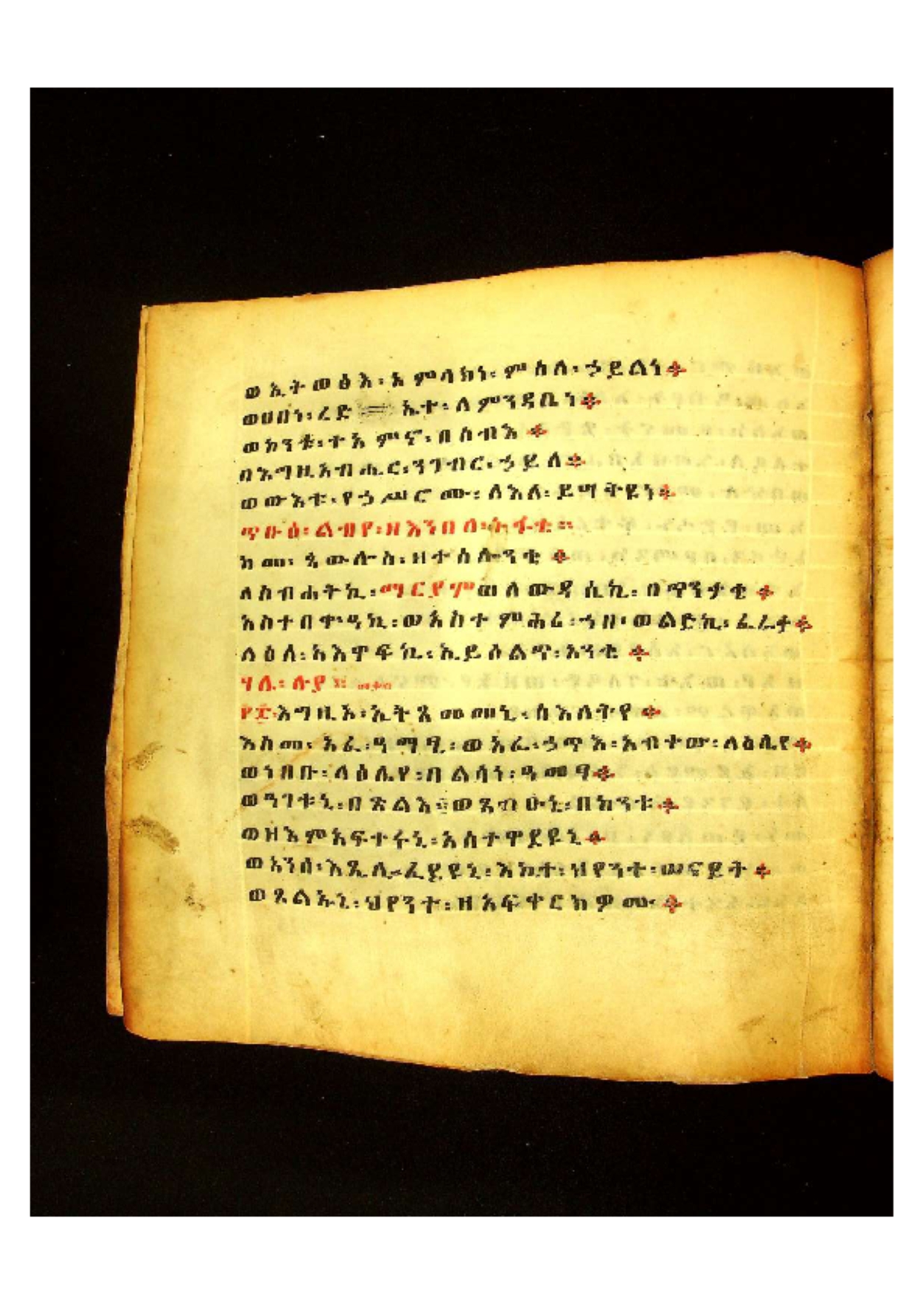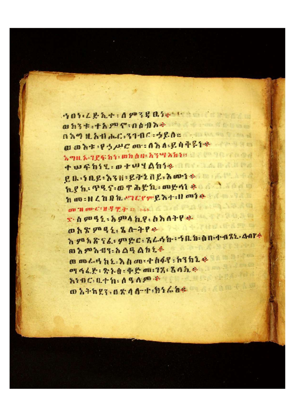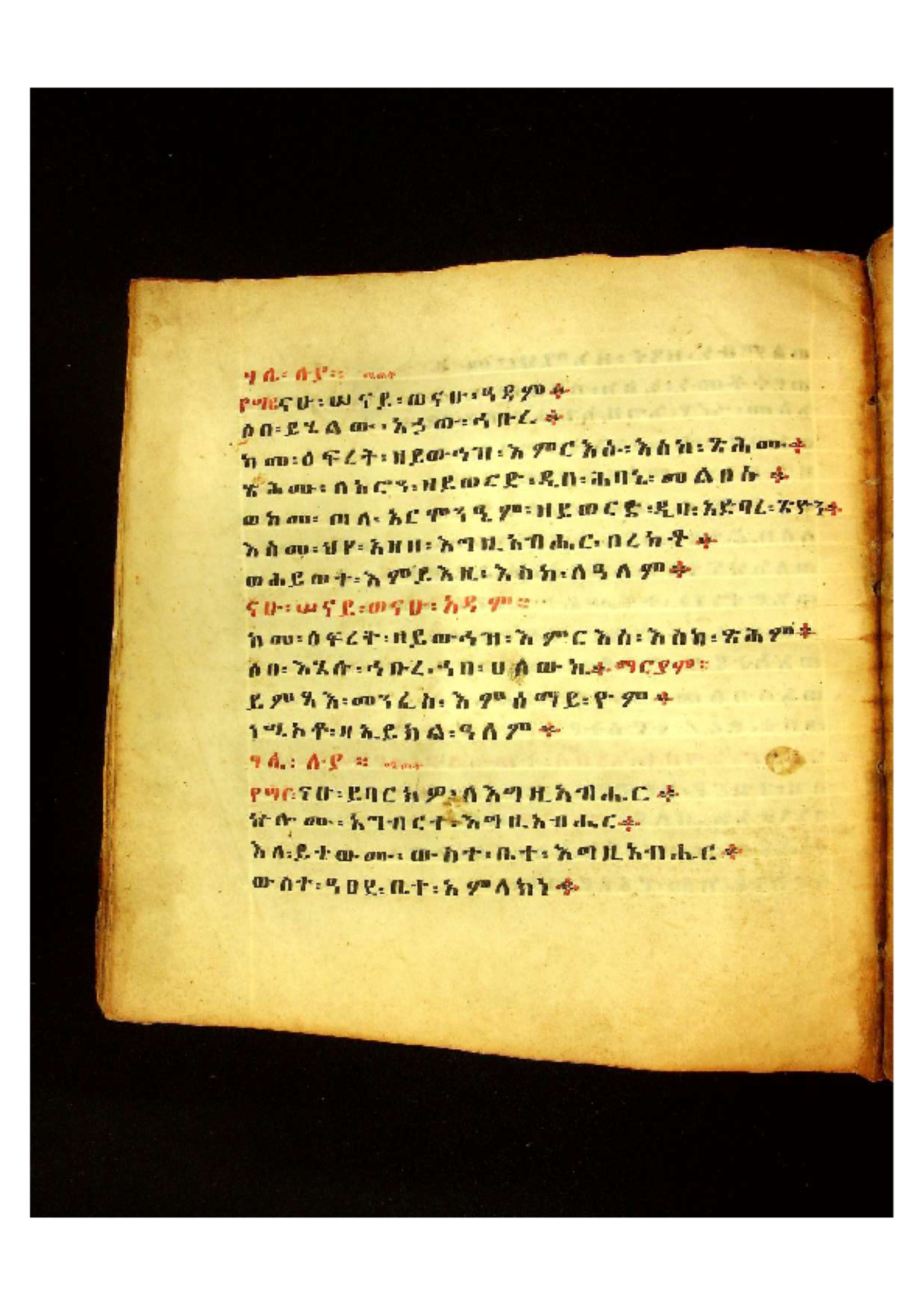 1. F. 2r: donation note written vertically in the outer margin, in black ink: “alla famiglia Bruschettini, Pussy […] Battaglia dell’Amba Aradam il 16 febbraio 1936 XIV”. The note, written in Italian and partly illegible, indicates the Bruschettini family as the receiver of the book and mentions the Battle of Amba Aradam, which took place on 16 February 1936. 2. F. 5r: note written in Italian in the outer upper margin, in red pencil: “Amba Aradam 16/2/XIV ore 17.30 P. Paloboni (?)”. This note also mentions the Battle of Amba Aradam, together with an individual whose name is partially unclear (P. Paloboni?). 3. F. 173v: supplication note written in small script in a mediocre hand, at the end of the “Psalms of David”: ዕቀበኒ፡ እምዓይነ፡ ደዌ፡ ወሞት፡ ለገብርከ፡ ደቅስዮስ፡, “protect me, your servant Däqsəyos, from the eye of infirmity and death”. The note mentions a certain Däqsəyos, indicated as “your servant” (possibly a later owner of the codex). 4. F. 173v: incipit of the Gəʿəz and Amharic prayer, perhaps a writing exercise. The note is written in an inaccurate calligraphy on the outer margin of the folio, next to the prayer. The entire text is የህፂ፡ ኖኅን፡ ከማየ[፡] አይኅ። እስራኤልን፡ ከፈርዖን፡ ዳዊትን፡ ከሳኦል፡ ከኢሎፍሊ። ኤ. 5. F. 190v: donation note, written in black ink in a mediocre hand. Text: ዝመጽሐፍ፡ ዘደብተራ፡ ኪሮስ፡ ዘወሀቦ፡ ለታቦተ፡ ሚካኤል፡ ኢትርስዑኒ፡ በአቡነ፡ ዘበሰማያት፡ ዘአቡየ፡ ገብረ፡ ማርያም፡ ወለእምየ፡ ወለተ፡ ሩፋኤል፡, “This book belongs to däbtära Kiros, who donated it to the tabot of [the church of St] Michael. Do not forget me for our Father who is in heaven. [It also belongs] to my father Gäbrä Maryam and my mother Wälättä Rufaʾel”. 6. F. 199v: writings executed in an inaccurate hand, perhaps the same of note 4. The note includes pen trials (ፈቲነ፡ ብርዕ፡ ዘፈረና፡ etc.), reproduces the explicit of the “Song of the songs” (ስብሐታተኪ፡ ማርያም፡ ከመ፡ እንተ፡ ሕልቀት፡ etc.) and the incipit of the “Praise of Mary” (ውዳሴ፡ ዘሰኑይ፡ ፈቀደ፡ እግዚእ፡ etc., partly rubricated). The writings also mention Däqsəyos, indicated as “your servant” (possibly a later owner of the codex) 7. F. 220ra–va: Genealogic note written on two columns. The note illustrates the family tree of King Yoḥannǝs I, who reigned from 1667 to 1682. The text is acephalous. Incipit: [ወለ]ደ፡ እምሐና፡ ብእሲቱ፡ አሦተ፡ ቅዱሳንሃ፡ ወአሦተ፡ ቅዱሳንኒ፡ እምነ፡ ጳውሊ፡ ብእሲሃ፡ ወለደቶሙ፡ ለአቤተኁን፡ ማእምሮ፡ ወለዘሥላሴ፡ ወአቤተኁን፡ ማእምሮኒ፡ ወለደ፡ አቃርዮስ፡ ወአቃርዮስኒ፡ ወለደ፡ እመቤት፡ እኅተ፡ ክርስቶስሃ፡. The text is published and translated in Proverbio D.V., 2000, ‘Inventario sommario dei manoscritti arabi, ebraici, etiopici – con notizia dei turchi – conservati presso la Biblioteca della Badia di Grottaferrata’. Atti della Accademia nazionale dei Lincei, Memorie, Classe di scienze morali, storiche e filologiche, serie IX, 12 (2000), 468–570 (here pp. 496–97, Appendice III). 8. F. 220va–b: Protective prayer against snakes, written on two columns. Incipit: በስመ፡ አብ፡ … ጸሎት፡ በእንተ፡ ዓርዌ፡ ምድር። ሶበ፡ በጽሐ፡ መልእክት፡ ሐሰውከ፡ በል፡ ፫ጊዜ፡ አኂዘከ፡ ዘፈረ፡ ልብሰ፡ ለእመ፡ ሀሎ፡ ርሑቀ፡ አስትዮ፡. The prayer is probably written in the same hand of note 7. 9. F. 220vb: Unidentified magic prayer containing asmat-names. Incipit: በስመ፡ አብ፡ … ኦላዘላህም፡ አህጉረ፡ ቀዳ[.]፡ ፍሖም፡ ሊስ፡ አፍሊስ፡ ምልክዮስ፡ ዘ[..]ማኤል፡ በዝንቱ፡ አስማቲከ፡ [.]ጽ[..] ኃይለ፡ በረድ፡ ወነፋስ፡ ከማሁ፡. |