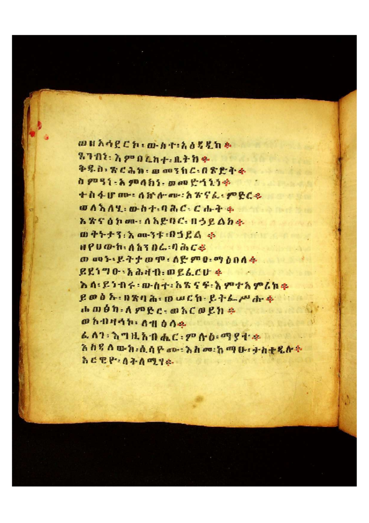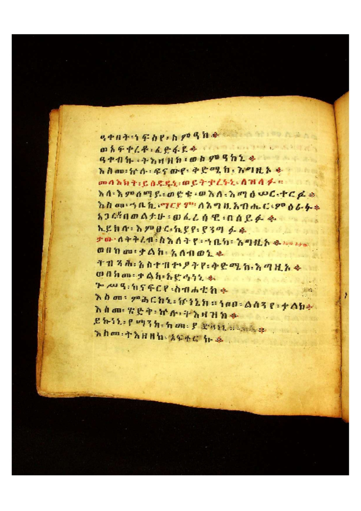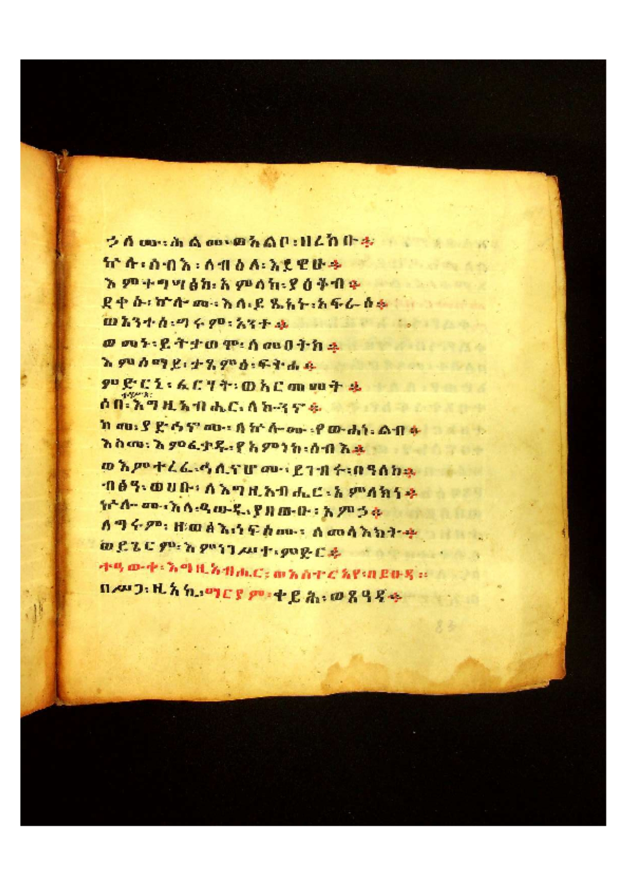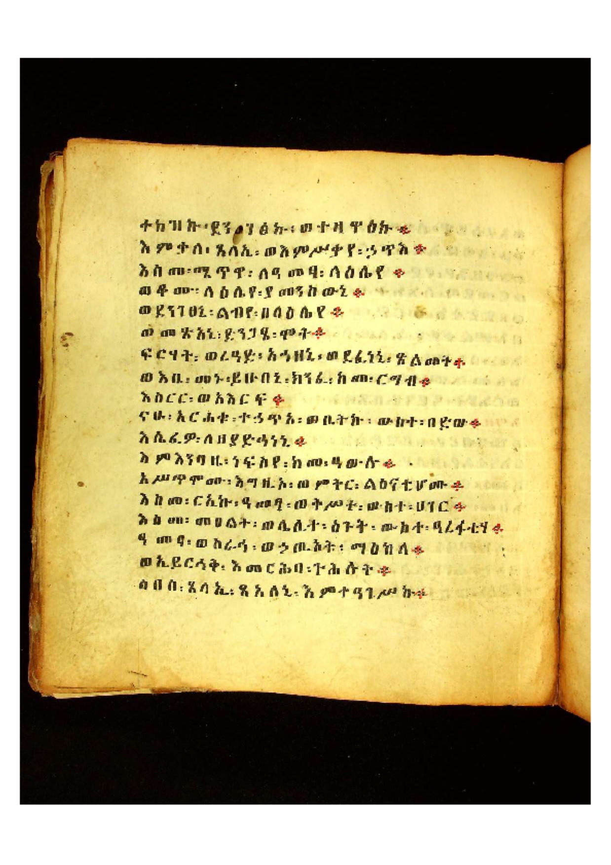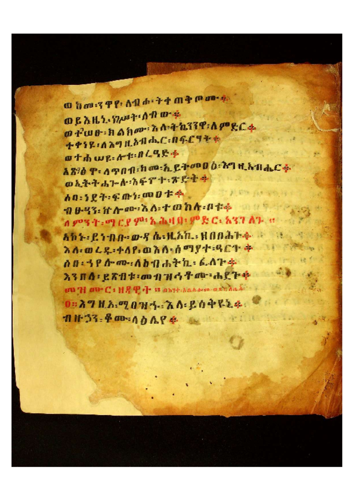 1. F. 2r: donation note written vertically in the outer margin, in black ink: “alla famiglia Bruschettini, Pussy […] Battaglia dell’Amba Aradam il 16 febbraio 1936 XIV”. The note, written in Italian and partly illegible, indicates the Bruschettini family as the receiver of the book and mentions the Battle of Amba Aradam, which took place on 16 February 1936. 2. F. 5r: note written in Italian in the outer upper margin, in red pencil: “Amba Aradam 16/2/XIV ore 17.30 P. Paloboni (?)”. This note also mentions the Battle of Amba Aradam, together with an individual whose name is partially unclear (P. Paloboni?). 3. F. 173v: supplication note written in small script in a mediocre hand, at the end of the “Psalms of David”: ዕቀበኒ፡ እምዓይነ፡ ደዌ፡ ወሞት፡ ለገብርከ፡ ደቅስዮስ፡, “protect me, your servant Däqsəyos, from the eye of infirmity and death”. The note mentions a certain Däqsəyos, indicated as “your servant” (possibly a later owner of the codex). 4. F. 173v: incipit of the Gəʿəz and Amharic prayer, perhaps a writing exercise. The note is written in an inaccurate calligraphy on the outer margin of the folio, next to the prayer. The entire text is የህፂ፡ ኖኅን፡ ከማየ[፡] አይኅ። እስራኤልን፡ ከፈርዖን፡ ዳዊትን፡ ከሳኦል፡ ከኢሎፍሊ። ኤ. 5. F. 190v: donation note, written in black ink in a mediocre hand. Text: ዝመጽሐፍ፡ ዘደብተራ፡ ኪሮስ፡ ዘወሀቦ፡ ለታቦተ፡ ሚካኤል፡ ኢትርስዑኒ፡ በአቡነ፡ ዘበሰማያት፡ ዘአቡየ፡ ገብረ፡ ማርያም፡ ወለእምየ፡ ወለተ፡ ሩፋኤል፡, “This book belongs to däbtära Kiros, who donated it to the tabot of [the church of St] Michael. Do not forget me for our Father who is in heaven. [It also belongs] to my father Gäbrä Maryam and my mother Wälättä Rufaʾel”. 6. F. 199v: writings executed in an inaccurate hand, perhaps the same of note 4. The note includes pen trials (ፈቲነ፡ ብርዕ፡ ዘፈረና፡ etc.), reproduces the explicit of the “Song of the songs” (ስብሐታተኪ፡ ማርያም፡ ከመ፡ እንተ፡ ሕልቀት፡ etc.) and the incipit of the “Praise of Mary” (ውዳሴ፡ ዘሰኑይ፡ ፈቀደ፡ እግዚእ፡ etc., partly rubricated). The writings also mention Däqsəyos, indicated as “your servant” (possibly a later owner of the codex) 7. F. 220ra–va: Genealogic note written on two columns. The note illustrates the family tree of King Yoḥannǝs I, who reigned from 1667 to 1682. The text is acephalous. Incipit: [ወለ]ደ፡ እምሐና፡ ብእሲቱ፡ አሦተ፡ ቅዱሳንሃ፡ ወአሦተ፡ ቅዱሳንኒ፡ እምነ፡ ጳውሊ፡ ብእሲሃ፡ ወለደቶሙ፡ ለአቤተኁን፡ ማእምሮ፡ ወለዘሥላሴ፡ ወአቤተኁን፡ ማእምሮኒ፡ ወለደ፡ አቃርዮስ፡ ወአቃርዮስኒ፡ ወለደ፡ እመቤት፡ እኅተ፡ ክርስቶስሃ፡. The text is published and translated in Proverbio D.V., 2000, ‘Inventario sommario dei manoscritti arabi, ebraici, etiopici – con notizia dei turchi – conservati presso la Biblioteca della Badia di Grottaferrata’. Atti della Accademia nazionale dei Lincei, Memorie, Classe di scienze morali, storiche e filologiche, serie IX, 12 (2000), 468–570 (here pp. 496–97, Appendice III). 8. F. 220va–b: Protective prayer against snakes, written on two columns. Incipit: በስመ፡ አብ፡ … ጸሎት፡ በእንተ፡ ዓርዌ፡ ምድር። ሶበ፡ በጽሐ፡ መልእክት፡ ሐሰውከ፡ በል፡ ፫ጊዜ፡ አኂዘከ፡ ዘፈረ፡ ልብሰ፡ ለእመ፡ ሀሎ፡ ርሑቀ፡ አስትዮ፡. The prayer is probably written in the same hand of note 7. 9. F. 220vb: Unidentified magic prayer containing asmat-names. Incipit: በስመ፡ አብ፡ … ኦላዘላህም፡ አህጉረ፡ ቀዳ[.]፡ ፍሖም፡ ሊስ፡ አፍሊስ፡ ምልክዮስ፡ ዘ[..]ማኤል፡ በዝንቱ፡ አስማቲከ፡ [.]ጽ[..] ኃይለ፡ በረድ፡ ወነፋስ፡ ከማሁ፡. |