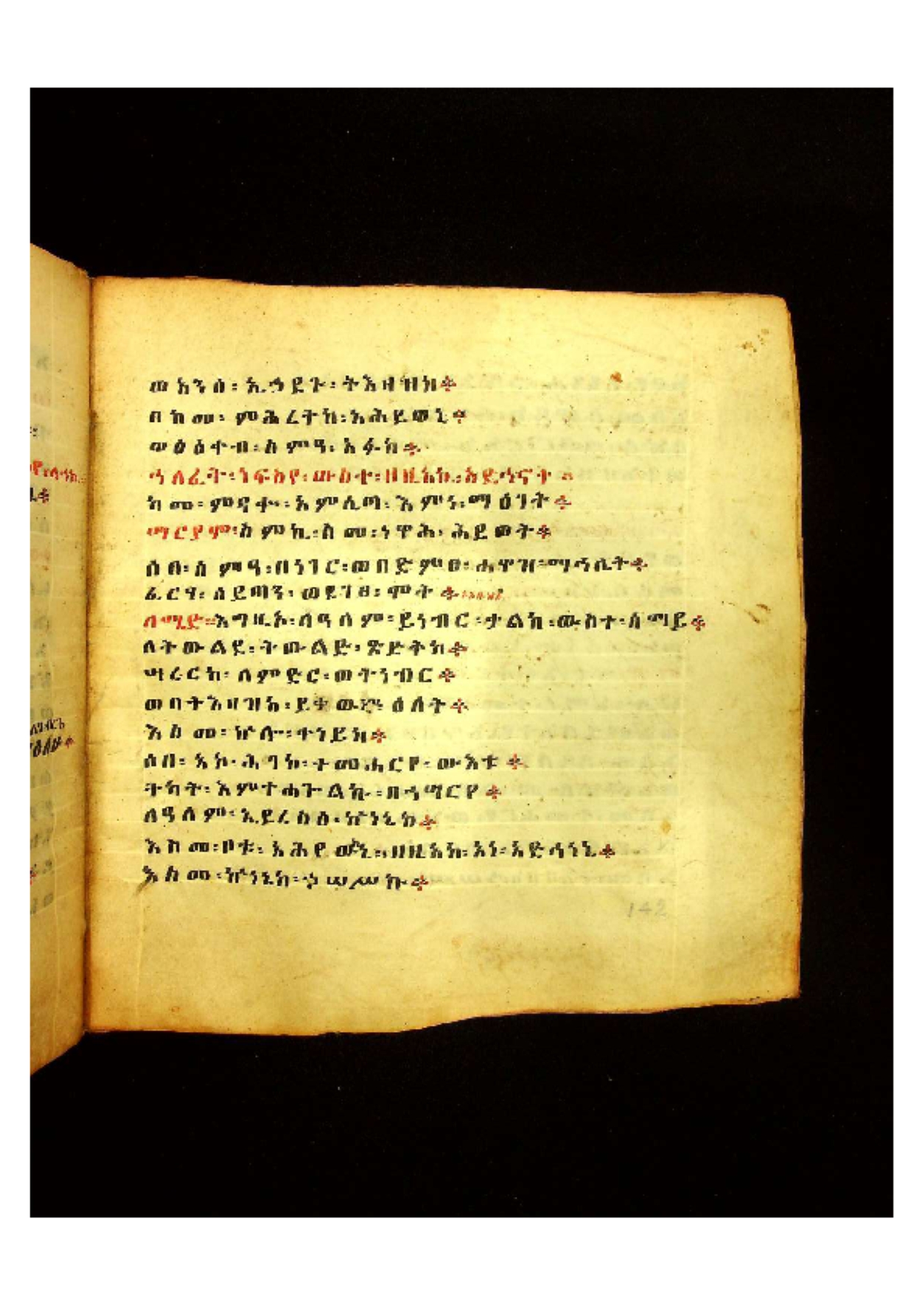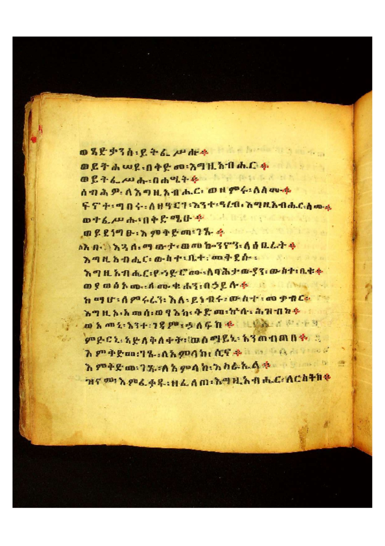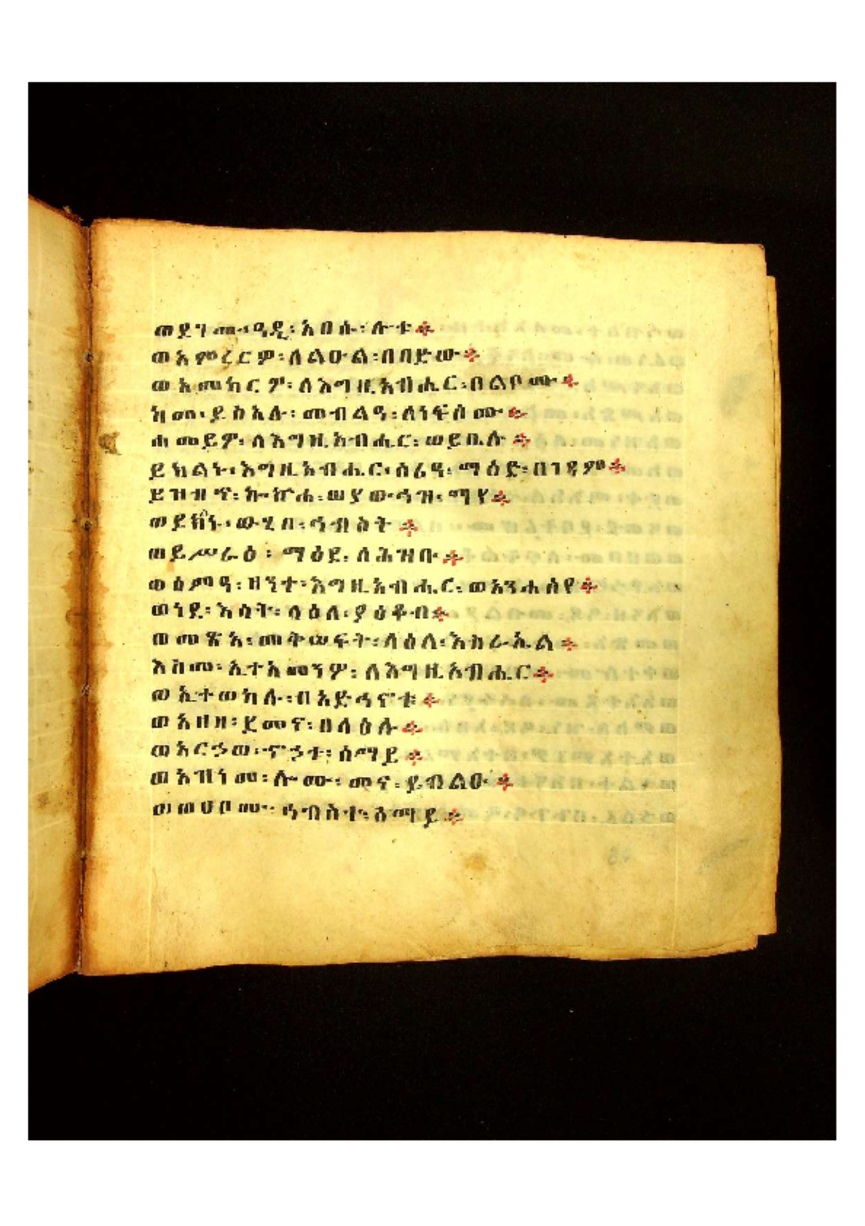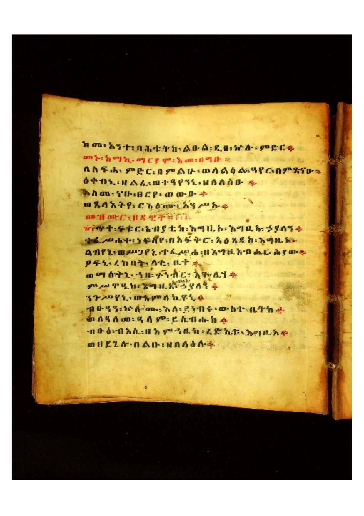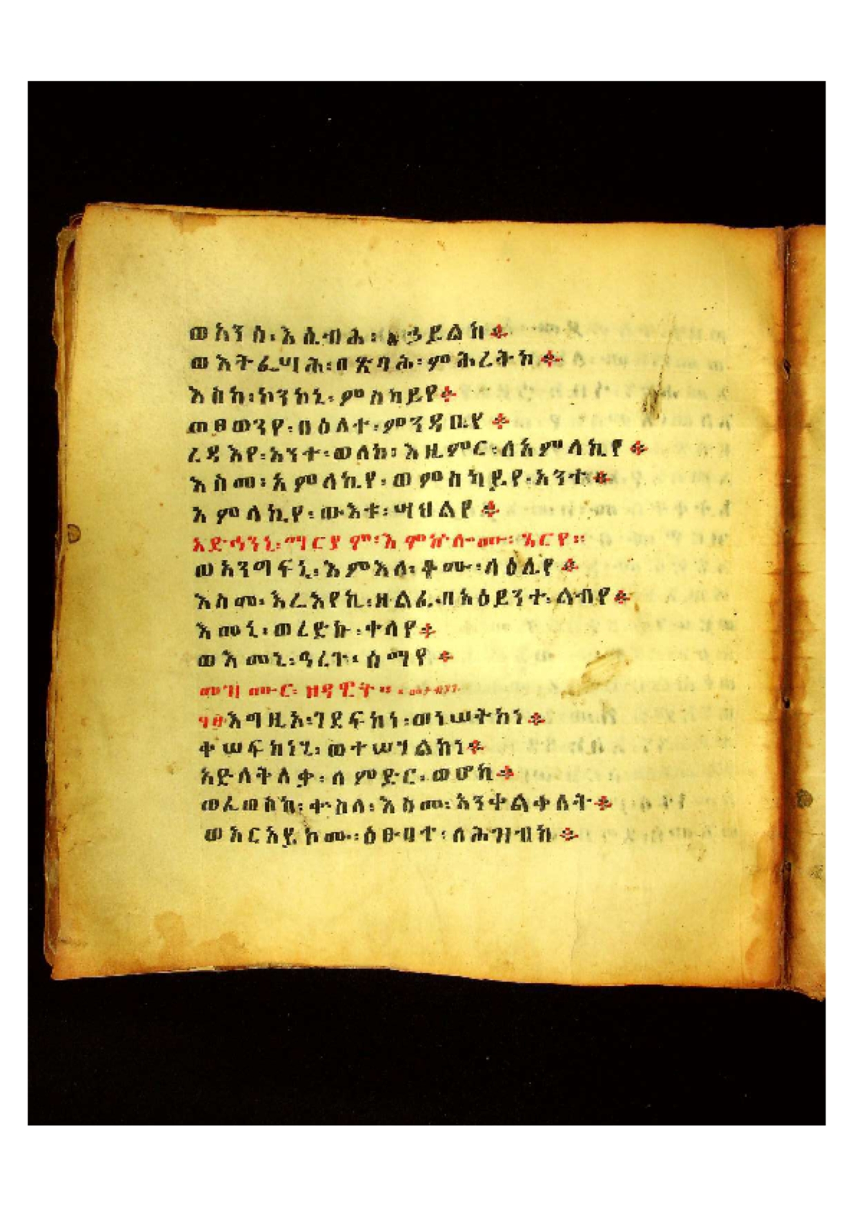 1. F. 2r: donation note written vertically in the outer margin, in black ink: “alla famiglia Bruschettini, Pussy […] Battaglia dell’Amba Aradam il 16 febbraio 1936 XIV”. The note, written in Italian and partly illegible, indicates the Bruschettini family as the receiver of the book and mentions the Battle of Amba Aradam, which took place on 16 February 1936. 2. F. 5r: note written in Italian in the outer upper margin, in red pencil: “Amba Aradam 16/2/XIV ore 17.30 P. Paloboni (?)”. This note also mentions the Battle of Amba Aradam, together with an individual whose name is partially unclear (P. Paloboni?). 3. F. 173v: supplication note written in small script in a mediocre hand, at the end of the “Psalms of David”: ዕቀበኒ፡ እምዓይነ፡ ደዌ፡ ወሞት፡ ለገብርከ፡ ደቅስዮስ፡, “protect me, your servant Däqsəyos, from the eye of infirmity and death”. The note mentions a certain Däqsəyos, indicated as “your servant” (possibly a later owner of the codex). 4. F. 173v: incipit of the Gəʿəz and Amharic prayer, perhaps a writing exercise. The note is written in an inaccurate calligraphy on the outer margin of the folio, next to the prayer. The entire text is የህፂ፡ ኖኅን፡ ከማየ[፡] አይኅ። እስራኤልን፡ ከፈርዖን፡ ዳዊትን፡ ከሳኦል፡ ከኢሎፍሊ። ኤ. 5. F. 190v: donation note, written in black ink in a mediocre hand. Text: ዝመጽሐፍ፡ ዘደብተራ፡ ኪሮስ፡ ዘወሀቦ፡ ለታቦተ፡ ሚካኤል፡ ኢትርስዑኒ፡ በአቡነ፡ ዘበሰማያት፡ ዘአቡየ፡ ገብረ፡ ማርያም፡ ወለእምየ፡ ወለተ፡ ሩፋኤል፡, “This book belongs to däbtära Kiros, who donated it to the tabot of [the church of St] Michael. Do not forget me for our Father who is in heaven. [It also belongs] to my father Gäbrä Maryam and my mother Wälättä Rufaʾel”. 6. F. 199v: writings executed in an inaccurate hand, perhaps the same of note 4. The note includes pen trials (ፈቲነ፡ ብርዕ፡ ዘፈረና፡ etc.), reproduces the explicit of the “Song of the songs” (ስብሐታተኪ፡ ማርያም፡ ከመ፡ እንተ፡ ሕልቀት፡ etc.) and the incipit of the “Praise of Mary” (ውዳሴ፡ ዘሰኑይ፡ ፈቀደ፡ እግዚእ፡ etc., partly rubricated). The writings also mention Däqsəyos, indicated as “your servant” (possibly a later owner of the codex) 7. F. 220ra–va: Genealogic note written on two columns. The note illustrates the family tree of King Yoḥannǝs I, who reigned from 1667 to 1682. The text is acephalous. Incipit: [ወለ]ደ፡ እምሐና፡ ብእሲቱ፡ አሦተ፡ ቅዱሳንሃ፡ ወአሦተ፡ ቅዱሳንኒ፡ እምነ፡ ጳውሊ፡ ብእሲሃ፡ ወለደቶሙ፡ ለአቤተኁን፡ ማእምሮ፡ ወለዘሥላሴ፡ ወአቤተኁን፡ ማእምሮኒ፡ ወለደ፡ አቃርዮስ፡ ወአቃርዮስኒ፡ ወለደ፡ እመቤት፡ እኅተ፡ ክርስቶስሃ፡. The text is published and translated in Proverbio D.V., 2000, ‘Inventario sommario dei manoscritti arabi, ebraici, etiopici – con notizia dei turchi – conservati presso la Biblioteca della Badia di Grottaferrata’. Atti della Accademia nazionale dei Lincei, Memorie, Classe di scienze morali, storiche e filologiche, serie IX, 12 (2000), 468–570 (here pp. 496–97, Appendice III). 8. F. 220va–b: Protective prayer against snakes, written on two columns. Incipit: በስመ፡ አብ፡ … ጸሎት፡ በእንተ፡ ዓርዌ፡ ምድር። ሶበ፡ በጽሐ፡ መልእክት፡ ሐሰውከ፡ በል፡ ፫ጊዜ፡ አኂዘከ፡ ዘፈረ፡ ልብሰ፡ ለእመ፡ ሀሎ፡ ርሑቀ፡ አስትዮ፡. The prayer is probably written in the same hand of note 7. 9. F. 220vb: Unidentified magic prayer containing asmat-names. Incipit: በስመ፡ አብ፡ … ኦላዘላህም፡ አህጉረ፡ ቀዳ[.]፡ ፍሖም፡ ሊስ፡ አፍሊስ፡ ምልክዮስ፡ ዘ[..]ማኤል፡ በዝንቱ፡ አስማቲከ፡ [.]ጽ[..] ኃይለ፡ በረድ፡ ወነፋስ፡ ከማሁ፡. |