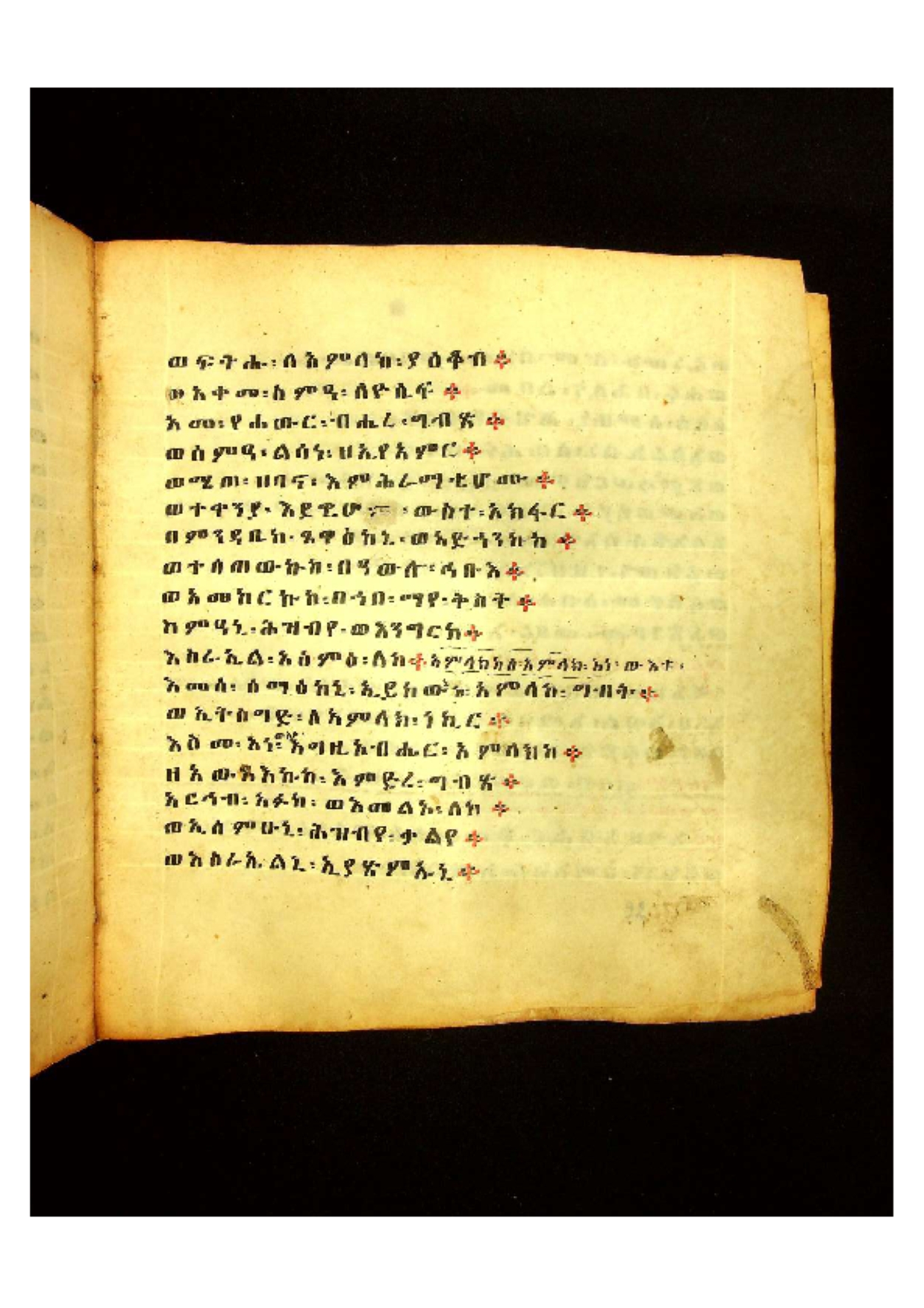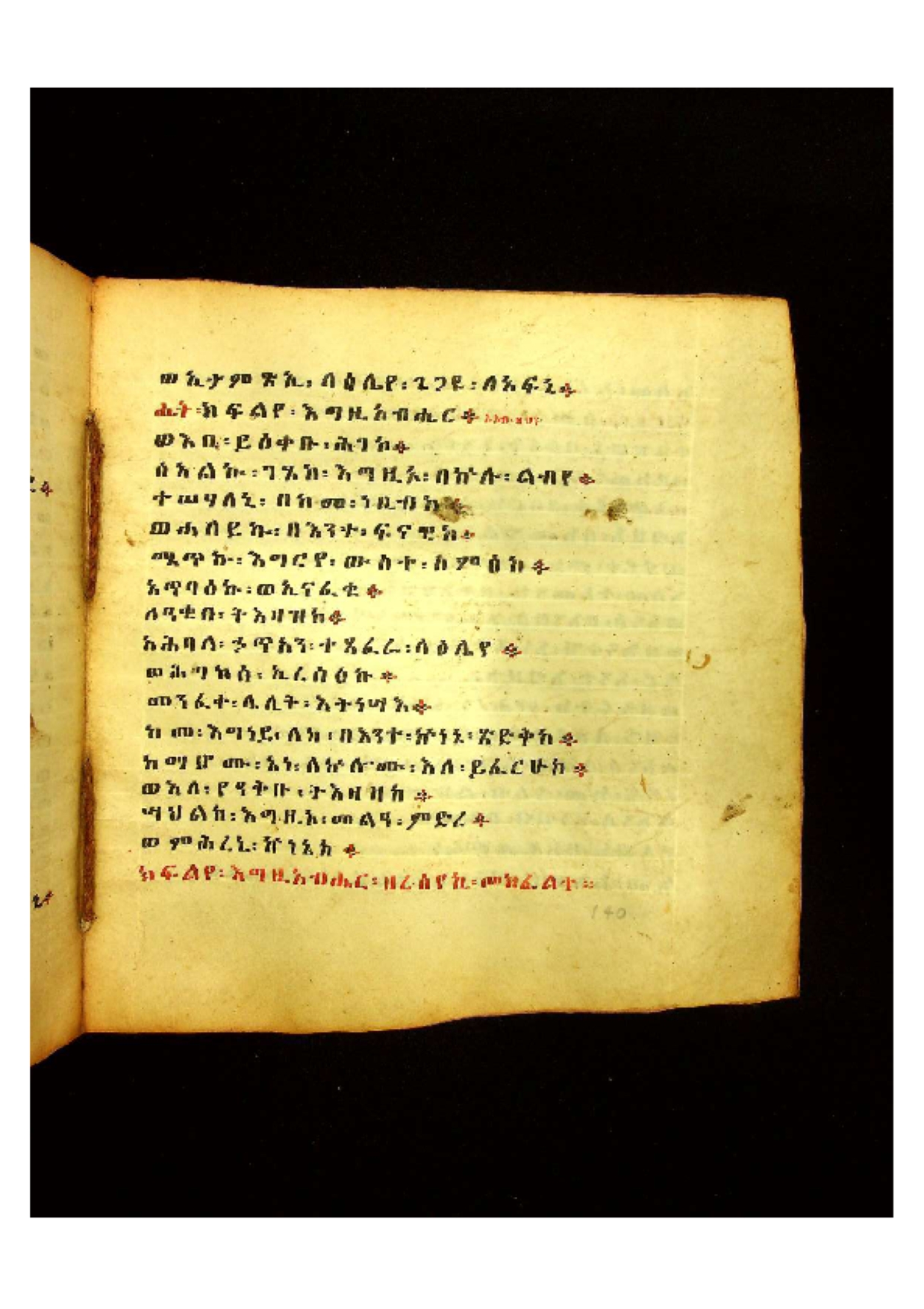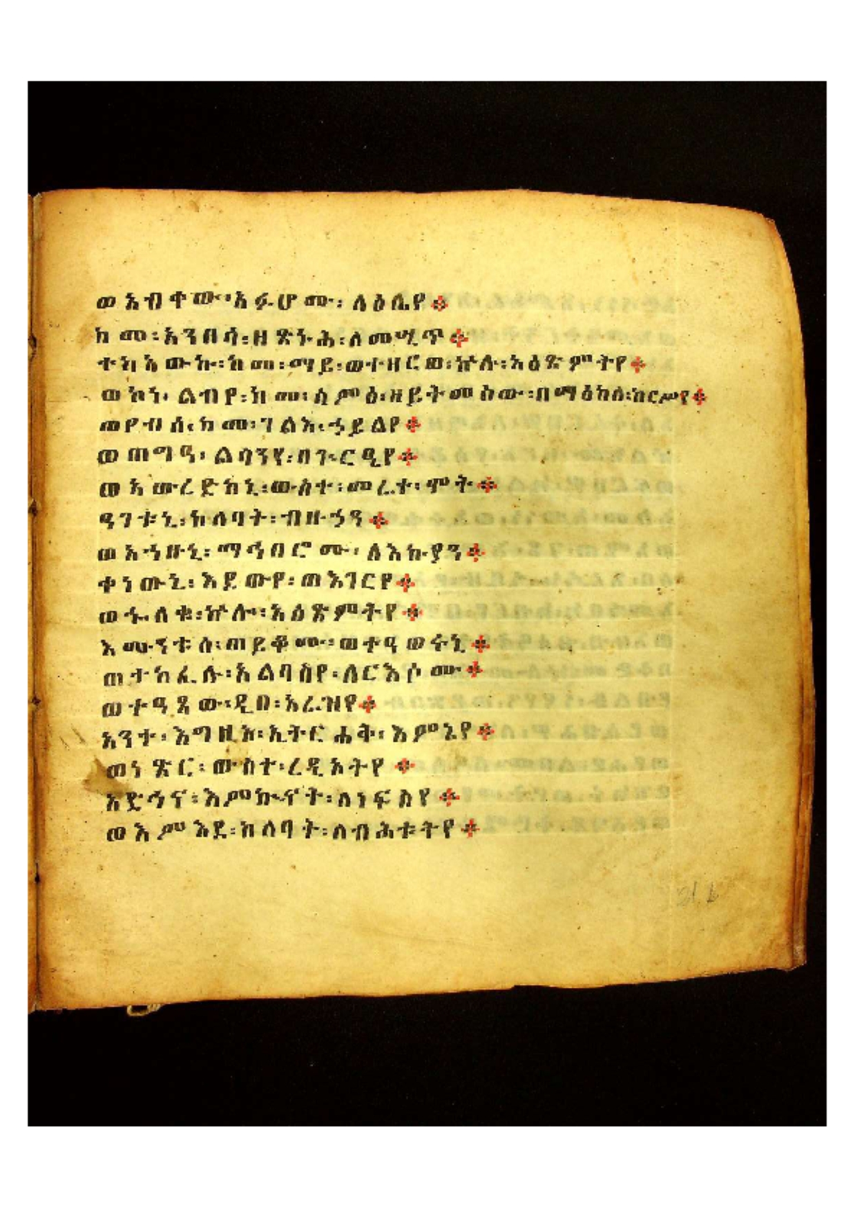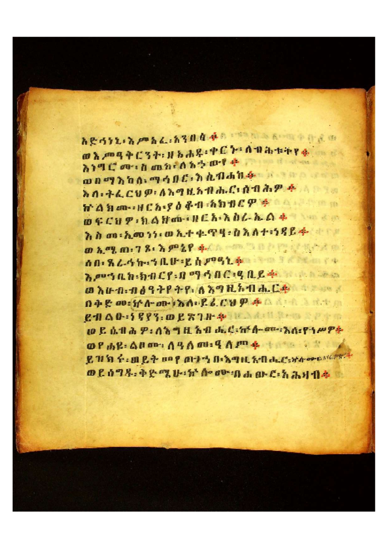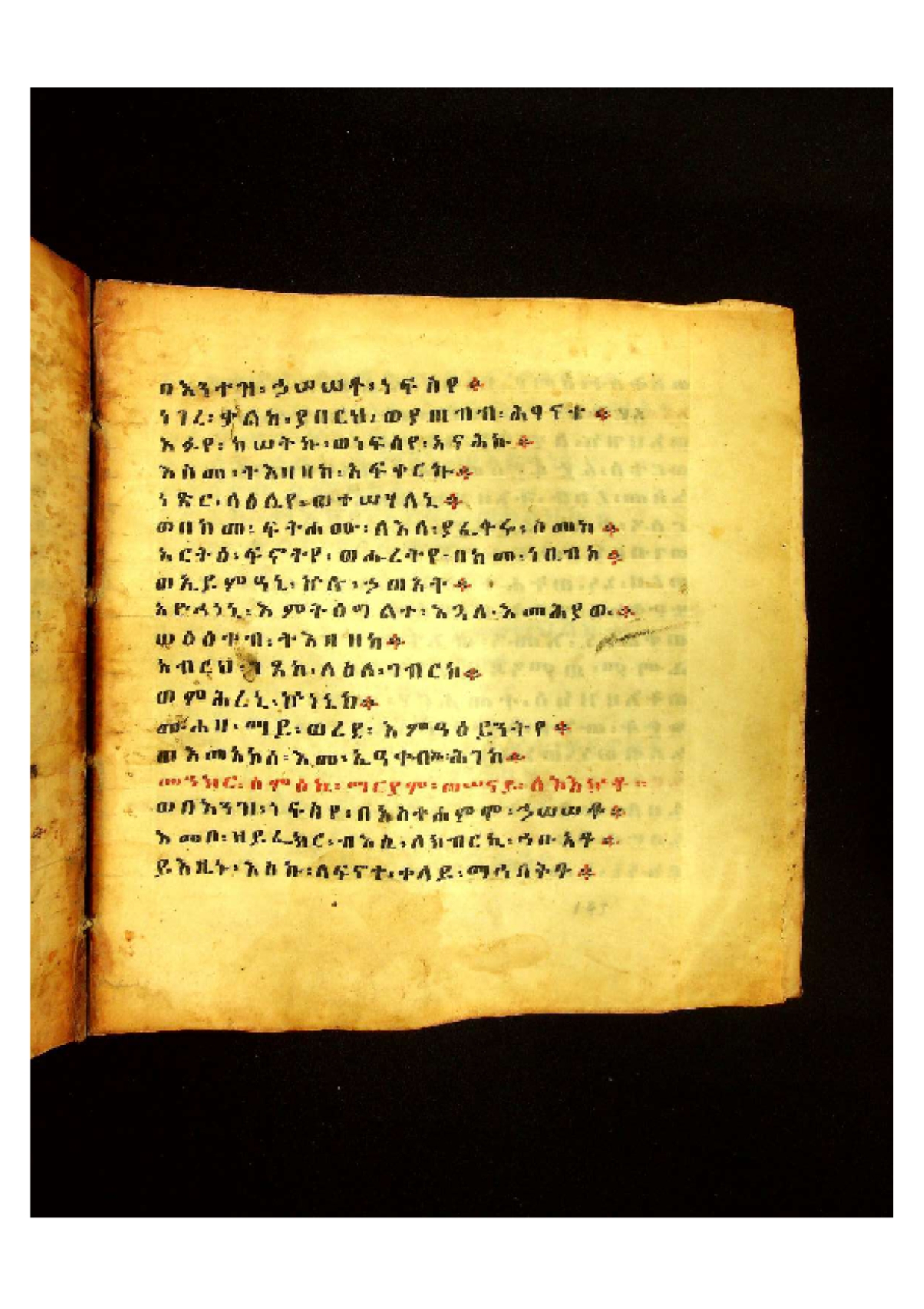 1. F. 2r: donation note written vertically in the outer margin, in black ink: “alla famiglia Bruschettini, Pussy […] Battaglia dell’Amba Aradam il 16 febbraio 1936 XIV”. The note, written in Italian and partly illegible, indicates the Bruschettini family as the receiver of the book and mentions the Battle of Amba Aradam, which took place on 16 February 1936. 2. F. 5r: note written in Italian in the outer upper margin, in red pencil: “Amba Aradam 16/2/XIV ore 17.30 P. Paloboni (?)”. This note also mentions the Battle of Amba Aradam, together with an individual whose name is partially unclear (P. Paloboni?). 3. F. 173v: supplication note written in small script in a mediocre hand, at the end of the “Psalms of David”: ዕቀበኒ፡ እምዓይነ፡ ደዌ፡ ወሞት፡ ለገብርከ፡ ደቅስዮስ፡, “protect me, your servant Däqsəyos, from the eye of infirmity and death”. The note mentions a certain Däqsəyos, indicated as “your servant” (possibly a later owner of the codex). 4. F. 173v: incipit of the Gəʿəz and Amharic prayer, perhaps a writing exercise. The note is written in an inaccurate calligraphy on the outer margin of the folio, next to the prayer. The entire text is የህፂ፡ ኖኅን፡ ከማየ[፡] አይኅ። እስራኤልን፡ ከፈርዖን፡ ዳዊትን፡ ከሳኦል፡ ከኢሎፍሊ። ኤ. 5. F. 190v: donation note, written in black ink in a mediocre hand. Text: ዝመጽሐፍ፡ ዘደብተራ፡ ኪሮስ፡ ዘወሀቦ፡ ለታቦተ፡ ሚካኤል፡ ኢትርስዑኒ፡ በአቡነ፡ ዘበሰማያት፡ ዘአቡየ፡ ገብረ፡ ማርያም፡ ወለእምየ፡ ወለተ፡ ሩፋኤል፡, “This book belongs to däbtära Kiros, who donated it to the tabot of [the church of St] Michael. Do not forget me for our Father who is in heaven. [It also belongs] to my father Gäbrä Maryam and my mother Wälättä Rufaʾel”. 6. F. 199v: writings executed in an inaccurate hand, perhaps the same of note 4. The note includes pen trials (ፈቲነ፡ ብርዕ፡ ዘፈረና፡ etc.), reproduces the explicit of the “Song of the songs” (ስብሐታተኪ፡ ማርያም፡ ከመ፡ እንተ፡ ሕልቀት፡ etc.) and the incipit of the “Praise of Mary” (ውዳሴ፡ ዘሰኑይ፡ ፈቀደ፡ እግዚእ፡ etc., partly rubricated). The writings also mention Däqsəyos, indicated as “your servant” (possibly a later owner of the codex) 7. F. 220ra–va: Genealogic note written on two columns. The note illustrates the family tree of King Yoḥannǝs I, who reigned from 1667 to 1682. The text is acephalous. Incipit: [ወለ]ደ፡ እምሐና፡ ብእሲቱ፡ አሦተ፡ ቅዱሳንሃ፡ ወአሦተ፡ ቅዱሳንኒ፡ እምነ፡ ጳውሊ፡ ብእሲሃ፡ ወለደቶሙ፡ ለአቤተኁን፡ ማእምሮ፡ ወለዘሥላሴ፡ ወአቤተኁን፡ ማእምሮኒ፡ ወለደ፡ አቃርዮስ፡ ወአቃርዮስኒ፡ ወለደ፡ እመቤት፡ እኅተ፡ ክርስቶስሃ፡. The text is published and translated in Proverbio D.V., 2000, ‘Inventario sommario dei manoscritti arabi, ebraici, etiopici – con notizia dei turchi – conservati presso la Biblioteca della Badia di Grottaferrata’. Atti della Accademia nazionale dei Lincei, Memorie, Classe di scienze morali, storiche e filologiche, serie IX, 12 (2000), 468–570 (here pp. 496–97, Appendice III). 8. F. 220va–b: Protective prayer against snakes, written on two columns. Incipit: በስመ፡ አብ፡ … ጸሎት፡ በእንተ፡ ዓርዌ፡ ምድር። ሶበ፡ በጽሐ፡ መልእክት፡ ሐሰውከ፡ በል፡ ፫ጊዜ፡ አኂዘከ፡ ዘፈረ፡ ልብሰ፡ ለእመ፡ ሀሎ፡ ርሑቀ፡ አስትዮ፡. The prayer is probably written in the same hand of note 7. 9. F. 220vb: Unidentified magic prayer containing asmat-names. Incipit: በስመ፡ አብ፡ … ኦላዘላህም፡ አህጉረ፡ ቀዳ[.]፡ ፍሖም፡ ሊስ፡ አፍሊስ፡ ምልክዮስ፡ ዘ[..]ማኤል፡ በዝንቱ፡ አስማቲከ፡ [.]ጽ[..] ኃይለ፡ በረድ፡ ወነፋስ፡ ከማሁ፡. |