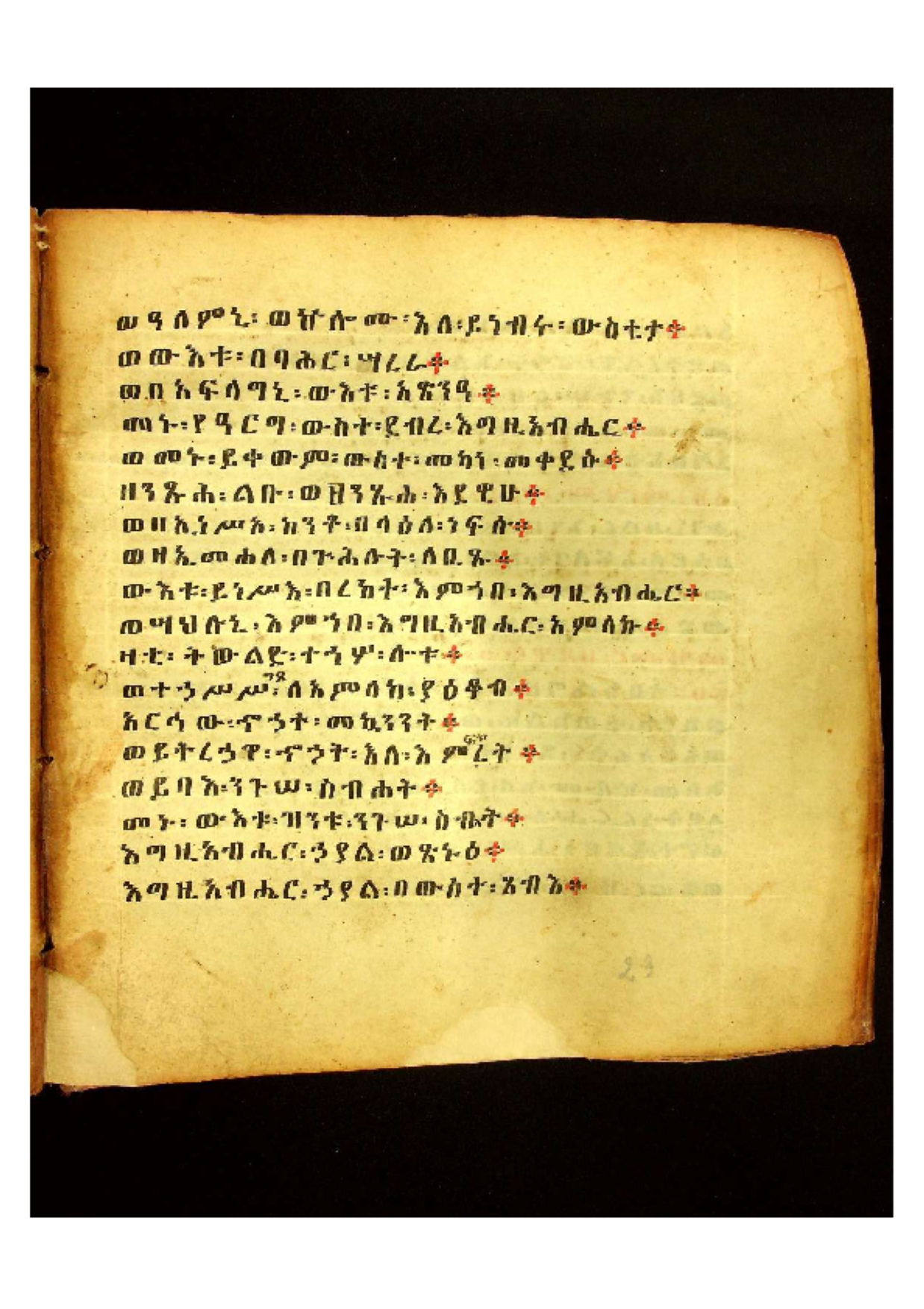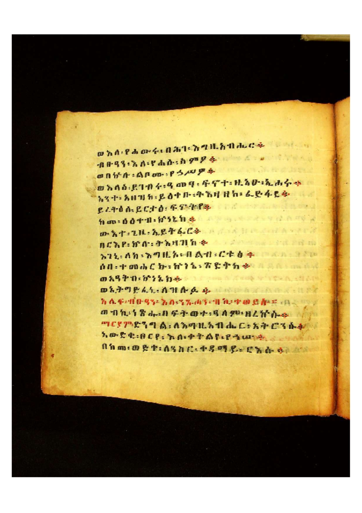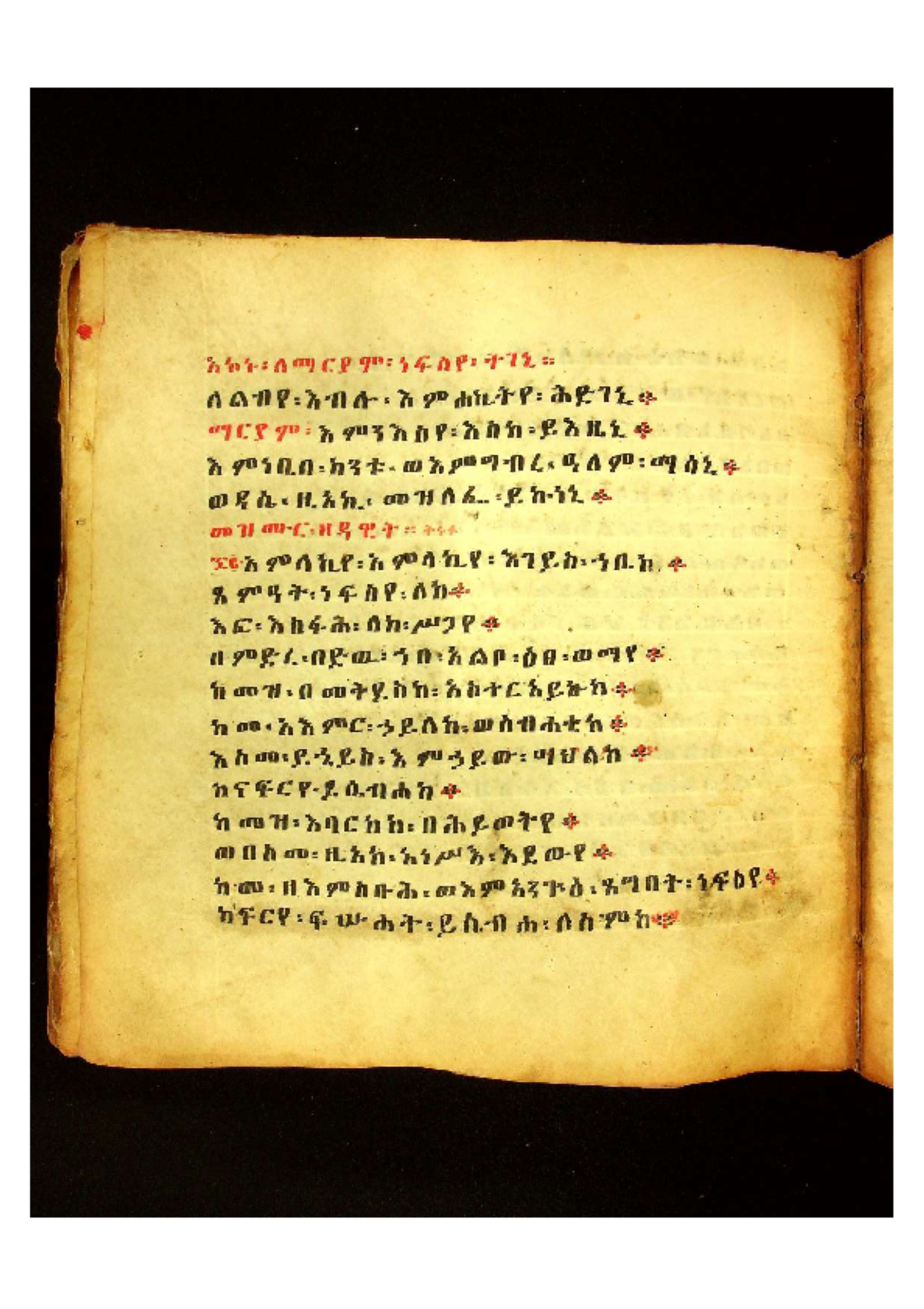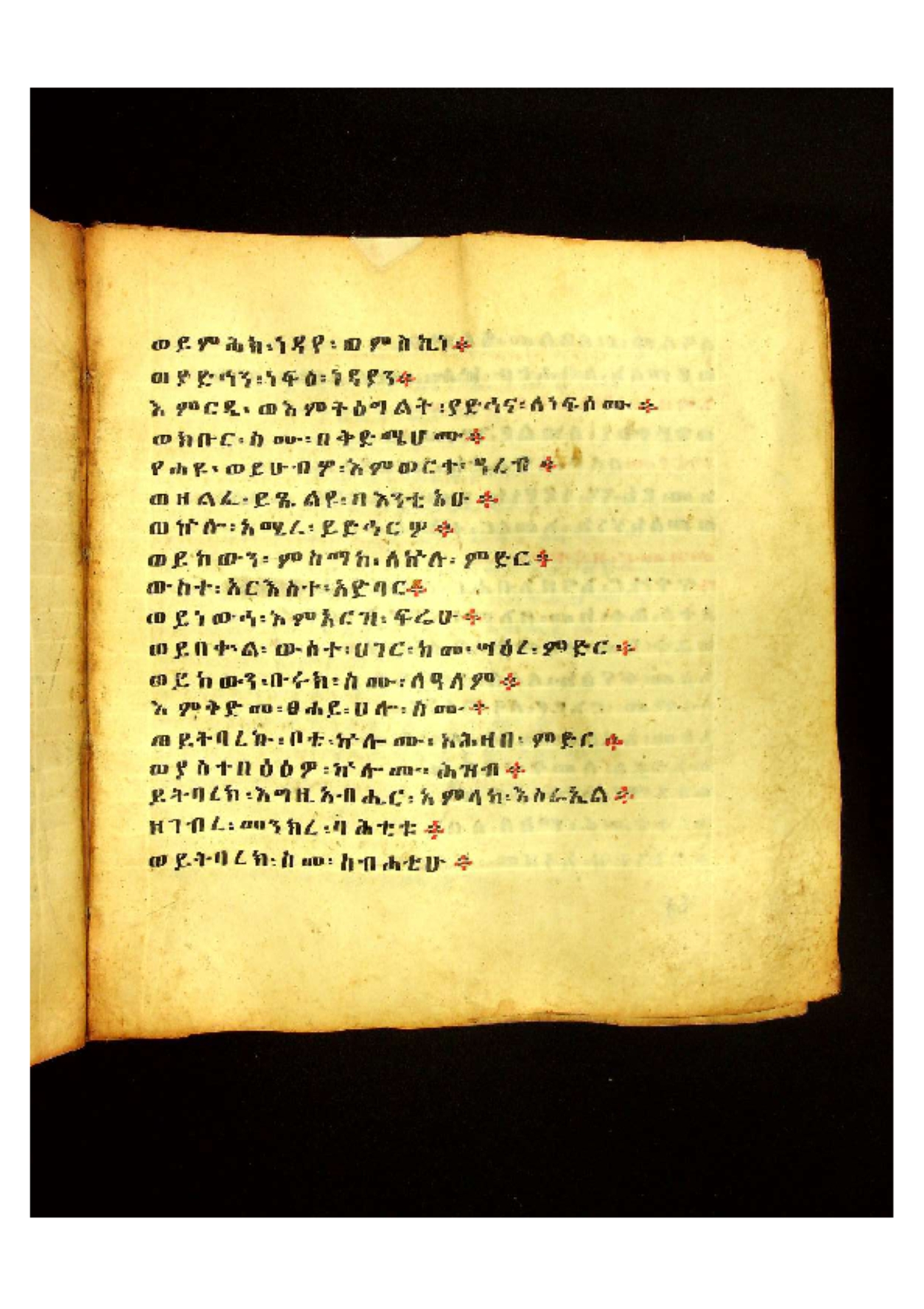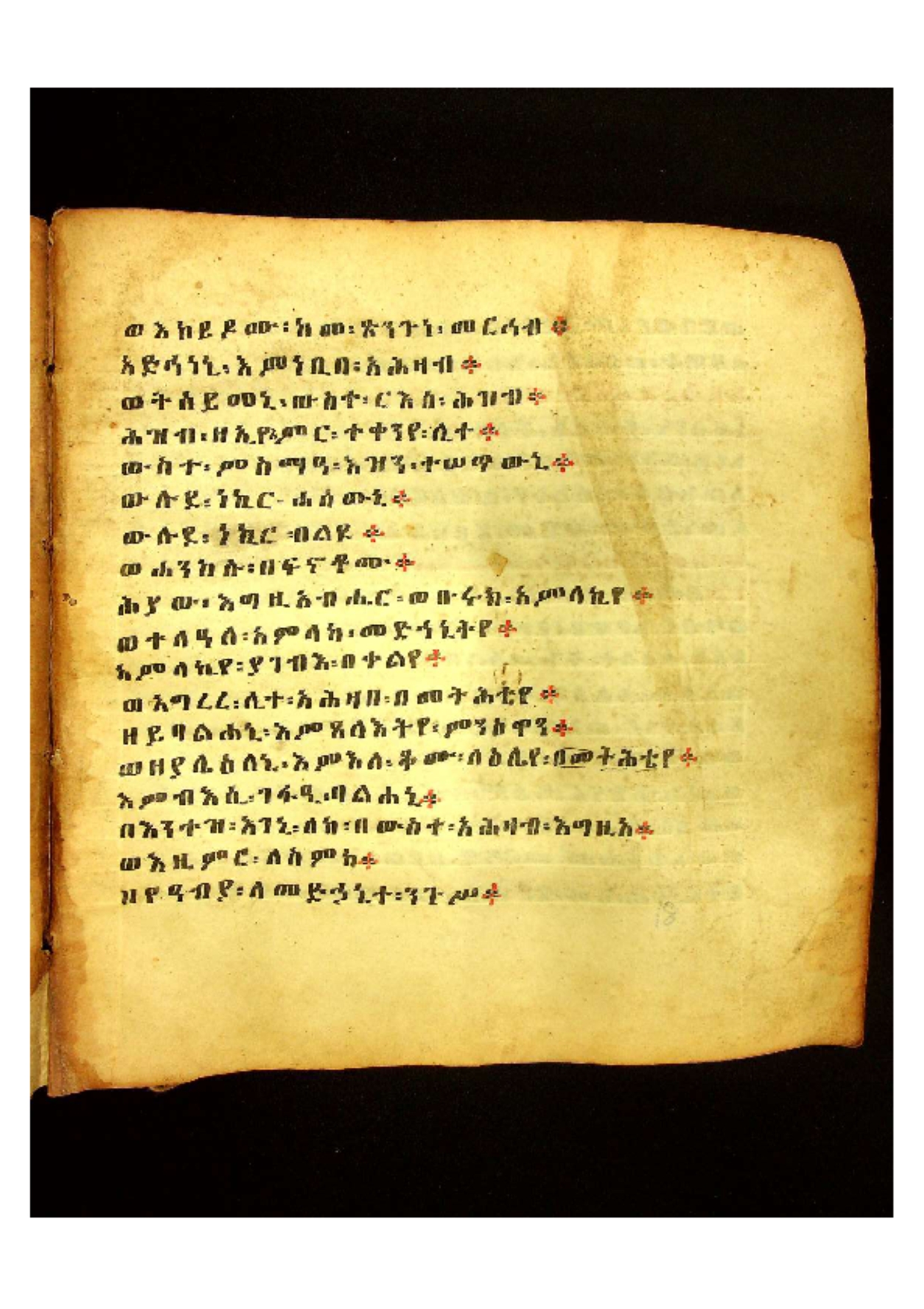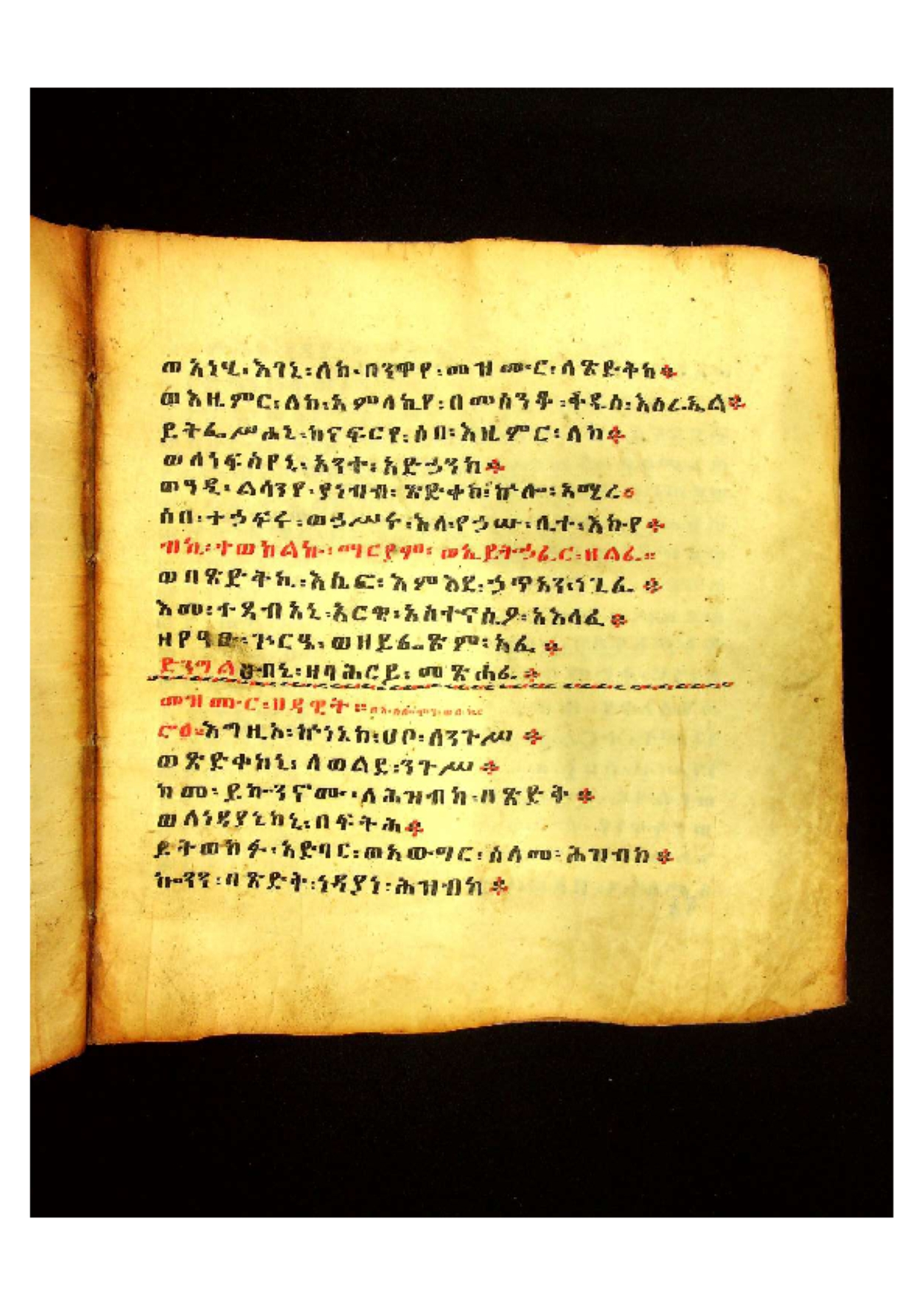 1. F. 2r: donation note written vertically in the outer margin, in black ink: “alla famiglia Bruschettini, Pussy […] Battaglia dell’Amba Aradam il 16 febbraio 1936 XIV”. The note, written in Italian and partly illegible, indicates the Bruschettini family as the receiver of the book and mentions the Battle of Amba Aradam, which took place on 16 February 1936. 2. F. 5r: note written in Italian in the outer upper margin, in red pencil: “Amba Aradam 16/2/XIV ore 17.30 P. Paloboni (?)”. This note also mentions the Battle of Amba Aradam, together with an individual whose name is partially unclear (P. Paloboni?). 3. F. 173v: supplication note written in small script in a mediocre hand, at the end of the “Psalms of David”: ዕቀበኒ፡ እምዓይነ፡ ደዌ፡ ወሞት፡ ለገብርከ፡ ደቅስዮስ፡, “protect me, your servant Däqsəyos, from the eye of infirmity and death”. The note mentions a certain Däqsəyos, indicated as “your servant” (possibly a later owner of the codex). 4. F. 173v: incipit of the Gəʿəz and Amharic prayer, perhaps a writing exercise. The note is written in an inaccurate calligraphy on the outer margin of the folio, next to the prayer. The entire text is የህፂ፡ ኖኅን፡ ከማየ[፡] አይኅ። እስራኤልን፡ ከፈርዖን፡ ዳዊትን፡ ከሳኦል፡ ከኢሎፍሊ። ኤ. 5. F. 190v: donation note, written in black ink in a mediocre hand. Text: ዝመጽሐፍ፡ ዘደብተራ፡ ኪሮስ፡ ዘወሀቦ፡ ለታቦተ፡ ሚካኤል፡ ኢትርስዑኒ፡ በአቡነ፡ ዘበሰማያት፡ ዘአቡየ፡ ገብረ፡ ማርያም፡ ወለእምየ፡ ወለተ፡ ሩፋኤል፡, “This book belongs to däbtära Kiros, who donated it to the tabot of [the church of St] Michael. Do not forget me for our Father who is in heaven. [It also belongs] to my father Gäbrä Maryam and my mother Wälättä Rufaʾel”. 6. F. 199v: writings executed in an inaccurate hand, perhaps the same of note 4. The note includes pen trials (ፈቲነ፡ ብርዕ፡ ዘፈረና፡ etc.), reproduces the explicit of the “Song of the songs” (ስብሐታተኪ፡ ማርያም፡ ከመ፡ እንተ፡ ሕልቀት፡ etc.) and the incipit of the “Praise of Mary” (ውዳሴ፡ ዘሰኑይ፡ ፈቀደ፡ እግዚእ፡ etc., partly rubricated). The writings also mention Däqsəyos, indicated as “your servant” (possibly a later owner of the codex) 7. F. 220ra–va: Genealogic note written on two columns. The note illustrates the family tree of King Yoḥannǝs I, who reigned from 1667 to 1682. The text is acephalous. Incipit: [ወለ]ደ፡ እምሐና፡ ብእሲቱ፡ አሦተ፡ ቅዱሳንሃ፡ ወአሦተ፡ ቅዱሳንኒ፡ እምነ፡ ጳውሊ፡ ብእሲሃ፡ ወለደቶሙ፡ ለአቤተኁን፡ ማእምሮ፡ ወለዘሥላሴ፡ ወአቤተኁን፡ ማእምሮኒ፡ ወለደ፡ አቃርዮስ፡ ወአቃርዮስኒ፡ ወለደ፡ እመቤት፡ እኅተ፡ ክርስቶስሃ፡. The text is published and translated in Proverbio D.V., 2000, ‘Inventario sommario dei manoscritti arabi, ebraici, etiopici – con notizia dei turchi – conservati presso la Biblioteca della Badia di Grottaferrata’. Atti della Accademia nazionale dei Lincei, Memorie, Classe di scienze morali, storiche e filologiche, serie IX, 12 (2000), 468–570 (here pp. 496–97, Appendice III). 8. F. 220va–b: Protective prayer against snakes, written on two columns. Incipit: በስመ፡ አብ፡ … ጸሎት፡ በእንተ፡ ዓርዌ፡ ምድር። ሶበ፡ በጽሐ፡ መልእክት፡ ሐሰውከ፡ በል፡ ፫ጊዜ፡ አኂዘከ፡ ዘፈረ፡ ልብሰ፡ ለእመ፡ ሀሎ፡ ርሑቀ፡ አስትዮ፡. The prayer is probably written in the same hand of note 7. 9. F. 220vb: Unidentified magic prayer containing asmat-names. Incipit: በስመ፡ አብ፡ … ኦላዘላህም፡ አህጉረ፡ ቀዳ[.]፡ ፍሖም፡ ሊስ፡ አፍሊስ፡ ምልክዮስ፡ ዘ[..]ማኤል፡ በዝንቱ፡ አስማቲከ፡ [.]ጽ[..] ኃይለ፡ በረድ፡ ወነፋስ፡ ከማሁ፡. |