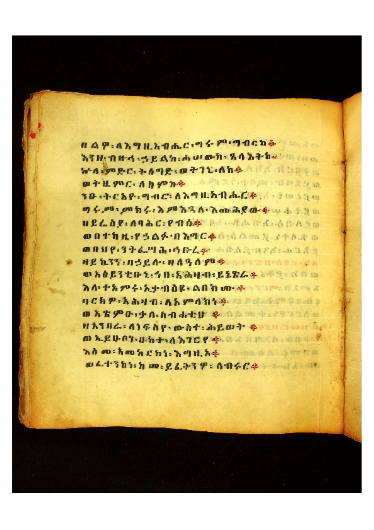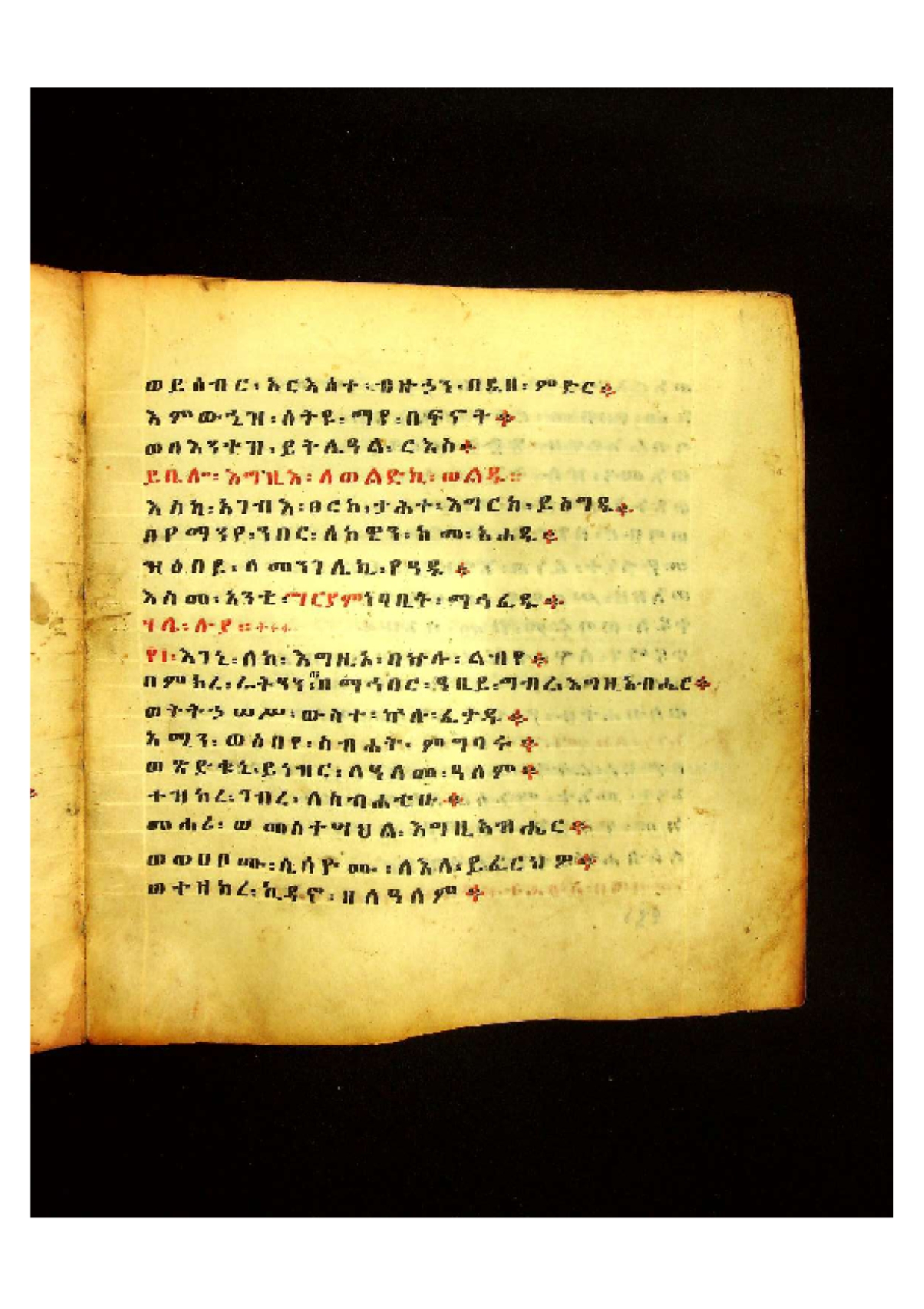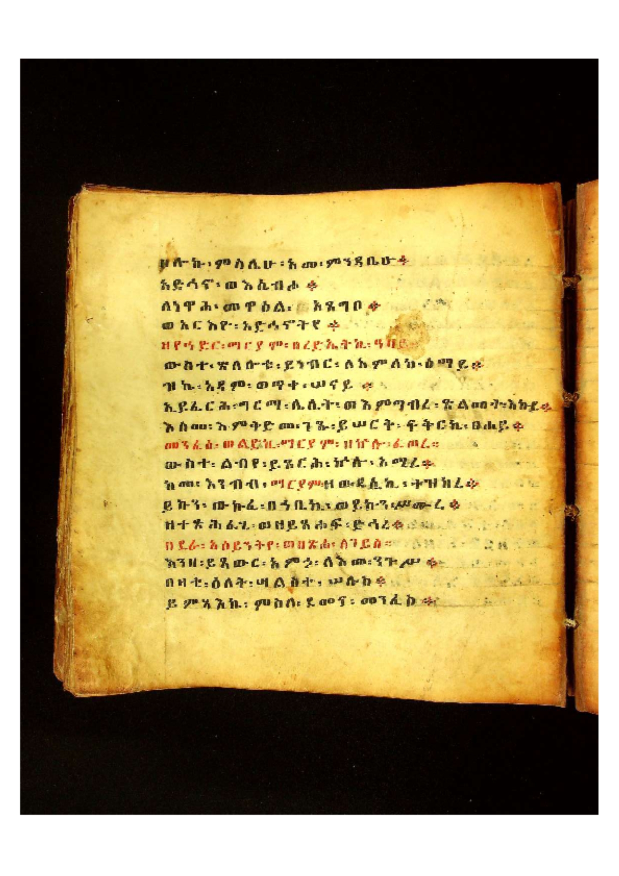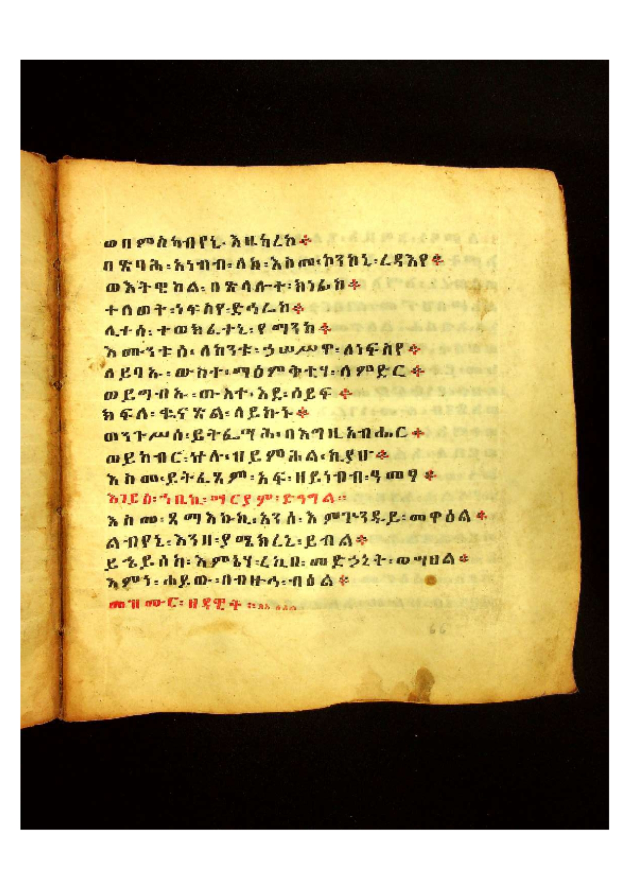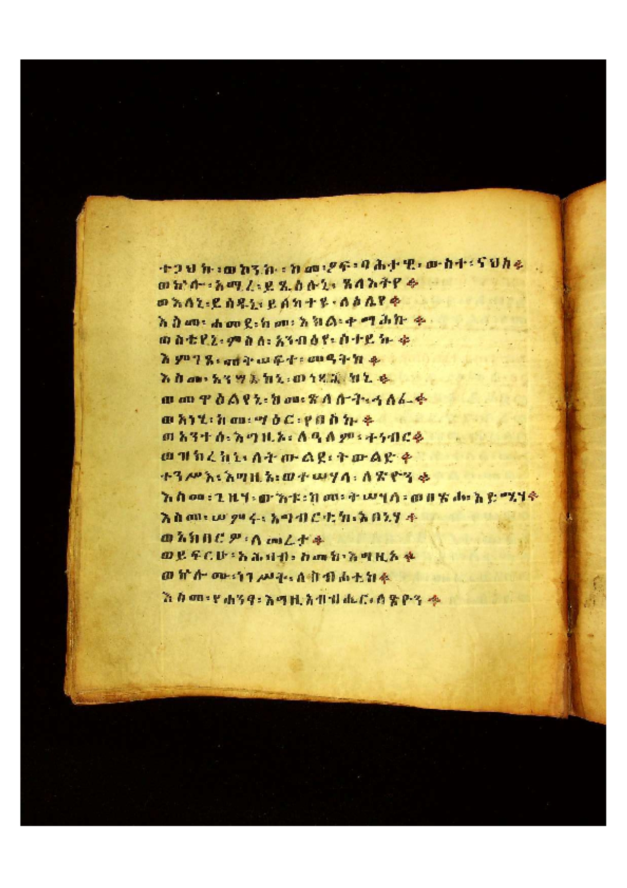 1. F. 2r: donation note written vertically in the outer margin, in black ink: “alla famiglia Bruschettini, Pussy […] Battaglia dell’Amba Aradam il 16 febbraio 1936 XIV”. The note, written in Italian and partly illegible, indicates the Bruschettini family as the receiver of the book and mentions the Battle of Amba Aradam, which took place on 16 February 1936. 2. F. 5r: note written in Italian in the outer upper margin, in red pencil: “Amba Aradam 16/2/XIV ore 17.30 P. Paloboni (?)”. This note also mentions the Battle of Amba Aradam, together with an individual whose name is partially unclear (P. Paloboni?). 3. F. 173v: supplication note written in small script in a mediocre hand, at the end of the “Psalms of David”: ዕቀበኒ፡ እምዓይነ፡ ደዌ፡ ወሞት፡ ለገብርከ፡ ደቅስዮስ፡, “protect me, your servant Däqsəyos, from the eye of infirmity and death”. The note mentions a certain Däqsəyos, indicated as “your servant” (possibly a later owner of the codex). 4. F. 173v: incipit of the Gəʿəz and Amharic prayer, perhaps a writing exercise. The note is written in an inaccurate calligraphy on the outer margin of the folio, next to the prayer. The entire text is የህፂ፡ ኖኅን፡ ከማየ[፡] አይኅ። እስራኤልን፡ ከፈርዖን፡ ዳዊትን፡ ከሳኦል፡ ከኢሎፍሊ። ኤ. 5. F. 190v: donation note, written in black ink in a mediocre hand. Text: ዝመጽሐፍ፡ ዘደብተራ፡ ኪሮስ፡ ዘወሀቦ፡ ለታቦተ፡ ሚካኤል፡ ኢትርስዑኒ፡ በአቡነ፡ ዘበሰማያት፡ ዘአቡየ፡ ገብረ፡ ማርያም፡ ወለእምየ፡ ወለተ፡ ሩፋኤል፡, “This book belongs to däbtära Kiros, who donated it to the tabot of [the church of St] Michael. Do not forget me for our Father who is in heaven. [It also belongs] to my father Gäbrä Maryam and my mother Wälättä Rufaʾel”. 6. F. 199v: writings executed in an inaccurate hand, perhaps the same of note 4. The note includes pen trials (ፈቲነ፡ ብርዕ፡ ዘፈረና፡ etc.), reproduces the explicit of the “Song of the songs” (ስብሐታተኪ፡ ማርያም፡ ከመ፡ እንተ፡ ሕልቀት፡ etc.) and the incipit of the “Praise of Mary” (ውዳሴ፡ ዘሰኑይ፡ ፈቀደ፡ እግዚእ፡ etc., partly rubricated). The writings also mention Däqsəyos, indicated as “your servant” (possibly a later owner of the codex) 7. F. 220ra–va: Genealogic note written on two columns. The note illustrates the family tree of King Yoḥannǝs I, who reigned from 1667 to 1682. The text is acephalous. Incipit: [ወለ]ደ፡ እምሐና፡ ብእሲቱ፡ አሦተ፡ ቅዱሳንሃ፡ ወአሦተ፡ ቅዱሳንኒ፡ እምነ፡ ጳውሊ፡ ብእሲሃ፡ ወለደቶሙ፡ ለአቤተኁን፡ ማእምሮ፡ ወለዘሥላሴ፡ ወአቤተኁን፡ ማእምሮኒ፡ ወለደ፡ አቃርዮስ፡ ወአቃርዮስኒ፡ ወለደ፡ እመቤት፡ እኅተ፡ ክርስቶስሃ፡. The text is published and translated in Proverbio D.V., 2000, ‘Inventario sommario dei manoscritti arabi, ebraici, etiopici – con notizia dei turchi – conservati presso la Biblioteca della Badia di Grottaferrata’. Atti della Accademia nazionale dei Lincei, Memorie, Classe di scienze morali, storiche e filologiche, serie IX, 12 (2000), 468–570 (here pp. 496–97, Appendice III). 8. F. 220va–b: Protective prayer against snakes, written on two columns. Incipit: በስመ፡ አብ፡ … ጸሎት፡ በእንተ፡ ዓርዌ፡ ምድር። ሶበ፡ በጽሐ፡ መልእክት፡ ሐሰውከ፡ በል፡ ፫ጊዜ፡ አኂዘከ፡ ዘፈረ፡ ልብሰ፡ ለእመ፡ ሀሎ፡ ርሑቀ፡ አስትዮ፡. The prayer is probably written in the same hand of note 7. 9. F. 220vb: Unidentified magic prayer containing asmat-names. Incipit: በስመ፡ አብ፡ … ኦላዘላህም፡ አህጉረ፡ ቀዳ[.]፡ ፍሖም፡ ሊስ፡ አፍሊስ፡ ምልክዮስ፡ ዘ[..]ማኤል፡ በዝንቱ፡ አስማቲከ፡ [.]ጽ[..] ኃይለ፡ በረድ፡ ወነፋስ፡ ከማሁ፡. |