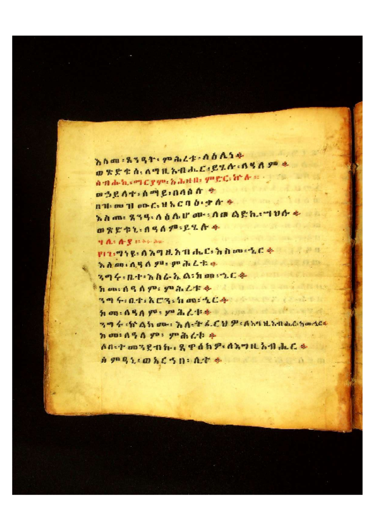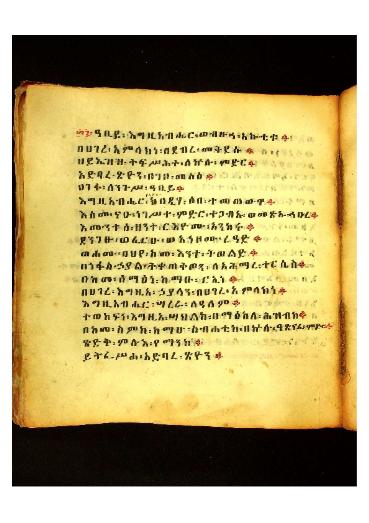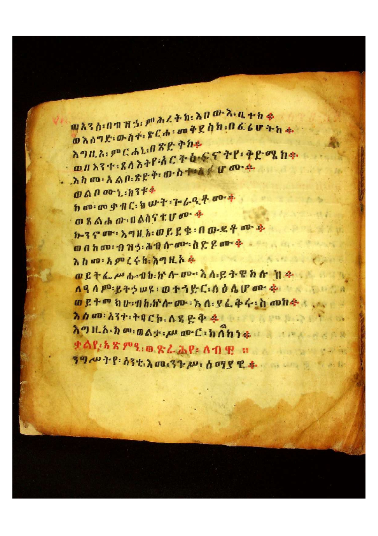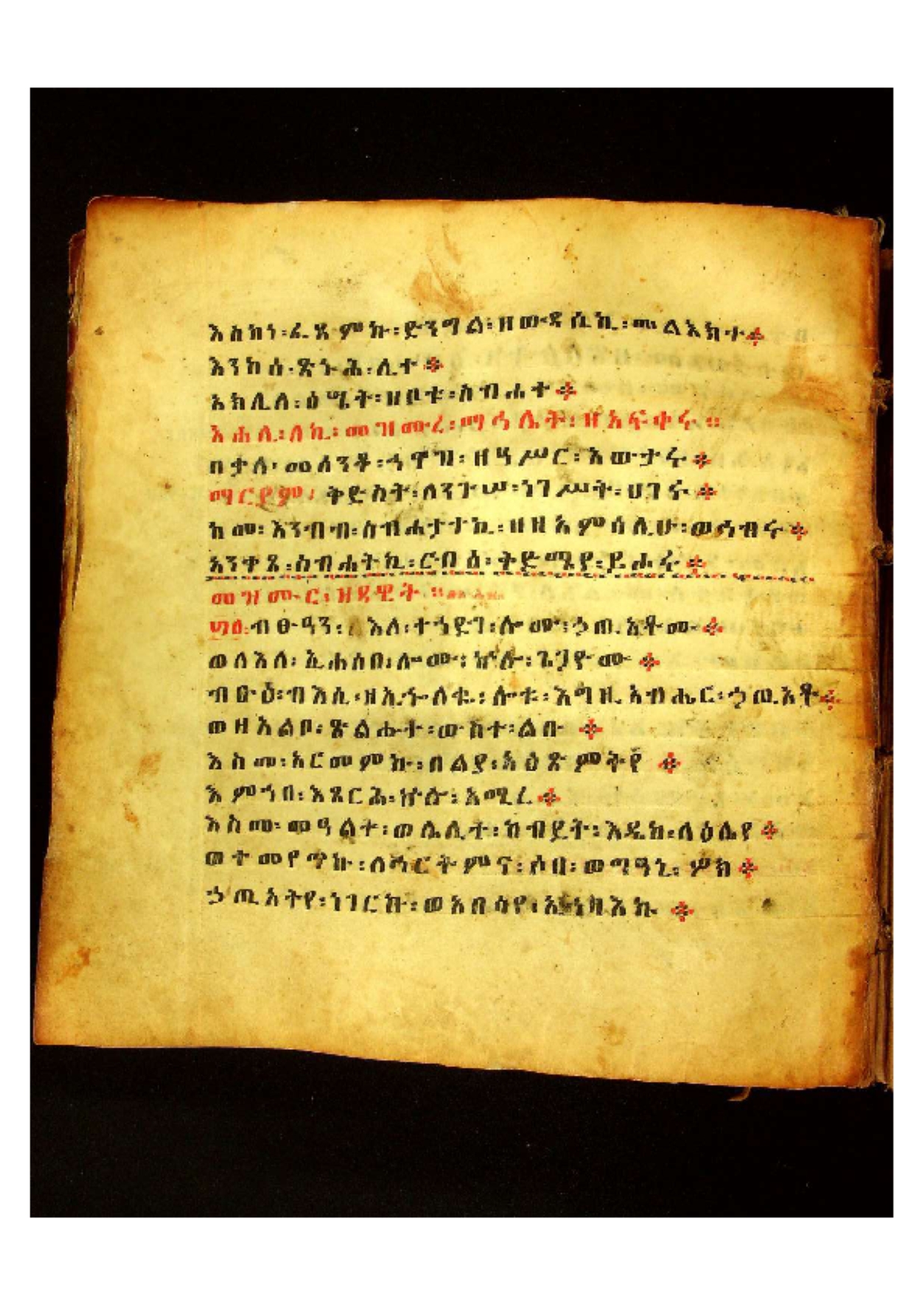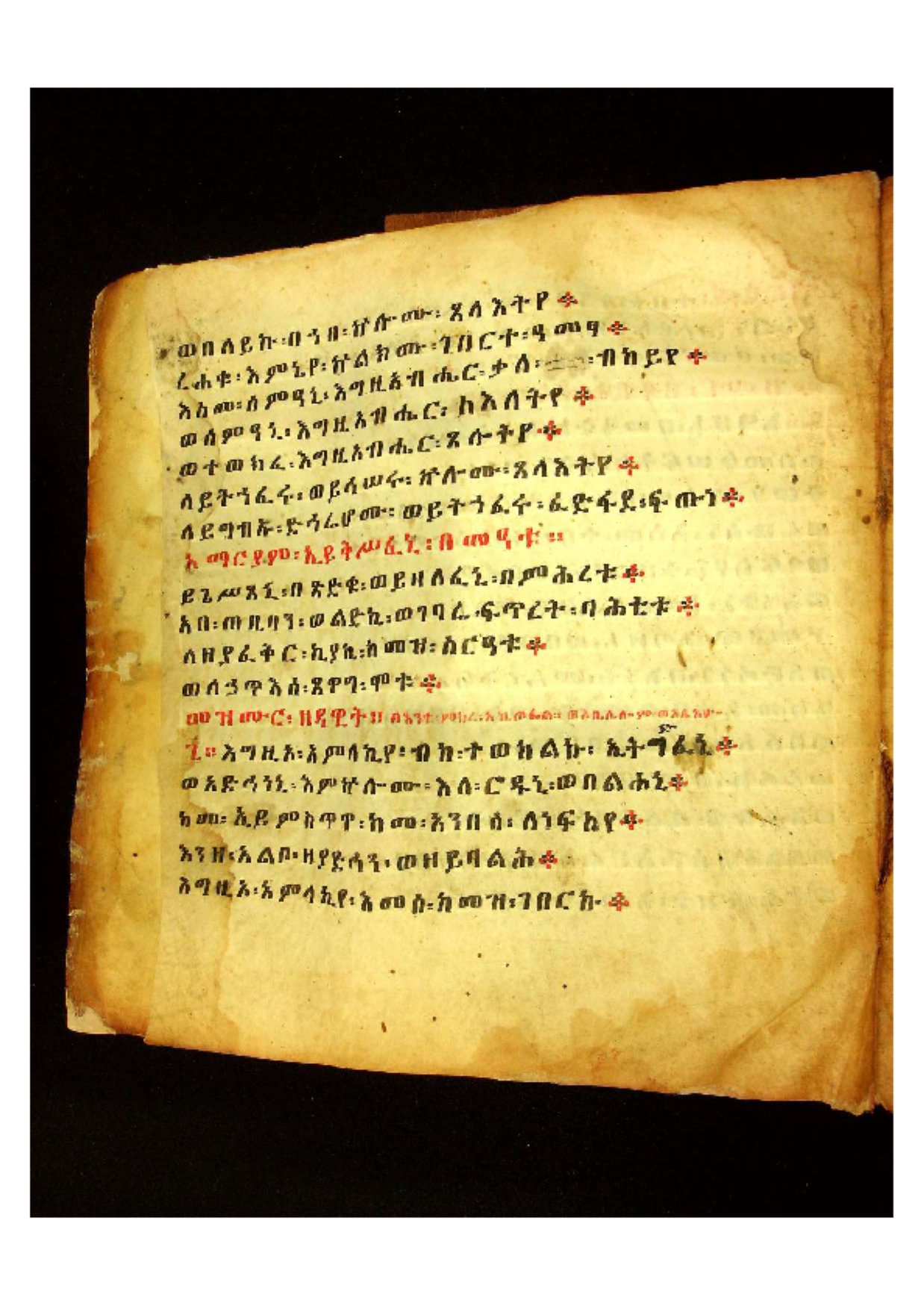 1. F. 2r: donation note written vertically in the outer margin, in black ink: “alla famiglia Bruschettini, Pussy […] Battaglia dell’Amba Aradam il 16 febbraio 1936 XIV”. The note, written in Italian and partly illegible, indicates the Bruschettini family as the receiver of the book and mentions the Battle of Amba Aradam, which took place on 16 February 1936. 2. F. 5r: note written in Italian in the outer upper margin, in red pencil: “Amba Aradam 16/2/XIV ore 17.30 P. Paloboni (?)”. This note also mentions the Battle of Amba Aradam, together with an individual whose name is partially unclear (P. Paloboni?). 3. F. 173v: supplication note written in small script in a mediocre hand, at the end of the “Psalms of David”: ዕቀበኒ፡ እምዓይነ፡ ደዌ፡ ወሞት፡ ለገብርከ፡ ደቅስዮስ፡, “protect me, your servant Däqsəyos, from the eye of infirmity and death”. The note mentions a certain Däqsəyos, indicated as “your servant” (possibly a later owner of the codex). 4. F. 173v: incipit of the Gəʿəz and Amharic prayer, perhaps a writing exercise. The note is written in an inaccurate calligraphy on the outer margin of the folio, next to the prayer. The entire text is የህፂ፡ ኖኅን፡ ከማየ[፡] አይኅ። እስራኤልን፡ ከፈርዖን፡ ዳዊትን፡ ከሳኦል፡ ከኢሎፍሊ። ኤ. 5. F. 190v: donation note, written in black ink in a mediocre hand. Text: ዝመጽሐፍ፡ ዘደብተራ፡ ኪሮስ፡ ዘወሀቦ፡ ለታቦተ፡ ሚካኤል፡ ኢትርስዑኒ፡ በአቡነ፡ ዘበሰማያት፡ ዘአቡየ፡ ገብረ፡ ማርያም፡ ወለእምየ፡ ወለተ፡ ሩፋኤል፡, “This book belongs to däbtära Kiros, who donated it to the tabot of [the church of St] Michael. Do not forget me for our Father who is in heaven. [It also belongs] to my father Gäbrä Maryam and my mother Wälättä Rufaʾel”. 6. F. 199v: writings executed in an inaccurate hand, perhaps the same of note 4. The note includes pen trials (ፈቲነ፡ ብርዕ፡ ዘፈረና፡ etc.), reproduces the explicit of the “Song of the songs” (ስብሐታተኪ፡ ማርያም፡ ከመ፡ እንተ፡ ሕልቀት፡ etc.) and the incipit of the “Praise of Mary” (ውዳሴ፡ ዘሰኑይ፡ ፈቀደ፡ እግዚእ፡ etc., partly rubricated). The writings also mention Däqsəyos, indicated as “your servant” (possibly a later owner of the codex) 7. F. 220ra–va: Genealogic note written on two columns. The note illustrates the family tree of King Yoḥannǝs I, who reigned from 1667 to 1682. The text is acephalous. Incipit: [ወለ]ደ፡ እምሐና፡ ብእሲቱ፡ አሦተ፡ ቅዱሳንሃ፡ ወአሦተ፡ ቅዱሳንኒ፡ እምነ፡ ጳውሊ፡ ብእሲሃ፡ ወለደቶሙ፡ ለአቤተኁን፡ ማእምሮ፡ ወለዘሥላሴ፡ ወአቤተኁን፡ ማእምሮኒ፡ ወለደ፡ አቃርዮስ፡ ወአቃርዮስኒ፡ ወለደ፡ እመቤት፡ እኅተ፡ ክርስቶስሃ፡. The text is published and translated in Proverbio D.V., 2000, ‘Inventario sommario dei manoscritti arabi, ebraici, etiopici – con notizia dei turchi – conservati presso la Biblioteca della Badia di Grottaferrata’. Atti della Accademia nazionale dei Lincei, Memorie, Classe di scienze morali, storiche e filologiche, serie IX, 12 (2000), 468–570 (here pp. 496–97, Appendice III). 8. F. 220va–b: Protective prayer against snakes, written on two columns. Incipit: በስመ፡ አብ፡ … ጸሎት፡ በእንተ፡ ዓርዌ፡ ምድር። ሶበ፡ በጽሐ፡ መልእክት፡ ሐሰውከ፡ በል፡ ፫ጊዜ፡ አኂዘከ፡ ዘፈረ፡ ልብሰ፡ ለእመ፡ ሀሎ፡ ርሑቀ፡ አስትዮ፡. The prayer is probably written in the same hand of note 7. 9. F. 220vb: Unidentified magic prayer containing asmat-names. Incipit: በስመ፡ አብ፡ … ኦላዘላህም፡ አህጉረ፡ ቀዳ[.]፡ ፍሖም፡ ሊስ፡ አፍሊስ፡ ምልክዮስ፡ ዘ[..]ማኤል፡ በዝንቱ፡ አስማቲከ፡ [.]ጽ[..] ኃይለ፡ በረድ፡ ወነፋስ፡ ከማሁ፡. |
