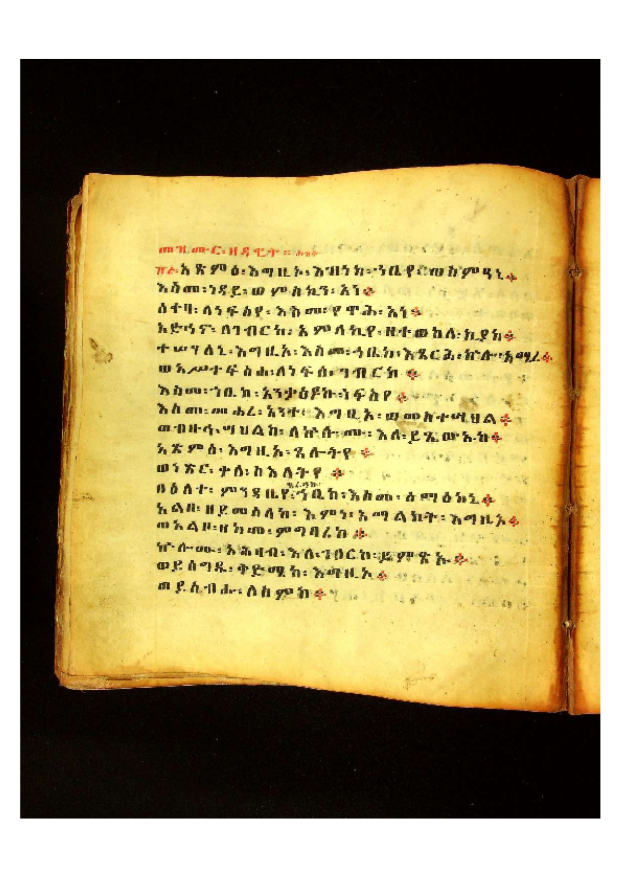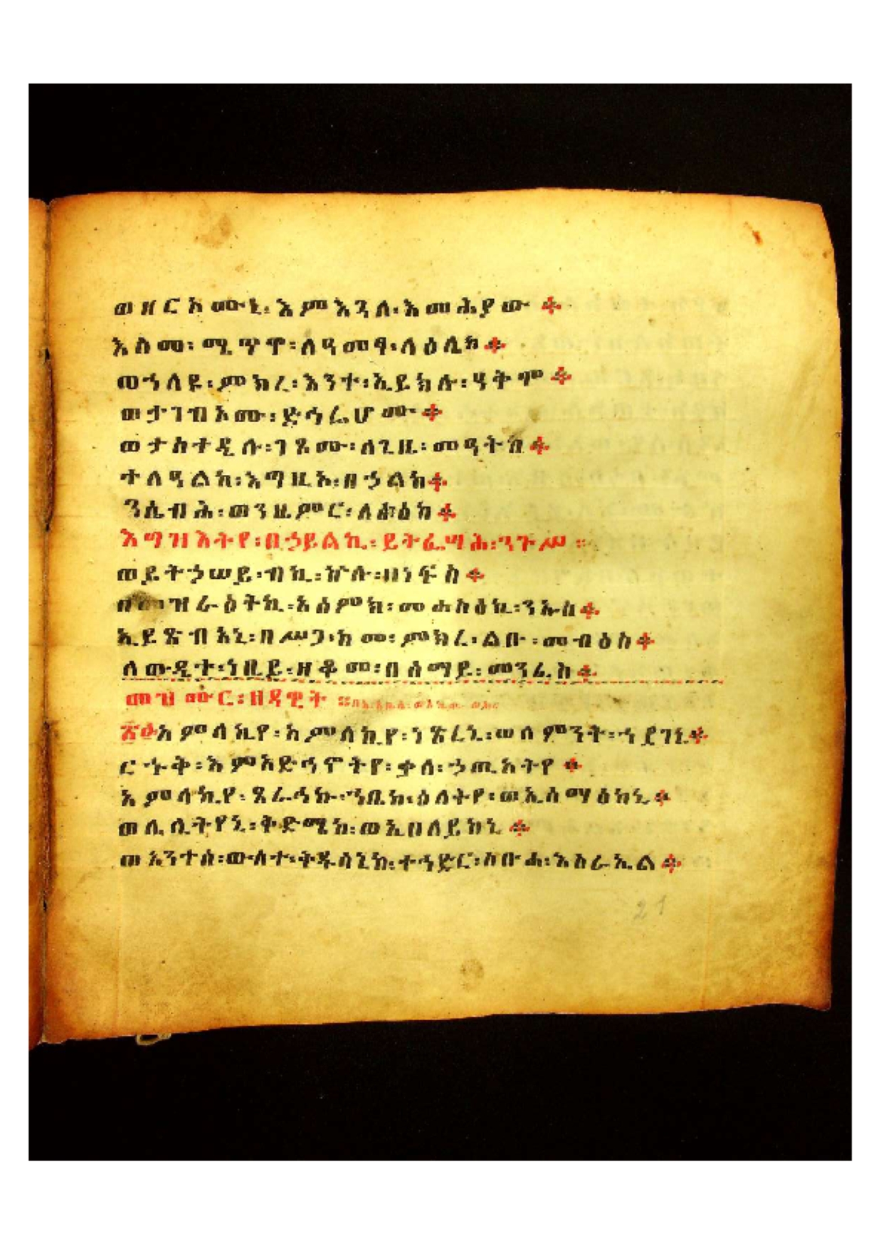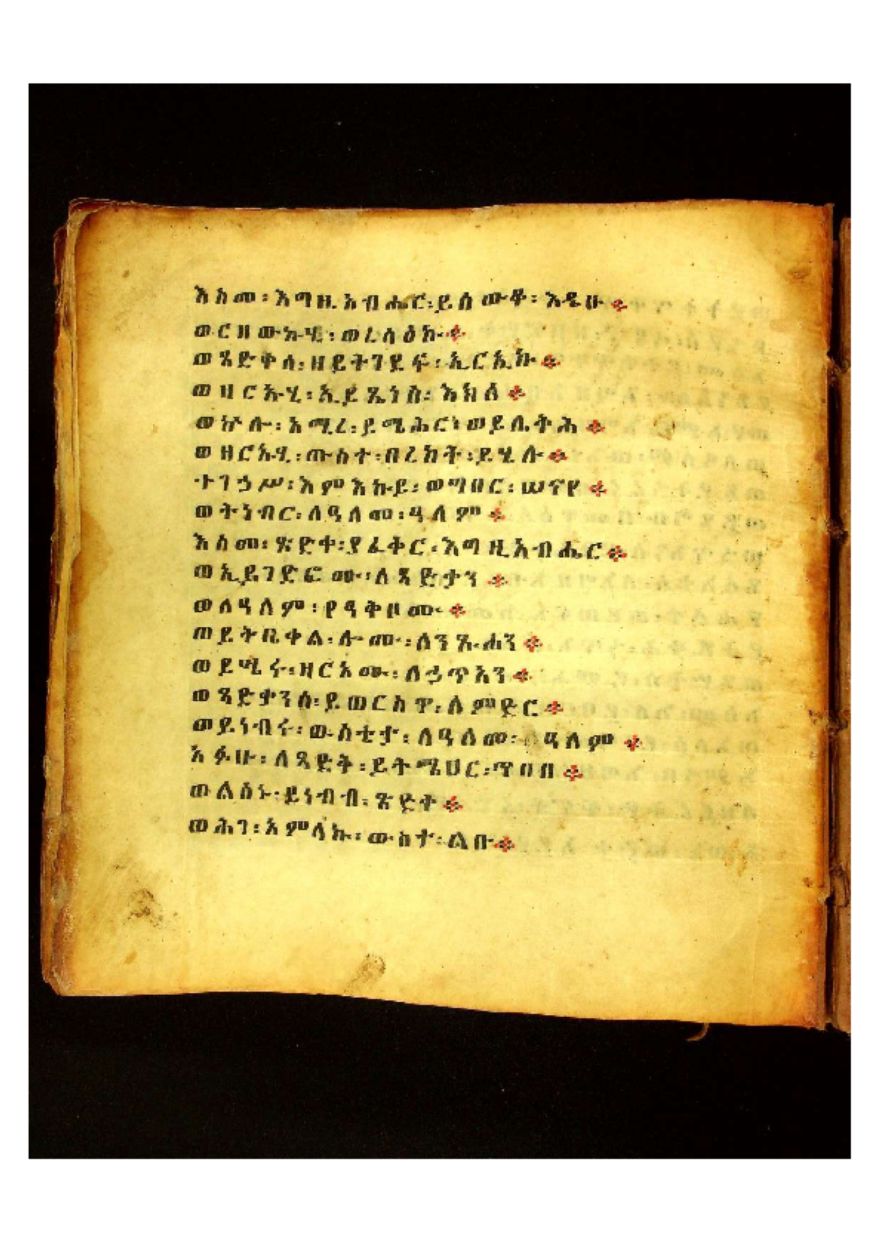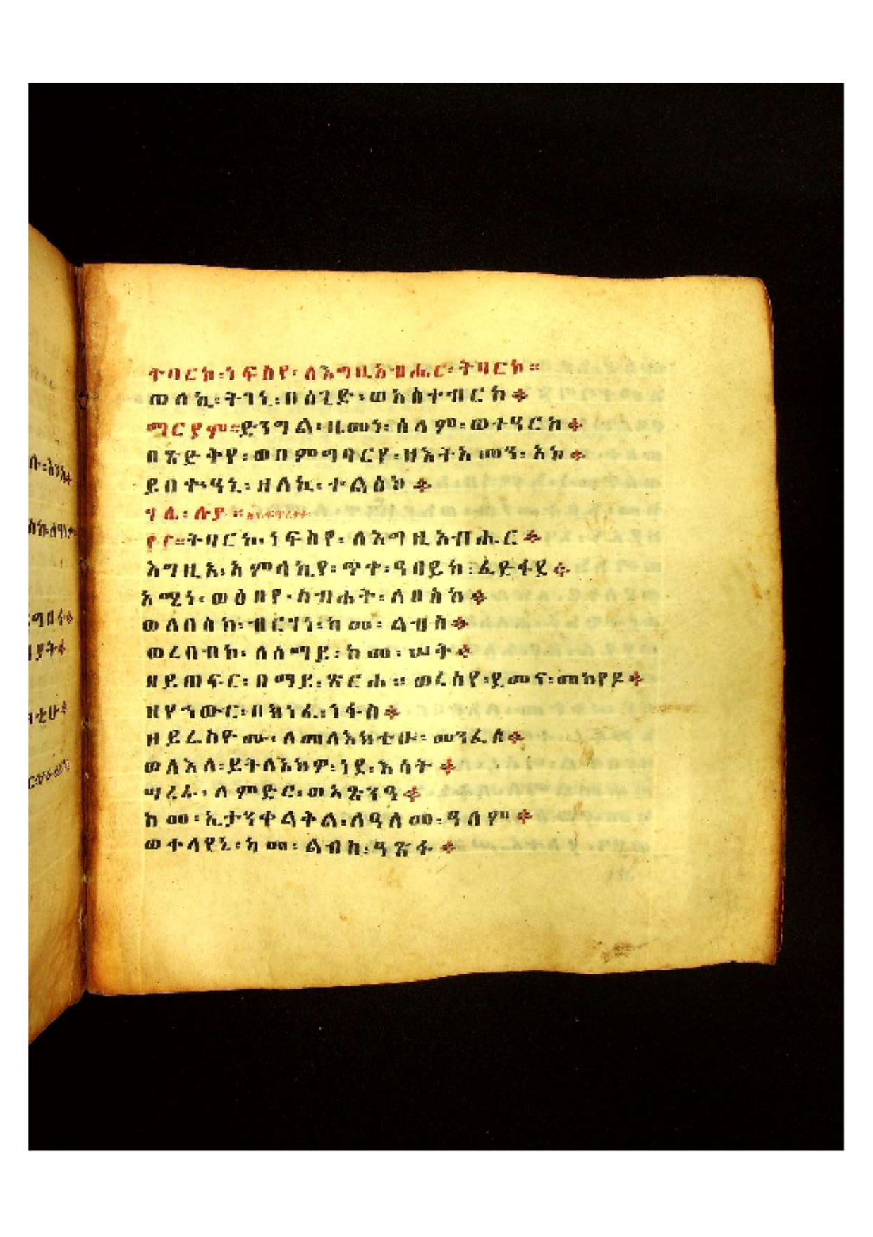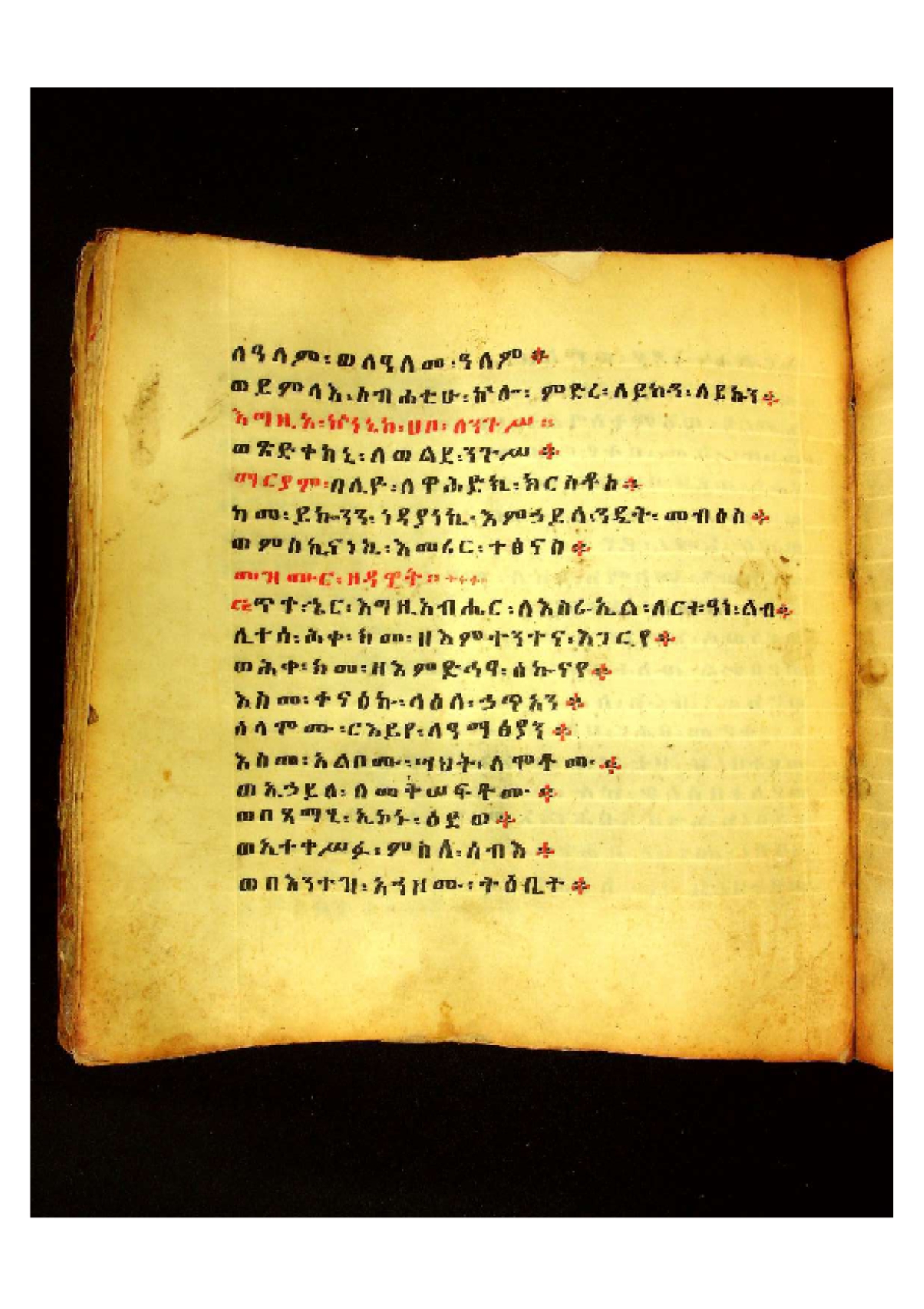 1. F. 2r: donation note written vertically in the outer margin, in black ink: “alla famiglia Bruschettini, Pussy […] Battaglia dell’Amba Aradam il 16 febbraio 1936 XIV”. The note, written in Italian and partly illegible, indicates the Bruschettini family as the receiver of the book and mentions the Battle of Amba Aradam, which took place on 16 February 1936. 2. F. 5r: note written in Italian in the outer upper margin, in red pencil: “Amba Aradam 16/2/XIV ore 17.30 P. Paloboni (?)”. This note also mentions the Battle of Amba Aradam, together with an individual whose name is partially unclear (P. Paloboni?). 3. F. 173v: supplication note written in small script in a mediocre hand, at the end of the “Psalms of David”: ዕቀበኒ፡ እምዓይነ፡ ደዌ፡ ወሞት፡ ለገብርከ፡ ደቅስዮስ፡, “protect me, your servant Däqsəyos, from the eye of infirmity and death”. The note mentions a certain Däqsəyos, indicated as “your servant” (possibly a later owner of the codex). 4. F. 173v: incipit of the Gəʿəz and Amharic prayer, perhaps a writing exercise. The note is written in an inaccurate calligraphy on the outer margin of the folio, next to the prayer. The entire text is የህፂ፡ ኖኅን፡ ከማየ[፡] አይኅ። እስራኤልን፡ ከፈርዖን፡ ዳዊትን፡ ከሳኦል፡ ከኢሎፍሊ። ኤ. 5. F. 190v: donation note, written in black ink in a mediocre hand. Text: ዝመጽሐፍ፡ ዘደብተራ፡ ኪሮስ፡ ዘወሀቦ፡ ለታቦተ፡ ሚካኤል፡ ኢትርስዑኒ፡ በአቡነ፡ ዘበሰማያት፡ ዘአቡየ፡ ገብረ፡ ማርያም፡ ወለእምየ፡ ወለተ፡ ሩፋኤል፡, “This book belongs to däbtära Kiros, who donated it to the tabot of [the church of St] Michael. Do not forget me for our Father who is in heaven. [It also belongs] to my father Gäbrä Maryam and my mother Wälättä Rufaʾel”. 6. F. 199v: writings executed in an inaccurate hand, perhaps the same of note 4. The note includes pen trials (ፈቲነ፡ ብርዕ፡ ዘፈረና፡ etc.), reproduces the explicit of the “Song of the songs” (ስብሐታተኪ፡ ማርያም፡ ከመ፡ እንተ፡ ሕልቀት፡ etc.) and the incipit of the “Praise of Mary” (ውዳሴ፡ ዘሰኑይ፡ ፈቀደ፡ እግዚእ፡ etc., partly rubricated). The writings also mention Däqsəyos, indicated as “your servant” (possibly a later owner of the codex) 7. F. 220ra–va: Genealogic note written on two columns. The note illustrates the family tree of King Yoḥannǝs I, who reigned from 1667 to 1682. The text is acephalous. Incipit: [ወለ]ደ፡ እምሐና፡ ብእሲቱ፡ አሦተ፡ ቅዱሳንሃ፡ ወአሦተ፡ ቅዱሳንኒ፡ እምነ፡ ጳውሊ፡ ብእሲሃ፡ ወለደቶሙ፡ ለአቤተኁን፡ ማእምሮ፡ ወለዘሥላሴ፡ ወአቤተኁን፡ ማእምሮኒ፡ ወለደ፡ አቃርዮስ፡ ወአቃርዮስኒ፡ ወለደ፡ እመቤት፡ እኅተ፡ ክርስቶስሃ፡. The text is published and translated in Proverbio D.V., 2000, ‘Inventario sommario dei manoscritti arabi, ebraici, etiopici – con notizia dei turchi – conservati presso la Biblioteca della Badia di Grottaferrata’. Atti della Accademia nazionale dei Lincei, Memorie, Classe di scienze morali, storiche e filologiche, serie IX, 12 (2000), 468–570 (here pp. 496–97, Appendice III). 8. F. 220va–b: Protective prayer against snakes, written on two columns. Incipit: በስመ፡ አብ፡ … ጸሎት፡ በእንተ፡ ዓርዌ፡ ምድር። ሶበ፡ በጽሐ፡ መልእክት፡ ሐሰውከ፡ በል፡ ፫ጊዜ፡ አኂዘከ፡ ዘፈረ፡ ልብሰ፡ ለእመ፡ ሀሎ፡ ርሑቀ፡ አስትዮ፡. The prayer is probably written in the same hand of note 7. 9. F. 220vb: Unidentified magic prayer containing asmat-names. Incipit: በስመ፡ አብ፡ … ኦላዘላህም፡ አህጉረ፡ ቀዳ[.]፡ ፍሖም፡ ሊስ፡ አፍሊስ፡ ምልክዮስ፡ ዘ[..]ማኤል፡ በዝንቱ፡ አስማቲከ፡ [.]ጽ[..] ኃይለ፡ በረድ፡ ወነፋስ፡ ከማሁ፡. |
