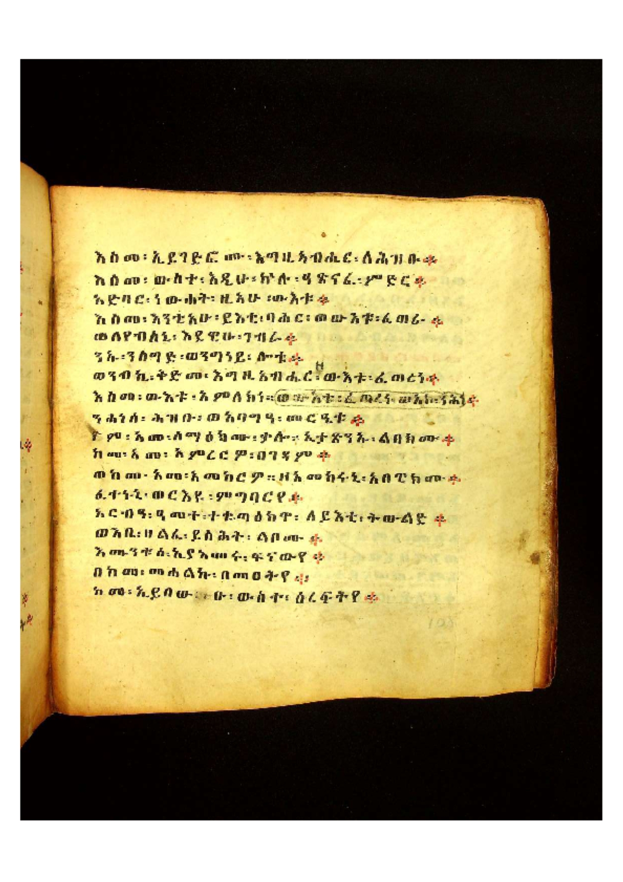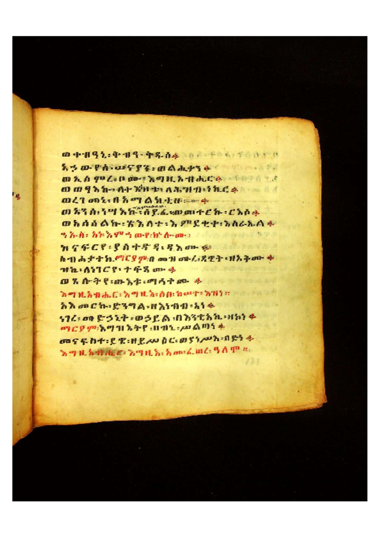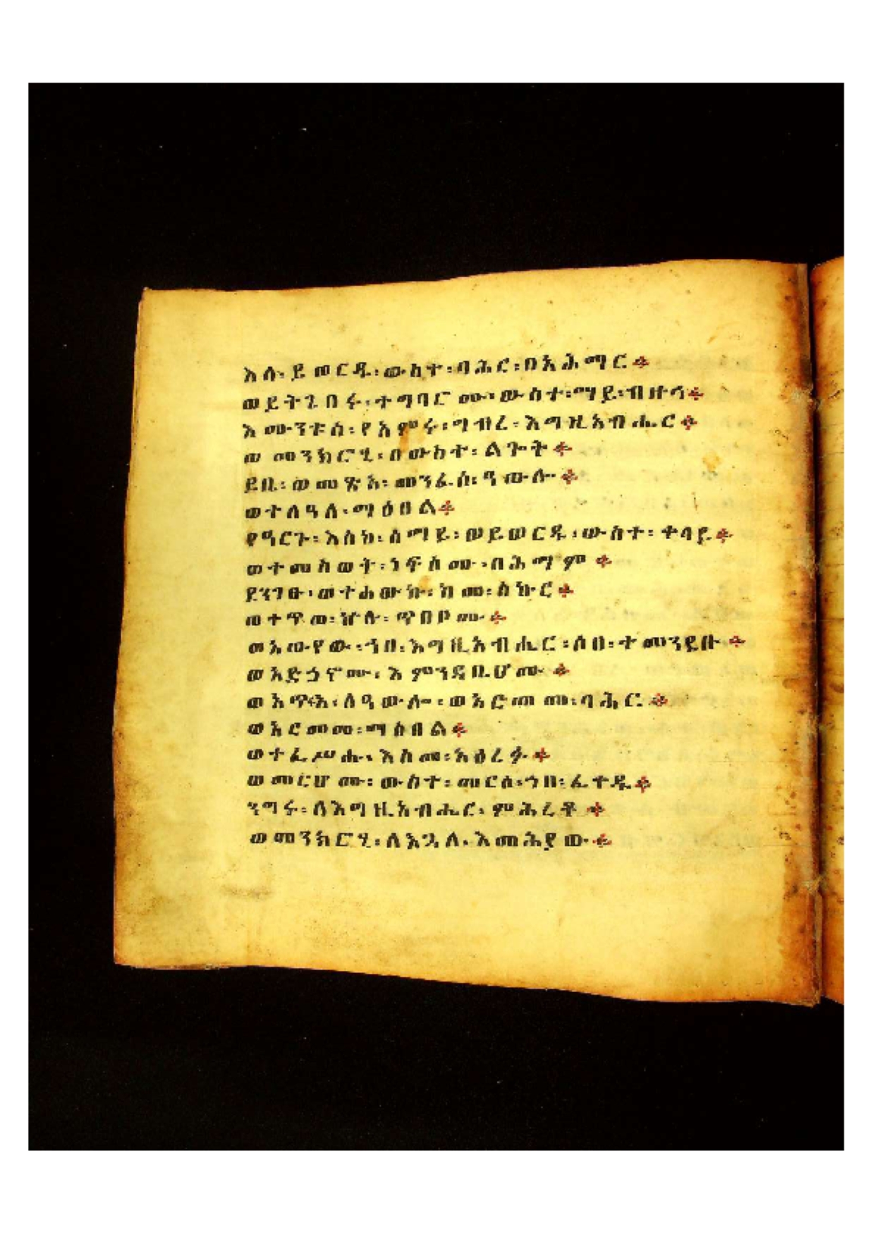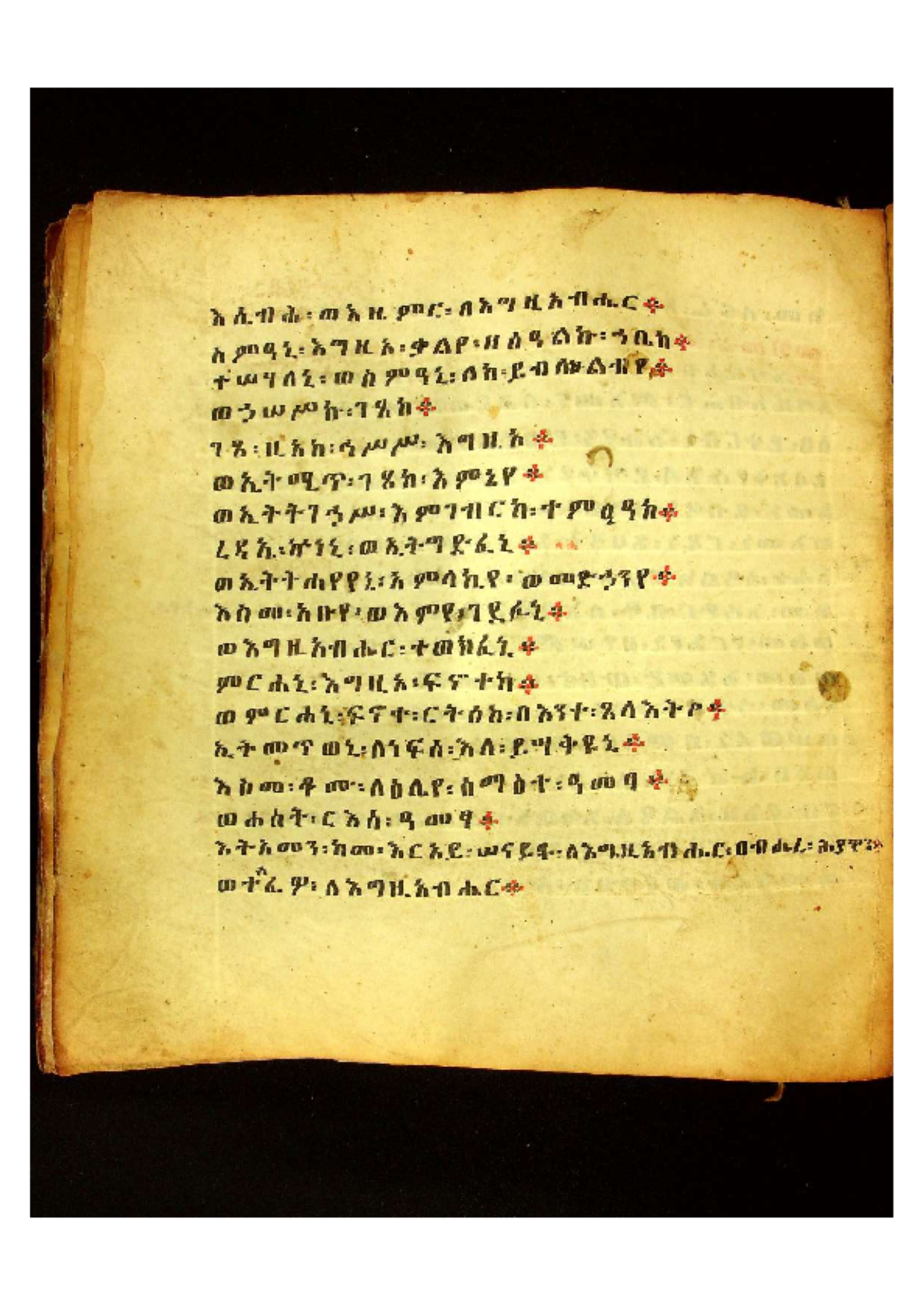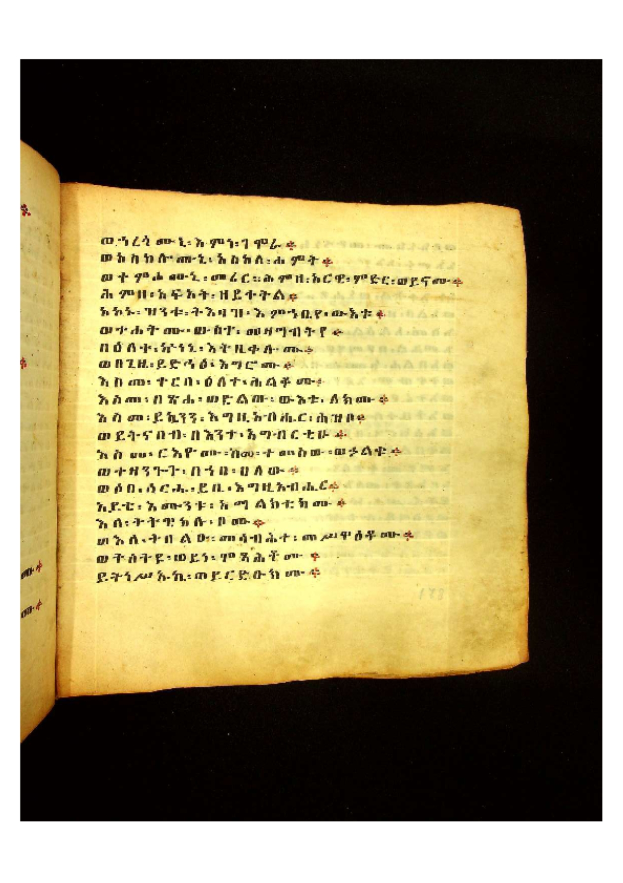 1. F. 2r: donation note written vertically in the outer margin, in black ink: “alla famiglia Bruschettini, Pussy […] Battaglia dell’Amba Aradam il 16 febbraio 1936 XIV”. The note, written in Italian and partly illegible, indicates the Bruschettini family as the receiver of the book and mentions the Battle of Amba Aradam, which took place on 16 February 1936. 2. F. 5r: note written in Italian in the outer upper margin, in red pencil: “Amba Aradam 16/2/XIV ore 17.30 P. Paloboni (?)”. This note also mentions the Battle of Amba Aradam, together with an individual whose name is partially unclear (P. Paloboni?). 3. F. 173v: supplication note written in small script in a mediocre hand, at the end of the “Psalms of David”: ዕቀበኒ፡ እምዓይነ፡ ደዌ፡ ወሞት፡ ለገብርከ፡ ደቅስዮስ፡, “protect me, your servant Däqsəyos, from the eye of infirmity and death”. The note mentions a certain Däqsəyos, indicated as “your servant” (possibly a later owner of the codex). 4. F. 173v: incipit of the Gəʿəz and Amharic prayer, perhaps a writing exercise. The note is written in an inaccurate calligraphy on the outer margin of the folio, next to the prayer. The entire text is የህፂ፡ ኖኅን፡ ከማየ[፡] አይኅ። እስራኤልን፡ ከፈርዖን፡ ዳዊትን፡ ከሳኦል፡ ከኢሎፍሊ። ኤ. 5. F. 190v: donation note, written in black ink in a mediocre hand. Text: ዝመጽሐፍ፡ ዘደብተራ፡ ኪሮስ፡ ዘወሀቦ፡ ለታቦተ፡ ሚካኤል፡ ኢትርስዑኒ፡ በአቡነ፡ ዘበሰማያት፡ ዘአቡየ፡ ገብረ፡ ማርያም፡ ወለእምየ፡ ወለተ፡ ሩፋኤል፡, “This book belongs to däbtära Kiros, who donated it to the tabot of [the church of St] Michael. Do not forget me for our Father who is in heaven. [It also belongs] to my father Gäbrä Maryam and my mother Wälättä Rufaʾel”. 6. F. 199v: writings executed in an inaccurate hand, perhaps the same of note 4. The note includes pen trials (ፈቲነ፡ ብርዕ፡ ዘፈረና፡ etc.), reproduces the explicit of the “Song of the songs” (ስብሐታተኪ፡ ማርያም፡ ከመ፡ እንተ፡ ሕልቀት፡ etc.) and the incipit of the “Praise of Mary” (ውዳሴ፡ ዘሰኑይ፡ ፈቀደ፡ እግዚእ፡ etc., partly rubricated). The writings also mention Däqsəyos, indicated as “your servant” (possibly a later owner of the codex) 7. F. 220ra–va: Genealogic note written on two columns. The note illustrates the family tree of King Yoḥannǝs I, who reigned from 1667 to 1682. The text is acephalous. Incipit: [ወለ]ደ፡ እምሐና፡ ብእሲቱ፡ አሦተ፡ ቅዱሳንሃ፡ ወአሦተ፡ ቅዱሳንኒ፡ እምነ፡ ጳውሊ፡ ብእሲሃ፡ ወለደቶሙ፡ ለአቤተኁን፡ ማእምሮ፡ ወለዘሥላሴ፡ ወአቤተኁን፡ ማእምሮኒ፡ ወለደ፡ አቃርዮስ፡ ወአቃርዮስኒ፡ ወለደ፡ እመቤት፡ እኅተ፡ ክርስቶስሃ፡. The text is published and translated in Proverbio D.V., 2000, ‘Inventario sommario dei manoscritti arabi, ebraici, etiopici – con notizia dei turchi – conservati presso la Biblioteca della Badia di Grottaferrata’. Atti della Accademia nazionale dei Lincei, Memorie, Classe di scienze morali, storiche e filologiche, serie IX, 12 (2000), 468–570 (here pp. 496–97, Appendice III). 8. F. 220va–b: Protective prayer against snakes, written on two columns. Incipit: በስመ፡ አብ፡ … ጸሎት፡ በእንተ፡ ዓርዌ፡ ምድር። ሶበ፡ በጽሐ፡ መልእክት፡ ሐሰውከ፡ በል፡ ፫ጊዜ፡ አኂዘከ፡ ዘፈረ፡ ልብሰ፡ ለእመ፡ ሀሎ፡ ርሑቀ፡ አስትዮ፡. The prayer is probably written in the same hand of note 7. 9. F. 220vb: Unidentified magic prayer containing asmat-names. Incipit: በስመ፡ አብ፡ … ኦላዘላህም፡ አህጉረ፡ ቀዳ[.]፡ ፍሖም፡ ሊስ፡ አፍሊስ፡ ምልክዮስ፡ ዘ[..]ማኤል፡ በዝንቱ፡ አስማቲከ፡ [.]ጽ[..] ኃይለ፡ በረድ፡ ወነፋስ፡ ከማሁ፡. |