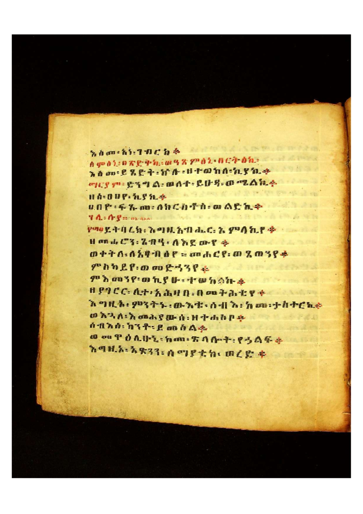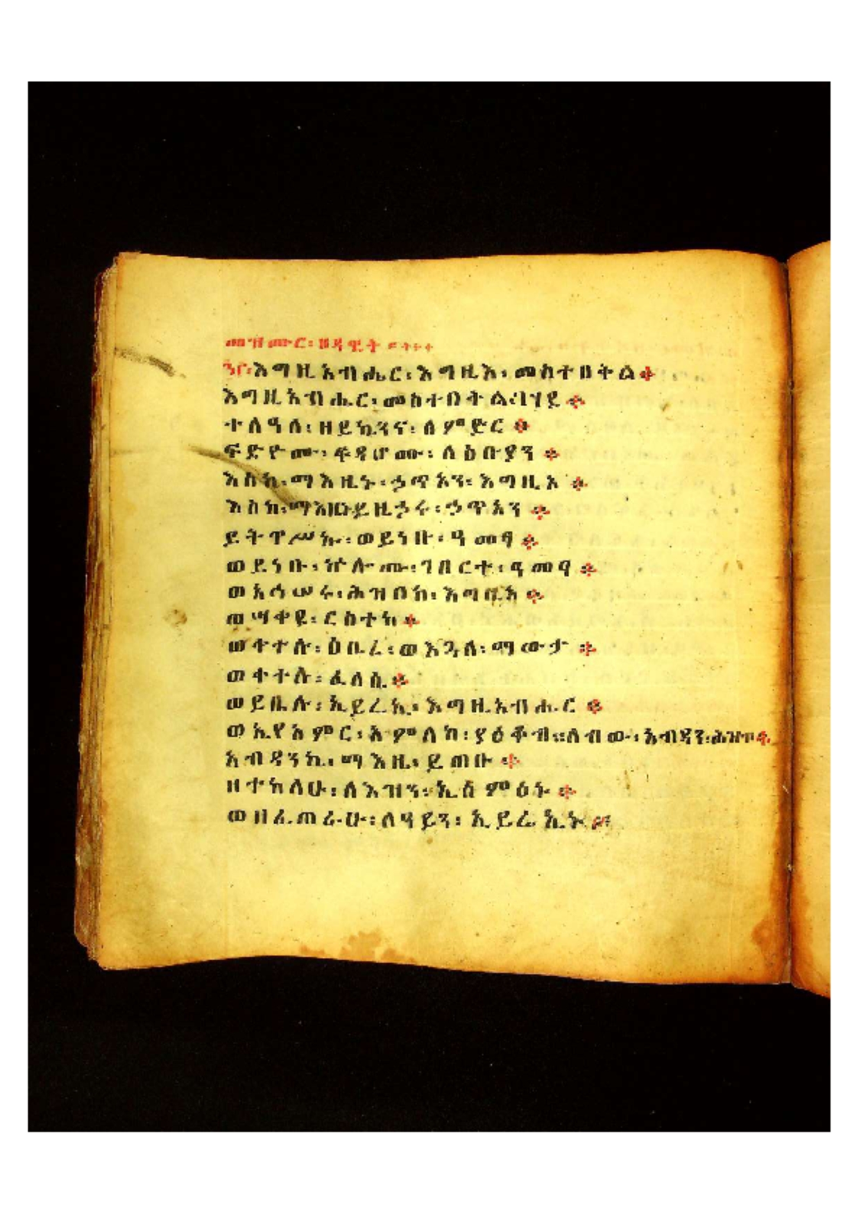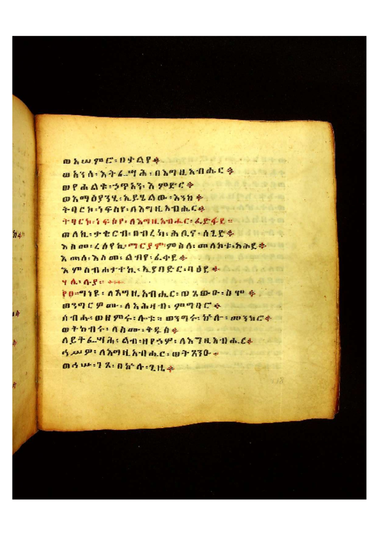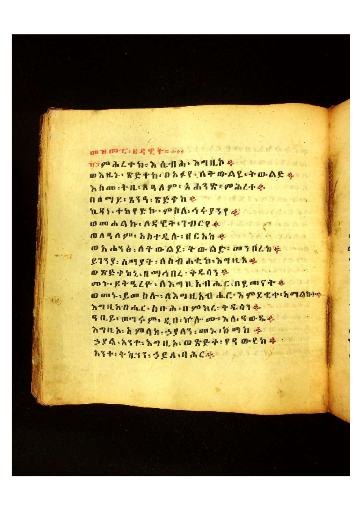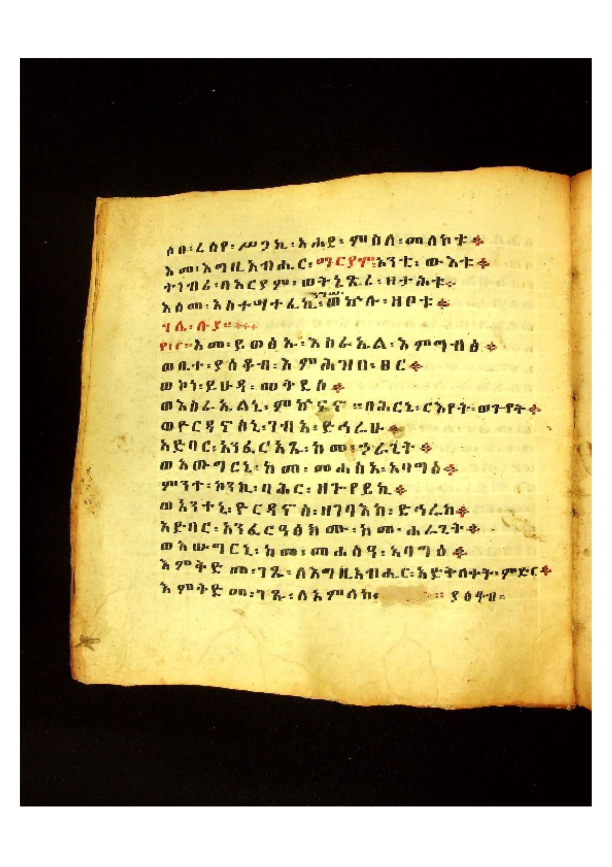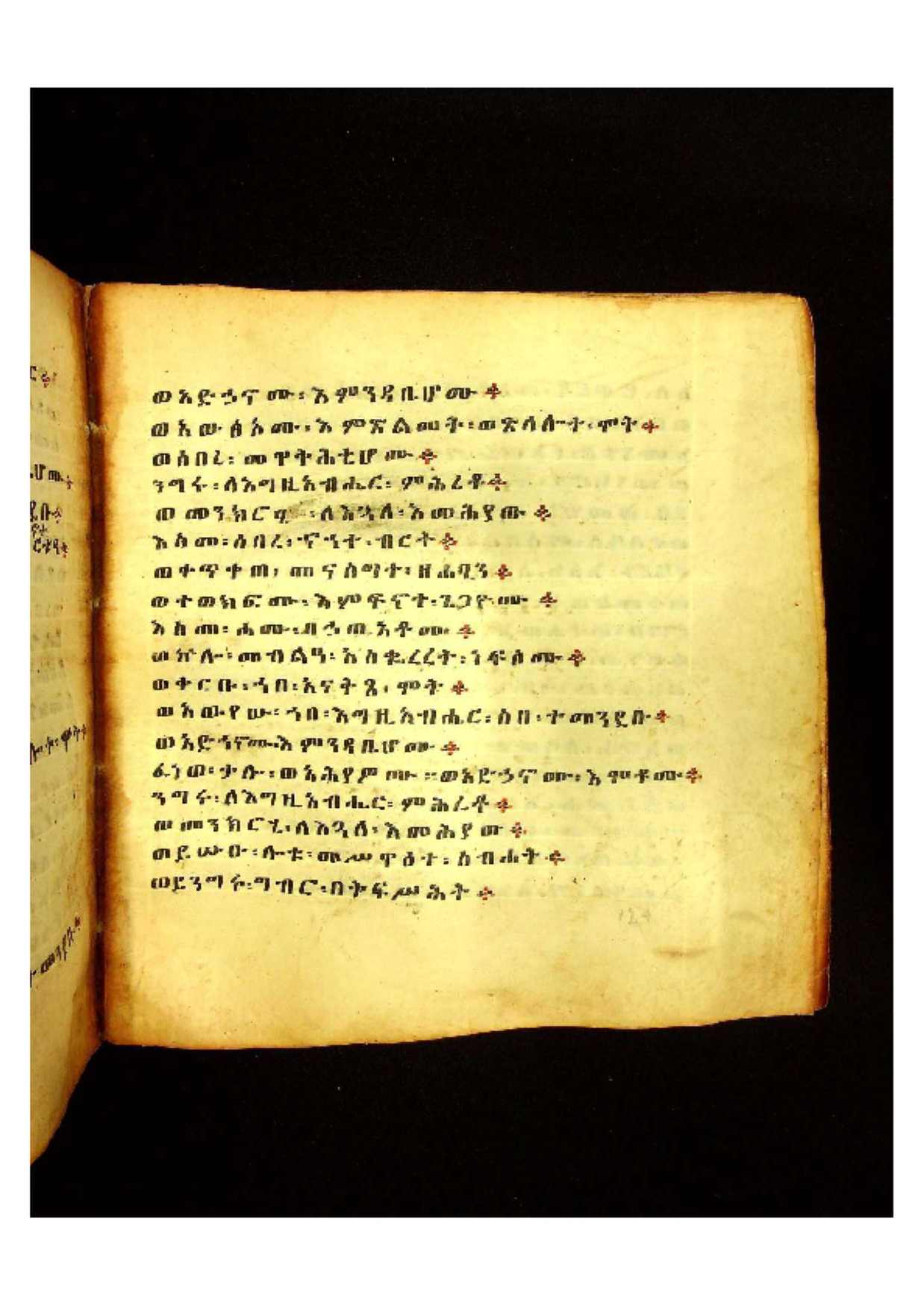 1. F. 2r: donation note written vertically in the outer margin, in black ink: “alla famiglia Bruschettini, Pussy […] Battaglia dell’Amba Aradam il 16 febbraio 1936 XIV”. The note, written in Italian and partly illegible, indicates the Bruschettini family as the receiver of the book and mentions the Battle of Amba Aradam, which took place on 16 February 1936. 2. F. 5r: note written in Italian in the outer upper margin, in red pencil: “Amba Aradam 16/2/XIV ore 17.30 P. Paloboni (?)”. This note also mentions the Battle of Amba Aradam, together with an individual whose name is partially unclear (P. Paloboni?). 3. F. 173v: supplication note written in small script in a mediocre hand, at the end of the “Psalms of David”: ዕቀበኒ፡ እምዓይነ፡ ደዌ፡ ወሞት፡ ለገብርከ፡ ደቅስዮስ፡, “protect me, your servant Däqsəyos, from the eye of infirmity and death”. The note mentions a certain Däqsəyos, indicated as “your servant” (possibly a later owner of the codex). 4. F. 173v: incipit of the Gəʿəz and Amharic prayer, perhaps a writing exercise. The note is written in an inaccurate calligraphy on the outer margin of the folio, next to the prayer. The entire text is የህፂ፡ ኖኅን፡ ከማየ[፡] አይኅ። እስራኤልን፡ ከፈርዖን፡ ዳዊትን፡ ከሳኦል፡ ከኢሎፍሊ። ኤ. 5. F. 190v: donation note, written in black ink in a mediocre hand. Text: ዝመጽሐፍ፡ ዘደብተራ፡ ኪሮስ፡ ዘወሀቦ፡ ለታቦተ፡ ሚካኤል፡ ኢትርስዑኒ፡ በአቡነ፡ ዘበሰማያት፡ ዘአቡየ፡ ገብረ፡ ማርያም፡ ወለእምየ፡ ወለተ፡ ሩፋኤል፡, “This book belongs to däbtära Kiros, who donated it to the tabot of [the church of St] Michael. Do not forget me for our Father who is in heaven. [It also belongs] to my father Gäbrä Maryam and my mother Wälättä Rufaʾel”. 6. F. 199v: writings executed in an inaccurate hand, perhaps the same of note 4. The note includes pen trials (ፈቲነ፡ ብርዕ፡ ዘፈረና፡ etc.), reproduces the explicit of the “Song of the songs” (ስብሐታተኪ፡ ማርያም፡ ከመ፡ እንተ፡ ሕልቀት፡ etc.) and the incipit of the “Praise of Mary” (ውዳሴ፡ ዘሰኑይ፡ ፈቀደ፡ እግዚእ፡ etc., partly rubricated). The writings also mention Däqsəyos, indicated as “your servant” (possibly a later owner of the codex) 7. F. 220ra–va: Genealogic note written on two columns. The note illustrates the family tree of King Yoḥannǝs I, who reigned from 1667 to 1682. The text is acephalous. Incipit: [ወለ]ደ፡ እምሐና፡ ብእሲቱ፡ አሦተ፡ ቅዱሳንሃ፡ ወአሦተ፡ ቅዱሳንኒ፡ እምነ፡ ጳውሊ፡ ብእሲሃ፡ ወለደቶሙ፡ ለአቤተኁን፡ ማእምሮ፡ ወለዘሥላሴ፡ ወአቤተኁን፡ ማእምሮኒ፡ ወለደ፡ አቃርዮስ፡ ወአቃርዮስኒ፡ ወለደ፡ እመቤት፡ እኅተ፡ ክርስቶስሃ፡. The text is published and translated in Proverbio D.V., 2000, ‘Inventario sommario dei manoscritti arabi, ebraici, etiopici – con notizia dei turchi – conservati presso la Biblioteca della Badia di Grottaferrata’. Atti della Accademia nazionale dei Lincei, Memorie, Classe di scienze morali, storiche e filologiche, serie IX, 12 (2000), 468–570 (here pp. 496–97, Appendice III). 8. F. 220va–b: Protective prayer against snakes, written on two columns. Incipit: በስመ፡ አብ፡ … ጸሎት፡ በእንተ፡ ዓርዌ፡ ምድር። ሶበ፡ በጽሐ፡ መልእክት፡ ሐሰውከ፡ በል፡ ፫ጊዜ፡ አኂዘከ፡ ዘፈረ፡ ልብሰ፡ ለእመ፡ ሀሎ፡ ርሑቀ፡ አስትዮ፡. The prayer is probably written in the same hand of note 7. 9. F. 220vb: Unidentified magic prayer containing asmat-names. Incipit: በስመ፡ አብ፡ … ኦላዘላህም፡ አህጉረ፡ ቀዳ[.]፡ ፍሖም፡ ሊስ፡ አፍሊስ፡ ምልክዮስ፡ ዘ[..]ማኤል፡ በዝንቱ፡ አስማቲከ፡ [.]ጽ[..] ኃይለ፡ በረድ፡ ወነፋስ፡ ከማሁ፡. |