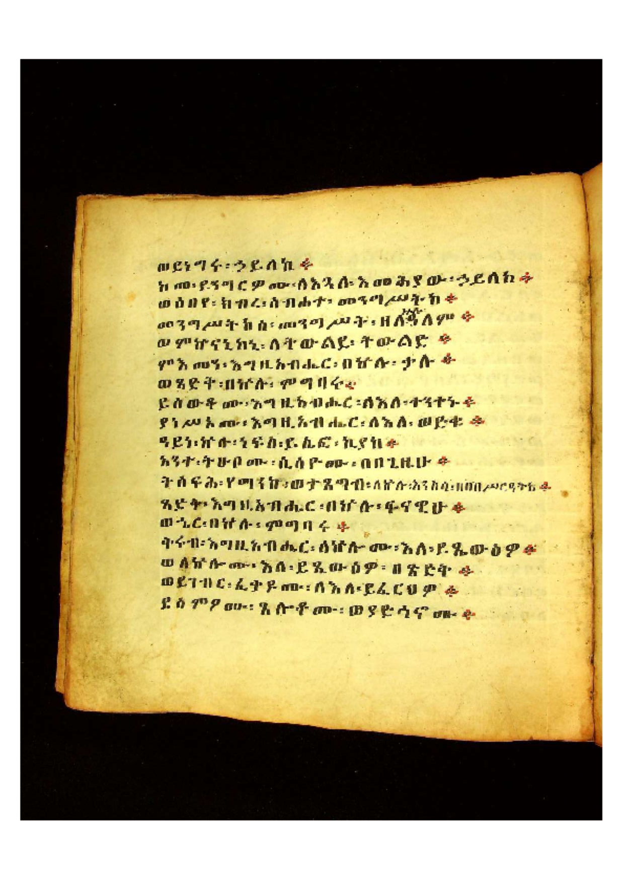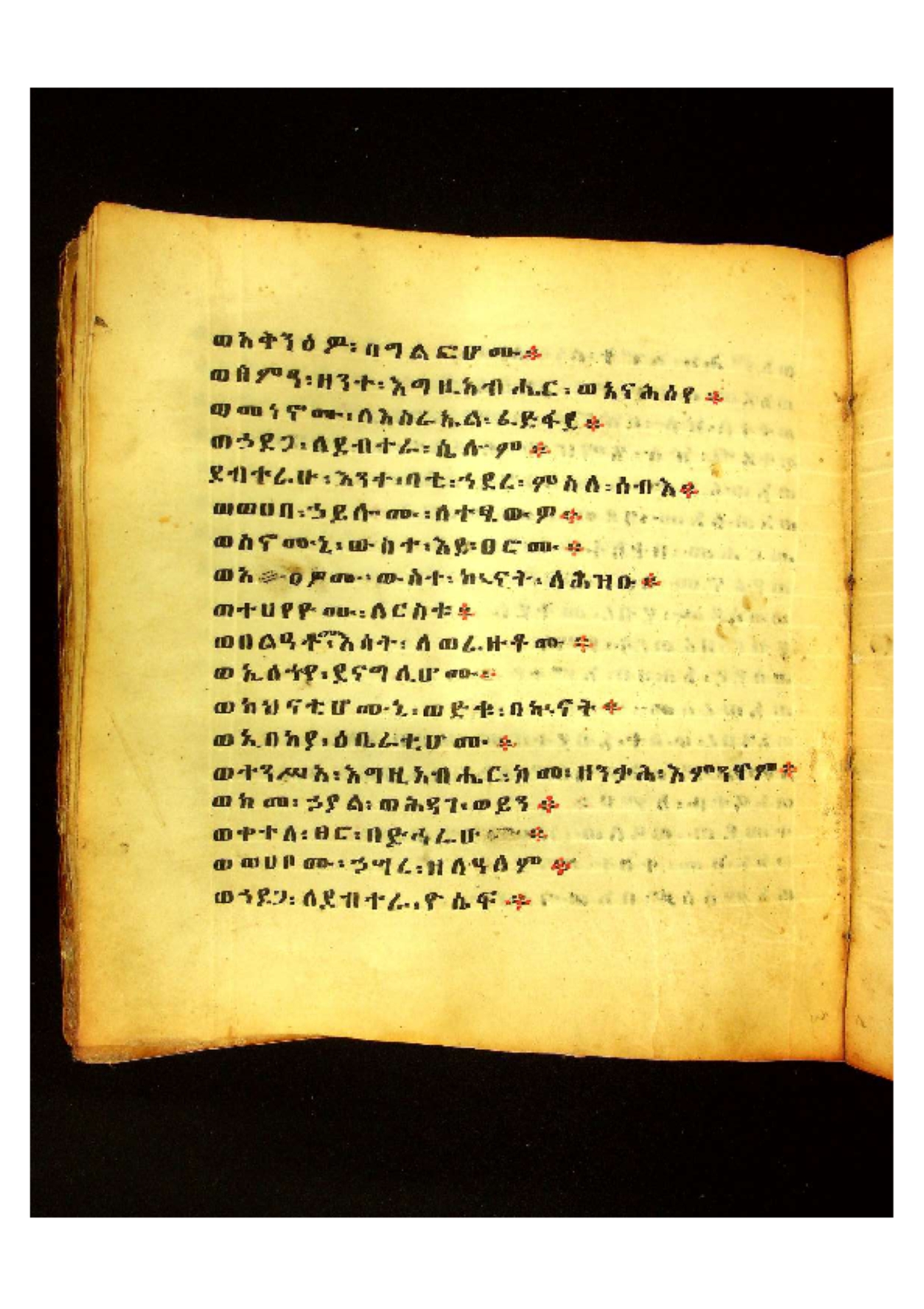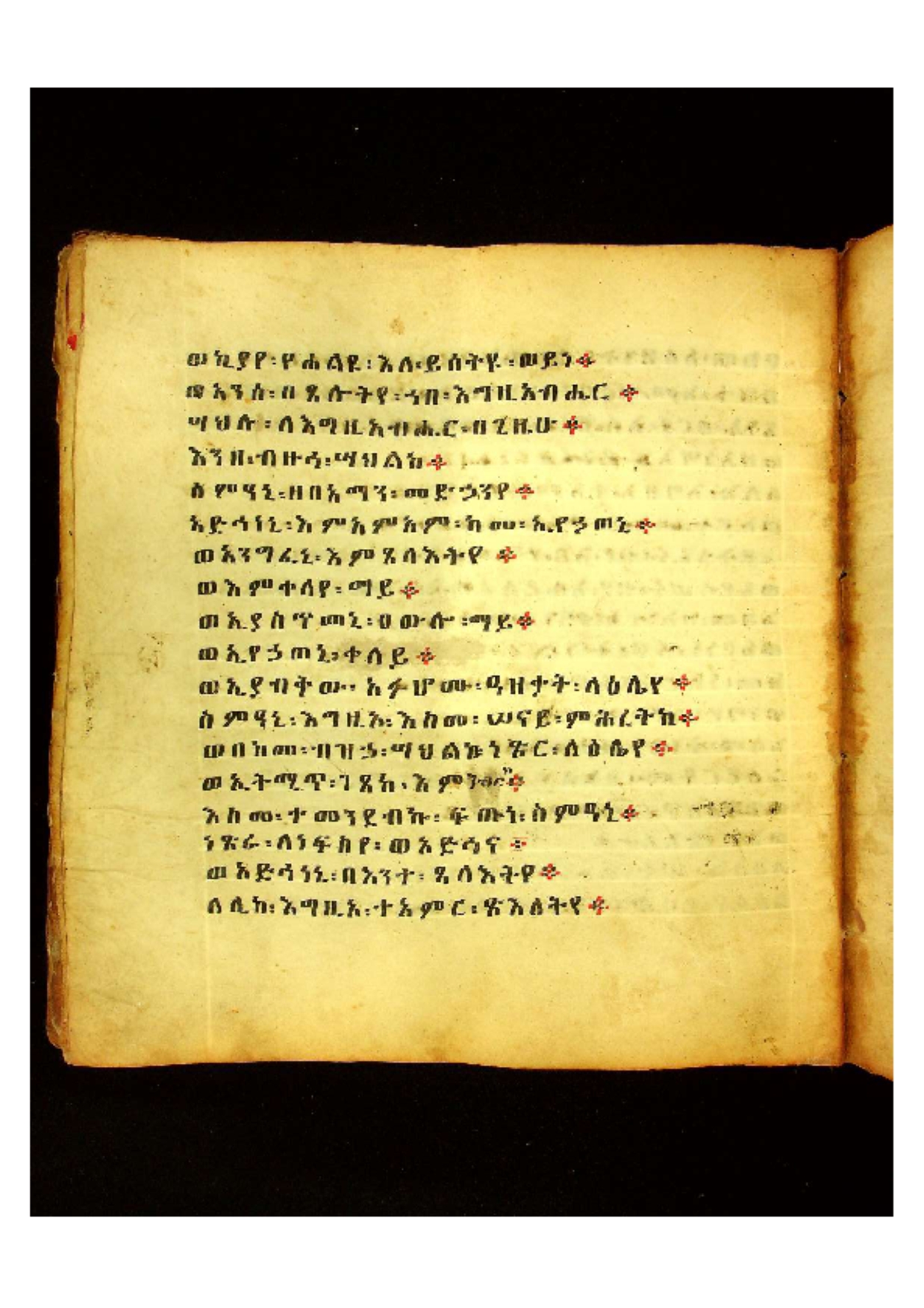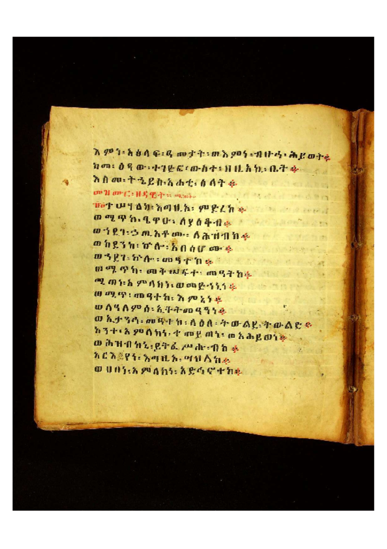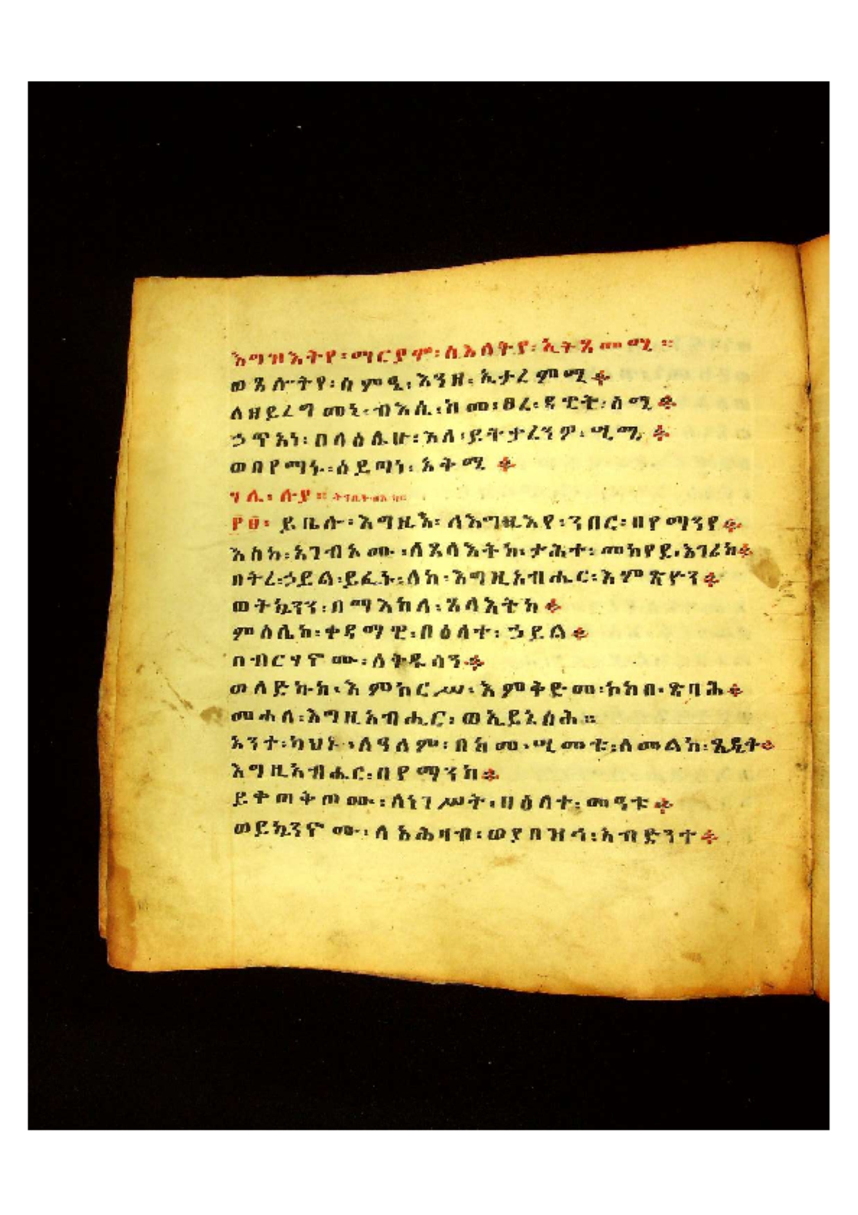 1. F. 2r: donation note written vertically in the outer margin, in black ink: “alla famiglia Bruschettini, Pussy […] Battaglia dell’Amba Aradam il 16 febbraio 1936 XIV”. The note, written in Italian and partly illegible, indicates the Bruschettini family as the receiver of the book and mentions the Battle of Amba Aradam, which took place on 16 February 1936. 2. F. 5r: note written in Italian in the outer upper margin, in red pencil: “Amba Aradam 16/2/XIV ore 17.30 P. Paloboni (?)”. This note also mentions the Battle of Amba Aradam, together with an individual whose name is partially unclear (P. Paloboni?). 3. F. 173v: supplication note written in small script in a mediocre hand, at the end of the “Psalms of David”: ዕቀበኒ፡ እምዓይነ፡ ደዌ፡ ወሞት፡ ለገብርከ፡ ደቅስዮስ፡, “protect me, your servant Däqsəyos, from the eye of infirmity and death”. The note mentions a certain Däqsəyos, indicated as “your servant” (possibly a later owner of the codex). 4. F. 173v: incipit of the Gəʿəz and Amharic prayer, perhaps a writing exercise. The note is written in an inaccurate calligraphy on the outer margin of the folio, next to the prayer. The entire text is የህፂ፡ ኖኅን፡ ከማየ[፡] አይኅ። እስራኤልን፡ ከፈርዖን፡ ዳዊትን፡ ከሳኦል፡ ከኢሎፍሊ። ኤ. 5. F. 190v: donation note, written in black ink in a mediocre hand. Text: ዝመጽሐፍ፡ ዘደብተራ፡ ኪሮስ፡ ዘወሀቦ፡ ለታቦተ፡ ሚካኤል፡ ኢትርስዑኒ፡ በአቡነ፡ ዘበሰማያት፡ ዘአቡየ፡ ገብረ፡ ማርያም፡ ወለእምየ፡ ወለተ፡ ሩፋኤል፡, “This book belongs to däbtära Kiros, who donated it to the tabot of [the church of St] Michael. Do not forget me for our Father who is in heaven. [It also belongs] to my father Gäbrä Maryam and my mother Wälättä Rufaʾel”. 6. F. 199v: writings executed in an inaccurate hand, perhaps the same of note 4. The note includes pen trials (ፈቲነ፡ ብርዕ፡ ዘፈረና፡ etc.), reproduces the explicit of the “Song of the songs” (ስብሐታተኪ፡ ማርያም፡ ከመ፡ እንተ፡ ሕልቀት፡ etc.) and the incipit of the “Praise of Mary” (ውዳሴ፡ ዘሰኑይ፡ ፈቀደ፡ እግዚእ፡ etc., partly rubricated). The writings also mention Däqsəyos, indicated as “your servant” (possibly a later owner of the codex) 7. F. 220ra–va: Genealogic note written on two columns. The note illustrates the family tree of King Yoḥannǝs I, who reigned from 1667 to 1682. The text is acephalous. Incipit: [ወለ]ደ፡ እምሐና፡ ብእሲቱ፡ አሦተ፡ ቅዱሳንሃ፡ ወአሦተ፡ ቅዱሳንኒ፡ እምነ፡ ጳውሊ፡ ብእሲሃ፡ ወለደቶሙ፡ ለአቤተኁን፡ ማእምሮ፡ ወለዘሥላሴ፡ ወአቤተኁን፡ ማእምሮኒ፡ ወለደ፡ አቃርዮስ፡ ወአቃርዮስኒ፡ ወለደ፡ እመቤት፡ እኅተ፡ ክርስቶስሃ፡. The text is published and translated in Proverbio D.V., 2000, ‘Inventario sommario dei manoscritti arabi, ebraici, etiopici – con notizia dei turchi – conservati presso la Biblioteca della Badia di Grottaferrata’. Atti della Accademia nazionale dei Lincei, Memorie, Classe di scienze morali, storiche e filologiche, serie IX, 12 (2000), 468–570 (here pp. 496–97, Appendice III). 8. F. 220va–b: Protective prayer against snakes, written on two columns. Incipit: በስመ፡ አብ፡ … ጸሎት፡ በእንተ፡ ዓርዌ፡ ምድር። ሶበ፡ በጽሐ፡ መልእክት፡ ሐሰውከ፡ በል፡ ፫ጊዜ፡ አኂዘከ፡ ዘፈረ፡ ልብሰ፡ ለእመ፡ ሀሎ፡ ርሑቀ፡ አስትዮ፡. The prayer is probably written in the same hand of note 7. 9. F. 220vb: Unidentified magic prayer containing asmat-names. Incipit: በስመ፡ አብ፡ … ኦላዘላህም፡ አህጉረ፡ ቀዳ[.]፡ ፍሖም፡ ሊስ፡ አፍሊስ፡ ምልክዮስ፡ ዘ[..]ማኤል፡ በዝንቱ፡ አስማቲከ፡ [.]ጽ[..] ኃይለ፡ በረድ፡ ወነፋስ፡ ከማሁ፡. |