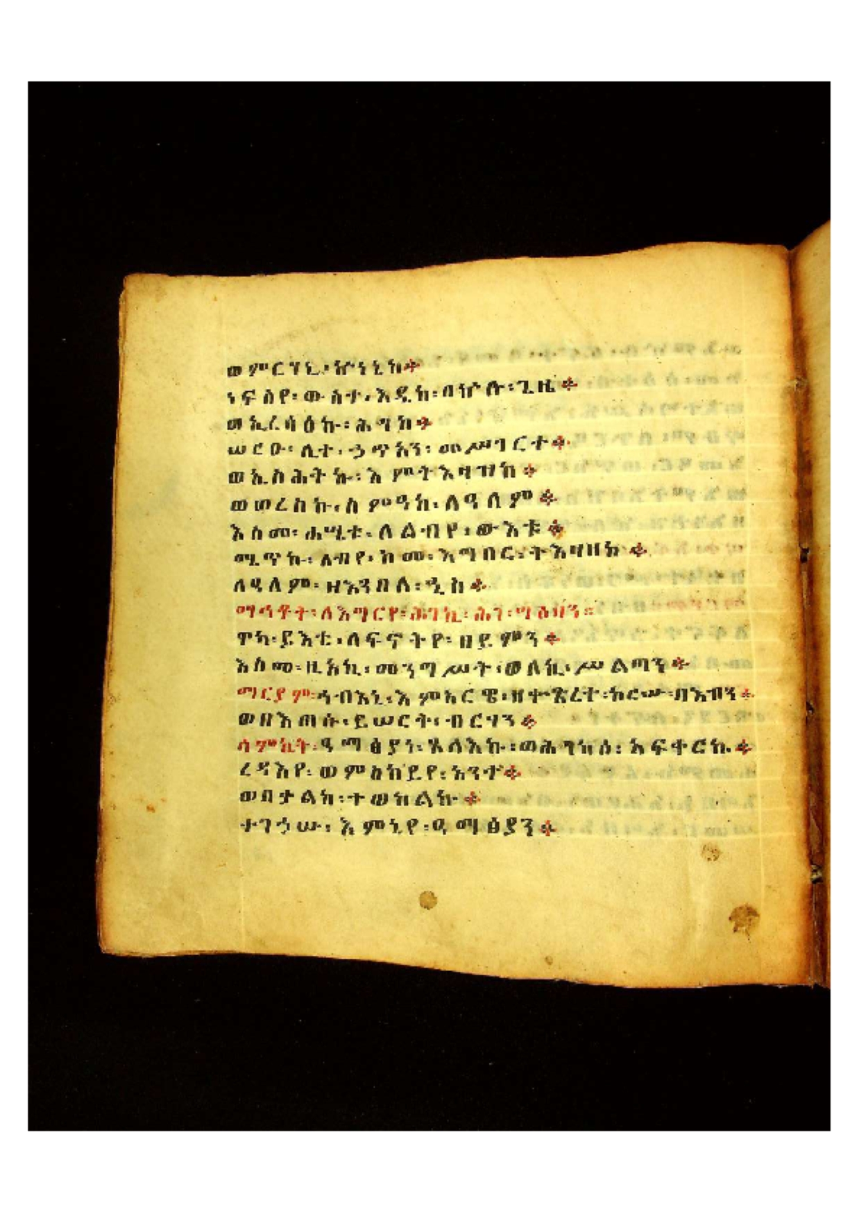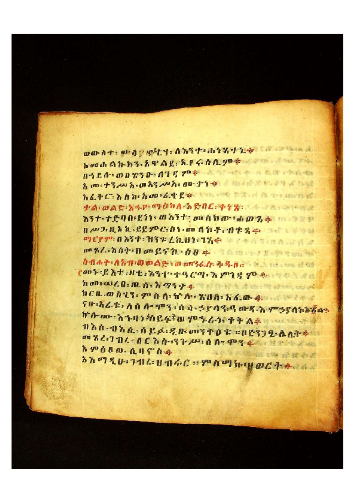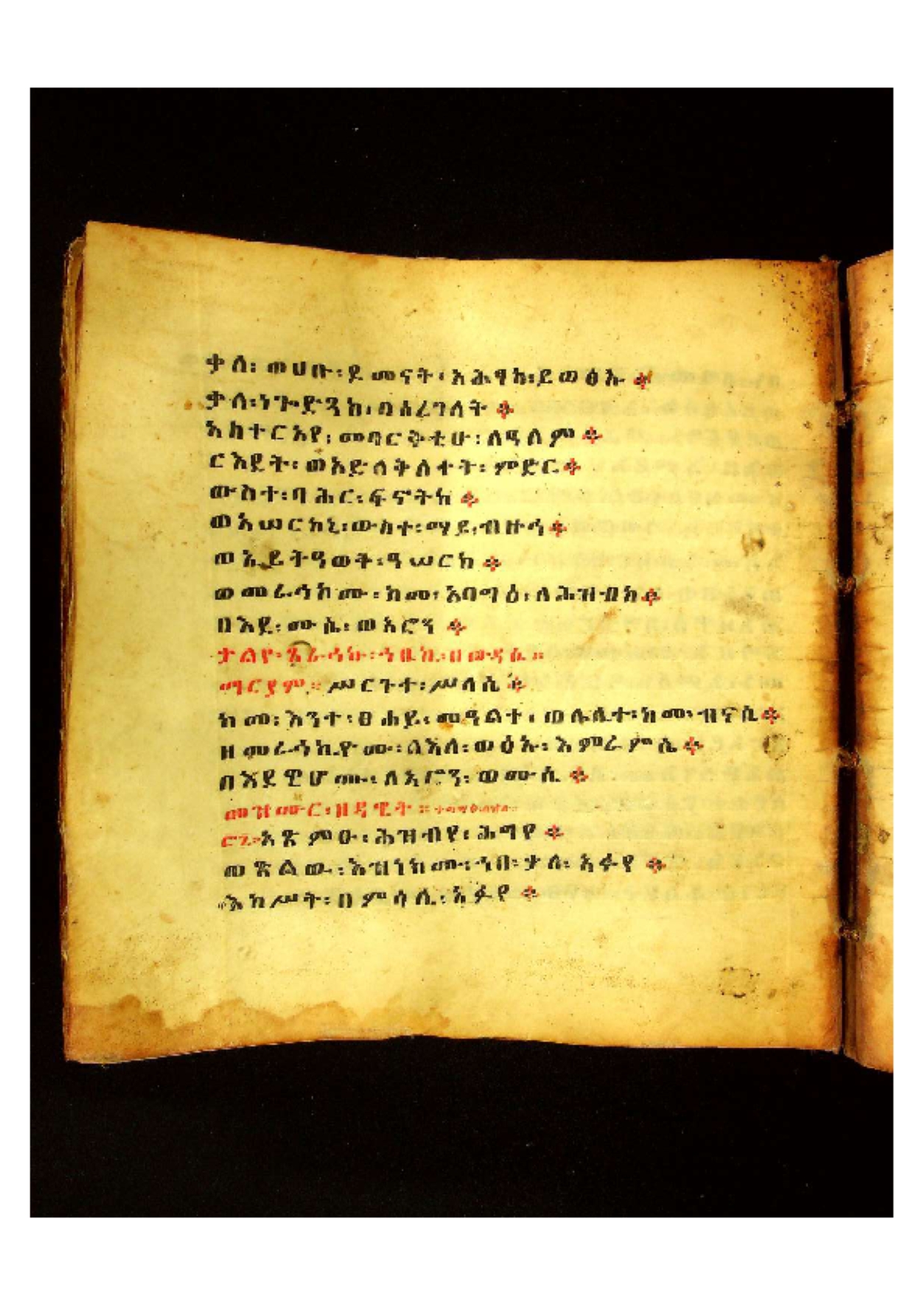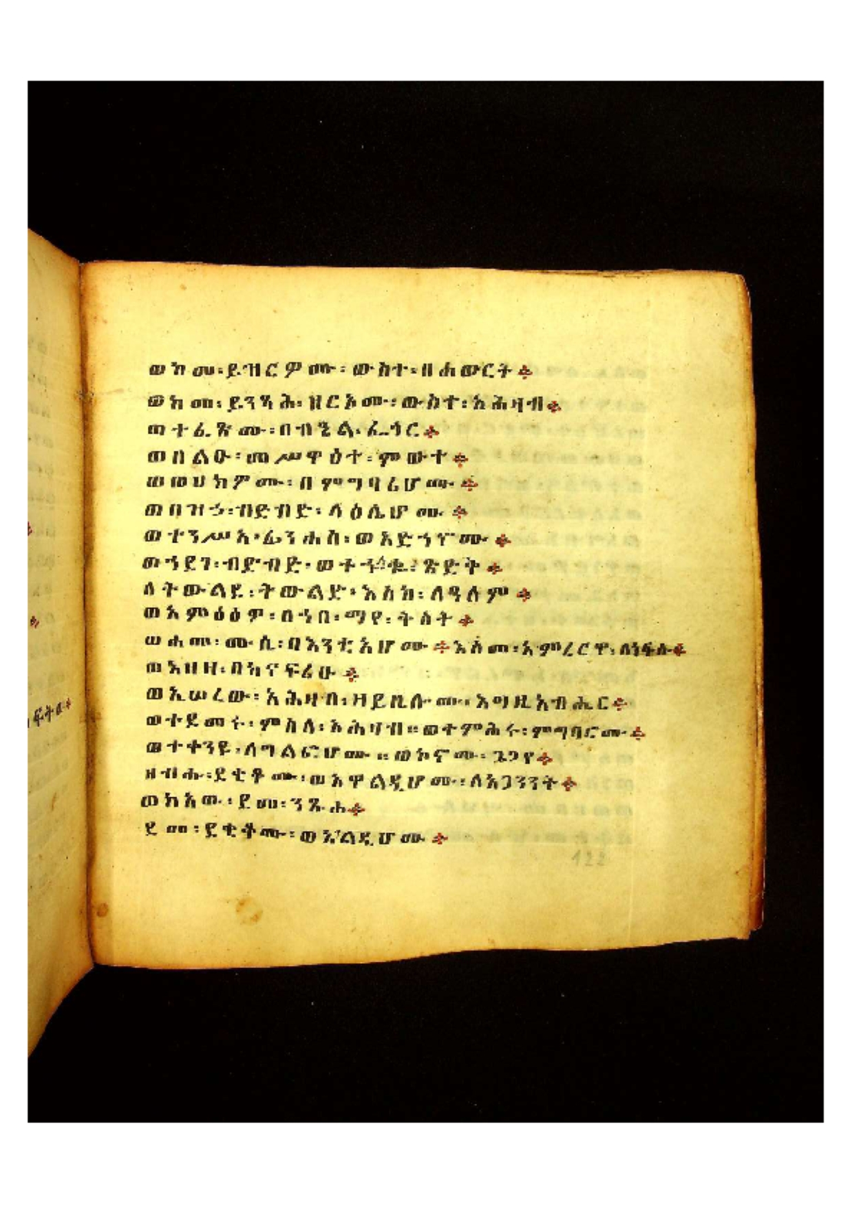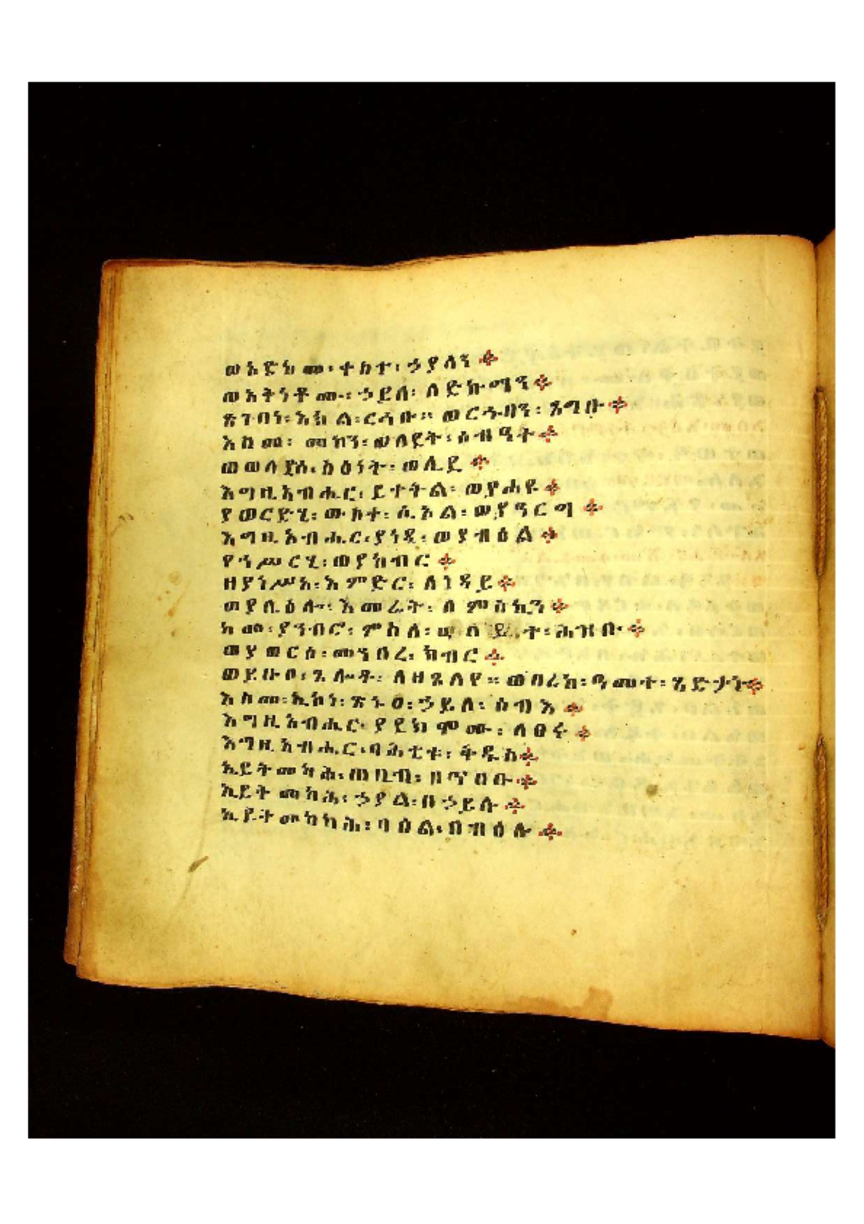 1. F. 2r: donation note written vertically in the outer margin, in black ink: “alla famiglia Bruschettini, Pussy […] Battaglia dell’Amba Aradam il 16 febbraio 1936 XIV”. The note, written in Italian and partly illegible, indicates the Bruschettini family as the receiver of the book and mentions the Battle of Amba Aradam, which took place on 16 February 1936. 2. F. 5r: note written in Italian in the outer upper margin, in red pencil: “Amba Aradam 16/2/XIV ore 17.30 P. Paloboni (?)”. This note also mentions the Battle of Amba Aradam, together with an individual whose name is partially unclear (P. Paloboni?). 3. F. 173v: supplication note written in small script in a mediocre hand, at the end of the “Psalms of David”: ዕቀበኒ፡ እምዓይነ፡ ደዌ፡ ወሞት፡ ለገብርከ፡ ደቅስዮስ፡, “protect me, your servant Däqsəyos, from the eye of infirmity and death”. The note mentions a certain Däqsəyos, indicated as “your servant” (possibly a later owner of the codex). 4. F. 173v: incipit of the Gəʿəz and Amharic prayer, perhaps a writing exercise. The note is written in an inaccurate calligraphy on the outer margin of the folio, next to the prayer. The entire text is የህፂ፡ ኖኅን፡ ከማየ[፡] አይኅ። እስራኤልን፡ ከፈርዖን፡ ዳዊትን፡ ከሳኦል፡ ከኢሎፍሊ። ኤ. 5. F. 190v: donation note, written in black ink in a mediocre hand. Text: ዝመጽሐፍ፡ ዘደብተራ፡ ኪሮስ፡ ዘወሀቦ፡ ለታቦተ፡ ሚካኤል፡ ኢትርስዑኒ፡ በአቡነ፡ ዘበሰማያት፡ ዘአቡየ፡ ገብረ፡ ማርያም፡ ወለእምየ፡ ወለተ፡ ሩፋኤል፡, “This book belongs to däbtära Kiros, who donated it to the tabot of [the church of St] Michael. Do not forget me for our Father who is in heaven. [It also belongs] to my father Gäbrä Maryam and my mother Wälättä Rufaʾel”. 6. F. 199v: writings executed in an inaccurate hand, perhaps the same of note 4. The note includes pen trials (ፈቲነ፡ ብርዕ፡ ዘፈረና፡ etc.), reproduces the explicit of the “Song of the songs” (ስብሐታተኪ፡ ማርያም፡ ከመ፡ እንተ፡ ሕልቀት፡ etc.) and the incipit of the “Praise of Mary” (ውዳሴ፡ ዘሰኑይ፡ ፈቀደ፡ እግዚእ፡ etc., partly rubricated). The writings also mention Däqsəyos, indicated as “your servant” (possibly a later owner of the codex) 7. F. 220ra–va: Genealogic note written on two columns. The note illustrates the family tree of King Yoḥannǝs I, who reigned from 1667 to 1682. The text is acephalous. Incipit: [ወለ]ደ፡ እምሐና፡ ብእሲቱ፡ አሦተ፡ ቅዱሳንሃ፡ ወአሦተ፡ ቅዱሳንኒ፡ እምነ፡ ጳውሊ፡ ብእሲሃ፡ ወለደቶሙ፡ ለአቤተኁን፡ ማእምሮ፡ ወለዘሥላሴ፡ ወአቤተኁን፡ ማእምሮኒ፡ ወለደ፡ አቃርዮስ፡ ወአቃርዮስኒ፡ ወለደ፡ እመቤት፡ እኅተ፡ ክርስቶስሃ፡. The text is published and translated in Proverbio D.V., 2000, ‘Inventario sommario dei manoscritti arabi, ebraici, etiopici – con notizia dei turchi – conservati presso la Biblioteca della Badia di Grottaferrata’. Atti della Accademia nazionale dei Lincei, Memorie, Classe di scienze morali, storiche e filologiche, serie IX, 12 (2000), 468–570 (here pp. 496–97, Appendice III). 8. F. 220va–b: Protective prayer against snakes, written on two columns. Incipit: በስመ፡ አብ፡ … ጸሎት፡ በእንተ፡ ዓርዌ፡ ምድር። ሶበ፡ በጽሐ፡ መልእክት፡ ሐሰውከ፡ በል፡ ፫ጊዜ፡ አኂዘከ፡ ዘፈረ፡ ልብሰ፡ ለእመ፡ ሀሎ፡ ርሑቀ፡ አስትዮ፡. The prayer is probably written in the same hand of note 7. 9. F. 220vb: Unidentified magic prayer containing asmat-names. Incipit: በስመ፡ አብ፡ … ኦላዘላህም፡ አህጉረ፡ ቀዳ[.]፡ ፍሖም፡ ሊስ፡ አፍሊስ፡ ምልክዮስ፡ ዘ[..]ማኤል፡ በዝንቱ፡ አስማቲከ፡ [.]ጽ[..] ኃይለ፡ በረድ፡ ወነፋስ፡ ከማሁ፡. |