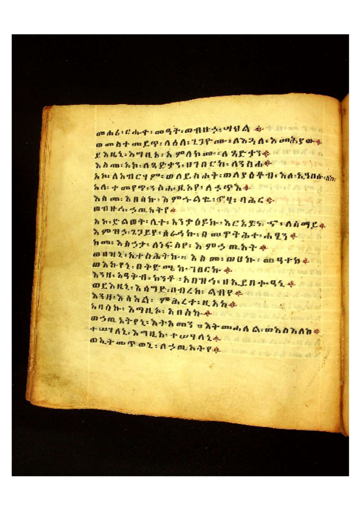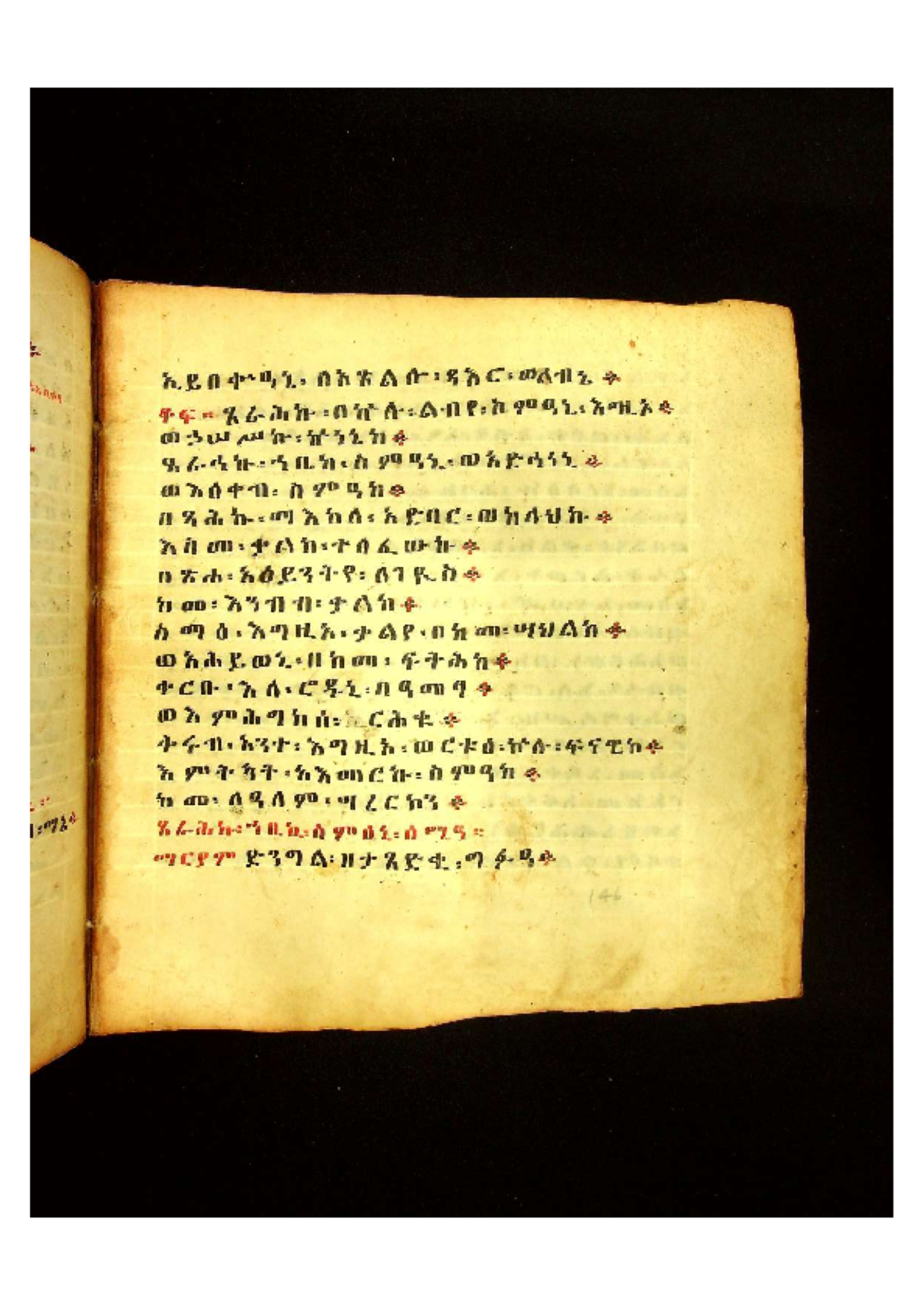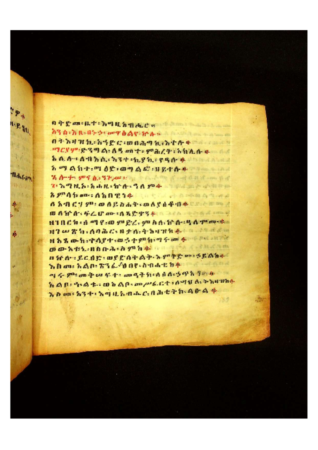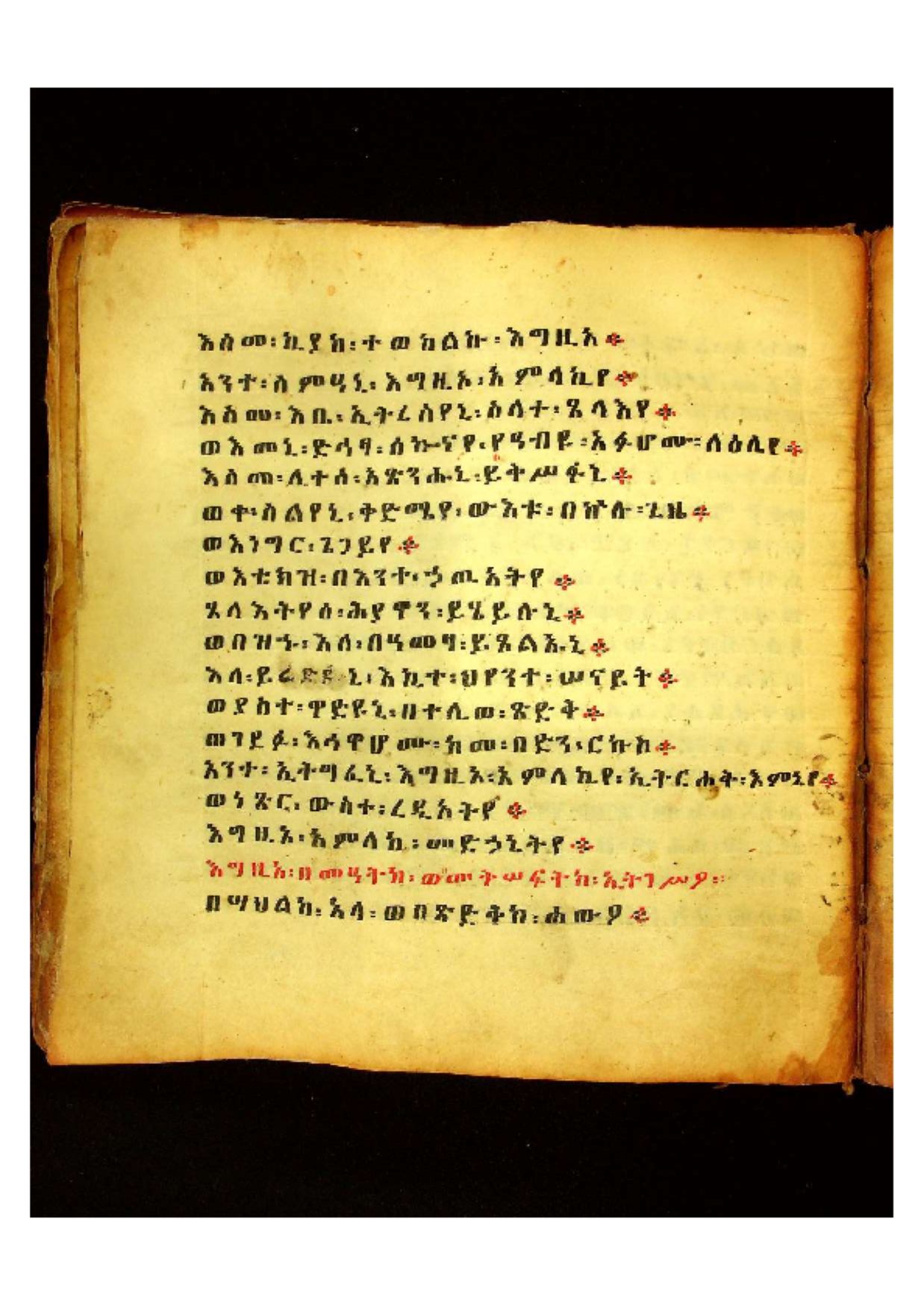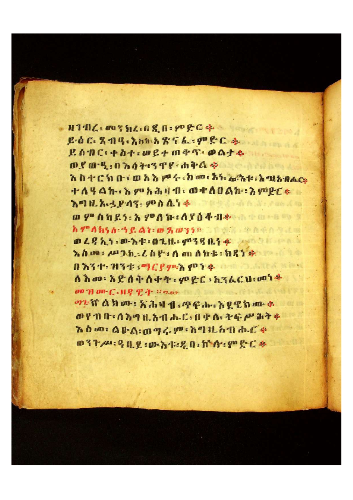 1. F. 2r: donation note written vertically in the outer margin, in black ink: “alla famiglia Bruschettini, Pussy […] Battaglia dell’Amba Aradam il 16 febbraio 1936 XIV”. The note, written in Italian and partly illegible, indicates the Bruschettini family as the receiver of the book and mentions the Battle of Amba Aradam, which took place on 16 February 1936. 2. F. 5r: note written in Italian in the outer upper margin, in red pencil: “Amba Aradam 16/2/XIV ore 17.30 P. Paloboni (?)”. This note also mentions the Battle of Amba Aradam, together with an individual whose name is partially unclear (P. Paloboni?). 3. F. 173v: supplication note written in small script in a mediocre hand, at the end of the “Psalms of David”: ዕቀበኒ፡ እምዓይነ፡ ደዌ፡ ወሞት፡ ለገብርከ፡ ደቅስዮስ፡, “protect me, your servant Däqsəyos, from the eye of infirmity and death”. The note mentions a certain Däqsəyos, indicated as “your servant” (possibly a later owner of the codex). 4. F. 173v: incipit of the Gəʿəz and Amharic prayer, perhaps a writing exercise. The note is written in an inaccurate calligraphy on the outer margin of the folio, next to the prayer. The entire text is የህፂ፡ ኖኅን፡ ከማየ[፡] አይኅ። እስራኤልን፡ ከፈርዖን፡ ዳዊትን፡ ከሳኦል፡ ከኢሎፍሊ። ኤ. 5. F. 190v: donation note, written in black ink in a mediocre hand. Text: ዝመጽሐፍ፡ ዘደብተራ፡ ኪሮስ፡ ዘወሀቦ፡ ለታቦተ፡ ሚካኤል፡ ኢትርስዑኒ፡ በአቡነ፡ ዘበሰማያት፡ ዘአቡየ፡ ገብረ፡ ማርያም፡ ወለእምየ፡ ወለተ፡ ሩፋኤል፡, “This book belongs to däbtära Kiros, who donated it to the tabot of [the church of St] Michael. Do not forget me for our Father who is in heaven. [It also belongs] to my father Gäbrä Maryam and my mother Wälättä Rufaʾel”. 6. F. 199v: writings executed in an inaccurate hand, perhaps the same of note 4. The note includes pen trials (ፈቲነ፡ ብርዕ፡ ዘፈረና፡ etc.), reproduces the explicit of the “Song of the songs” (ስብሐታተኪ፡ ማርያም፡ ከመ፡ እንተ፡ ሕልቀት፡ etc.) and the incipit of the “Praise of Mary” (ውዳሴ፡ ዘሰኑይ፡ ፈቀደ፡ እግዚእ፡ etc., partly rubricated). The writings also mention Däqsəyos, indicated as “your servant” (possibly a later owner of the codex) 7. F. 220ra–va: Genealogic note written on two columns. The note illustrates the family tree of King Yoḥannǝs I, who reigned from 1667 to 1682. The text is acephalous. Incipit: [ወለ]ደ፡ እምሐና፡ ብእሲቱ፡ አሦተ፡ ቅዱሳንሃ፡ ወአሦተ፡ ቅዱሳንኒ፡ እምነ፡ ጳውሊ፡ ብእሲሃ፡ ወለደቶሙ፡ ለአቤተኁን፡ ማእምሮ፡ ወለዘሥላሴ፡ ወአቤተኁን፡ ማእምሮኒ፡ ወለደ፡ አቃርዮስ፡ ወአቃርዮስኒ፡ ወለደ፡ እመቤት፡ እኅተ፡ ክርስቶስሃ፡. The text is published and translated in Proverbio D.V., 2000, ‘Inventario sommario dei manoscritti arabi, ebraici, etiopici – con notizia dei turchi – conservati presso la Biblioteca della Badia di Grottaferrata’. Atti della Accademia nazionale dei Lincei, Memorie, Classe di scienze morali, storiche e filologiche, serie IX, 12 (2000), 468–570 (here pp. 496–97, Appendice III). 8. F. 220va–b: Protective prayer against snakes, written on two columns. Incipit: በስመ፡ አብ፡ … ጸሎት፡ በእንተ፡ ዓርዌ፡ ምድር። ሶበ፡ በጽሐ፡ መልእክት፡ ሐሰውከ፡ በል፡ ፫ጊዜ፡ አኂዘከ፡ ዘፈረ፡ ልብሰ፡ ለእመ፡ ሀሎ፡ ርሑቀ፡ አስትዮ፡. The prayer is probably written in the same hand of note 7. 9. F. 220vb: Unidentified magic prayer containing asmat-names. Incipit: በስመ፡ አብ፡ … ኦላዘላህም፡ አህጉረ፡ ቀዳ[.]፡ ፍሖም፡ ሊስ፡ አፍሊስ፡ ምልክዮስ፡ ዘ[..]ማኤል፡ በዝንቱ፡ አስማቲከ፡ [.]ጽ[..] ኃይለ፡ በረድ፡ ወነፋስ፡ ከማሁ፡. |