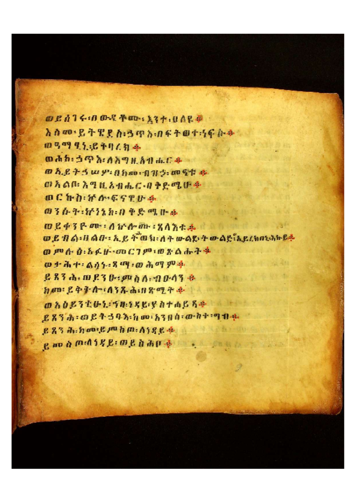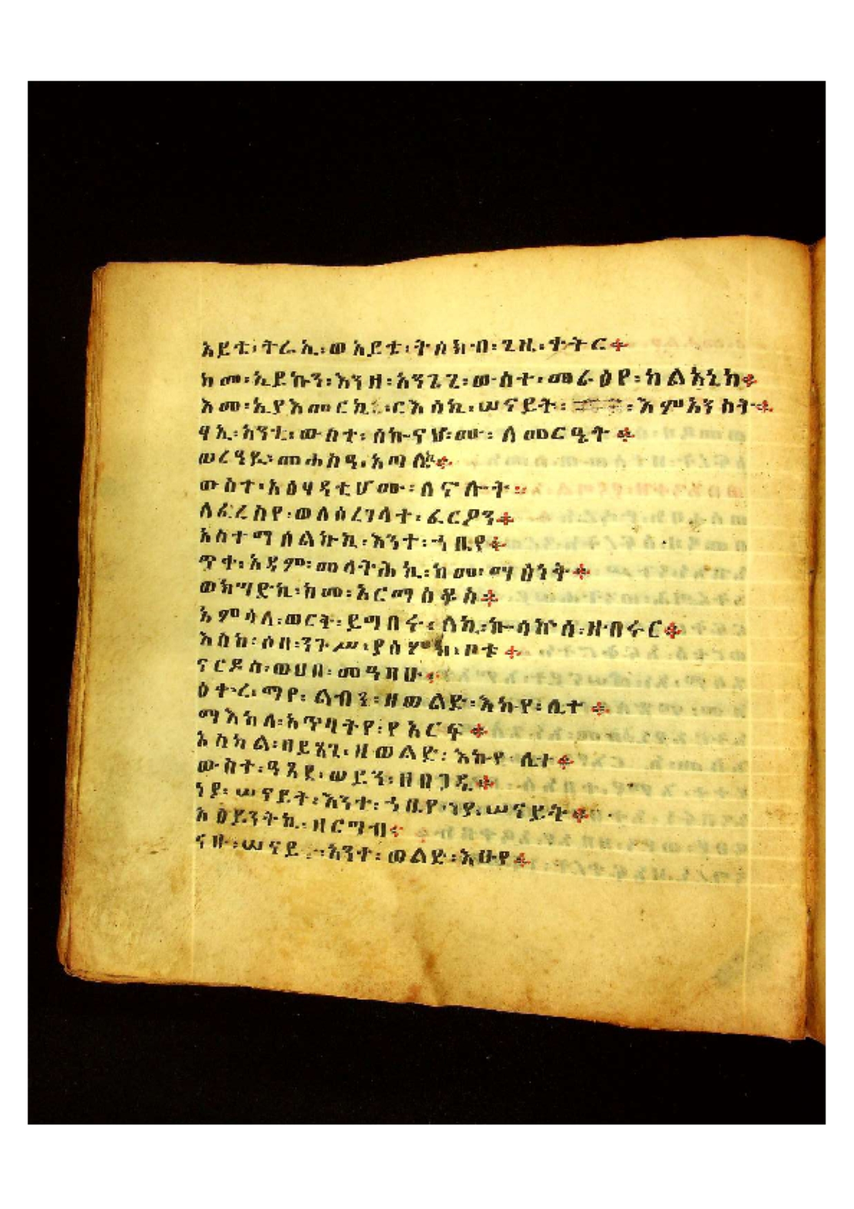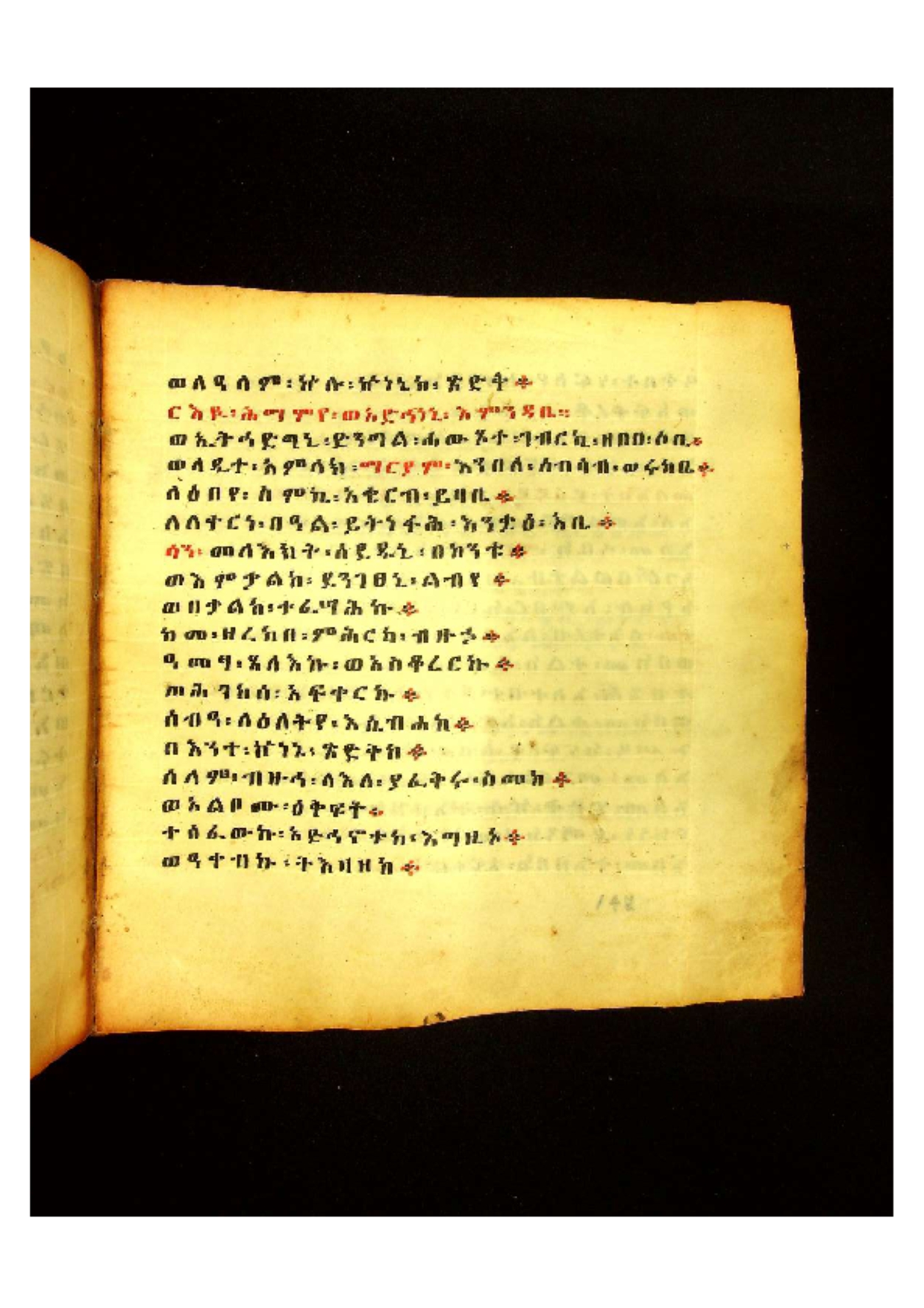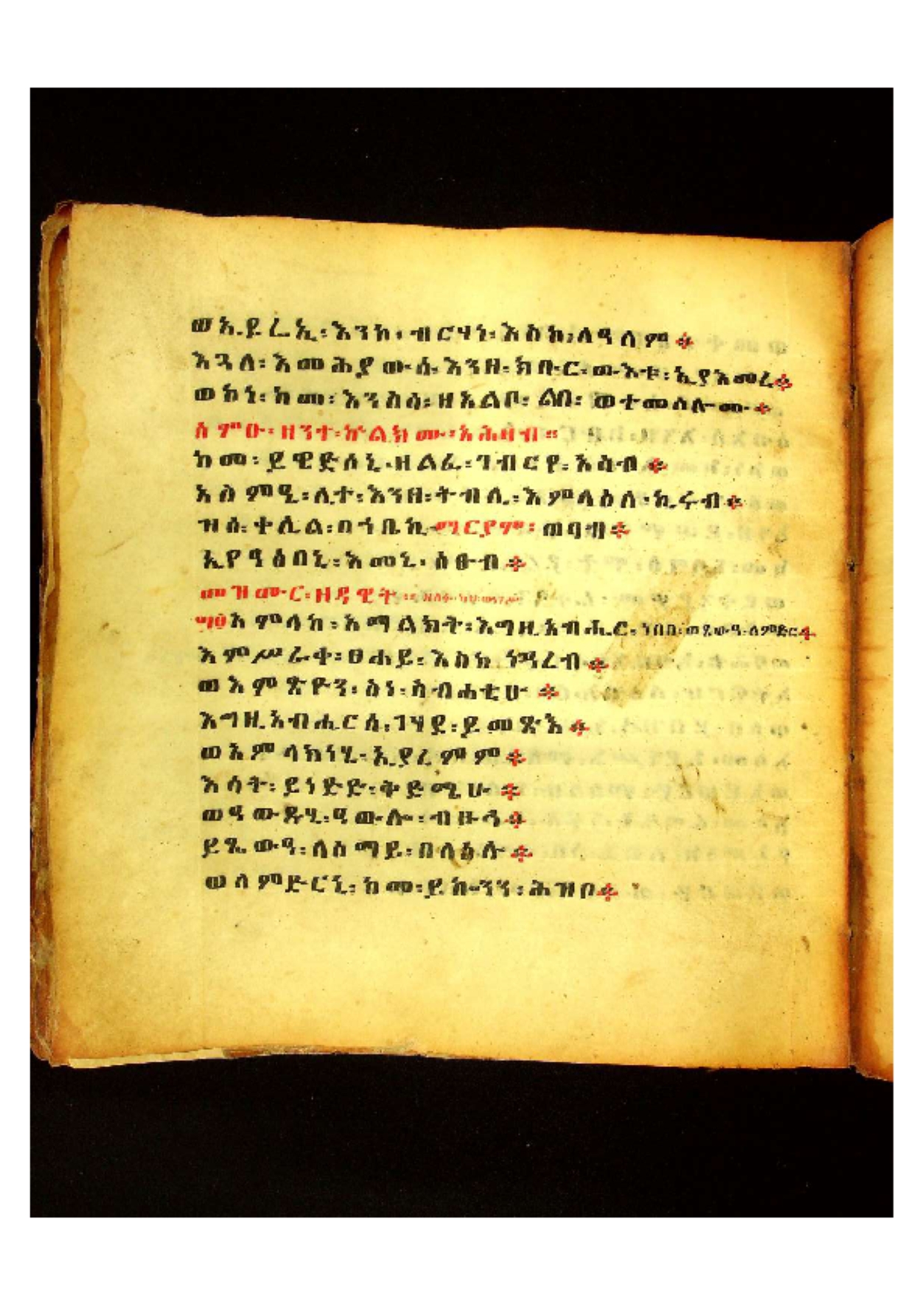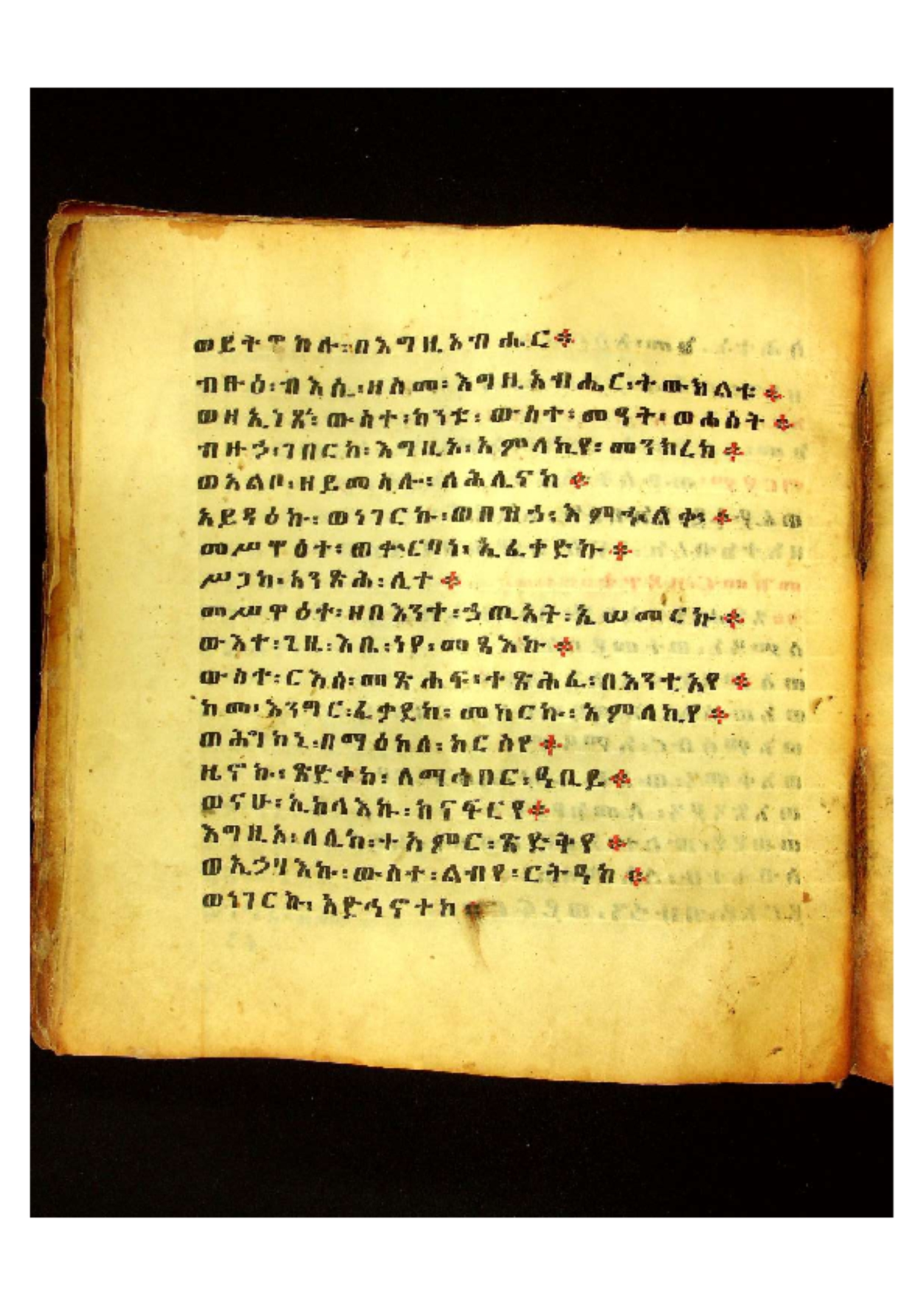 1. F. 2r: donation note written vertically in the outer margin, in black ink: “alla famiglia Bruschettini, Pussy […] Battaglia dell’Amba Aradam il 16 febbraio 1936 XIV”. The note, written in Italian and partly illegible, indicates the Bruschettini family as the receiver of the book and mentions the Battle of Amba Aradam, which took place on 16 February 1936. 2. F. 5r: note written in Italian in the outer upper margin, in red pencil: “Amba Aradam 16/2/XIV ore 17.30 P. Paloboni (?)”. This note also mentions the Battle of Amba Aradam, together with an individual whose name is partially unclear (P. Paloboni?). 3. F. 173v: supplication note written in small script in a mediocre hand, at the end of the “Psalms of David”: ዕቀበኒ፡ እምዓይነ፡ ደዌ፡ ወሞት፡ ለገብርከ፡ ደቅስዮስ፡, “protect me, your servant Däqsəyos, from the eye of infirmity and death”. The note mentions a certain Däqsəyos, indicated as “your servant” (possibly a later owner of the codex). 4. F. 173v: incipit of the Gəʿəz and Amharic prayer, perhaps a writing exercise. The note is written in an inaccurate calligraphy on the outer margin of the folio, next to the prayer. The entire text is የህፂ፡ ኖኅን፡ ከማየ[፡] አይኅ። እስራኤልን፡ ከፈርዖን፡ ዳዊትን፡ ከሳኦል፡ ከኢሎፍሊ። ኤ. 5. F. 190v: donation note, written in black ink in a mediocre hand. Text: ዝመጽሐፍ፡ ዘደብተራ፡ ኪሮስ፡ ዘወሀቦ፡ ለታቦተ፡ ሚካኤል፡ ኢትርስዑኒ፡ በአቡነ፡ ዘበሰማያት፡ ዘአቡየ፡ ገብረ፡ ማርያም፡ ወለእምየ፡ ወለተ፡ ሩፋኤል፡, “This book belongs to däbtära Kiros, who donated it to the tabot of [the church of St] Michael. Do not forget me for our Father who is in heaven. [It also belongs] to my father Gäbrä Maryam and my mother Wälättä Rufaʾel”. 6. F. 199v: writings executed in an inaccurate hand, perhaps the same of note 4. The note includes pen trials (ፈቲነ፡ ብርዕ፡ ዘፈረና፡ etc.), reproduces the explicit of the “Song of the songs” (ስብሐታተኪ፡ ማርያም፡ ከመ፡ እንተ፡ ሕልቀት፡ etc.) and the incipit of the “Praise of Mary” (ውዳሴ፡ ዘሰኑይ፡ ፈቀደ፡ እግዚእ፡ etc., partly rubricated). The writings also mention Däqsəyos, indicated as “your servant” (possibly a later owner of the codex) 7. F. 220ra–va: Genealogic note written on two columns. The note illustrates the family tree of King Yoḥannǝs I, who reigned from 1667 to 1682. The text is acephalous. Incipit: [ወለ]ደ፡ እምሐና፡ ብእሲቱ፡ አሦተ፡ ቅዱሳንሃ፡ ወአሦተ፡ ቅዱሳንኒ፡ እምነ፡ ጳውሊ፡ ብእሲሃ፡ ወለደቶሙ፡ ለአቤተኁን፡ ማእምሮ፡ ወለዘሥላሴ፡ ወአቤተኁን፡ ማእምሮኒ፡ ወለደ፡ አቃርዮስ፡ ወአቃርዮስኒ፡ ወለደ፡ እመቤት፡ እኅተ፡ ክርስቶስሃ፡. The text is published and translated in Proverbio D.V., 2000, ‘Inventario sommario dei manoscritti arabi, ebraici, etiopici – con notizia dei turchi – conservati presso la Biblioteca della Badia di Grottaferrata’. Atti della Accademia nazionale dei Lincei, Memorie, Classe di scienze morali, storiche e filologiche, serie IX, 12 (2000), 468–570 (here pp. 496–97, Appendice III). 8. F. 220va–b: Protective prayer against snakes, written on two columns. Incipit: በስመ፡ አብ፡ … ጸሎት፡ በእንተ፡ ዓርዌ፡ ምድር። ሶበ፡ በጽሐ፡ መልእክት፡ ሐሰውከ፡ በል፡ ፫ጊዜ፡ አኂዘከ፡ ዘፈረ፡ ልብሰ፡ ለእመ፡ ሀሎ፡ ርሑቀ፡ አስትዮ፡. The prayer is probably written in the same hand of note 7. 9. F. 220vb: Unidentified magic prayer containing asmat-names. Incipit: በስመ፡ አብ፡ … ኦላዘላህም፡ አህጉረ፡ ቀዳ[.]፡ ፍሖም፡ ሊስ፡ አፍሊስ፡ ምልክዮስ፡ ዘ[..]ማኤል፡ በዝንቱ፡ አስማቲከ፡ [.]ጽ[..] ኃይለ፡ በረድ፡ ወነፋስ፡ ከማሁ፡. |