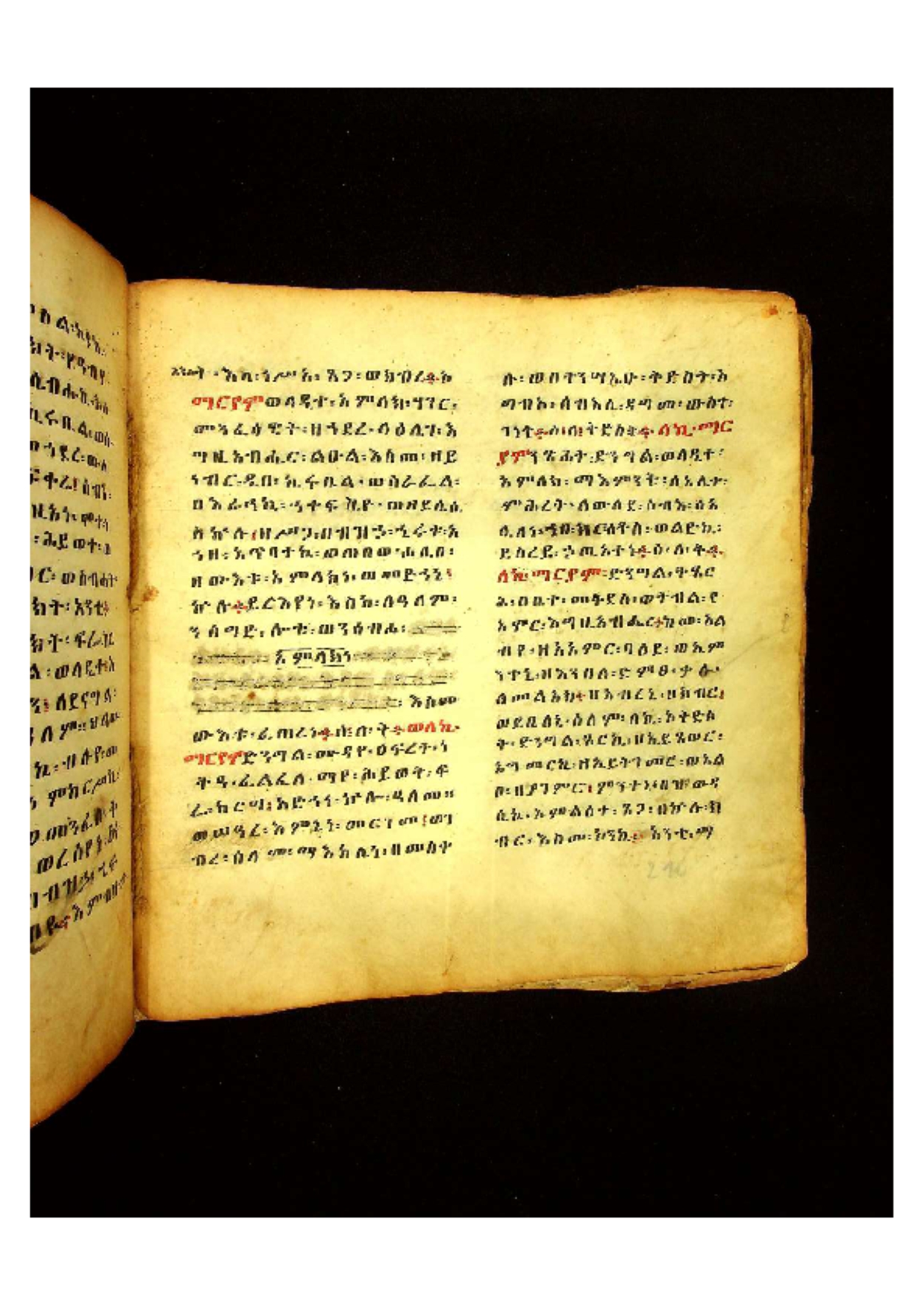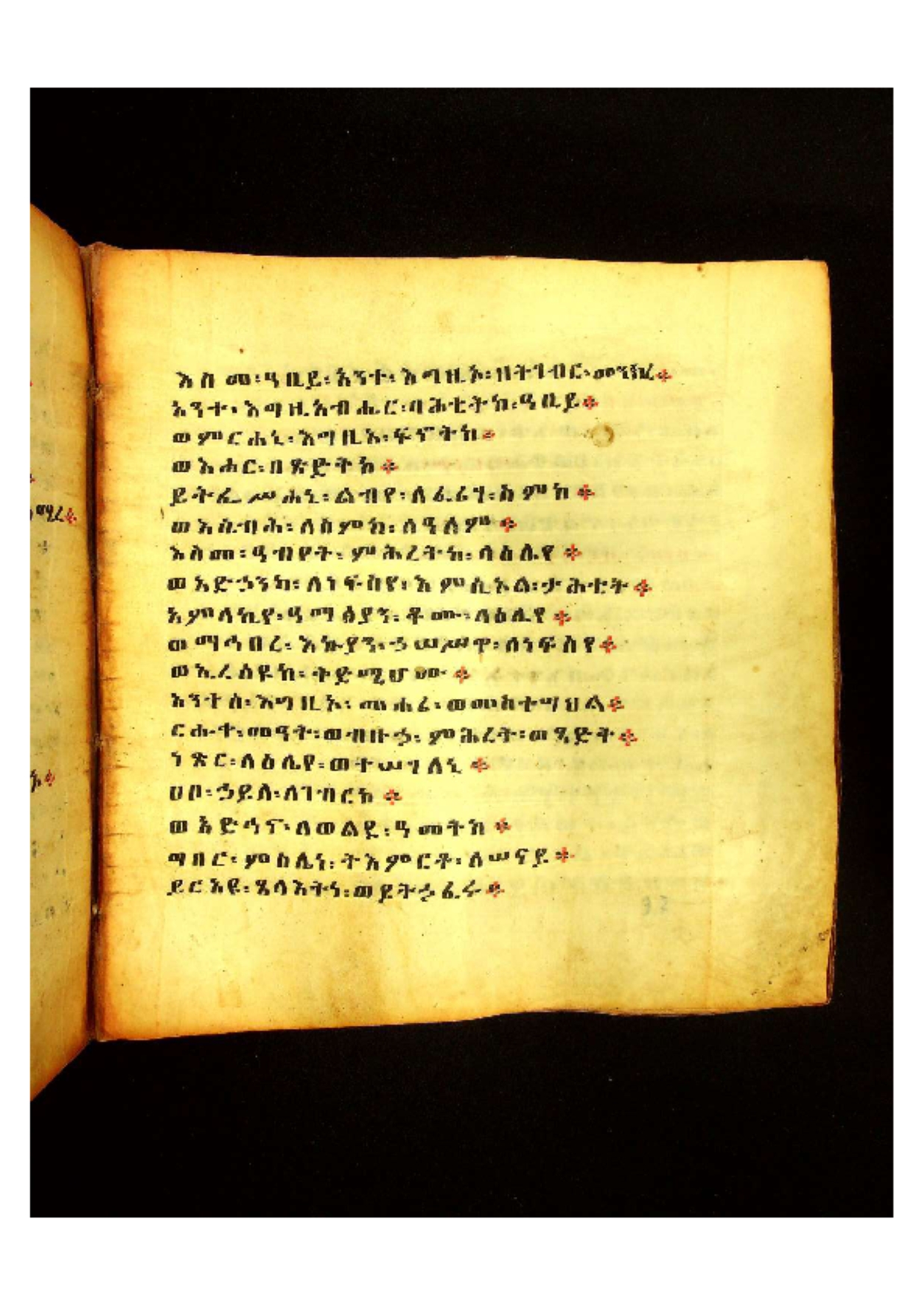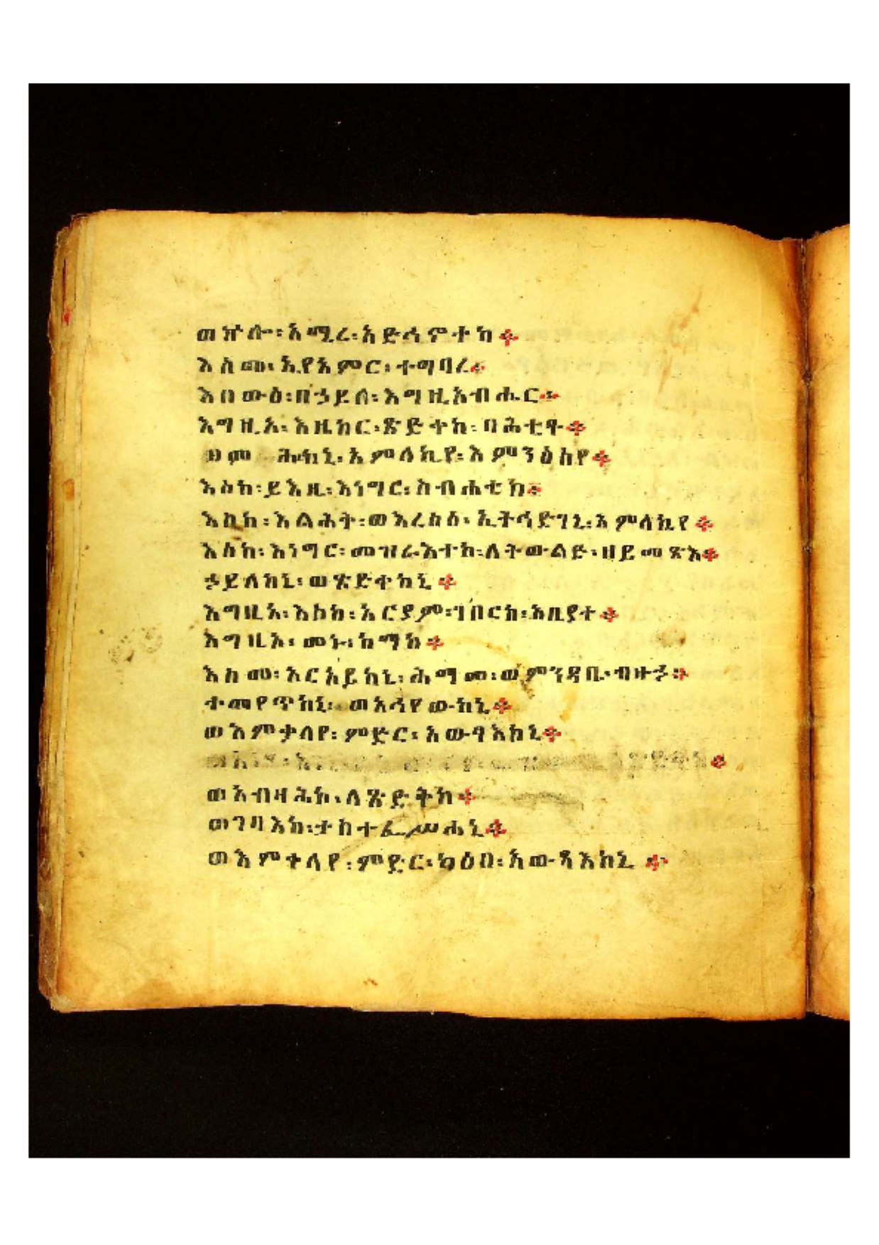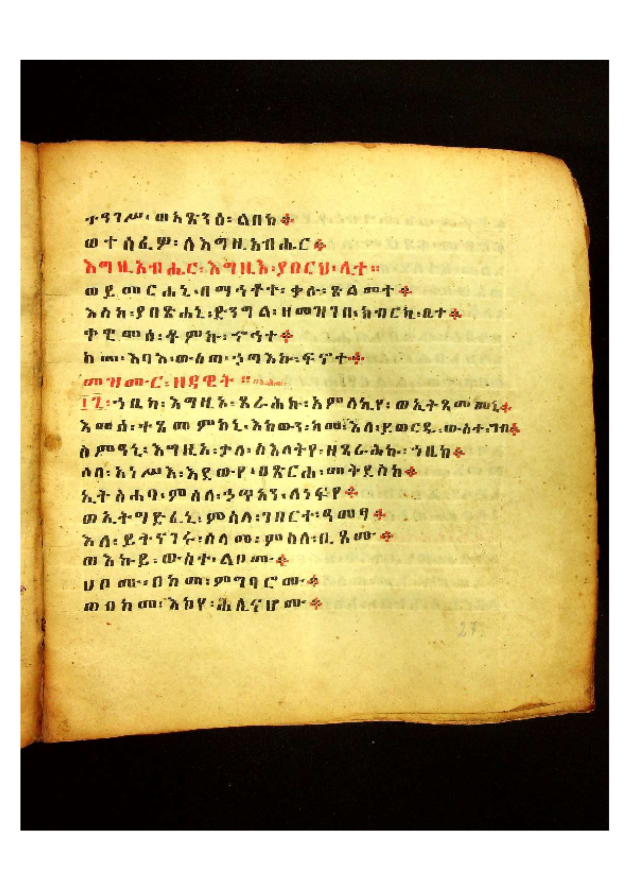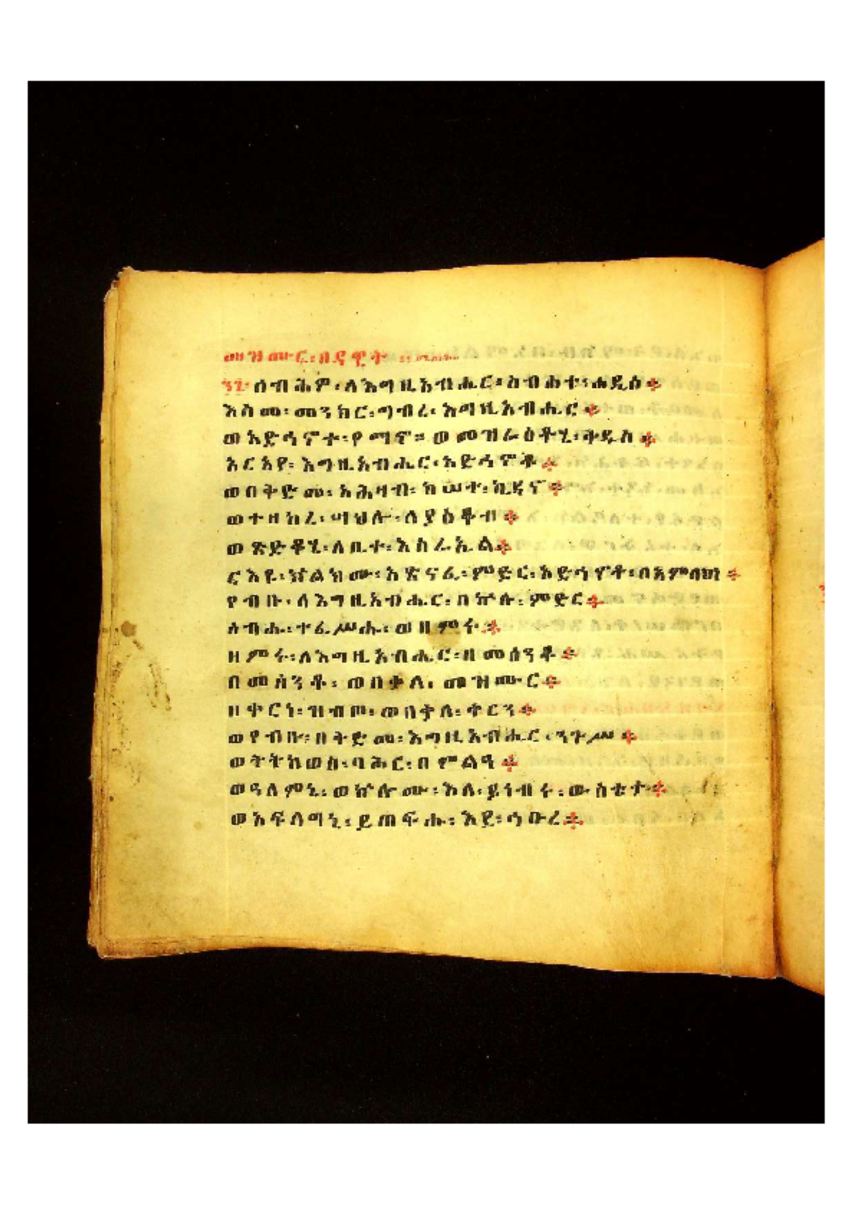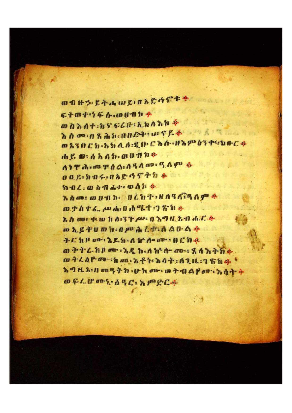 1. F. 2r: donation note written vertically in the outer margin, in black ink: “alla famiglia Bruschettini, Pussy […] Battaglia dell’Amba Aradam il 16 febbraio 1936 XIV”. The note, written in Italian and partly illegible, indicates the Bruschettini family as the receiver of the book and mentions the Battle of Amba Aradam, which took place on 16 February 1936. 2. F. 5r: note written in Italian in the outer upper margin, in red pencil: “Amba Aradam 16/2/XIV ore 17.30 P. Paloboni (?)”. This note also mentions the Battle of Amba Aradam, together with an individual whose name is partially unclear (P. Paloboni?). 3. F. 173v: supplication note written in small script in a mediocre hand, at the end of the “Psalms of David”: ዕቀበኒ፡ እምዓይነ፡ ደዌ፡ ወሞት፡ ለገብርከ፡ ደቅስዮስ፡, “protect me, your servant Däqsəyos, from the eye of infirmity and death”. The note mentions a certain Däqsəyos, indicated as “your servant” (possibly a later owner of the codex). 4. F. 173v: incipit of the Gəʿəz and Amharic prayer, perhaps a writing exercise. The note is written in an inaccurate calligraphy on the outer margin of the folio, next to the prayer. The entire text is የህፂ፡ ኖኅን፡ ከማየ[፡] አይኅ። እስራኤልን፡ ከፈርዖን፡ ዳዊትን፡ ከሳኦል፡ ከኢሎፍሊ። ኤ. 5. F. 190v: donation note, written in black ink in a mediocre hand. Text: ዝመጽሐፍ፡ ዘደብተራ፡ ኪሮስ፡ ዘወሀቦ፡ ለታቦተ፡ ሚካኤል፡ ኢትርስዑኒ፡ በአቡነ፡ ዘበሰማያት፡ ዘአቡየ፡ ገብረ፡ ማርያም፡ ወለእምየ፡ ወለተ፡ ሩፋኤል፡, “This book belongs to däbtära Kiros, who donated it to the tabot of [the church of St] Michael. Do not forget me for our Father who is in heaven. [It also belongs] to my father Gäbrä Maryam and my mother Wälättä Rufaʾel”. 6. F. 199v: writings executed in an inaccurate hand, perhaps the same of note 4. The note includes pen trials (ፈቲነ፡ ብርዕ፡ ዘፈረና፡ etc.), reproduces the explicit of the “Song of the songs” (ስብሐታተኪ፡ ማርያም፡ ከመ፡ እንተ፡ ሕልቀት፡ etc.) and the incipit of the “Praise of Mary” (ውዳሴ፡ ዘሰኑይ፡ ፈቀደ፡ እግዚእ፡ etc., partly rubricated). The writings also mention Däqsəyos, indicated as “your servant” (possibly a later owner of the codex) 7. F. 220ra–va: Genealogic note written on two columns. The note illustrates the family tree of King Yoḥannǝs I, who reigned from 1667 to 1682. The text is acephalous. Incipit: [ወለ]ደ፡ እምሐና፡ ብእሲቱ፡ አሦተ፡ ቅዱሳንሃ፡ ወአሦተ፡ ቅዱሳንኒ፡ እምነ፡ ጳውሊ፡ ብእሲሃ፡ ወለደቶሙ፡ ለአቤተኁን፡ ማእምሮ፡ ወለዘሥላሴ፡ ወአቤተኁን፡ ማእምሮኒ፡ ወለደ፡ አቃርዮስ፡ ወአቃርዮስኒ፡ ወለደ፡ እመቤት፡ እኅተ፡ ክርስቶስሃ፡. The text is published and translated in Proverbio D.V., 2000, ‘Inventario sommario dei manoscritti arabi, ebraici, etiopici – con notizia dei turchi – conservati presso la Biblioteca della Badia di Grottaferrata’. Atti della Accademia nazionale dei Lincei, Memorie, Classe di scienze morali, storiche e filologiche, serie IX, 12 (2000), 468–570 (here pp. 496–97, Appendice III). 8. F. 220va–b: Protective prayer against snakes, written on two columns. Incipit: በስመ፡ አብ፡ … ጸሎት፡ በእንተ፡ ዓርዌ፡ ምድር። ሶበ፡ በጽሐ፡ መልእክት፡ ሐሰውከ፡ በል፡ ፫ጊዜ፡ አኂዘከ፡ ዘፈረ፡ ልብሰ፡ ለእመ፡ ሀሎ፡ ርሑቀ፡ አስትዮ፡. The prayer is probably written in the same hand of note 7. 9. F. 220vb: Unidentified magic prayer containing asmat-names. Incipit: በስመ፡ አብ፡ … ኦላዘላህም፡ አህጉረ፡ ቀዳ[.]፡ ፍሖም፡ ሊስ፡ አፍሊስ፡ ምልክዮስ፡ ዘ[..]ማኤል፡ በዝንቱ፡ አስማቲከ፡ [.]ጽ[..] ኃይለ፡ በረድ፡ ወነፋስ፡ ከማሁ፡. |