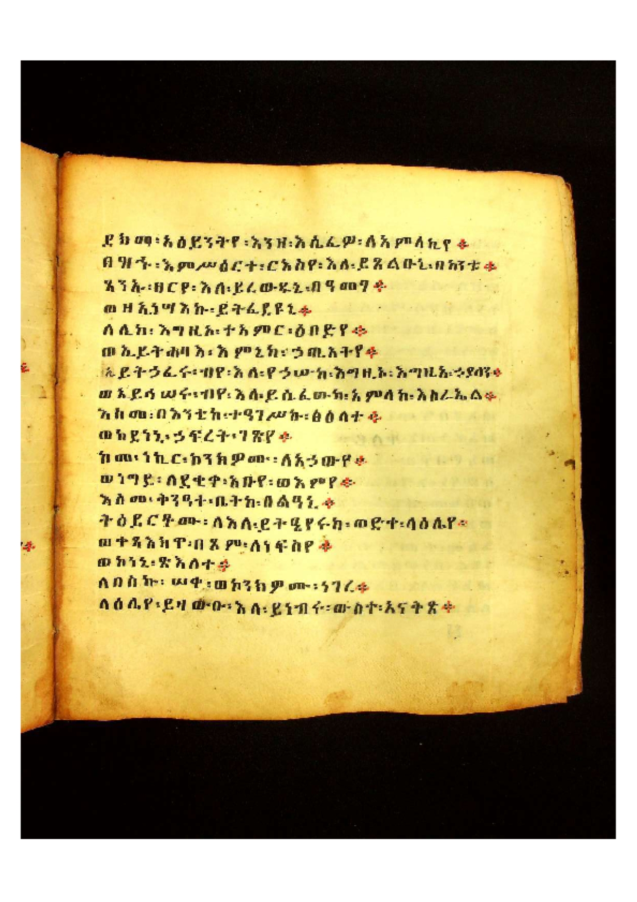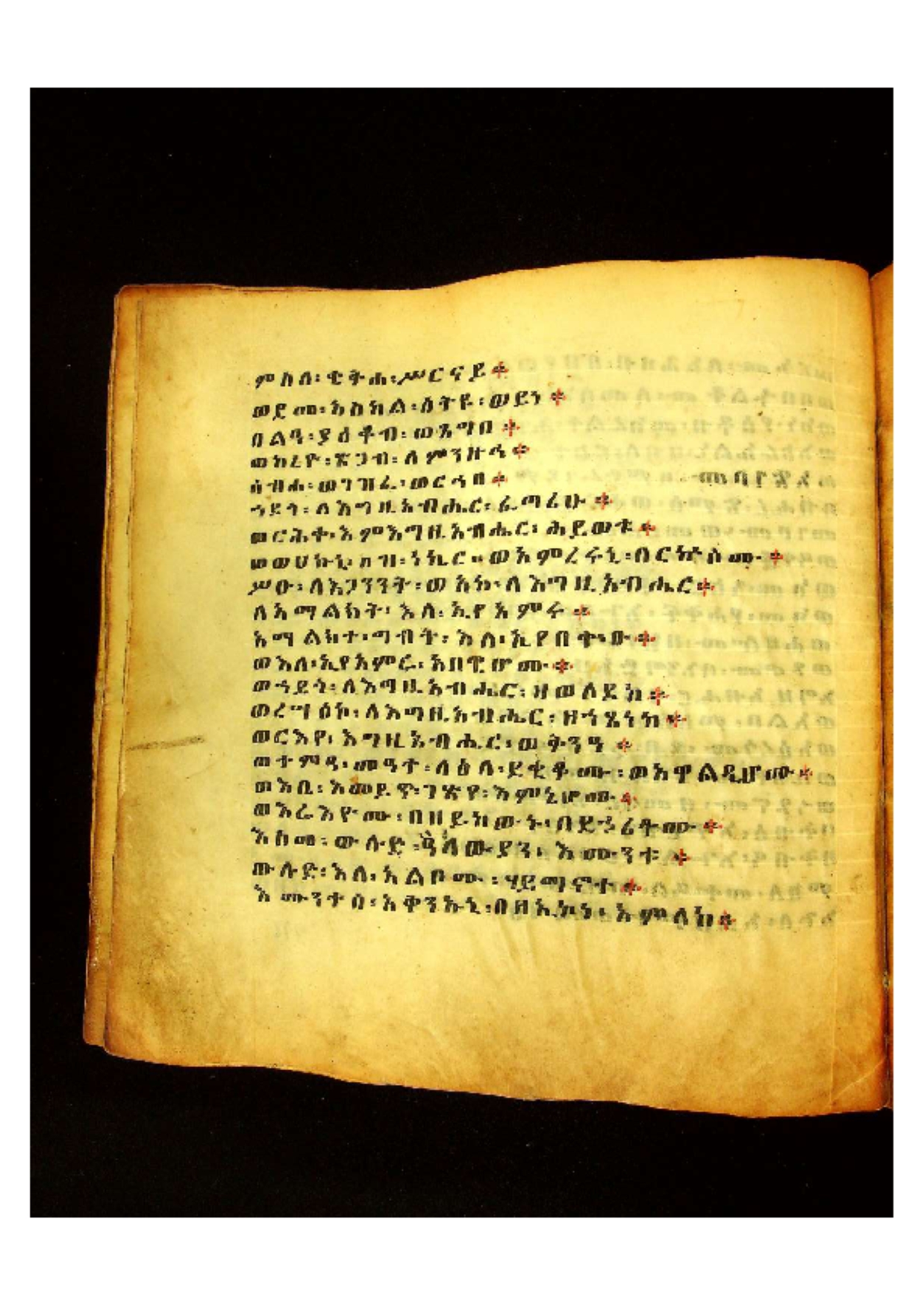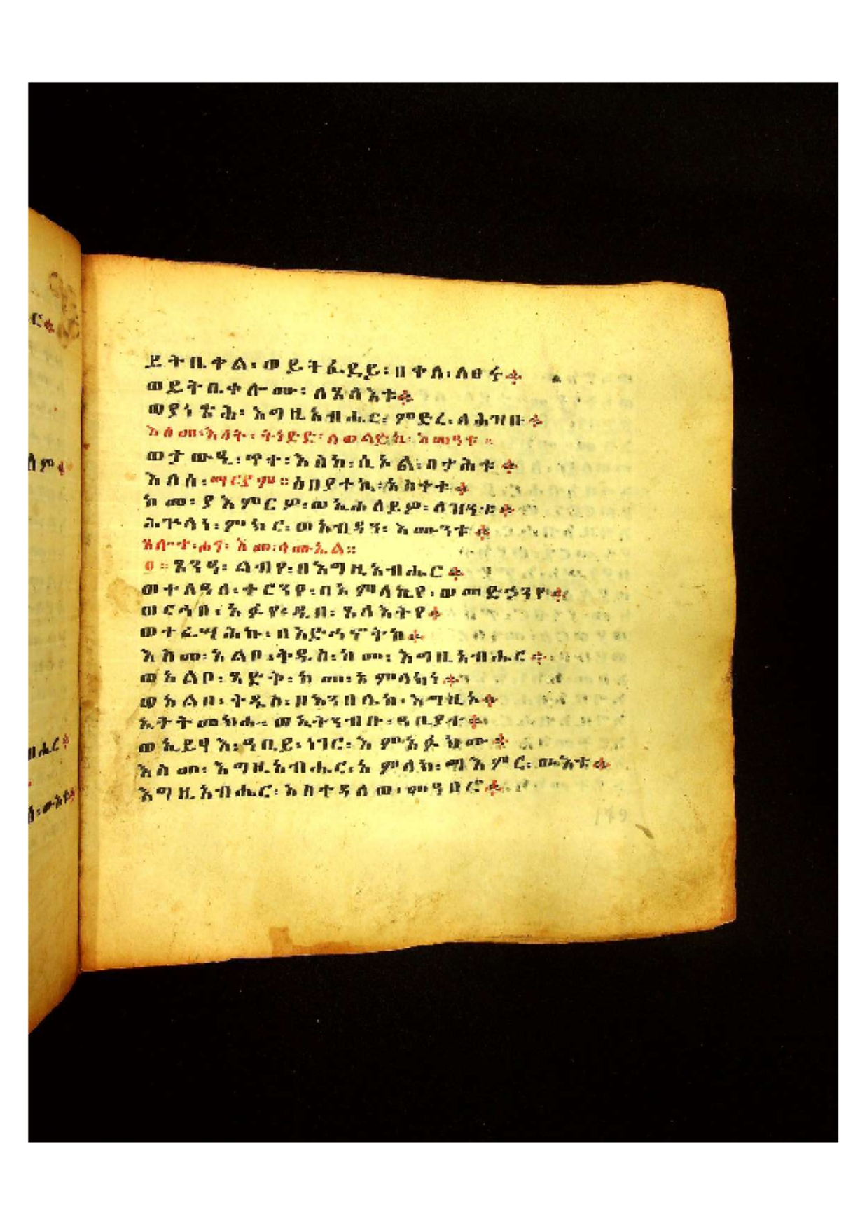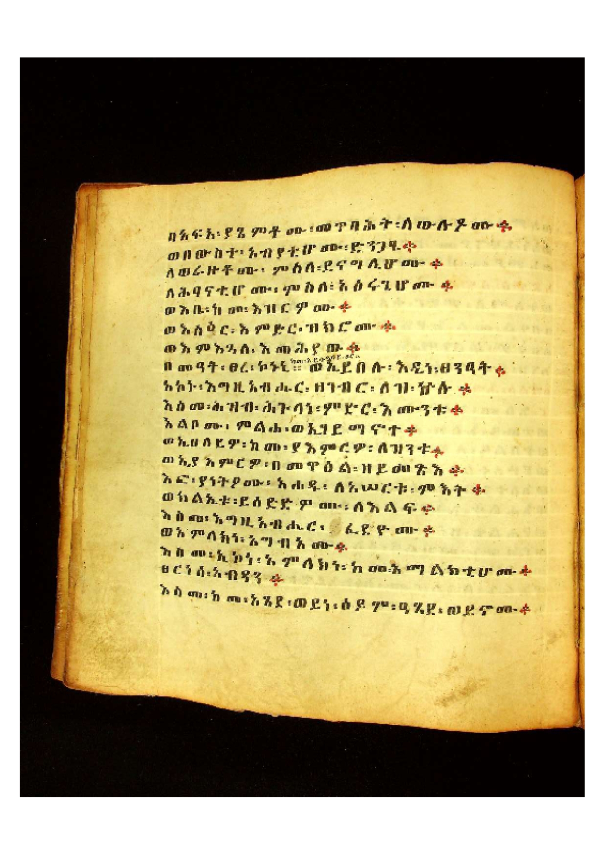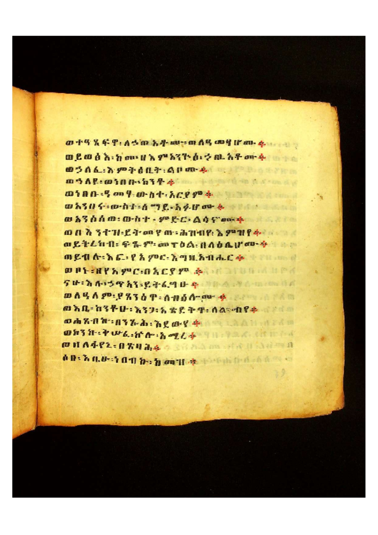 1. F. 2r: donation note written vertically in the outer margin, in black ink: “alla famiglia Bruschettini, Pussy […] Battaglia dell’Amba Aradam il 16 febbraio 1936 XIV”. The note, written in Italian and partly illegible, indicates the Bruschettini family as the receiver of the book and mentions the Battle of Amba Aradam, which took place on 16 February 1936. 2. F. 5r: note written in Italian in the outer upper margin, in red pencil: “Amba Aradam 16/2/XIV ore 17.30 P. Paloboni (?)”. This note also mentions the Battle of Amba Aradam, together with an individual whose name is partially unclear (P. Paloboni?). 3. F. 173v: supplication note written in small script in a mediocre hand, at the end of the “Psalms of David”: ዕቀበኒ፡ እምዓይነ፡ ደዌ፡ ወሞት፡ ለገብርከ፡ ደቅስዮስ፡, “protect me, your servant Däqsəyos, from the eye of infirmity and death”. The note mentions a certain Däqsəyos, indicated as “your servant” (possibly a later owner of the codex). 4. F. 173v: incipit of the Gəʿəz and Amharic prayer, perhaps a writing exercise. The note is written in an inaccurate calligraphy on the outer margin of the folio, next to the prayer. The entire text is የህፂ፡ ኖኅን፡ ከማየ[፡] አይኅ። እስራኤልን፡ ከፈርዖን፡ ዳዊትን፡ ከሳኦል፡ ከኢሎፍሊ። ኤ. 5. F. 190v: donation note, written in black ink in a mediocre hand. Text: ዝመጽሐፍ፡ ዘደብተራ፡ ኪሮስ፡ ዘወሀቦ፡ ለታቦተ፡ ሚካኤል፡ ኢትርስዑኒ፡ በአቡነ፡ ዘበሰማያት፡ ዘአቡየ፡ ገብረ፡ ማርያም፡ ወለእምየ፡ ወለተ፡ ሩፋኤል፡, “This book belongs to däbtära Kiros, who donated it to the tabot of [the church of St] Michael. Do not forget me for our Father who is in heaven. [It also belongs] to my father Gäbrä Maryam and my mother Wälättä Rufaʾel”. 6. F. 199v: writings executed in an inaccurate hand, perhaps the same of note 4. The note includes pen trials (ፈቲነ፡ ብርዕ፡ ዘፈረና፡ etc.), reproduces the explicit of the “Song of the songs” (ስብሐታተኪ፡ ማርያም፡ ከመ፡ እንተ፡ ሕልቀት፡ etc.) and the incipit of the “Praise of Mary” (ውዳሴ፡ ዘሰኑይ፡ ፈቀደ፡ እግዚእ፡ etc., partly rubricated). The writings also mention Däqsəyos, indicated as “your servant” (possibly a later owner of the codex) 7. F. 220ra–va: Genealogic note written on two columns. The note illustrates the family tree of King Yoḥannǝs I, who reigned from 1667 to 1682. The text is acephalous. Incipit: [ወለ]ደ፡ እምሐና፡ ብእሲቱ፡ አሦተ፡ ቅዱሳንሃ፡ ወአሦተ፡ ቅዱሳንኒ፡ እምነ፡ ጳውሊ፡ ብእሲሃ፡ ወለደቶሙ፡ ለአቤተኁን፡ ማእምሮ፡ ወለዘሥላሴ፡ ወአቤተኁን፡ ማእምሮኒ፡ ወለደ፡ አቃርዮስ፡ ወአቃርዮስኒ፡ ወለደ፡ እመቤት፡ እኅተ፡ ክርስቶስሃ፡. The text is published and translated in Proverbio D.V., 2000, ‘Inventario sommario dei manoscritti arabi, ebraici, etiopici – con notizia dei turchi – conservati presso la Biblioteca della Badia di Grottaferrata’. Atti della Accademia nazionale dei Lincei, Memorie, Classe di scienze morali, storiche e filologiche, serie IX, 12 (2000), 468–570 (here pp. 496–97, Appendice III). 8. F. 220va–b: Protective prayer against snakes, written on two columns. Incipit: በስመ፡ አብ፡ … ጸሎት፡ በእንተ፡ ዓርዌ፡ ምድር። ሶበ፡ በጽሐ፡ መልእክት፡ ሐሰውከ፡ በል፡ ፫ጊዜ፡ አኂዘከ፡ ዘፈረ፡ ልብሰ፡ ለእመ፡ ሀሎ፡ ርሑቀ፡ አስትዮ፡. The prayer is probably written in the same hand of note 7. 9. F. 220vb: Unidentified magic prayer containing asmat-names. Incipit: በስመ፡ አብ፡ … ኦላዘላህም፡ አህጉረ፡ ቀዳ[.]፡ ፍሖም፡ ሊስ፡ አፍሊስ፡ ምልክዮስ፡ ዘ[..]ማኤል፡ በዝንቱ፡ አስማቲከ፡ [.]ጽ[..] ኃይለ፡ በረድ፡ ወነፋስ፡ ከማሁ፡. |