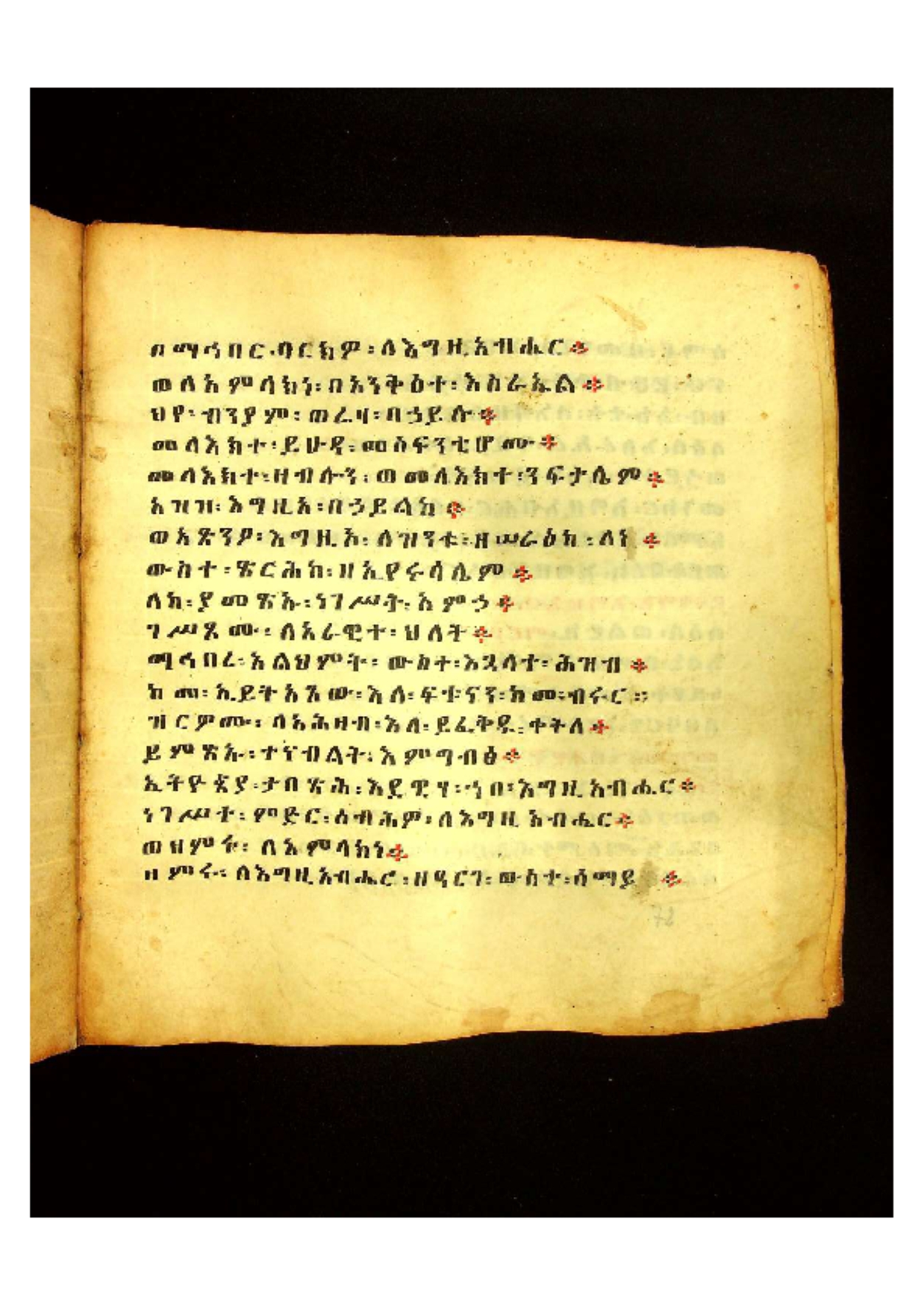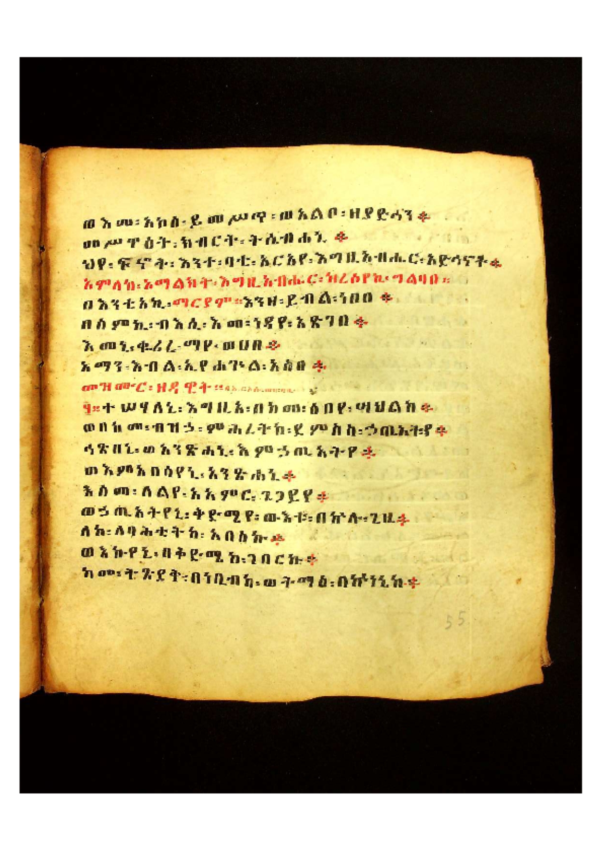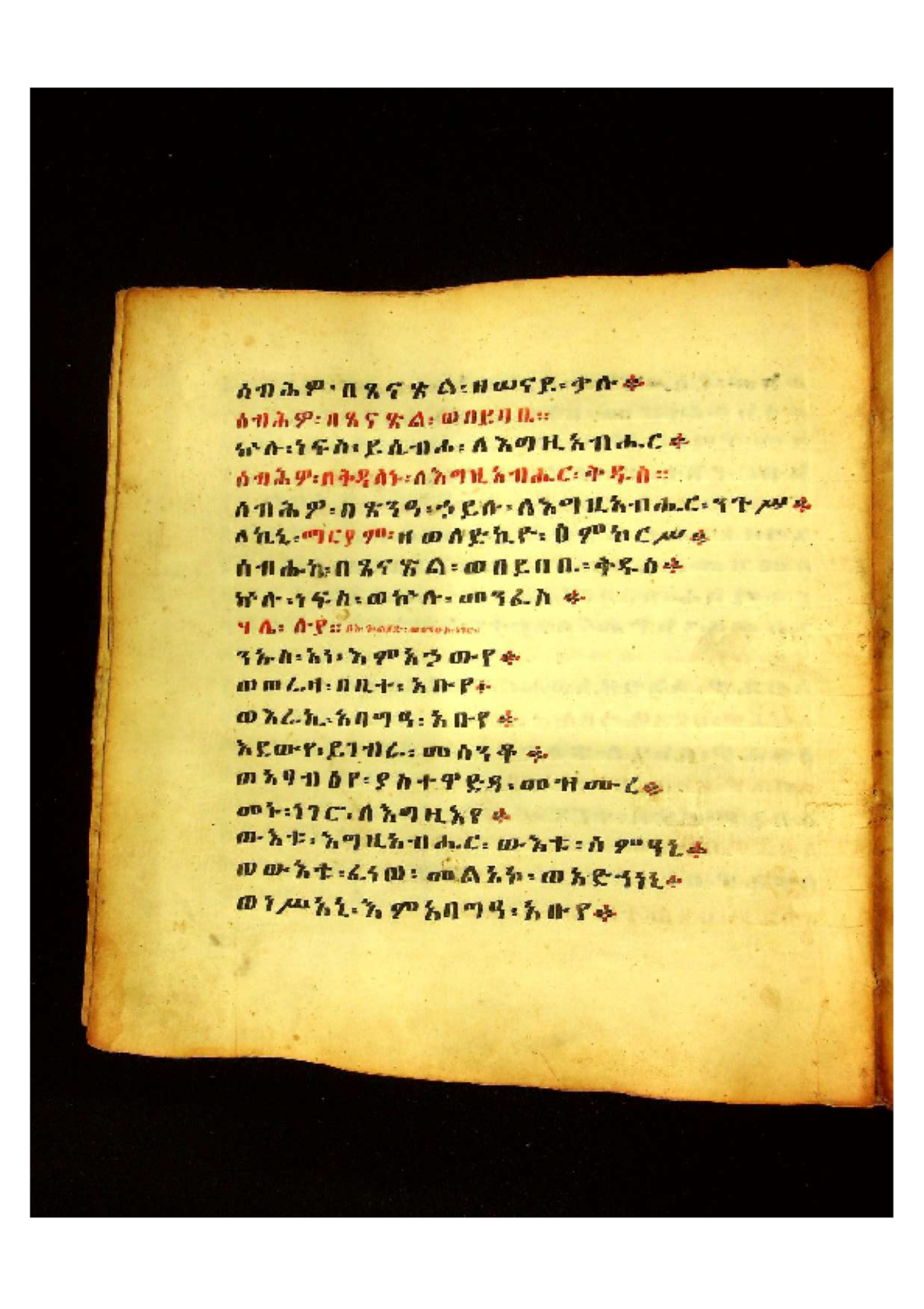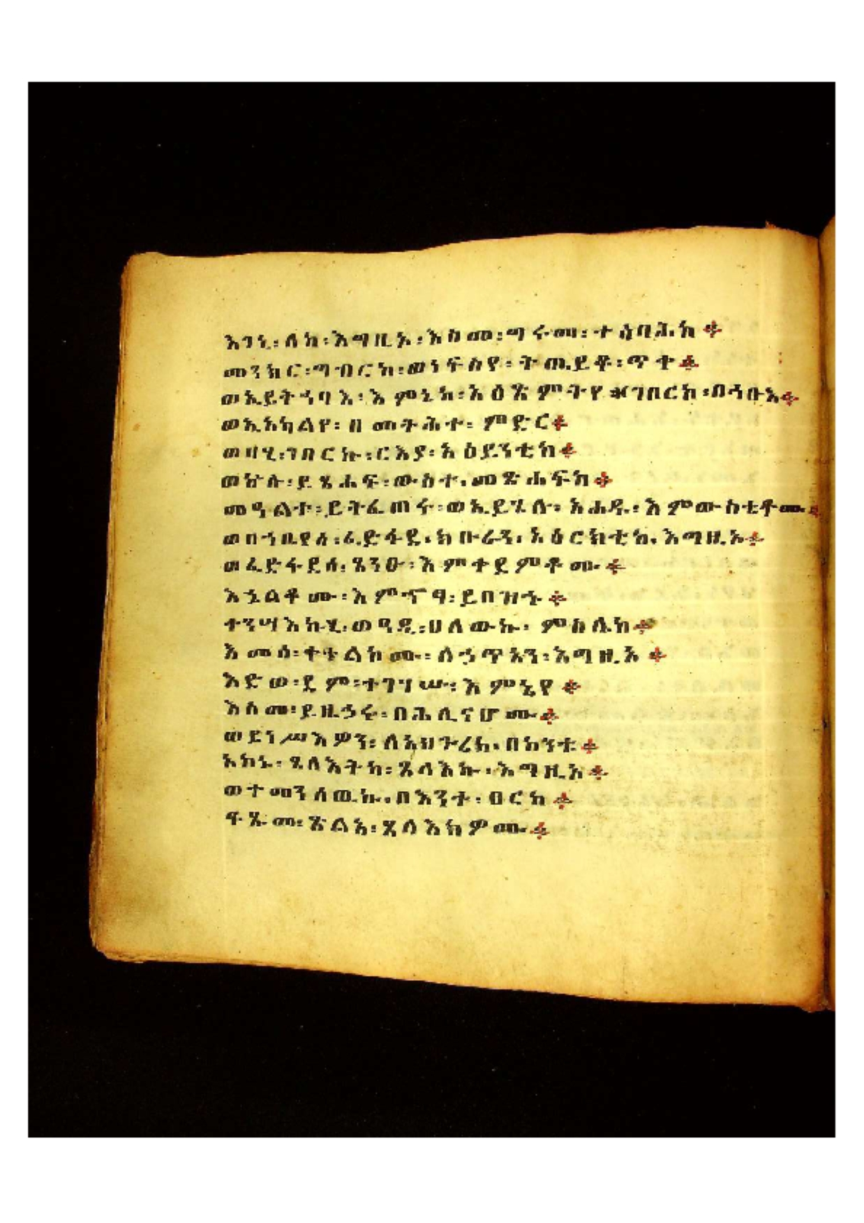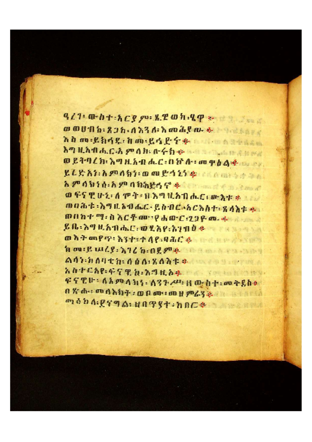 1. F. 2r: donation note written vertically in the outer margin, in black ink: “alla famiglia Bruschettini, Pussy […] Battaglia dell’Amba Aradam il 16 febbraio 1936 XIV”. The note, written in Italian and partly illegible, indicates the Bruschettini family as the receiver of the book and mentions the Battle of Amba Aradam, which took place on 16 February 1936. 2. F. 5r: note written in Italian in the outer upper margin, in red pencil: “Amba Aradam 16/2/XIV ore 17.30 P. Paloboni (?)”. This note also mentions the Battle of Amba Aradam, together with an individual whose name is partially unclear (P. Paloboni?). 3. F. 173v: supplication note written in small script in a mediocre hand, at the end of the “Psalms of David”: ዕቀበኒ፡ እምዓይነ፡ ደዌ፡ ወሞት፡ ለገብርከ፡ ደቅስዮስ፡, “protect me, your servant Däqsəyos, from the eye of infirmity and death”. The note mentions a certain Däqsəyos, indicated as “your servant” (possibly a later owner of the codex). 4. F. 173v: incipit of the Gəʿəz and Amharic prayer, perhaps a writing exercise. The note is written in an inaccurate calligraphy on the outer margin of the folio, next to the prayer. The entire text is የህፂ፡ ኖኅን፡ ከማየ[፡] አይኅ። እስራኤልን፡ ከፈርዖን፡ ዳዊትን፡ ከሳኦል፡ ከኢሎፍሊ። ኤ. 5. F. 190v: donation note, written in black ink in a mediocre hand. Text: ዝመጽሐፍ፡ ዘደብተራ፡ ኪሮስ፡ ዘወሀቦ፡ ለታቦተ፡ ሚካኤል፡ ኢትርስዑኒ፡ በአቡነ፡ ዘበሰማያት፡ ዘአቡየ፡ ገብረ፡ ማርያም፡ ወለእምየ፡ ወለተ፡ ሩፋኤል፡, “This book belongs to däbtära Kiros, who donated it to the tabot of [the church of St] Michael. Do not forget me for our Father who is in heaven. [It also belongs] to my father Gäbrä Maryam and my mother Wälättä Rufaʾel”. 6. F. 199v: writings executed in an inaccurate hand, perhaps the same of note 4. The note includes pen trials (ፈቲነ፡ ብርዕ፡ ዘፈረና፡ etc.), reproduces the explicit of the “Song of the songs” (ስብሐታተኪ፡ ማርያም፡ ከመ፡ እንተ፡ ሕልቀት፡ etc.) and the incipit of the “Praise of Mary” (ውዳሴ፡ ዘሰኑይ፡ ፈቀደ፡ እግዚእ፡ etc., partly rubricated). The writings also mention Däqsəyos, indicated as “your servant” (possibly a later owner of the codex) 7. F. 220ra–va: Genealogic note written on two columns. The note illustrates the family tree of King Yoḥannǝs I, who reigned from 1667 to 1682. The text is acephalous. Incipit: [ወለ]ደ፡ እምሐና፡ ብእሲቱ፡ አሦተ፡ ቅዱሳንሃ፡ ወአሦተ፡ ቅዱሳንኒ፡ እምነ፡ ጳውሊ፡ ብእሲሃ፡ ወለደቶሙ፡ ለአቤተኁን፡ ማእምሮ፡ ወለዘሥላሴ፡ ወአቤተኁን፡ ማእምሮኒ፡ ወለደ፡ አቃርዮስ፡ ወአቃርዮስኒ፡ ወለደ፡ እመቤት፡ እኅተ፡ ክርስቶስሃ፡. The text is published and translated in Proverbio D.V., 2000, ‘Inventario sommario dei manoscritti arabi, ebraici, etiopici – con notizia dei turchi – conservati presso la Biblioteca della Badia di Grottaferrata’. Atti della Accademia nazionale dei Lincei, Memorie, Classe di scienze morali, storiche e filologiche, serie IX, 12 (2000), 468–570 (here pp. 496–97, Appendice III). 8. F. 220va–b: Protective prayer against snakes, written on two columns. Incipit: በስመ፡ አብ፡ … ጸሎት፡ በእንተ፡ ዓርዌ፡ ምድር። ሶበ፡ በጽሐ፡ መልእክት፡ ሐሰውከ፡ በል፡ ፫ጊዜ፡ አኂዘከ፡ ዘፈረ፡ ልብሰ፡ ለእመ፡ ሀሎ፡ ርሑቀ፡ አስትዮ፡. The prayer is probably written in the same hand of note 7. 9. F. 220vb: Unidentified magic prayer containing asmat-names. Incipit: በስመ፡ አብ፡ … ኦላዘላህም፡ አህጉረ፡ ቀዳ[.]፡ ፍሖም፡ ሊስ፡ አፍሊስ፡ ምልክዮስ፡ ዘ[..]ማኤል፡ በዝንቱ፡ አስማቲከ፡ [.]ጽ[..] ኃይለ፡ በረድ፡ ወነፋስ፡ ከማሁ፡. |
