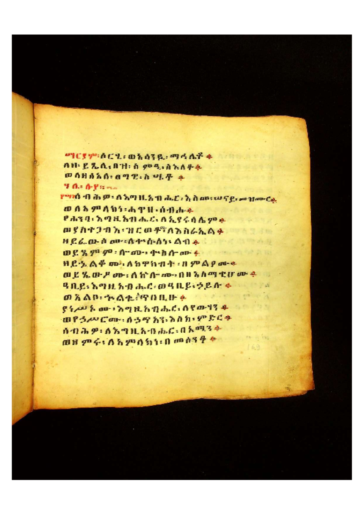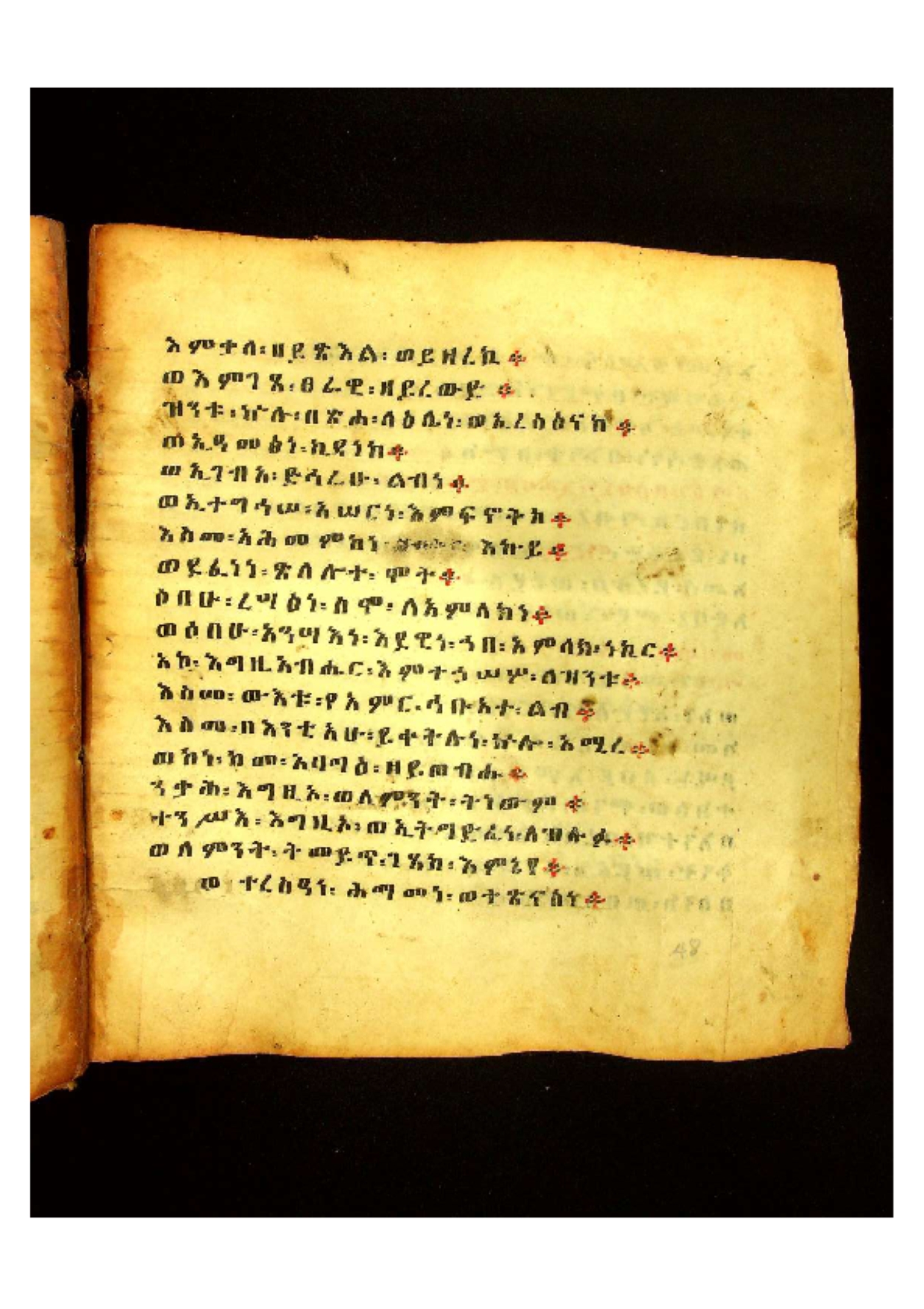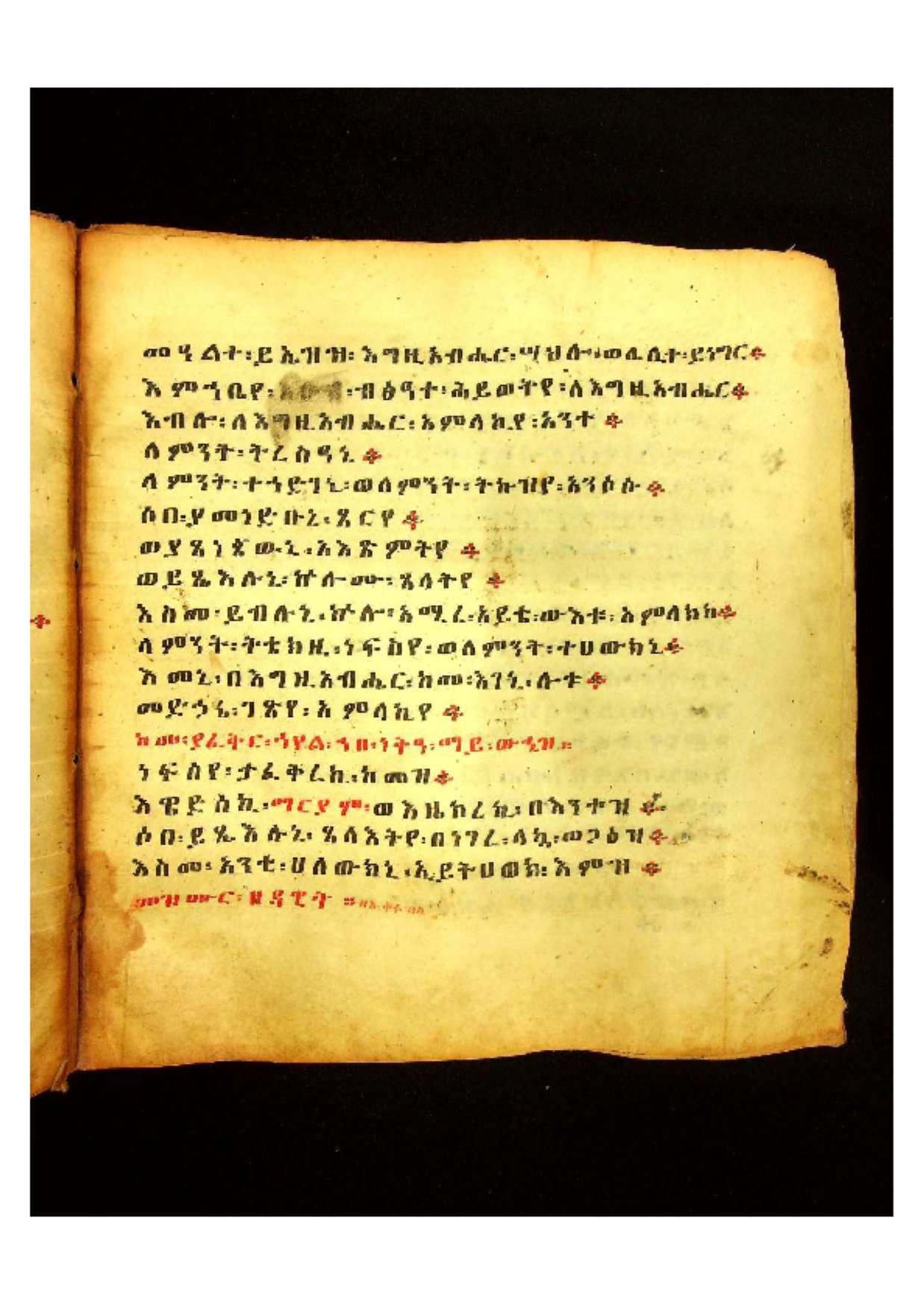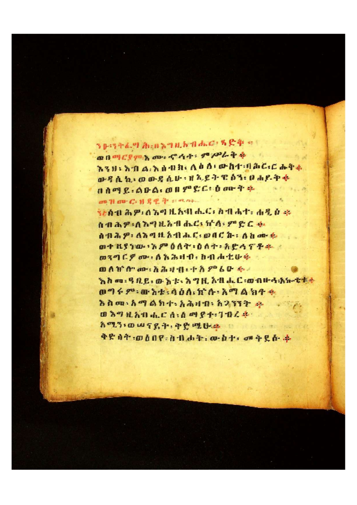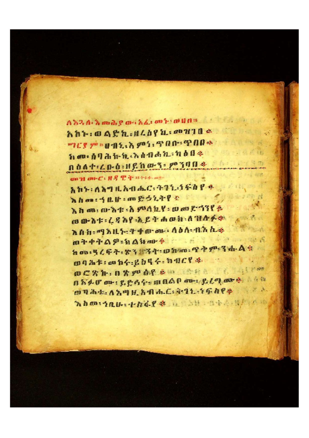 1. F. 2r: donation note written vertically in the outer margin, in black ink: “alla famiglia Bruschettini, Pussy […] Battaglia dell’Amba Aradam il 16 febbraio 1936 XIV”. The note, written in Italian and partly illegible, indicates the Bruschettini family as the receiver of the book and mentions the Battle of Amba Aradam, which took place on 16 February 1936. 2. F. 5r: note written in Italian in the outer upper margin, in red pencil: “Amba Aradam 16/2/XIV ore 17.30 P. Paloboni (?)”. This note also mentions the Battle of Amba Aradam, together with an individual whose name is partially unclear (P. Paloboni?). 3. F. 173v: supplication note written in small script in a mediocre hand, at the end of the “Psalms of David”: ዕቀበኒ፡ እምዓይነ፡ ደዌ፡ ወሞት፡ ለገብርከ፡ ደቅስዮስ፡, “protect me, your servant Däqsəyos, from the eye of infirmity and death”. The note mentions a certain Däqsəyos, indicated as “your servant” (possibly a later owner of the codex). 4. F. 173v: incipit of the Gəʿəz and Amharic prayer, perhaps a writing exercise. The note is written in an inaccurate calligraphy on the outer margin of the folio, next to the prayer. The entire text is የህፂ፡ ኖኅን፡ ከማየ[፡] አይኅ። እስራኤልን፡ ከፈርዖን፡ ዳዊትን፡ ከሳኦል፡ ከኢሎፍሊ። ኤ. 5. F. 190v: donation note, written in black ink in a mediocre hand. Text: ዝመጽሐፍ፡ ዘደብተራ፡ ኪሮስ፡ ዘወሀቦ፡ ለታቦተ፡ ሚካኤል፡ ኢትርስዑኒ፡ በአቡነ፡ ዘበሰማያት፡ ዘአቡየ፡ ገብረ፡ ማርያም፡ ወለእምየ፡ ወለተ፡ ሩፋኤል፡, “This book belongs to däbtära Kiros, who donated it to the tabot of [the church of St] Michael. Do not forget me for our Father who is in heaven. [It also belongs] to my father Gäbrä Maryam and my mother Wälättä Rufaʾel”. 6. F. 199v: writings executed in an inaccurate hand, perhaps the same of note 4. The note includes pen trials (ፈቲነ፡ ብርዕ፡ ዘፈረና፡ etc.), reproduces the explicit of the “Song of the songs” (ስብሐታተኪ፡ ማርያም፡ ከመ፡ እንተ፡ ሕልቀት፡ etc.) and the incipit of the “Praise of Mary” (ውዳሴ፡ ዘሰኑይ፡ ፈቀደ፡ እግዚእ፡ etc., partly rubricated). The writings also mention Däqsəyos, indicated as “your servant” (possibly a later owner of the codex) 7. F. 220ra–va: Genealogic note written on two columns. The note illustrates the family tree of King Yoḥannǝs I, who reigned from 1667 to 1682. The text is acephalous. Incipit: [ወለ]ደ፡ እምሐና፡ ብእሲቱ፡ አሦተ፡ ቅዱሳንሃ፡ ወአሦተ፡ ቅዱሳንኒ፡ እምነ፡ ጳውሊ፡ ብእሲሃ፡ ወለደቶሙ፡ ለአቤተኁን፡ ማእምሮ፡ ወለዘሥላሴ፡ ወአቤተኁን፡ ማእምሮኒ፡ ወለደ፡ አቃርዮስ፡ ወአቃርዮስኒ፡ ወለደ፡ እመቤት፡ እኅተ፡ ክርስቶስሃ፡. The text is published and translated in Proverbio D.V., 2000, ‘Inventario sommario dei manoscritti arabi, ebraici, etiopici – con notizia dei turchi – conservati presso la Biblioteca della Badia di Grottaferrata’. Atti della Accademia nazionale dei Lincei, Memorie, Classe di scienze morali, storiche e filologiche, serie IX, 12 (2000), 468–570 (here pp. 496–97, Appendice III). 8. F. 220va–b: Protective prayer against snakes, written on two columns. Incipit: በስመ፡ አብ፡ … ጸሎት፡ በእንተ፡ ዓርዌ፡ ምድር። ሶበ፡ በጽሐ፡ መልእክት፡ ሐሰውከ፡ በል፡ ፫ጊዜ፡ አኂዘከ፡ ዘፈረ፡ ልብሰ፡ ለእመ፡ ሀሎ፡ ርሑቀ፡ አስትዮ፡. The prayer is probably written in the same hand of note 7. 9. F. 220vb: Unidentified magic prayer containing asmat-names. Incipit: በስመ፡ አብ፡ … ኦላዘላህም፡ አህጉረ፡ ቀዳ[.]፡ ፍሖም፡ ሊስ፡ አፍሊስ፡ ምልክዮስ፡ ዘ[..]ማኤል፡ በዝንቱ፡ አስማቲከ፡ [.]ጽ[..] ኃይለ፡ በረድ፡ ወነፋስ፡ ከማሁ፡. |