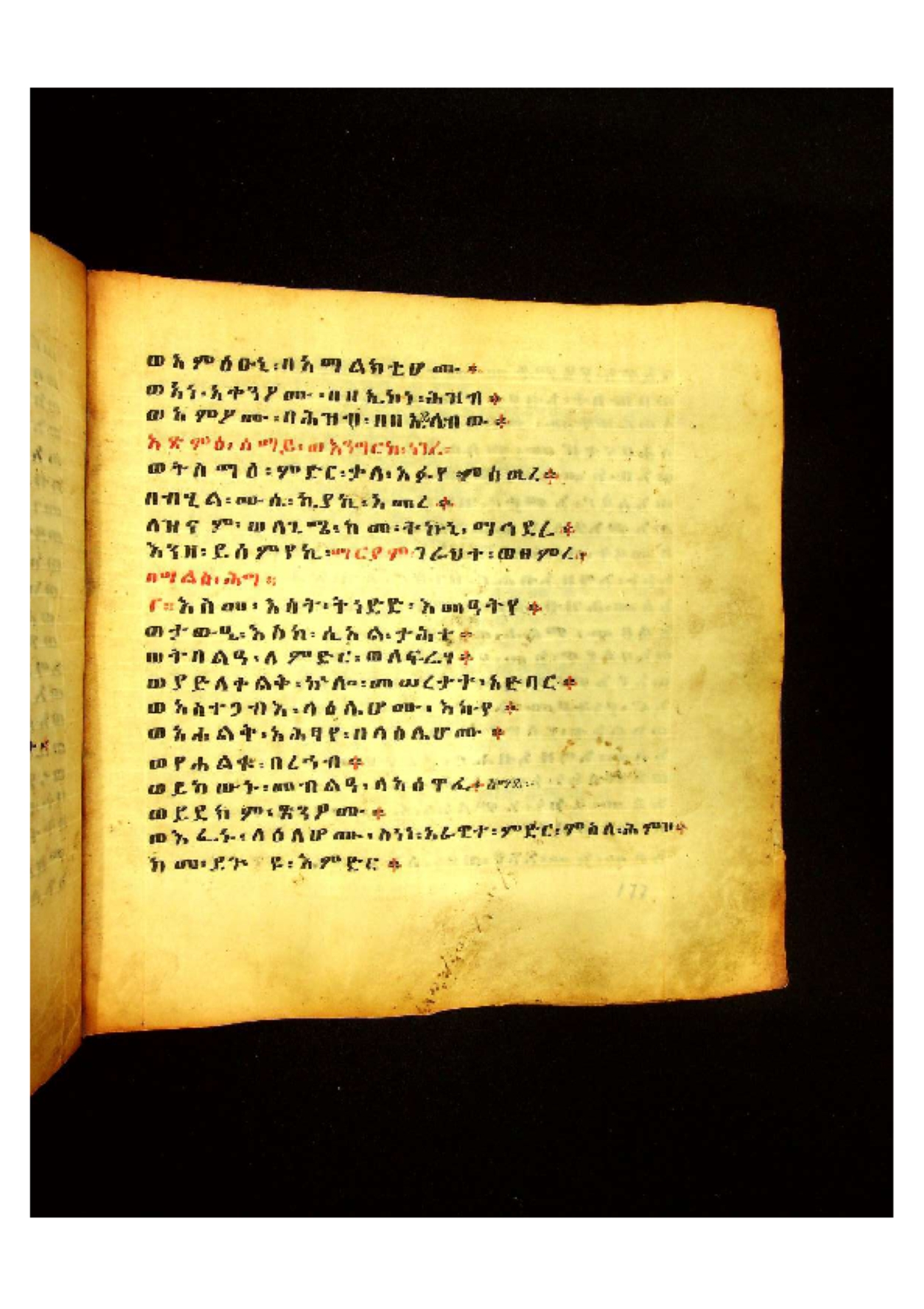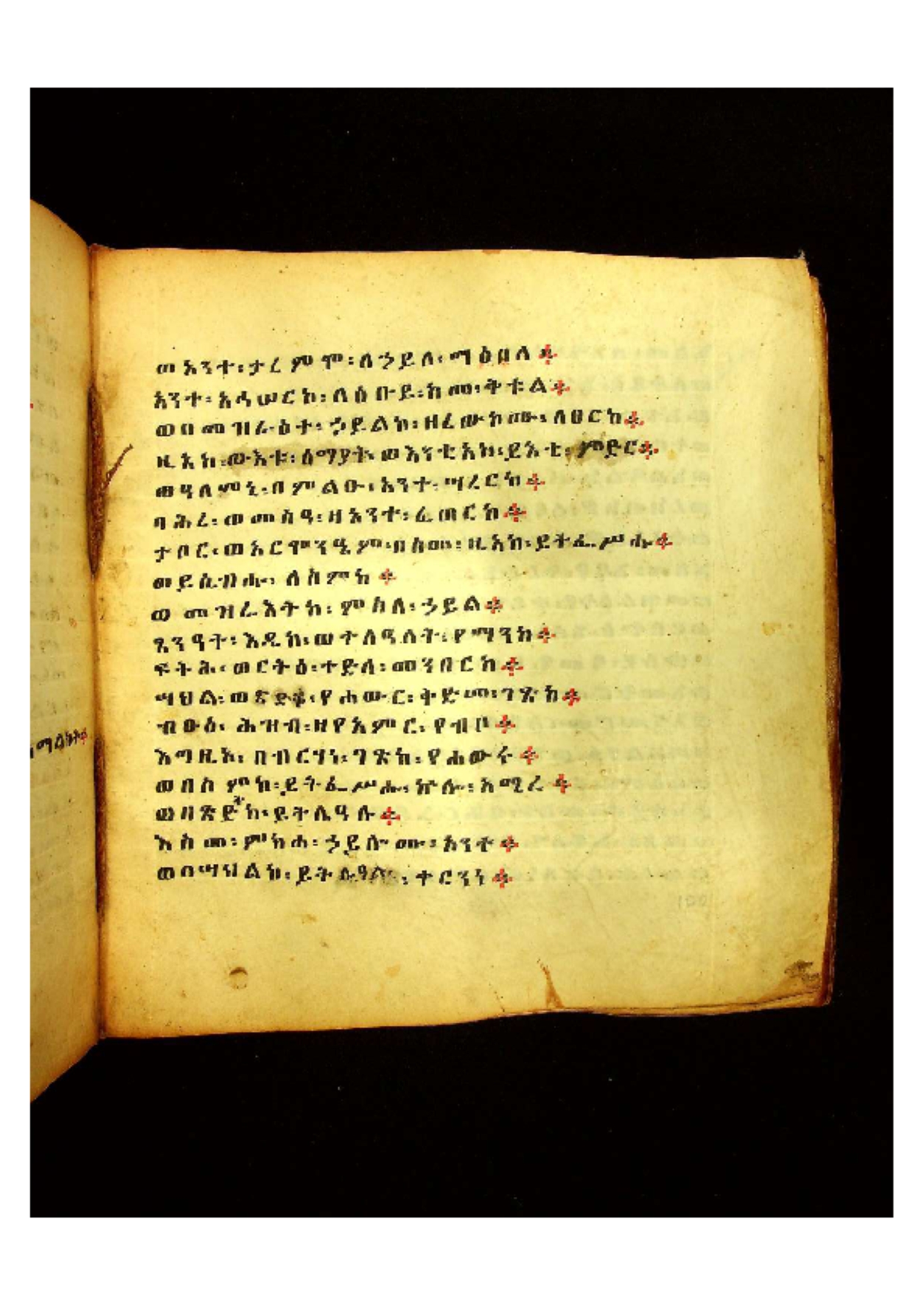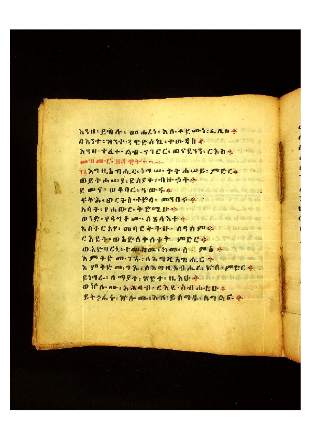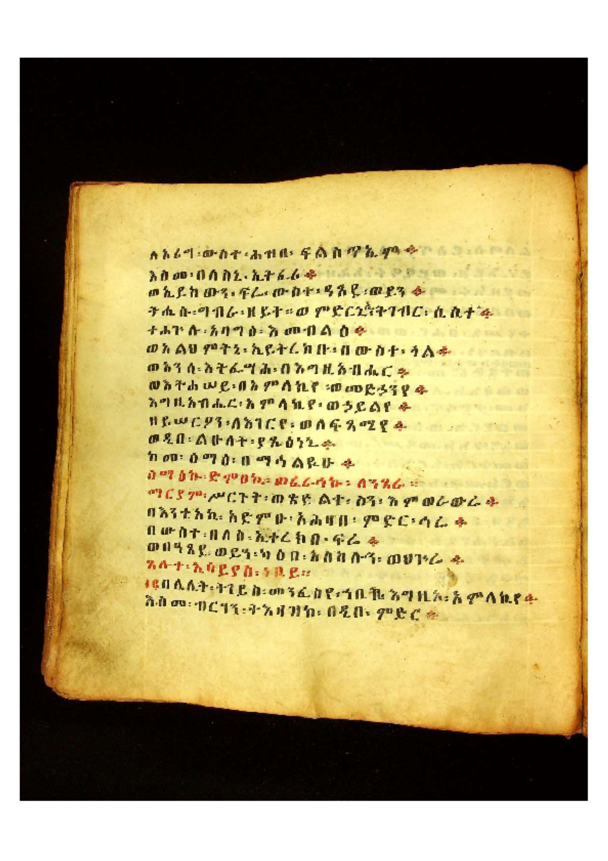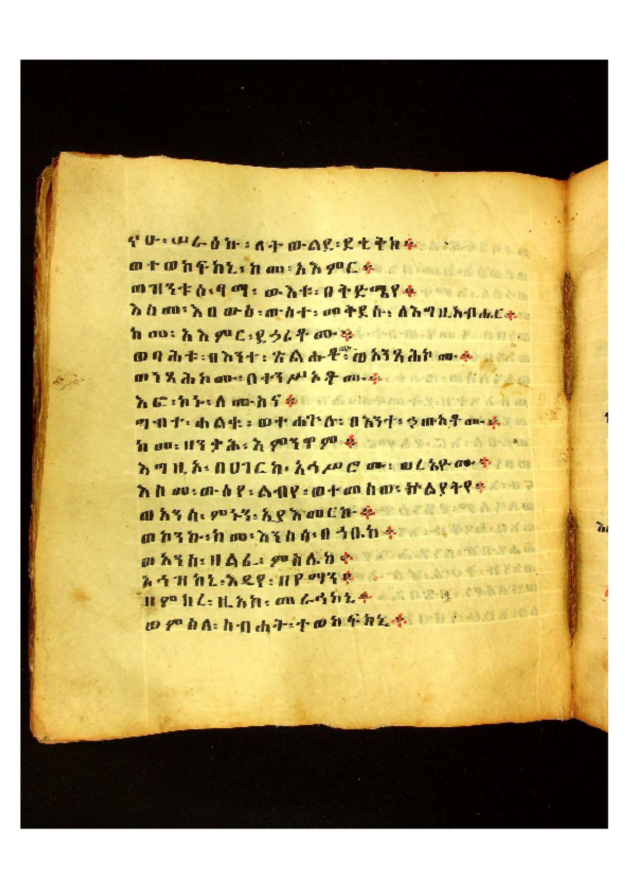 1. F. 2r: donation note written vertically in the outer margin, in black ink: “alla famiglia Bruschettini, Pussy […] Battaglia dell’Amba Aradam il 16 febbraio 1936 XIV”. The note, written in Italian and partly illegible, indicates the Bruschettini family as the receiver of the book and mentions the Battle of Amba Aradam, which took place on 16 February 1936. 2. F. 5r: note written in Italian in the outer upper margin, in red pencil: “Amba Aradam 16/2/XIV ore 17.30 P. Paloboni (?)”. This note also mentions the Battle of Amba Aradam, together with an individual whose name is partially unclear (P. Paloboni?). 3. F. 173v: supplication note written in small script in a mediocre hand, at the end of the “Psalms of David”: ዕቀበኒ፡ እምዓይነ፡ ደዌ፡ ወሞት፡ ለገብርከ፡ ደቅስዮስ፡, “protect me, your servant Däqsəyos, from the eye of infirmity and death”. The note mentions a certain Däqsəyos, indicated as “your servant” (possibly a later owner of the codex). 4. F. 173v: incipit of the Gəʿəz and Amharic prayer, perhaps a writing exercise. The note is written in an inaccurate calligraphy on the outer margin of the folio, next to the prayer. The entire text is የህፂ፡ ኖኅን፡ ከማየ[፡] አይኅ። እስራኤልን፡ ከፈርዖን፡ ዳዊትን፡ ከሳኦል፡ ከኢሎፍሊ። ኤ. 5. F. 190v: donation note, written in black ink in a mediocre hand. Text: ዝመጽሐፍ፡ ዘደብተራ፡ ኪሮስ፡ ዘወሀቦ፡ ለታቦተ፡ ሚካኤል፡ ኢትርስዑኒ፡ በአቡነ፡ ዘበሰማያት፡ ዘአቡየ፡ ገብረ፡ ማርያም፡ ወለእምየ፡ ወለተ፡ ሩፋኤል፡, “This book belongs to däbtära Kiros, who donated it to the tabot of [the church of St] Michael. Do not forget me for our Father who is in heaven. [It also belongs] to my father Gäbrä Maryam and my mother Wälättä Rufaʾel”. 6. F. 199v: writings executed in an inaccurate hand, perhaps the same of note 4. The note includes pen trials (ፈቲነ፡ ብርዕ፡ ዘፈረና፡ etc.), reproduces the explicit of the “Song of the songs” (ስብሐታተኪ፡ ማርያም፡ ከመ፡ እንተ፡ ሕልቀት፡ etc.) and the incipit of the “Praise of Mary” (ውዳሴ፡ ዘሰኑይ፡ ፈቀደ፡ እግዚእ፡ etc., partly rubricated). The writings also mention Däqsəyos, indicated as “your servant” (possibly a later owner of the codex) 7. F. 220ra–va: Genealogic note written on two columns. The note illustrates the family tree of King Yoḥannǝs I, who reigned from 1667 to 1682. The text is acephalous. Incipit: [ወለ]ደ፡ እምሐና፡ ብእሲቱ፡ አሦተ፡ ቅዱሳንሃ፡ ወአሦተ፡ ቅዱሳንኒ፡ እምነ፡ ጳውሊ፡ ብእሲሃ፡ ወለደቶሙ፡ ለአቤተኁን፡ ማእምሮ፡ ወለዘሥላሴ፡ ወአቤተኁን፡ ማእምሮኒ፡ ወለደ፡ አቃርዮስ፡ ወአቃርዮስኒ፡ ወለደ፡ እመቤት፡ እኅተ፡ ክርስቶስሃ፡. The text is published and translated in Proverbio D.V., 2000, ‘Inventario sommario dei manoscritti arabi, ebraici, etiopici – con notizia dei turchi – conservati presso la Biblioteca della Badia di Grottaferrata’. Atti della Accademia nazionale dei Lincei, Memorie, Classe di scienze morali, storiche e filologiche, serie IX, 12 (2000), 468–570 (here pp. 496–97, Appendice III). 8. F. 220va–b: Protective prayer against snakes, written on two columns. Incipit: በስመ፡ አብ፡ … ጸሎት፡ በእንተ፡ ዓርዌ፡ ምድር። ሶበ፡ በጽሐ፡ መልእክት፡ ሐሰውከ፡ በል፡ ፫ጊዜ፡ አኂዘከ፡ ዘፈረ፡ ልብሰ፡ ለእመ፡ ሀሎ፡ ርሑቀ፡ አስትዮ፡. The prayer is probably written in the same hand of note 7. 9. F. 220vb: Unidentified magic prayer containing asmat-names. Incipit: በስመ፡ አብ፡ … ኦላዘላህም፡ አህጉረ፡ ቀዳ[.]፡ ፍሖም፡ ሊስ፡ አፍሊስ፡ ምልክዮስ፡ ዘ[..]ማኤል፡ በዝንቱ፡ አስማቲከ፡ [.]ጽ[..] ኃይለ፡ በረድ፡ ወነፋስ፡ ከማሁ፡. |