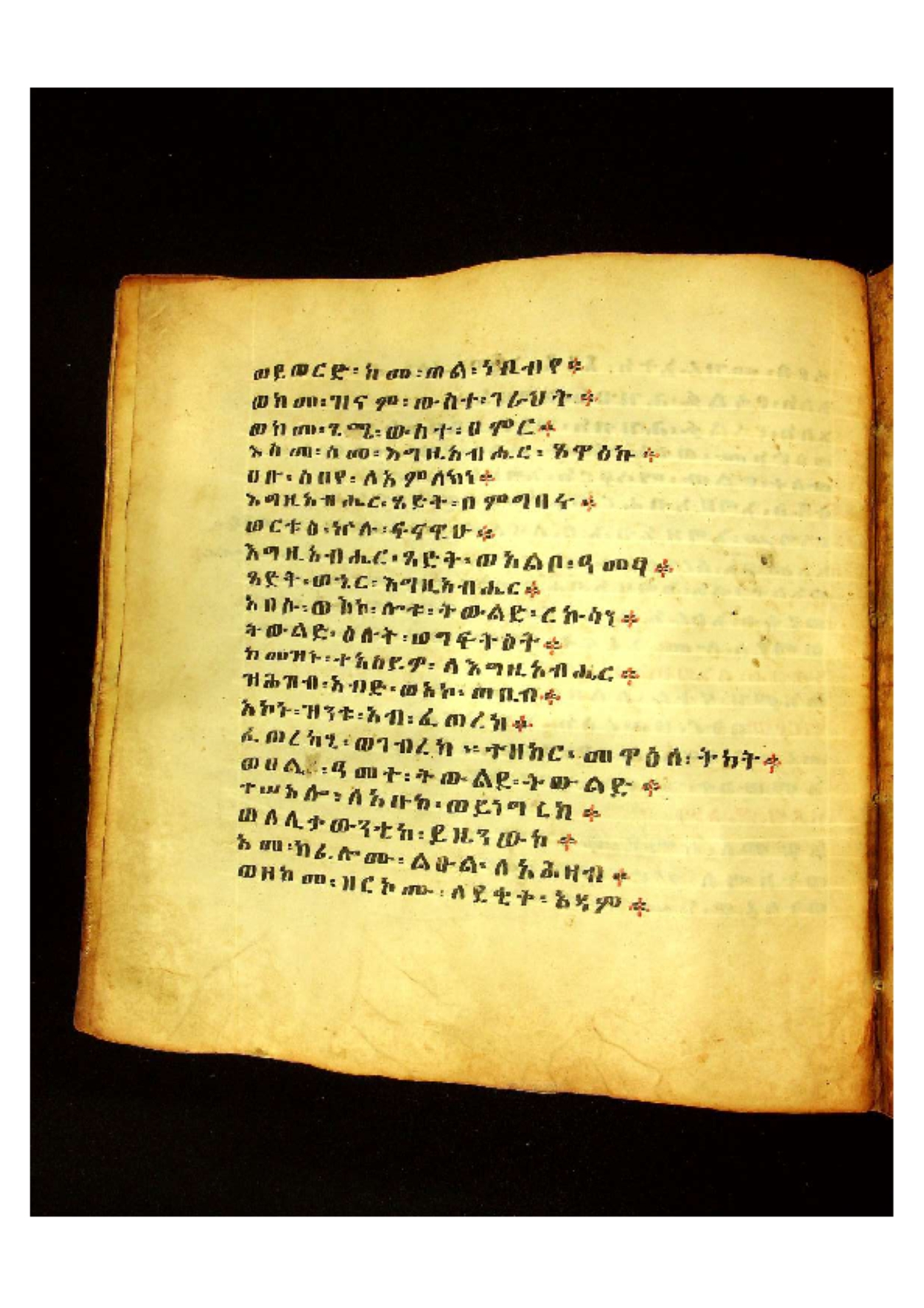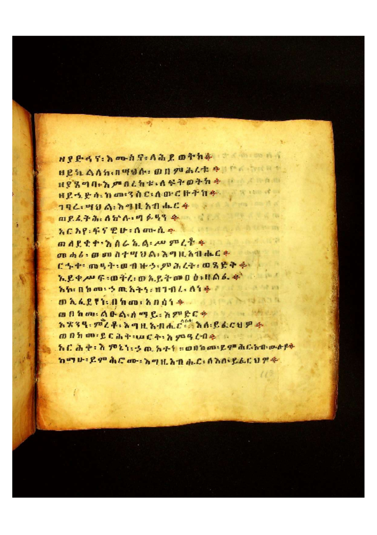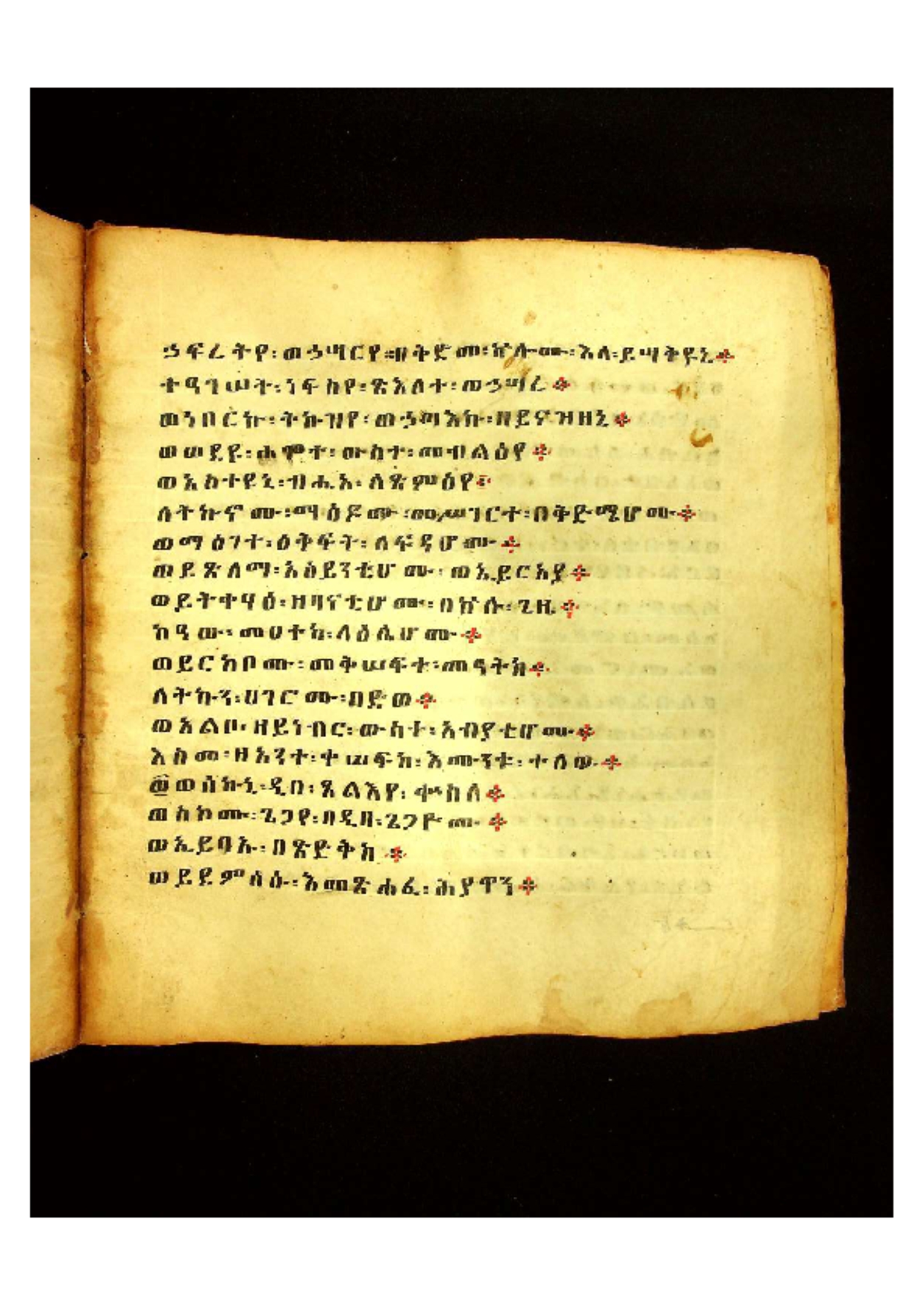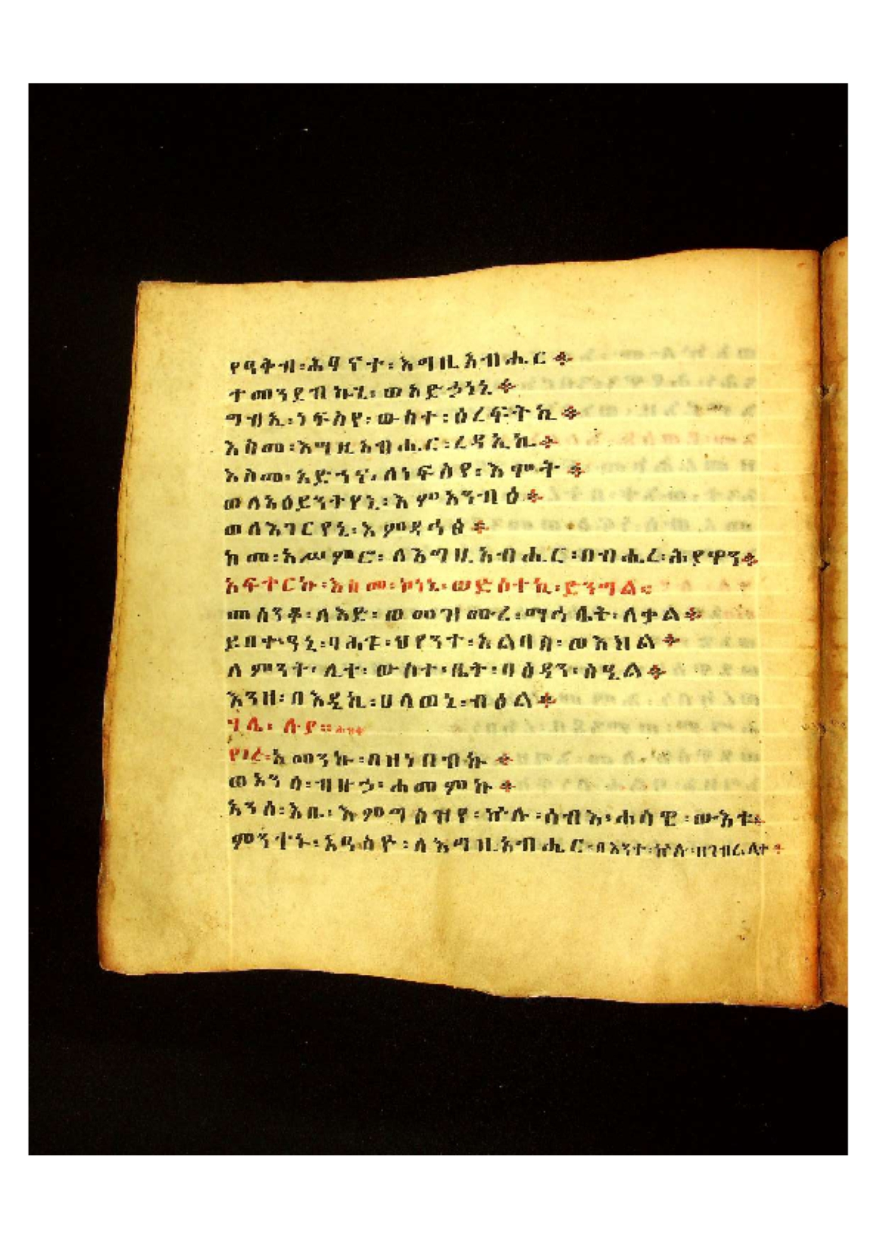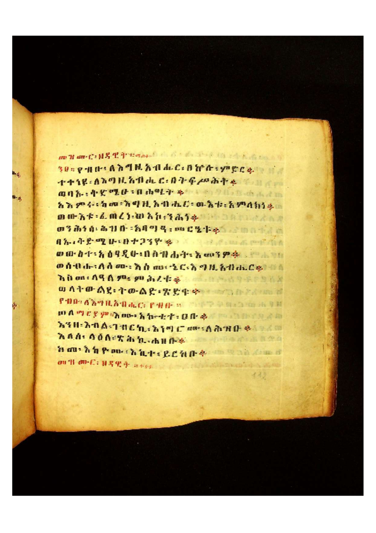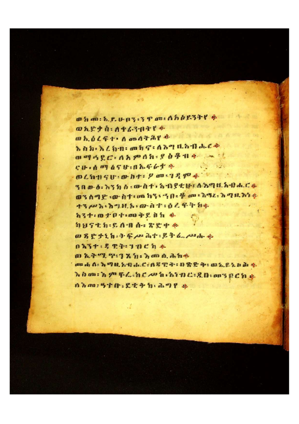 1. F. 2r: donation note written vertically in the outer margin, in black ink: “alla famiglia Bruschettini, Pussy […] Battaglia dell’Amba Aradam il 16 febbraio 1936 XIV”. The note, written in Italian and partly illegible, indicates the Bruschettini family as the receiver of the book and mentions the Battle of Amba Aradam, which took place on 16 February 1936. 2. F. 5r: note written in Italian in the outer upper margin, in red pencil: “Amba Aradam 16/2/XIV ore 17.30 P. Paloboni (?)”. This note also mentions the Battle of Amba Aradam, together with an individual whose name is partially unclear (P. Paloboni?). 3. F. 173v: supplication note written in small script in a mediocre hand, at the end of the “Psalms of David”: ዕቀበኒ፡ እምዓይነ፡ ደዌ፡ ወሞት፡ ለገብርከ፡ ደቅስዮስ፡, “protect me, your servant Däqsəyos, from the eye of infirmity and death”. The note mentions a certain Däqsəyos, indicated as “your servant” (possibly a later owner of the codex). 4. F. 173v: incipit of the Gəʿəz and Amharic prayer, perhaps a writing exercise. The note is written in an inaccurate calligraphy on the outer margin of the folio, next to the prayer. The entire text is የህፂ፡ ኖኅን፡ ከማየ[፡] አይኅ። እስራኤልን፡ ከፈርዖን፡ ዳዊትን፡ ከሳኦል፡ ከኢሎፍሊ። ኤ. 5. F. 190v: donation note, written in black ink in a mediocre hand. Text: ዝመጽሐፍ፡ ዘደብተራ፡ ኪሮስ፡ ዘወሀቦ፡ ለታቦተ፡ ሚካኤል፡ ኢትርስዑኒ፡ በአቡነ፡ ዘበሰማያት፡ ዘአቡየ፡ ገብረ፡ ማርያም፡ ወለእምየ፡ ወለተ፡ ሩፋኤል፡, “This book belongs to däbtära Kiros, who donated it to the tabot of [the church of St] Michael. Do not forget me for our Father who is in heaven. [It also belongs] to my father Gäbrä Maryam and my mother Wälättä Rufaʾel”. 6. F. 199v: writings executed in an inaccurate hand, perhaps the same of note 4. The note includes pen trials (ፈቲነ፡ ብርዕ፡ ዘፈረና፡ etc.), reproduces the explicit of the “Song of the songs” (ስብሐታተኪ፡ ማርያም፡ ከመ፡ እንተ፡ ሕልቀት፡ etc.) and the incipit of the “Praise of Mary” (ውዳሴ፡ ዘሰኑይ፡ ፈቀደ፡ እግዚእ፡ etc., partly rubricated). The writings also mention Däqsəyos, indicated as “your servant” (possibly a later owner of the codex) 7. F. 220ra–va: Genealogic note written on two columns. The note illustrates the family tree of King Yoḥannǝs I, who reigned from 1667 to 1682. The text is acephalous. Incipit: [ወለ]ደ፡ እምሐና፡ ብእሲቱ፡ አሦተ፡ ቅዱሳንሃ፡ ወአሦተ፡ ቅዱሳንኒ፡ እምነ፡ ጳውሊ፡ ብእሲሃ፡ ወለደቶሙ፡ ለአቤተኁን፡ ማእምሮ፡ ወለዘሥላሴ፡ ወአቤተኁን፡ ማእምሮኒ፡ ወለደ፡ አቃርዮስ፡ ወአቃርዮስኒ፡ ወለደ፡ እመቤት፡ እኅተ፡ ክርስቶስሃ፡. The text is published and translated in Proverbio D.V., 2000, ‘Inventario sommario dei manoscritti arabi, ebraici, etiopici – con notizia dei turchi – conservati presso la Biblioteca della Badia di Grottaferrata’. Atti della Accademia nazionale dei Lincei, Memorie, Classe di scienze morali, storiche e filologiche, serie IX, 12 (2000), 468–570 (here pp. 496–97, Appendice III). 8. F. 220va–b: Protective prayer against snakes, written on two columns. Incipit: በስመ፡ አብ፡ … ጸሎት፡ በእንተ፡ ዓርዌ፡ ምድር። ሶበ፡ በጽሐ፡ መልእክት፡ ሐሰውከ፡ በል፡ ፫ጊዜ፡ አኂዘከ፡ ዘፈረ፡ ልብሰ፡ ለእመ፡ ሀሎ፡ ርሑቀ፡ አስትዮ፡. The prayer is probably written in the same hand of note 7. 9. F. 220vb: Unidentified magic prayer containing asmat-names. Incipit: በስመ፡ አብ፡ … ኦላዘላህም፡ አህጉረ፡ ቀዳ[.]፡ ፍሖም፡ ሊስ፡ አፍሊስ፡ ምልክዮስ፡ ዘ[..]ማኤል፡ በዝንቱ፡ አስማቲከ፡ [.]ጽ[..] ኃይለ፡ በረድ፡ ወነፋስ፡ ከማሁ፡. |
