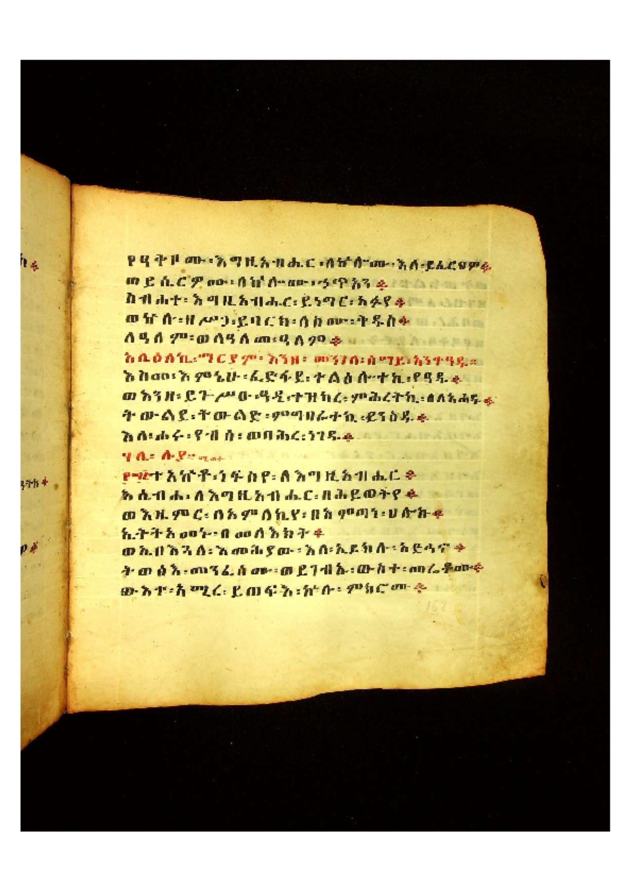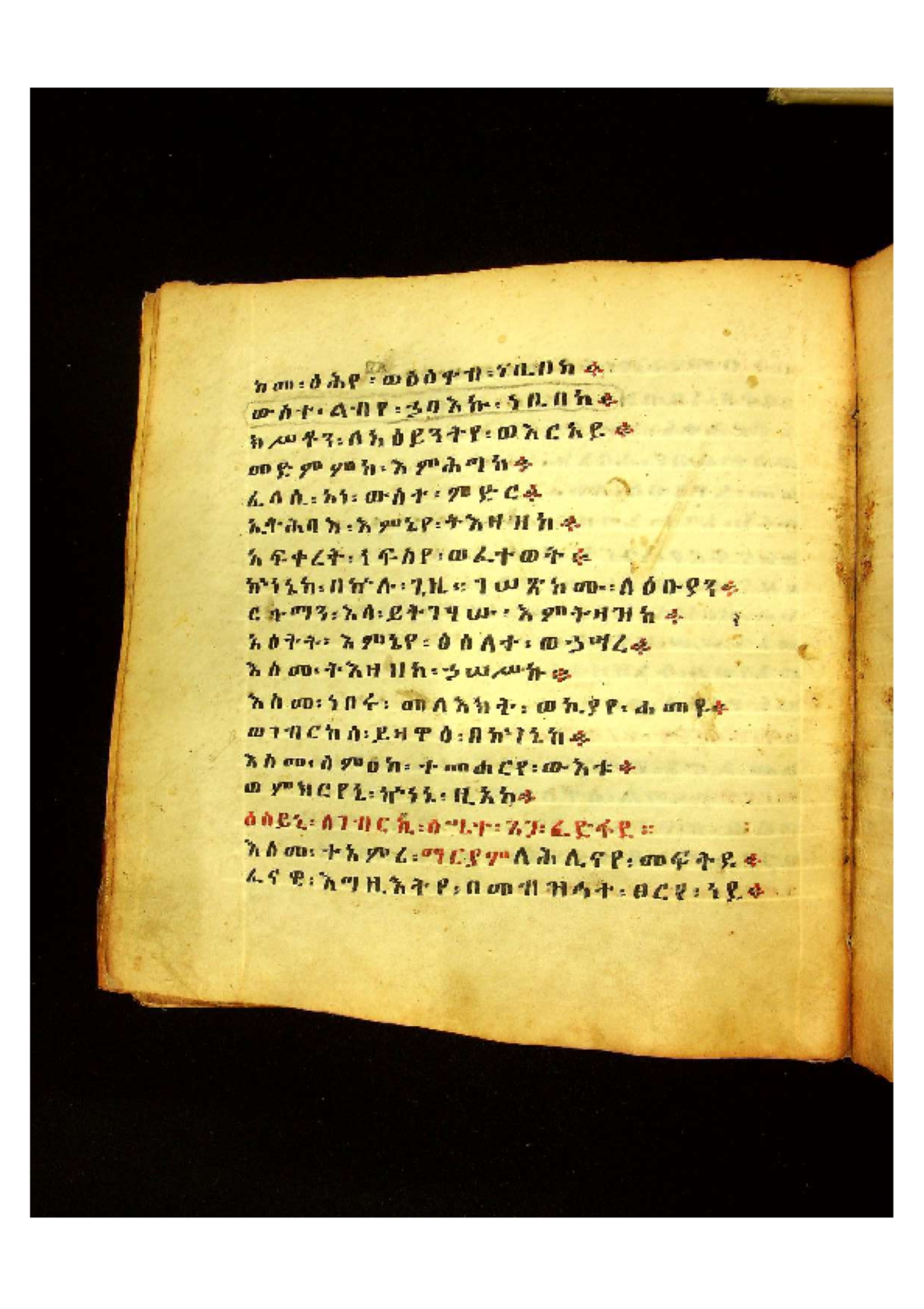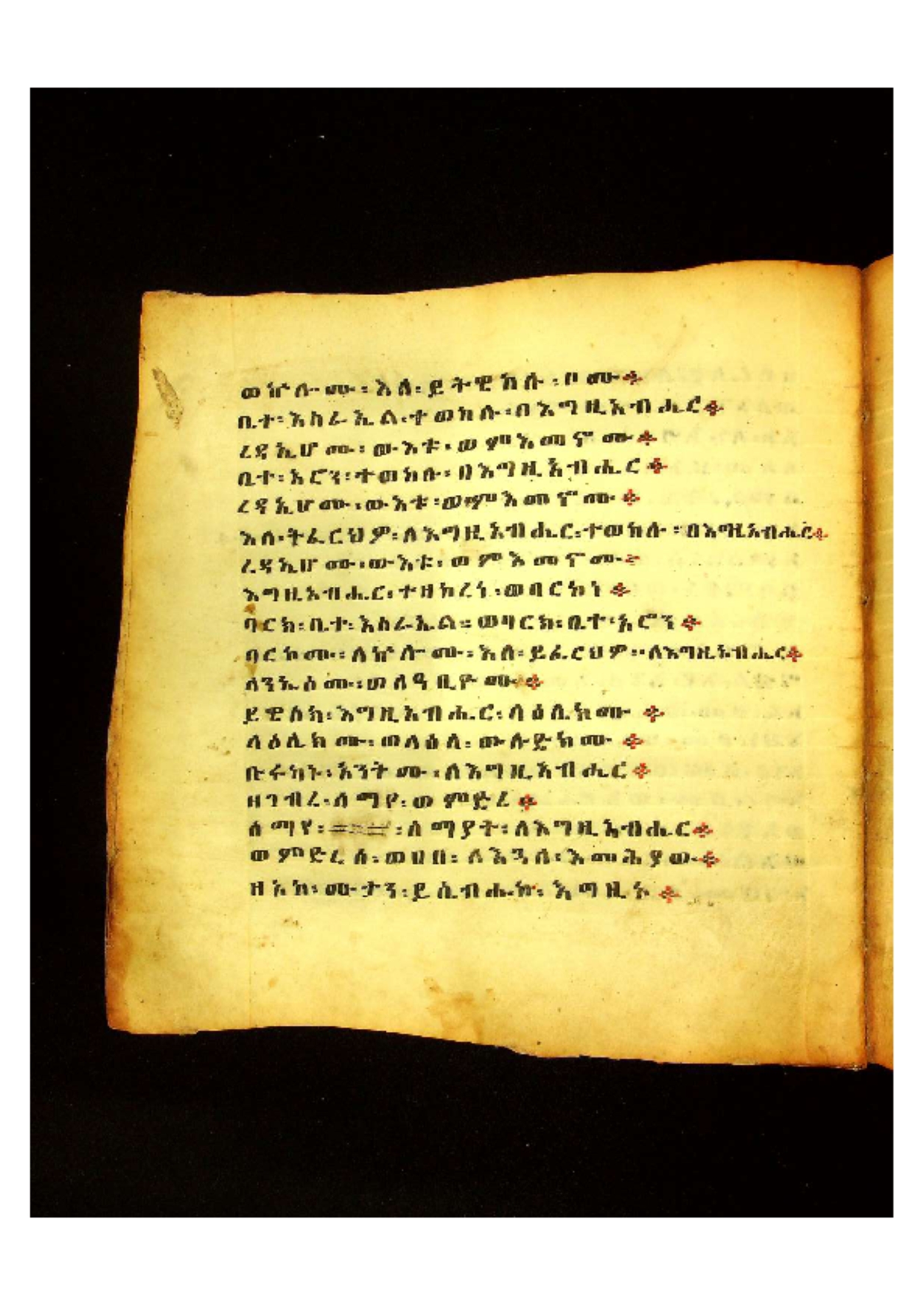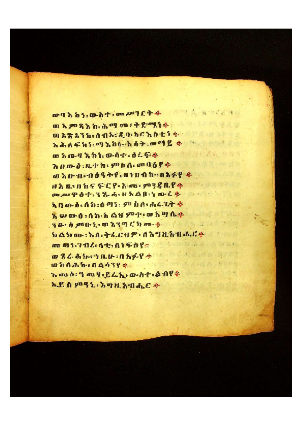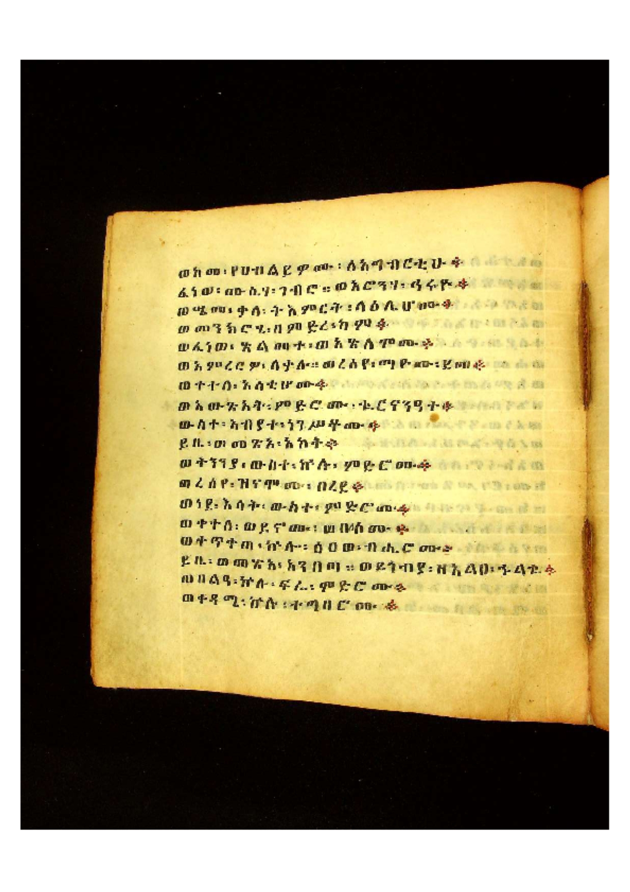 1. F. 2r: donation note written vertically in the outer margin, in black ink: “alla famiglia Bruschettini, Pussy […] Battaglia dell’Amba Aradam il 16 febbraio 1936 XIV”. The note, written in Italian and partly illegible, indicates the Bruschettini family as the receiver of the book and mentions the Battle of Amba Aradam, which took place on 16 February 1936. 2. F. 5r: note written in Italian in the outer upper margin, in red pencil: “Amba Aradam 16/2/XIV ore 17.30 P. Paloboni (?)”. This note also mentions the Battle of Amba Aradam, together with an individual whose name is partially unclear (P. Paloboni?). 3. F. 173v: supplication note written in small script in a mediocre hand, at the end of the “Psalms of David”: ዕቀበኒ፡ እምዓይነ፡ ደዌ፡ ወሞት፡ ለገብርከ፡ ደቅስዮስ፡, “protect me, your servant Däqsəyos, from the eye of infirmity and death”. The note mentions a certain Däqsəyos, indicated as “your servant” (possibly a later owner of the codex). 4. F. 173v: incipit of the Gəʿəz and Amharic prayer, perhaps a writing exercise. The note is written in an inaccurate calligraphy on the outer margin of the folio, next to the prayer. The entire text is የህፂ፡ ኖኅን፡ ከማየ[፡] አይኅ። እስራኤልን፡ ከፈርዖን፡ ዳዊትን፡ ከሳኦል፡ ከኢሎፍሊ። ኤ. 5. F. 190v: donation note, written in black ink in a mediocre hand. Text: ዝመጽሐፍ፡ ዘደብተራ፡ ኪሮስ፡ ዘወሀቦ፡ ለታቦተ፡ ሚካኤል፡ ኢትርስዑኒ፡ በአቡነ፡ ዘበሰማያት፡ ዘአቡየ፡ ገብረ፡ ማርያም፡ ወለእምየ፡ ወለተ፡ ሩፋኤል፡, “This book belongs to däbtära Kiros, who donated it to the tabot of [the church of St] Michael. Do not forget me for our Father who is in heaven. [It also belongs] to my father Gäbrä Maryam and my mother Wälättä Rufaʾel”. 6. F. 199v: writings executed in an inaccurate hand, perhaps the same of note 4. The note includes pen trials (ፈቲነ፡ ብርዕ፡ ዘፈረና፡ etc.), reproduces the explicit of the “Song of the songs” (ስብሐታተኪ፡ ማርያም፡ ከመ፡ እንተ፡ ሕልቀት፡ etc.) and the incipit of the “Praise of Mary” (ውዳሴ፡ ዘሰኑይ፡ ፈቀደ፡ እግዚእ፡ etc., partly rubricated). The writings also mention Däqsəyos, indicated as “your servant” (possibly a later owner of the codex) 7. F. 220ra–va: Genealogic note written on two columns. The note illustrates the family tree of King Yoḥannǝs I, who reigned from 1667 to 1682. The text is acephalous. Incipit: [ወለ]ደ፡ እምሐና፡ ብእሲቱ፡ አሦተ፡ ቅዱሳንሃ፡ ወአሦተ፡ ቅዱሳንኒ፡ እምነ፡ ጳውሊ፡ ብእሲሃ፡ ወለደቶሙ፡ ለአቤተኁን፡ ማእምሮ፡ ወለዘሥላሴ፡ ወአቤተኁን፡ ማእምሮኒ፡ ወለደ፡ አቃርዮስ፡ ወአቃርዮስኒ፡ ወለደ፡ እመቤት፡ እኅተ፡ ክርስቶስሃ፡. The text is published and translated in Proverbio D.V., 2000, ‘Inventario sommario dei manoscritti arabi, ebraici, etiopici – con notizia dei turchi – conservati presso la Biblioteca della Badia di Grottaferrata’. Atti della Accademia nazionale dei Lincei, Memorie, Classe di scienze morali, storiche e filologiche, serie IX, 12 (2000), 468–570 (here pp. 496–97, Appendice III). 8. F. 220va–b: Protective prayer against snakes, written on two columns. Incipit: በስመ፡ አብ፡ … ጸሎት፡ በእንተ፡ ዓርዌ፡ ምድር። ሶበ፡ በጽሐ፡ መልእክት፡ ሐሰውከ፡ በል፡ ፫ጊዜ፡ አኂዘከ፡ ዘፈረ፡ ልብሰ፡ ለእመ፡ ሀሎ፡ ርሑቀ፡ አስትዮ፡. The prayer is probably written in the same hand of note 7. 9. F. 220vb: Unidentified magic prayer containing asmat-names. Incipit: በስመ፡ አብ፡ … ኦላዘላህም፡ አህጉረ፡ ቀዳ[.]፡ ፍሖም፡ ሊስ፡ አፍሊስ፡ ምልክዮስ፡ ዘ[..]ማኤል፡ በዝንቱ፡ አስማቲከ፡ [.]ጽ[..] ኃይለ፡ በረድ፡ ወነፋስ፡ ከማሁ፡. |