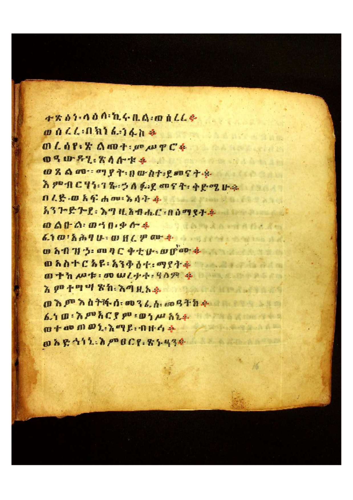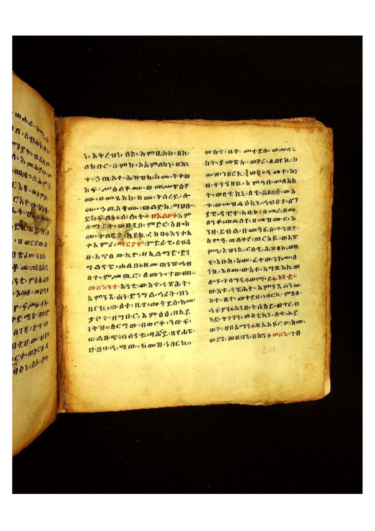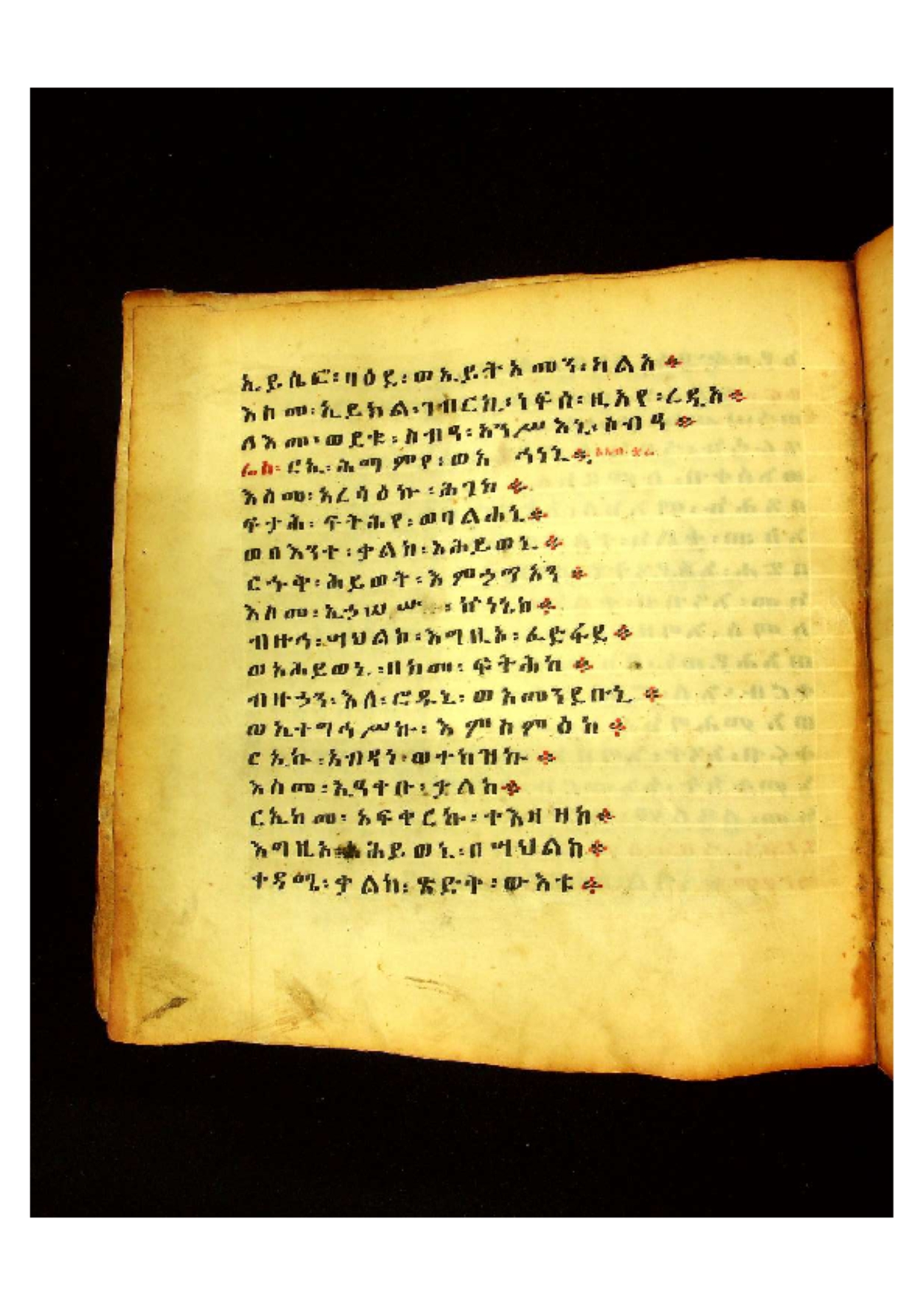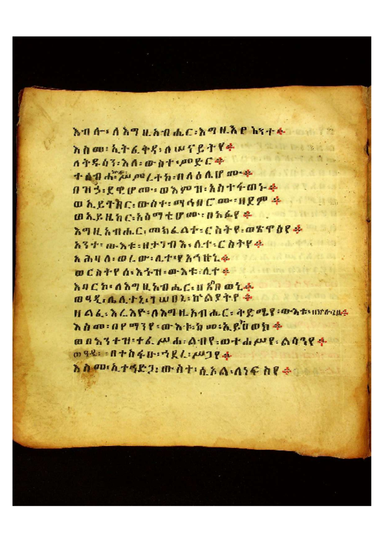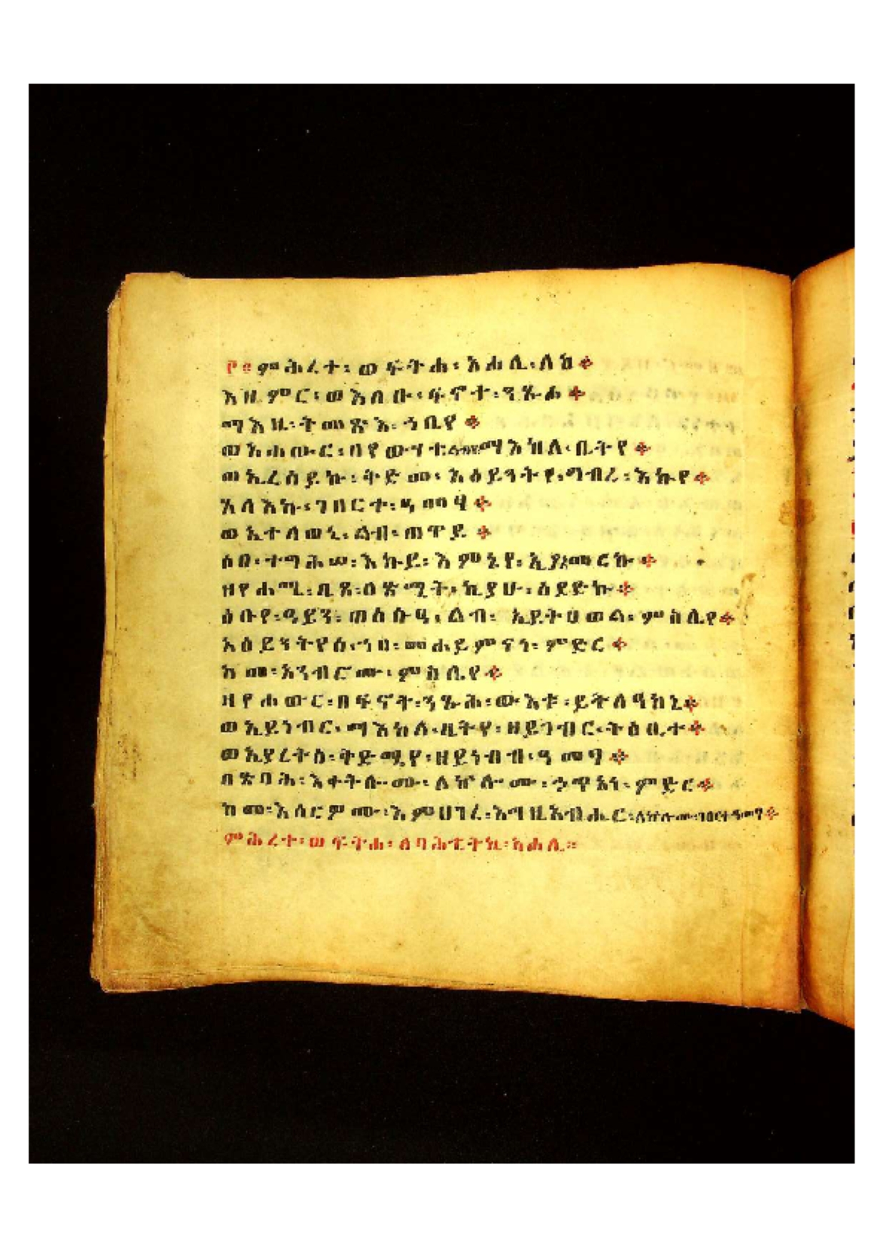 1. F. 2r: donation note written vertically in the outer margin, in black ink: “alla famiglia Bruschettini, Pussy […] Battaglia dell’Amba Aradam il 16 febbraio 1936 XIV”. The note, written in Italian and partly illegible, indicates the Bruschettini family as the receiver of the book and mentions the Battle of Amba Aradam, which took place on 16 February 1936. 2. F. 5r: note written in Italian in the outer upper margin, in red pencil: “Amba Aradam 16/2/XIV ore 17.30 P. Paloboni (?)”. This note also mentions the Battle of Amba Aradam, together with an individual whose name is partially unclear (P. Paloboni?). 3. F. 173v: supplication note written in small script in a mediocre hand, at the end of the “Psalms of David”: ዕቀበኒ፡ እምዓይነ፡ ደዌ፡ ወሞት፡ ለገብርከ፡ ደቅስዮስ፡, “protect me, your servant Däqsəyos, from the eye of infirmity and death”. The note mentions a certain Däqsəyos, indicated as “your servant” (possibly a later owner of the codex). 4. F. 173v: incipit of the Gəʿəz and Amharic prayer, perhaps a writing exercise. The note is written in an inaccurate calligraphy on the outer margin of the folio, next to the prayer. The entire text is የህፂ፡ ኖኅን፡ ከማየ[፡] አይኅ። እስራኤልን፡ ከፈርዖን፡ ዳዊትን፡ ከሳኦል፡ ከኢሎፍሊ። ኤ. 5. F. 190v: donation note, written in black ink in a mediocre hand. Text: ዝመጽሐፍ፡ ዘደብተራ፡ ኪሮስ፡ ዘወሀቦ፡ ለታቦተ፡ ሚካኤል፡ ኢትርስዑኒ፡ በአቡነ፡ ዘበሰማያት፡ ዘአቡየ፡ ገብረ፡ ማርያም፡ ወለእምየ፡ ወለተ፡ ሩፋኤል፡, “This book belongs to däbtära Kiros, who donated it to the tabot of [the church of St] Michael. Do not forget me for our Father who is in heaven. [It also belongs] to my father Gäbrä Maryam and my mother Wälättä Rufaʾel”. 6. F. 199v: writings executed in an inaccurate hand, perhaps the same of note 4. The note includes pen trials (ፈቲነ፡ ብርዕ፡ ዘፈረና፡ etc.), reproduces the explicit of the “Song of the songs” (ስብሐታተኪ፡ ማርያም፡ ከመ፡ እንተ፡ ሕልቀት፡ etc.) and the incipit of the “Praise of Mary” (ውዳሴ፡ ዘሰኑይ፡ ፈቀደ፡ እግዚእ፡ etc., partly rubricated). The writings also mention Däqsəyos, indicated as “your servant” (possibly a later owner of the codex) 7. F. 220ra–va: Genealogic note written on two columns. The note illustrates the family tree of King Yoḥannǝs I, who reigned from 1667 to 1682. The text is acephalous. Incipit: [ወለ]ደ፡ እምሐና፡ ብእሲቱ፡ አሦተ፡ ቅዱሳንሃ፡ ወአሦተ፡ ቅዱሳንኒ፡ እምነ፡ ጳውሊ፡ ብእሲሃ፡ ወለደቶሙ፡ ለአቤተኁን፡ ማእምሮ፡ ወለዘሥላሴ፡ ወአቤተኁን፡ ማእምሮኒ፡ ወለደ፡ አቃርዮስ፡ ወአቃርዮስኒ፡ ወለደ፡ እመቤት፡ እኅተ፡ ክርስቶስሃ፡. The text is published and translated in Proverbio D.V., 2000, ‘Inventario sommario dei manoscritti arabi, ebraici, etiopici – con notizia dei turchi – conservati presso la Biblioteca della Badia di Grottaferrata’. Atti della Accademia nazionale dei Lincei, Memorie, Classe di scienze morali, storiche e filologiche, serie IX, 12 (2000), 468–570 (here pp. 496–97, Appendice III). 8. F. 220va–b: Protective prayer against snakes, written on two columns. Incipit: በስመ፡ አብ፡ … ጸሎት፡ በእንተ፡ ዓርዌ፡ ምድር። ሶበ፡ በጽሐ፡ መልእክት፡ ሐሰውከ፡ በል፡ ፫ጊዜ፡ አኂዘከ፡ ዘፈረ፡ ልብሰ፡ ለእመ፡ ሀሎ፡ ርሑቀ፡ አስትዮ፡. The prayer is probably written in the same hand of note 7. 9. F. 220vb: Unidentified magic prayer containing asmat-names. Incipit: በስመ፡ አብ፡ … ኦላዘላህም፡ አህጉረ፡ ቀዳ[.]፡ ፍሖም፡ ሊስ፡ አፍሊስ፡ ምልክዮስ፡ ዘ[..]ማኤል፡ በዝንቱ፡ አስማቲከ፡ [.]ጽ[..] ኃይለ፡ በረድ፡ ወነፋስ፡ ከማሁ፡. |