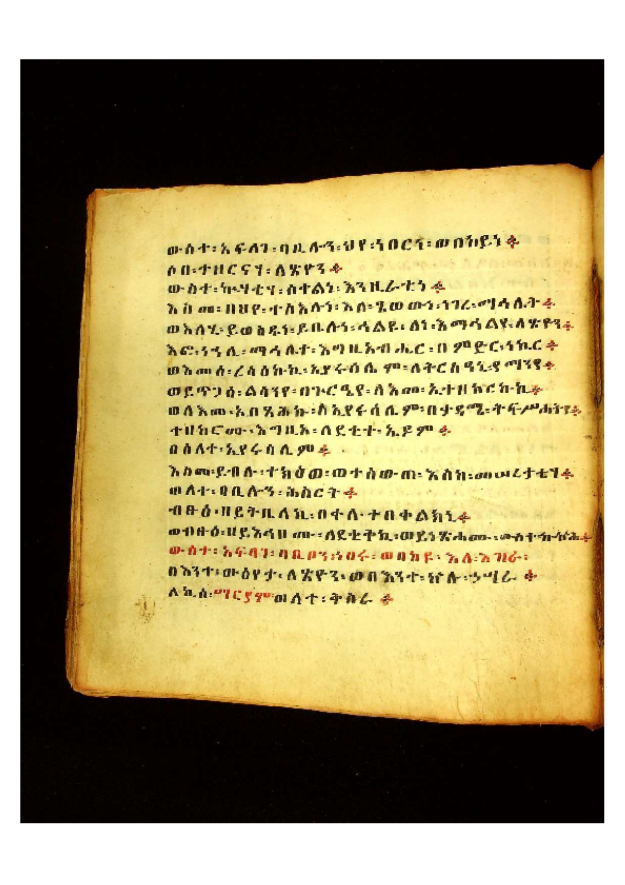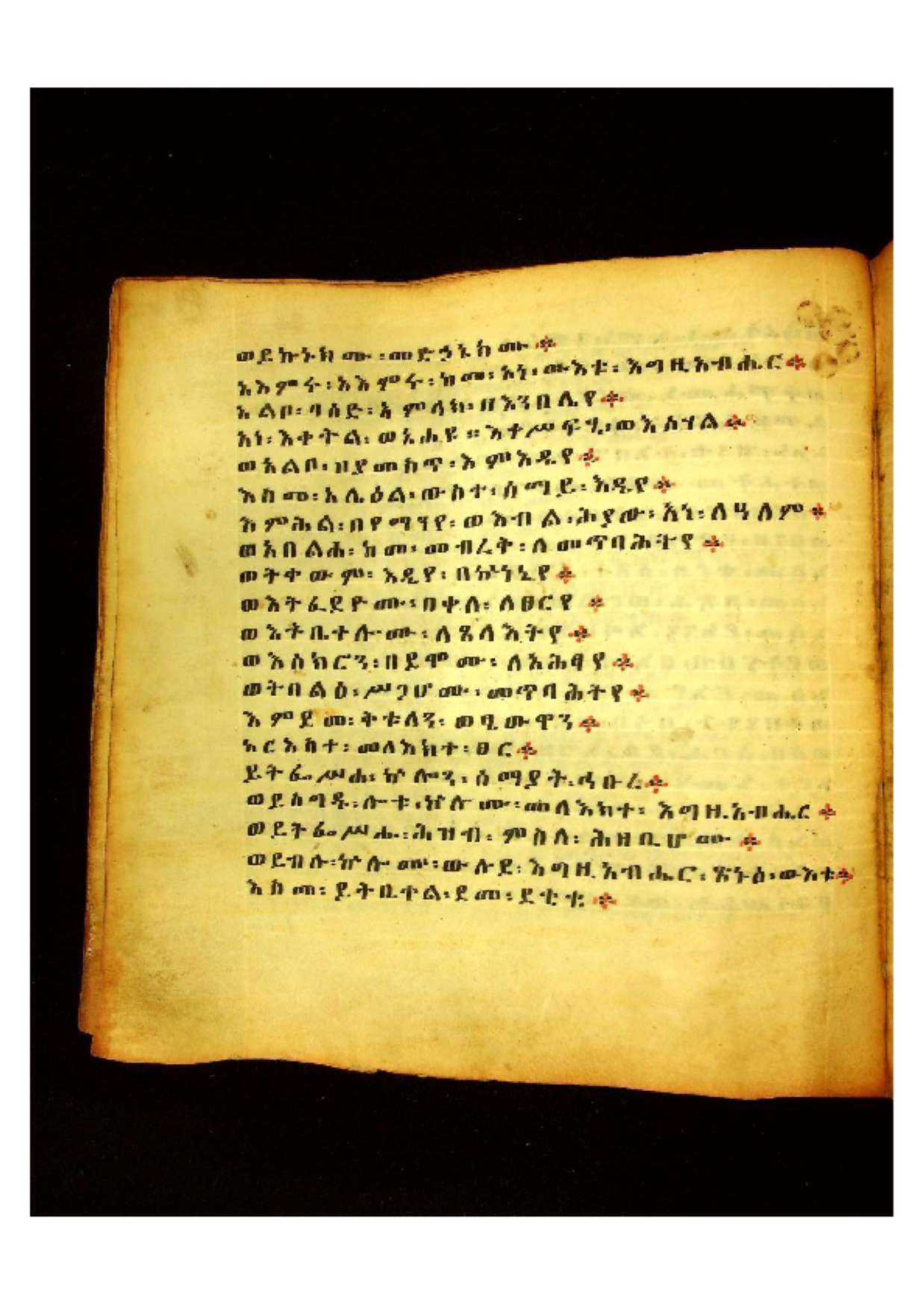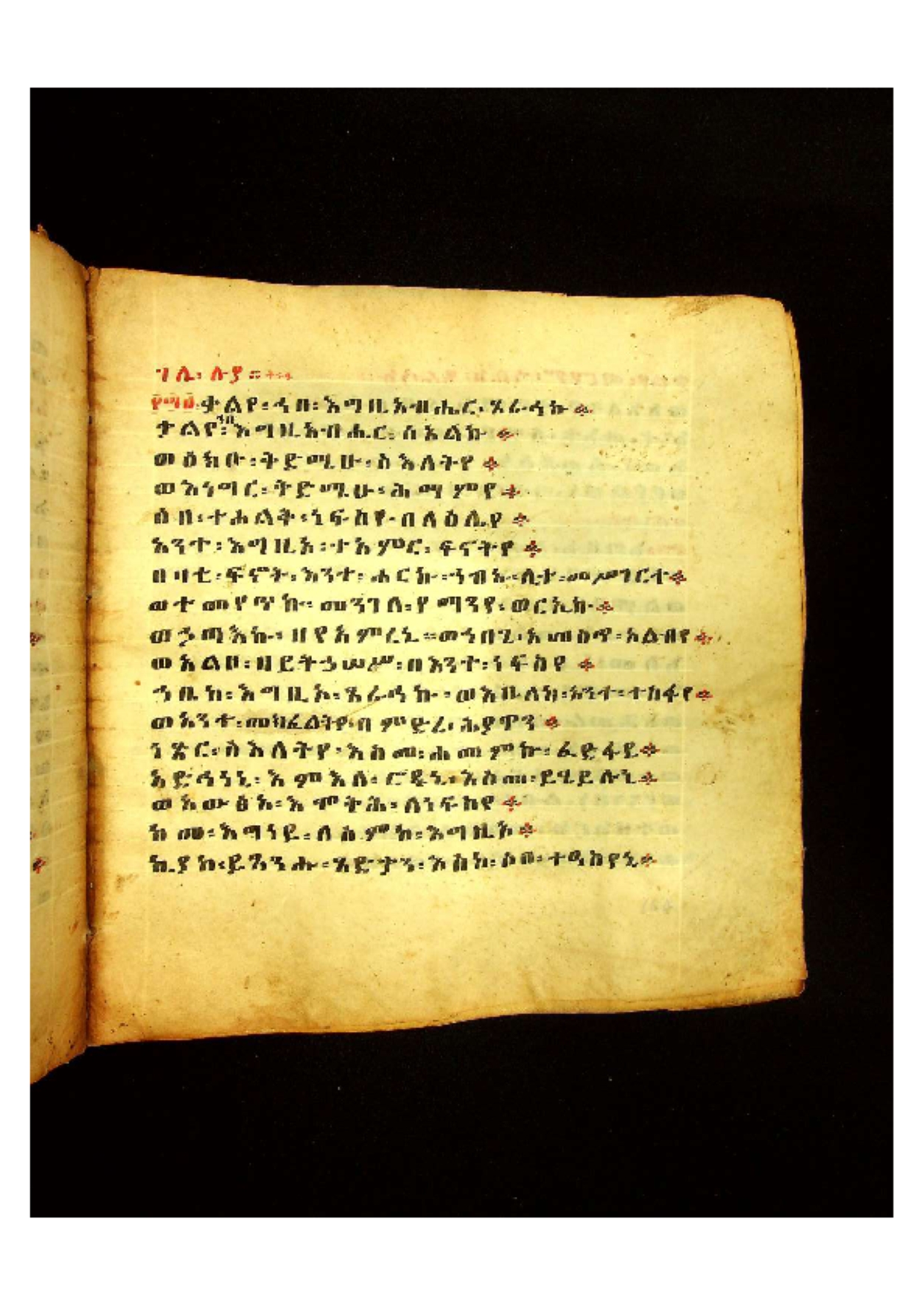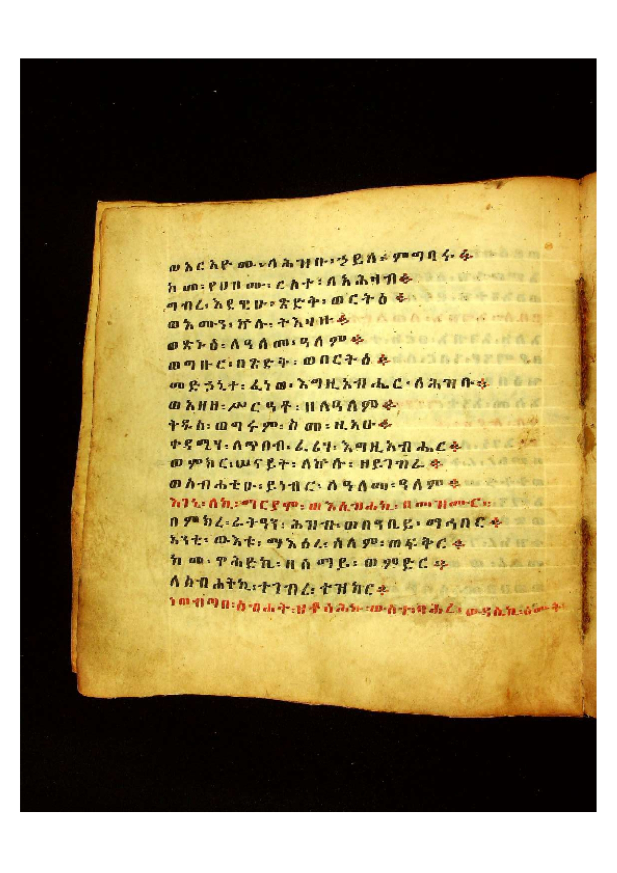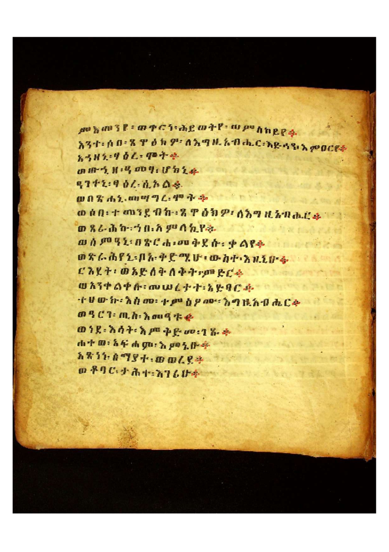 1. F. 2r: donation note written vertically in the outer margin, in black ink: “alla famiglia Bruschettini, Pussy […] Battaglia dell’Amba Aradam il 16 febbraio 1936 XIV”. The note, written in Italian and partly illegible, indicates the Bruschettini family as the receiver of the book and mentions the Battle of Amba Aradam, which took place on 16 February 1936. 2. F. 5r: note written in Italian in the outer upper margin, in red pencil: “Amba Aradam 16/2/XIV ore 17.30 P. Paloboni (?)”. This note also mentions the Battle of Amba Aradam, together with an individual whose name is partially unclear (P. Paloboni?). 3. F. 173v: supplication note written in small script in a mediocre hand, at the end of the “Psalms of David”: ዕቀበኒ፡ እምዓይነ፡ ደዌ፡ ወሞት፡ ለገብርከ፡ ደቅስዮስ፡, “protect me, your servant Däqsəyos, from the eye of infirmity and death”. The note mentions a certain Däqsəyos, indicated as “your servant” (possibly a later owner of the codex). 4. F. 173v: incipit of the Gəʿəz and Amharic prayer, perhaps a writing exercise. The note is written in an inaccurate calligraphy on the outer margin of the folio, next to the prayer. The entire text is የህፂ፡ ኖኅን፡ ከማየ[፡] አይኅ። እስራኤልን፡ ከፈርዖን፡ ዳዊትን፡ ከሳኦል፡ ከኢሎፍሊ። ኤ. 5. F. 190v: donation note, written in black ink in a mediocre hand. Text: ዝመጽሐፍ፡ ዘደብተራ፡ ኪሮስ፡ ዘወሀቦ፡ ለታቦተ፡ ሚካኤል፡ ኢትርስዑኒ፡ በአቡነ፡ ዘበሰማያት፡ ዘአቡየ፡ ገብረ፡ ማርያም፡ ወለእምየ፡ ወለተ፡ ሩፋኤል፡, “This book belongs to däbtära Kiros, who donated it to the tabot of [the church of St] Michael. Do not forget me for our Father who is in heaven. [It also belongs] to my father Gäbrä Maryam and my mother Wälättä Rufaʾel”. 6. F. 199v: writings executed in an inaccurate hand, perhaps the same of note 4. The note includes pen trials (ፈቲነ፡ ብርዕ፡ ዘፈረና፡ etc.), reproduces the explicit of the “Song of the songs” (ስብሐታተኪ፡ ማርያም፡ ከመ፡ እንተ፡ ሕልቀት፡ etc.) and the incipit of the “Praise of Mary” (ውዳሴ፡ ዘሰኑይ፡ ፈቀደ፡ እግዚእ፡ etc., partly rubricated). The writings also mention Däqsəyos, indicated as “your servant” (possibly a later owner of the codex) 7. F. 220ra–va: Genealogic note written on two columns. The note illustrates the family tree of King Yoḥannǝs I, who reigned from 1667 to 1682. The text is acephalous. Incipit: [ወለ]ደ፡ እምሐና፡ ብእሲቱ፡ አሦተ፡ ቅዱሳንሃ፡ ወአሦተ፡ ቅዱሳንኒ፡ እምነ፡ ጳውሊ፡ ብእሲሃ፡ ወለደቶሙ፡ ለአቤተኁን፡ ማእምሮ፡ ወለዘሥላሴ፡ ወአቤተኁን፡ ማእምሮኒ፡ ወለደ፡ አቃርዮስ፡ ወአቃርዮስኒ፡ ወለደ፡ እመቤት፡ እኅተ፡ ክርስቶስሃ፡. The text is published and translated in Proverbio D.V., 2000, ‘Inventario sommario dei manoscritti arabi, ebraici, etiopici – con notizia dei turchi – conservati presso la Biblioteca della Badia di Grottaferrata’. Atti della Accademia nazionale dei Lincei, Memorie, Classe di scienze morali, storiche e filologiche, serie IX, 12 (2000), 468–570 (here pp. 496–97, Appendice III). 8. F. 220va–b: Protective prayer against snakes, written on two columns. Incipit: በስመ፡ አብ፡ … ጸሎት፡ በእንተ፡ ዓርዌ፡ ምድር። ሶበ፡ በጽሐ፡ መልእክት፡ ሐሰውከ፡ በል፡ ፫ጊዜ፡ አኂዘከ፡ ዘፈረ፡ ልብሰ፡ ለእመ፡ ሀሎ፡ ርሑቀ፡ አስትዮ፡. The prayer is probably written in the same hand of note 7. 9. F. 220vb: Unidentified magic prayer containing asmat-names. Incipit: በስመ፡ አብ፡ … ኦላዘላህም፡ አህጉረ፡ ቀዳ[.]፡ ፍሖም፡ ሊስ፡ አፍሊስ፡ ምልክዮስ፡ ዘ[..]ማኤል፡ በዝንቱ፡ አስማቲከ፡ [.]ጽ[..] ኃይለ፡ በረድ፡ ወነፋስ፡ ከማሁ፡. |