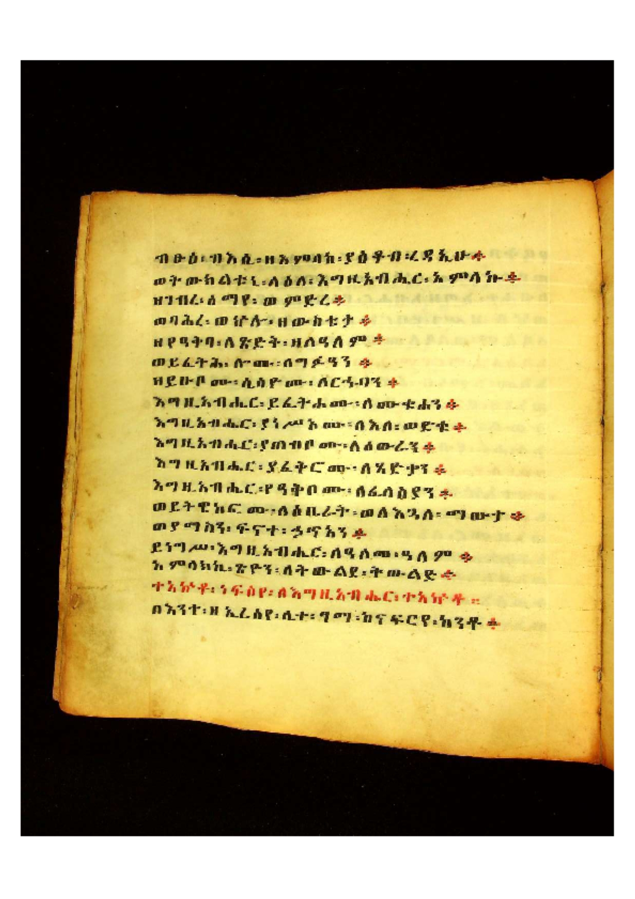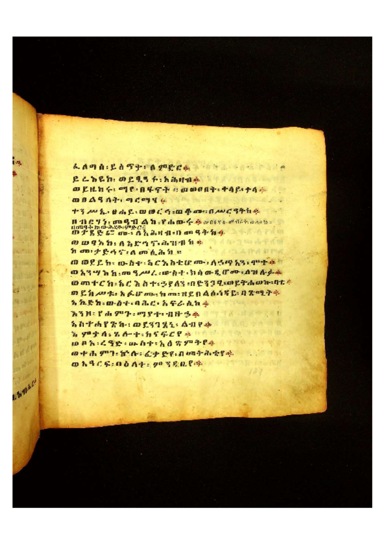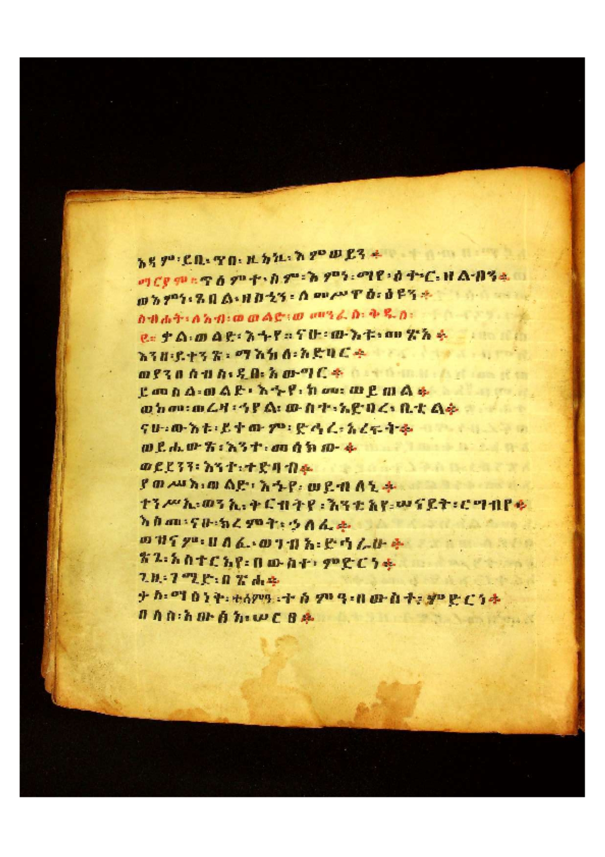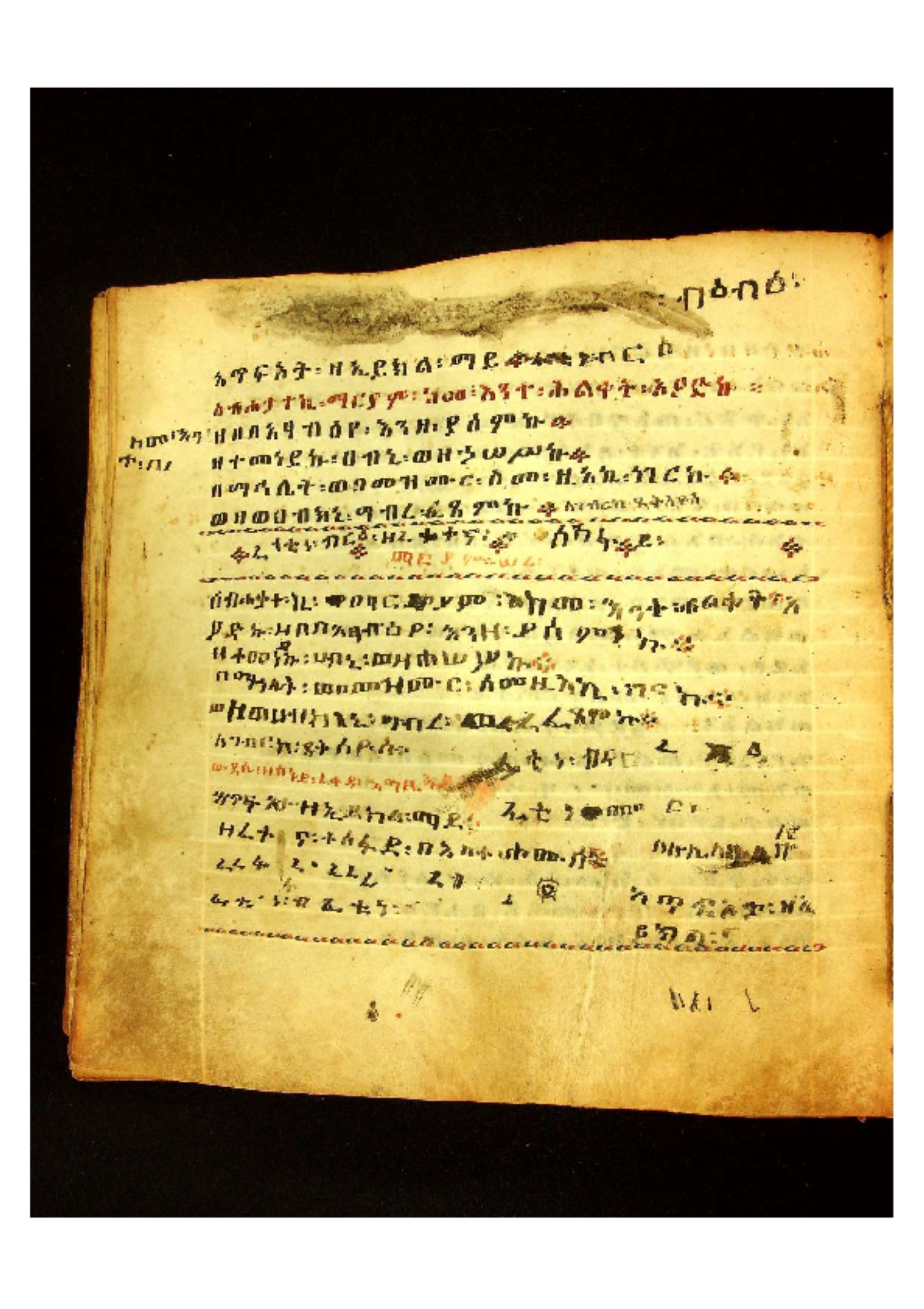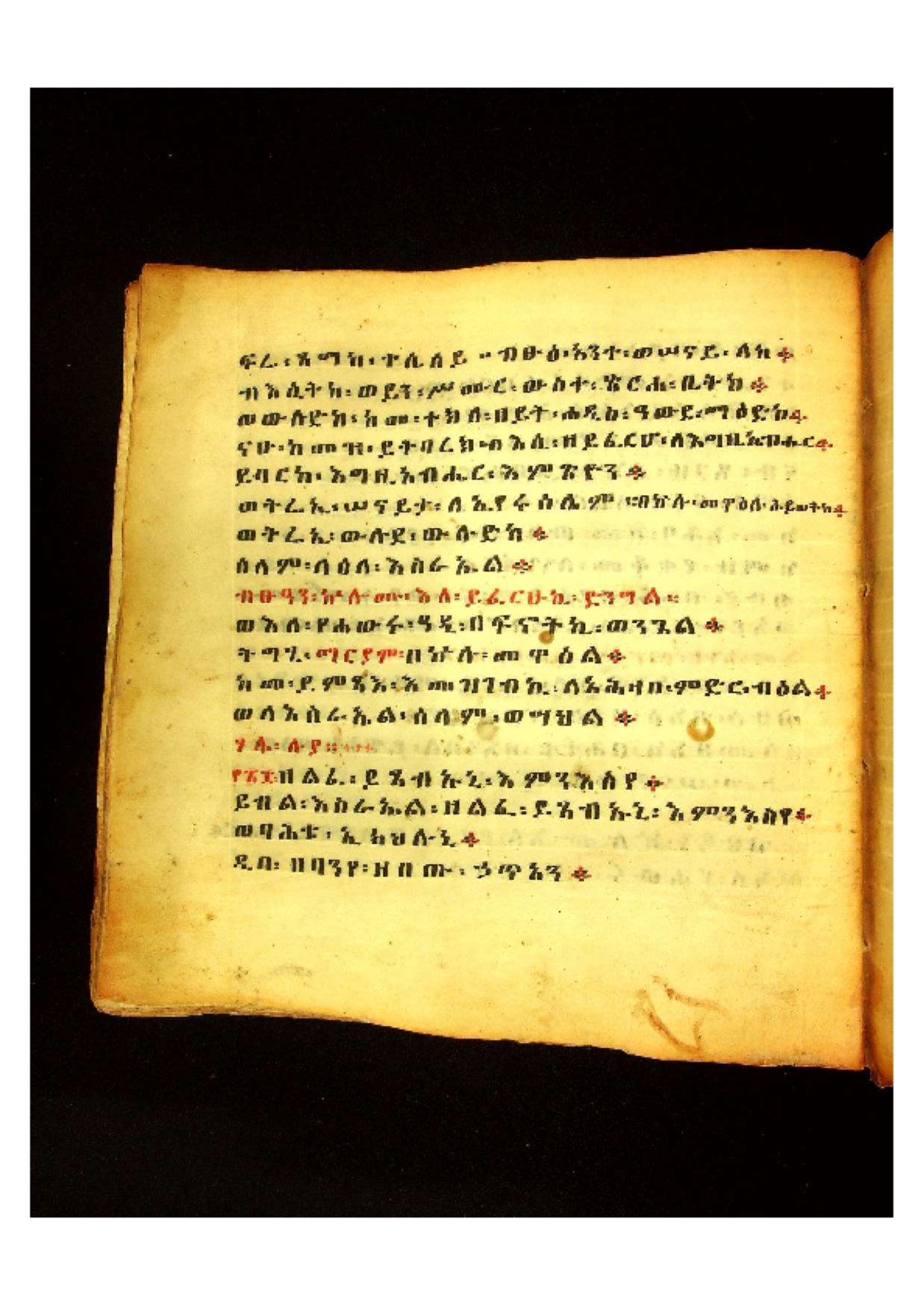 1. F. 2r: donation note written vertically in the outer margin, in black ink: “alla famiglia Bruschettini, Pussy […] Battaglia dell’Amba Aradam il 16 febbraio 1936 XIV”. The note, written in Italian and partly illegible, indicates the Bruschettini family as the receiver of the book and mentions the Battle of Amba Aradam, which took place on 16 February 1936. 2. F. 5r: note written in Italian in the outer upper margin, in red pencil: “Amba Aradam 16/2/XIV ore 17.30 P. Paloboni (?)”. This note also mentions the Battle of Amba Aradam, together with an individual whose name is partially unclear (P. Paloboni?). 3. F. 173v: supplication note written in small script in a mediocre hand, at the end of the “Psalms of David”: ዕቀበኒ፡ እምዓይነ፡ ደዌ፡ ወሞት፡ ለገብርከ፡ ደቅስዮስ፡, “protect me, your servant Däqsəyos, from the eye of infirmity and death”. The note mentions a certain Däqsəyos, indicated as “your servant” (possibly a later owner of the codex). 4. F. 173v: incipit of the Gəʿəz and Amharic prayer, perhaps a writing exercise. The note is written in an inaccurate calligraphy on the outer margin of the folio, next to the prayer. The entire text is የህፂ፡ ኖኅን፡ ከማየ[፡] አይኅ። እስራኤልን፡ ከፈርዖን፡ ዳዊትን፡ ከሳኦል፡ ከኢሎፍሊ። ኤ. 5. F. 190v: donation note, written in black ink in a mediocre hand. Text: ዝመጽሐፍ፡ ዘደብተራ፡ ኪሮስ፡ ዘወሀቦ፡ ለታቦተ፡ ሚካኤል፡ ኢትርስዑኒ፡ በአቡነ፡ ዘበሰማያት፡ ዘአቡየ፡ ገብረ፡ ማርያም፡ ወለእምየ፡ ወለተ፡ ሩፋኤል፡, “This book belongs to däbtära Kiros, who donated it to the tabot of [the church of St] Michael. Do not forget me for our Father who is in heaven. [It also belongs] to my father Gäbrä Maryam and my mother Wälättä Rufaʾel”. 6. F. 199v: writings executed in an inaccurate hand, perhaps the same of note 4. The note includes pen trials (ፈቲነ፡ ብርዕ፡ ዘፈረና፡ etc.), reproduces the explicit of the “Song of the songs” (ስብሐታተኪ፡ ማርያም፡ ከመ፡ እንተ፡ ሕልቀት፡ etc.) and the incipit of the “Praise of Mary” (ውዳሴ፡ ዘሰኑይ፡ ፈቀደ፡ እግዚእ፡ etc., partly rubricated). The writings also mention Däqsəyos, indicated as “your servant” (possibly a later owner of the codex) 7. F. 220ra–va: Genealogic note written on two columns. The note illustrates the family tree of King Yoḥannǝs I, who reigned from 1667 to 1682. The text is acephalous. Incipit: [ወለ]ደ፡ እምሐና፡ ብእሲቱ፡ አሦተ፡ ቅዱሳንሃ፡ ወአሦተ፡ ቅዱሳንኒ፡ እምነ፡ ጳውሊ፡ ብእሲሃ፡ ወለደቶሙ፡ ለአቤተኁን፡ ማእምሮ፡ ወለዘሥላሴ፡ ወአቤተኁን፡ ማእምሮኒ፡ ወለደ፡ አቃርዮስ፡ ወአቃርዮስኒ፡ ወለደ፡ እመቤት፡ እኅተ፡ ክርስቶስሃ፡. The text is published and translated in Proverbio D.V., 2000, ‘Inventario sommario dei manoscritti arabi, ebraici, etiopici – con notizia dei turchi – conservati presso la Biblioteca della Badia di Grottaferrata’. Atti della Accademia nazionale dei Lincei, Memorie, Classe di scienze morali, storiche e filologiche, serie IX, 12 (2000), 468–570 (here pp. 496–97, Appendice III). 8. F. 220va–b: Protective prayer against snakes, written on two columns. Incipit: በስመ፡ አብ፡ … ጸሎት፡ በእንተ፡ ዓርዌ፡ ምድር። ሶበ፡ በጽሐ፡ መልእክት፡ ሐሰውከ፡ በል፡ ፫ጊዜ፡ አኂዘከ፡ ዘፈረ፡ ልብሰ፡ ለእመ፡ ሀሎ፡ ርሑቀ፡ አስትዮ፡. The prayer is probably written in the same hand of note 7. 9. F. 220vb: Unidentified magic prayer containing asmat-names. Incipit: በስመ፡ አብ፡ … ኦላዘላህም፡ አህጉረ፡ ቀዳ[.]፡ ፍሖም፡ ሊስ፡ አፍሊስ፡ ምልክዮስ፡ ዘ[..]ማኤል፡ በዝንቱ፡ አስማቲከ፡ [.]ጽ[..] ኃይለ፡ በረድ፡ ወነፋስ፡ ከማሁ፡. |