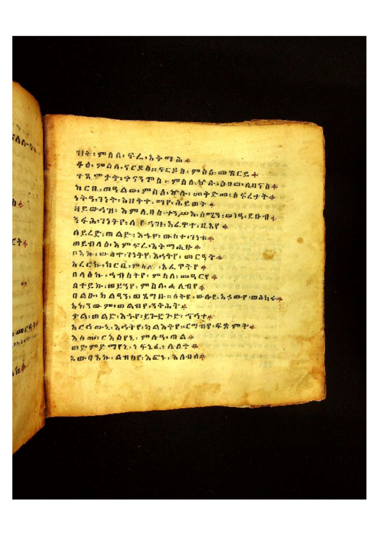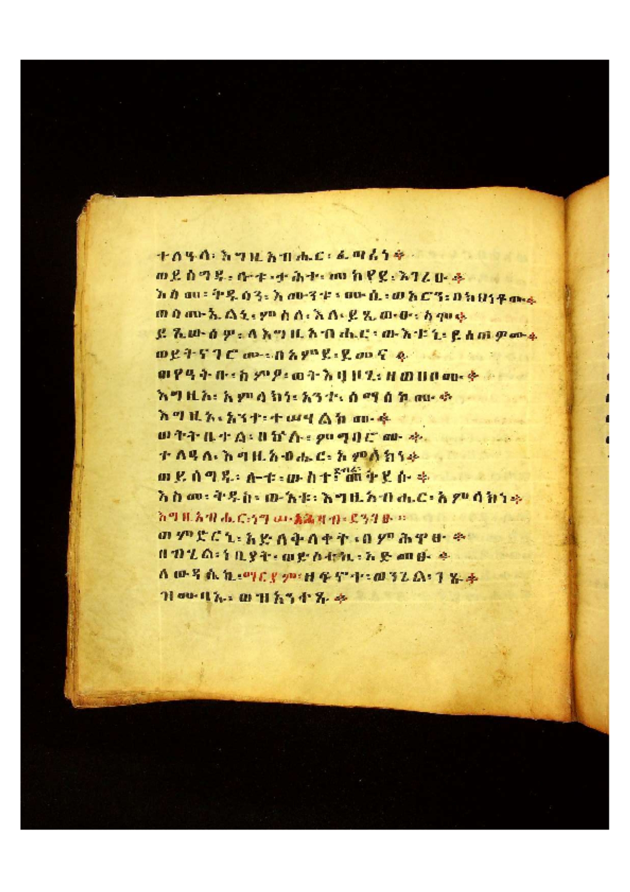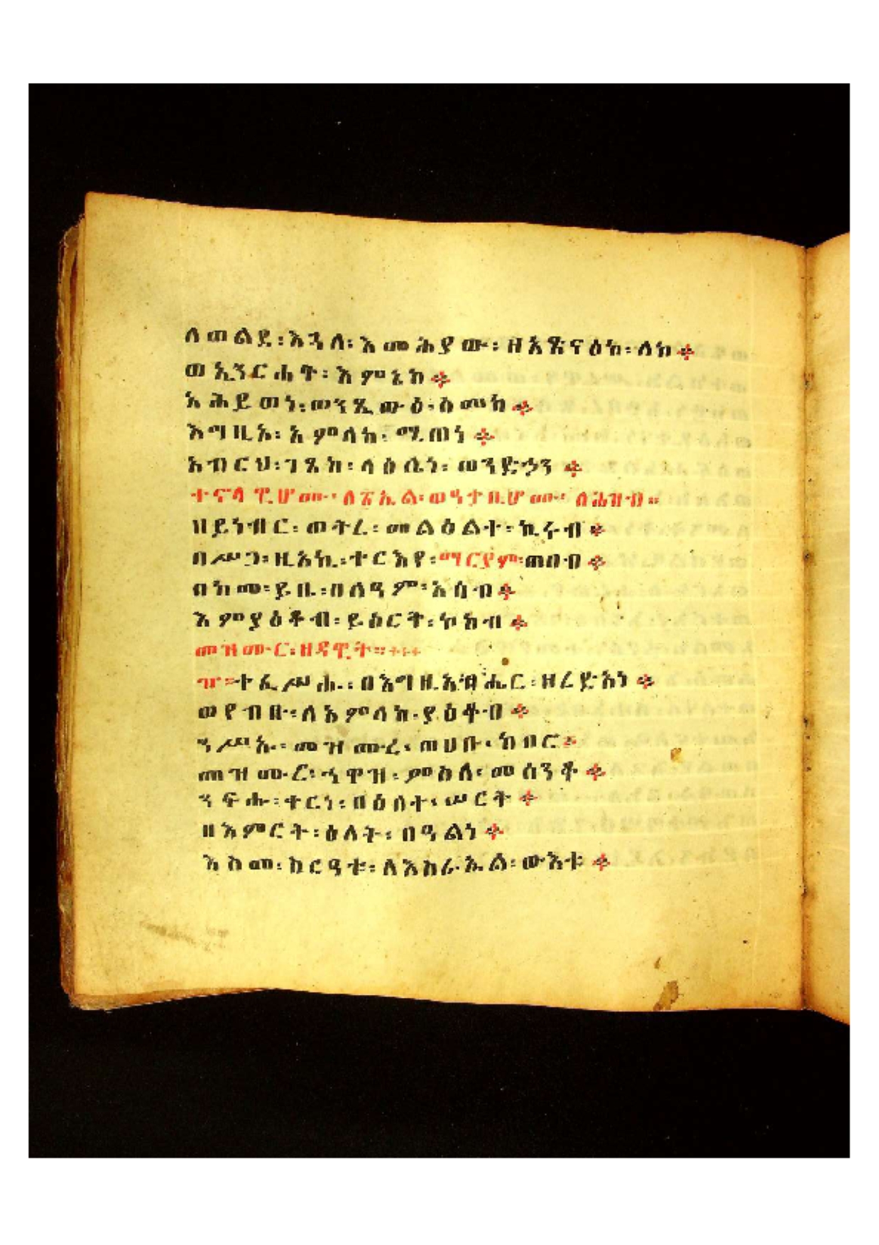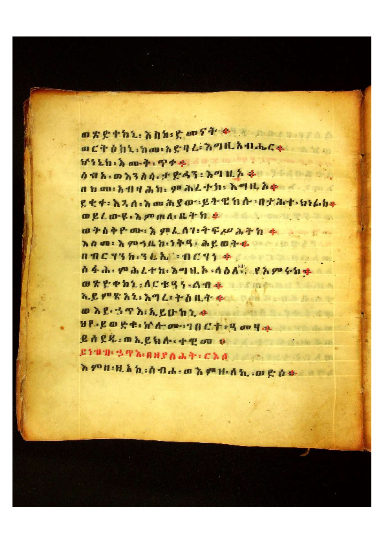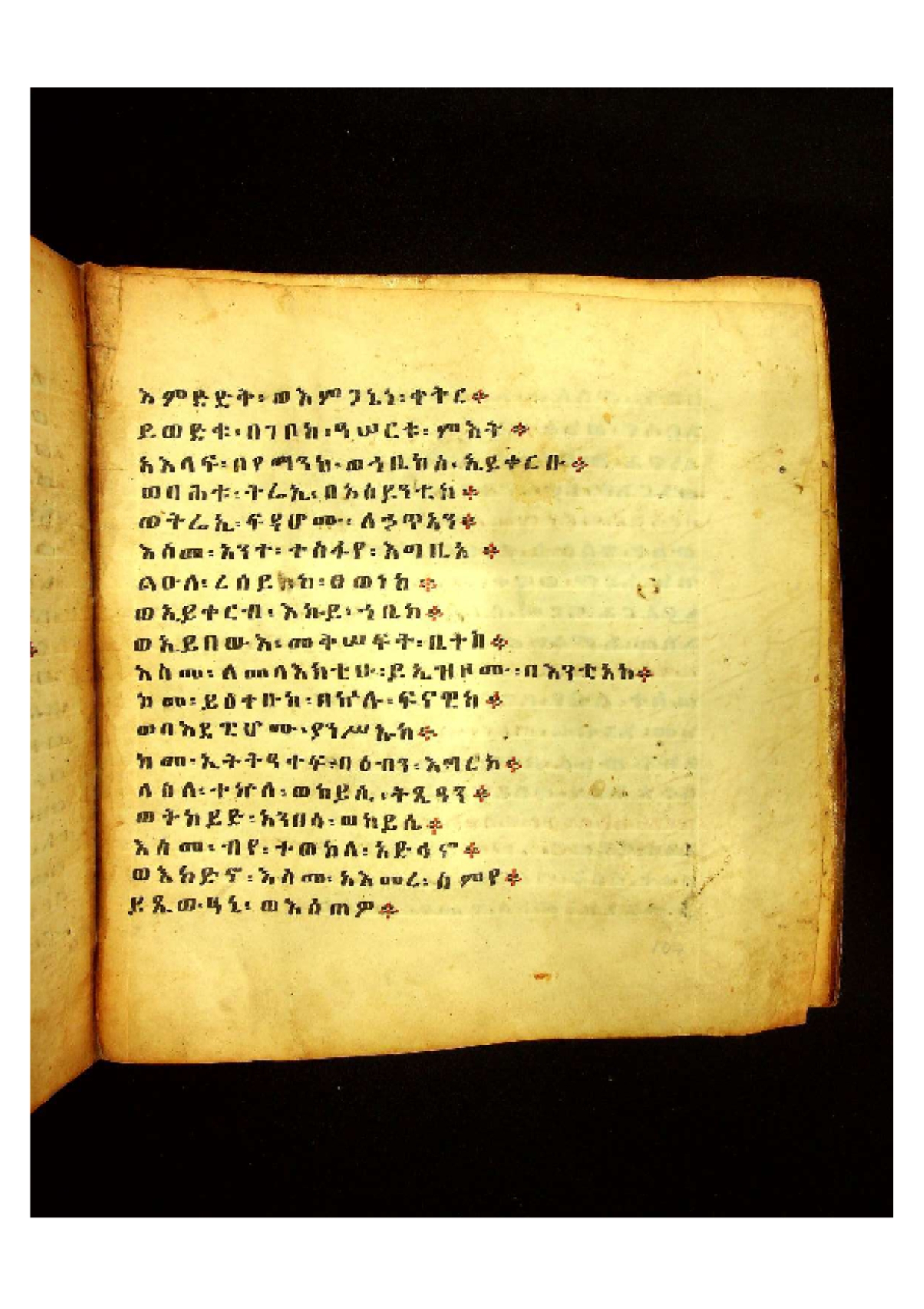 1. F. 2r: donation note written vertically in the outer margin, in black ink: “alla famiglia Bruschettini, Pussy […] Battaglia dell’Amba Aradam il 16 febbraio 1936 XIV”. The note, written in Italian and partly illegible, indicates the Bruschettini family as the receiver of the book and mentions the Battle of Amba Aradam, which took place on 16 February 1936. 2. F. 5r: note written in Italian in the outer upper margin, in red pencil: “Amba Aradam 16/2/XIV ore 17.30 P. Paloboni (?)”. This note also mentions the Battle of Amba Aradam, together with an individual whose name is partially unclear (P. Paloboni?). 3. F. 173v: supplication note written in small script in a mediocre hand, at the end of the “Psalms of David”: ዕቀበኒ፡ እምዓይነ፡ ደዌ፡ ወሞት፡ ለገብርከ፡ ደቅስዮስ፡, “protect me, your servant Däqsəyos, from the eye of infirmity and death”. The note mentions a certain Däqsəyos, indicated as “your servant” (possibly a later owner of the codex). 4. F. 173v: incipit of the Gəʿəz and Amharic prayer, perhaps a writing exercise. The note is written in an inaccurate calligraphy on the outer margin of the folio, next to the prayer. The entire text is የህፂ፡ ኖኅን፡ ከማየ[፡] አይኅ። እስራኤልን፡ ከፈርዖን፡ ዳዊትን፡ ከሳኦል፡ ከኢሎፍሊ። ኤ. 5. F. 190v: donation note, written in black ink in a mediocre hand. Text: ዝመጽሐፍ፡ ዘደብተራ፡ ኪሮስ፡ ዘወሀቦ፡ ለታቦተ፡ ሚካኤል፡ ኢትርስዑኒ፡ በአቡነ፡ ዘበሰማያት፡ ዘአቡየ፡ ገብረ፡ ማርያም፡ ወለእምየ፡ ወለተ፡ ሩፋኤል፡, “This book belongs to däbtära Kiros, who donated it to the tabot of [the church of St] Michael. Do not forget me for our Father who is in heaven. [It also belongs] to my father Gäbrä Maryam and my mother Wälättä Rufaʾel”. 6. F. 199v: writings executed in an inaccurate hand, perhaps the same of note 4. The note includes pen trials (ፈቲነ፡ ብርዕ፡ ዘፈረና፡ etc.), reproduces the explicit of the “Song of the songs” (ስብሐታተኪ፡ ማርያም፡ ከመ፡ እንተ፡ ሕልቀት፡ etc.) and the incipit of the “Praise of Mary” (ውዳሴ፡ ዘሰኑይ፡ ፈቀደ፡ እግዚእ፡ etc., partly rubricated). The writings also mention Däqsəyos, indicated as “your servant” (possibly a later owner of the codex) 7. F. 220ra–va: Genealogic note written on two columns. The note illustrates the family tree of King Yoḥannǝs I, who reigned from 1667 to 1682. The text is acephalous. Incipit: [ወለ]ደ፡ እምሐና፡ ብእሲቱ፡ አሦተ፡ ቅዱሳንሃ፡ ወአሦተ፡ ቅዱሳንኒ፡ እምነ፡ ጳውሊ፡ ብእሲሃ፡ ወለደቶሙ፡ ለአቤተኁን፡ ማእምሮ፡ ወለዘሥላሴ፡ ወአቤተኁን፡ ማእምሮኒ፡ ወለደ፡ አቃርዮስ፡ ወአቃርዮስኒ፡ ወለደ፡ እመቤት፡ እኅተ፡ ክርስቶስሃ፡. The text is published and translated in Proverbio D.V., 2000, ‘Inventario sommario dei manoscritti arabi, ebraici, etiopici – con notizia dei turchi – conservati presso la Biblioteca della Badia di Grottaferrata’. Atti della Accademia nazionale dei Lincei, Memorie, Classe di scienze morali, storiche e filologiche, serie IX, 12 (2000), 468–570 (here pp. 496–97, Appendice III). 8. F. 220va–b: Protective prayer against snakes, written on two columns. Incipit: በስመ፡ አብ፡ … ጸሎት፡ በእንተ፡ ዓርዌ፡ ምድር። ሶበ፡ በጽሐ፡ መልእክት፡ ሐሰውከ፡ በል፡ ፫ጊዜ፡ አኂዘከ፡ ዘፈረ፡ ልብሰ፡ ለእመ፡ ሀሎ፡ ርሑቀ፡ አስትዮ፡. The prayer is probably written in the same hand of note 7. 9. F. 220vb: Unidentified magic prayer containing asmat-names. Incipit: በስመ፡ አብ፡ … ኦላዘላህም፡ አህጉረ፡ ቀዳ[.]፡ ፍሖም፡ ሊስ፡ አፍሊስ፡ ምልክዮስ፡ ዘ[..]ማኤል፡ በዝንቱ፡ አስማቲከ፡ [.]ጽ[..] ኃይለ፡ በረድ፡ ወነፋስ፡ ከማሁ፡. |