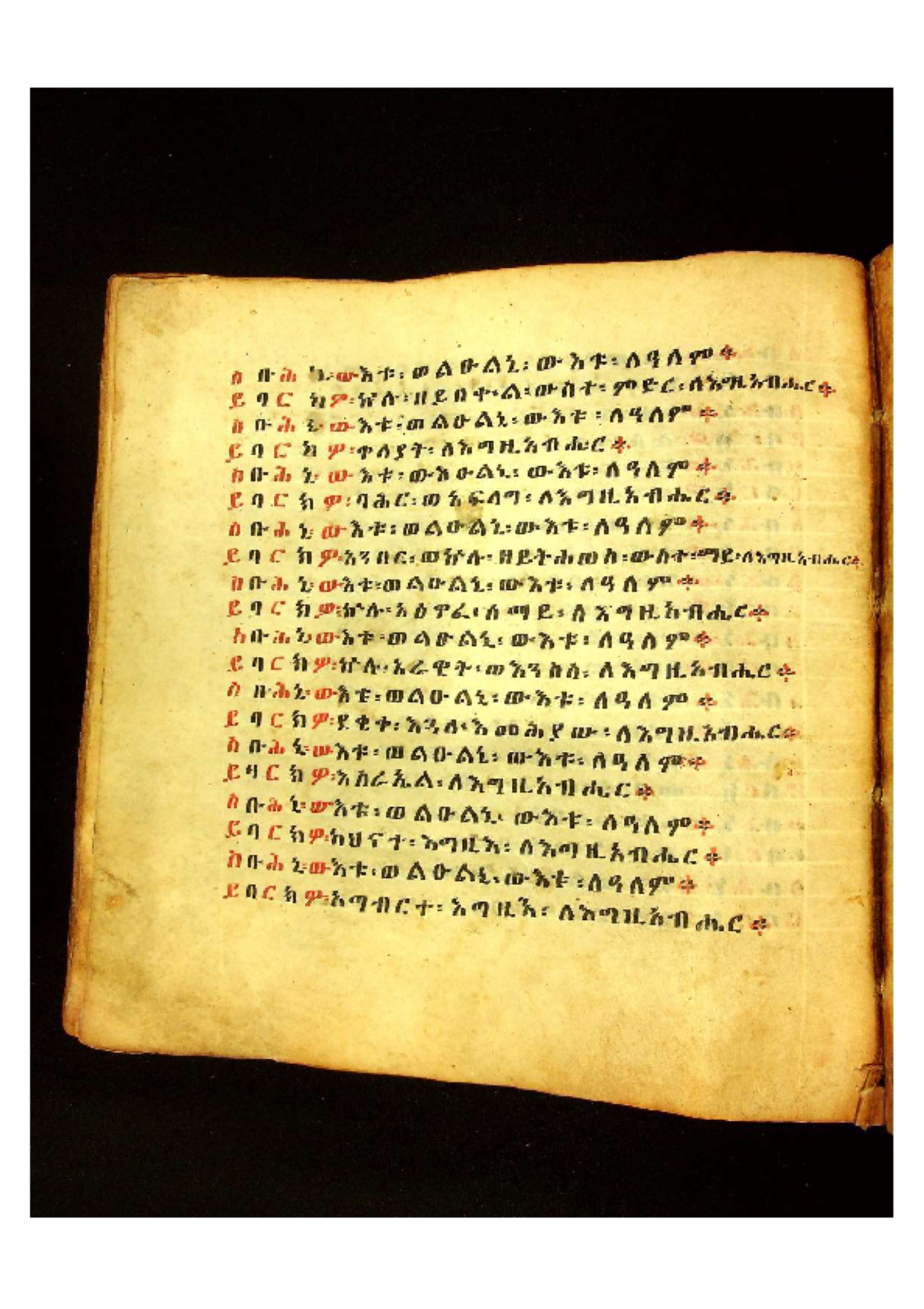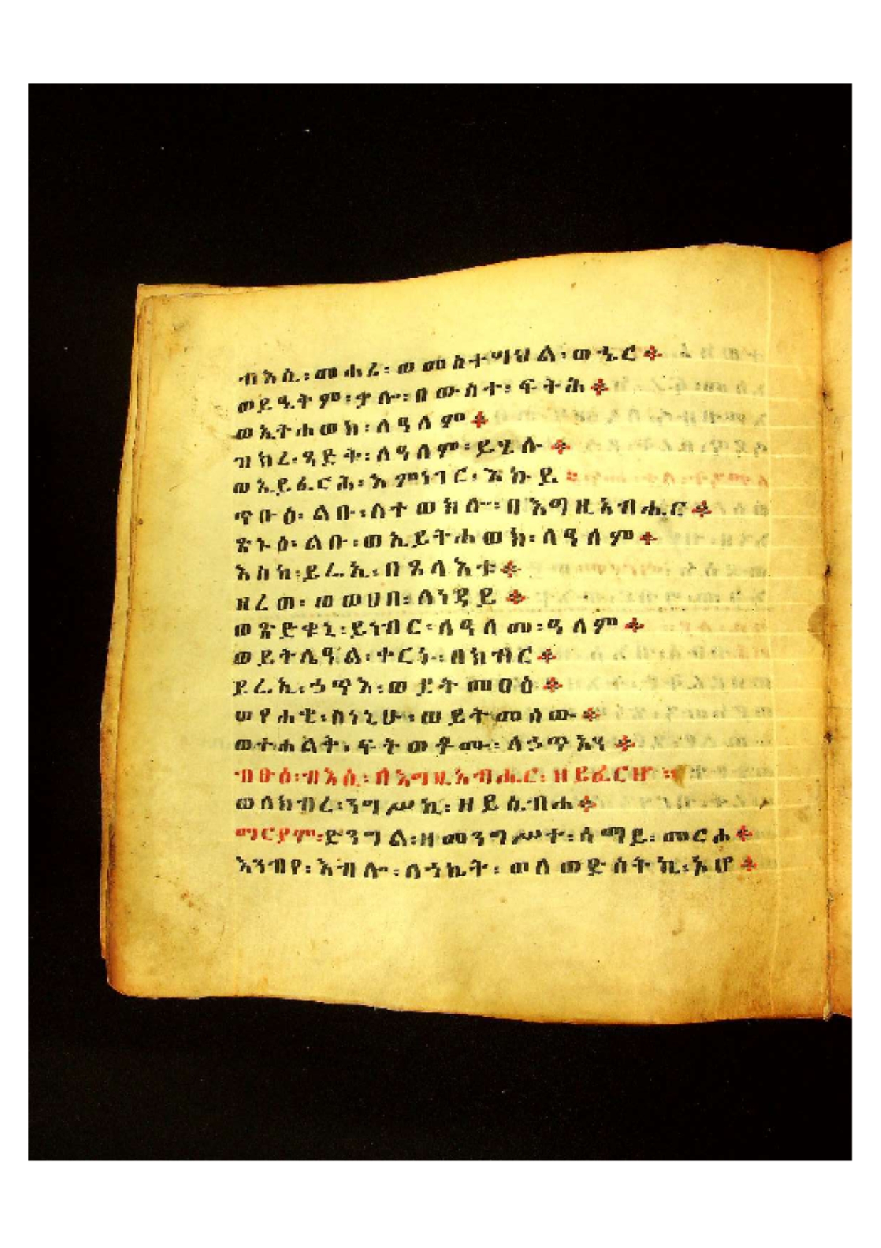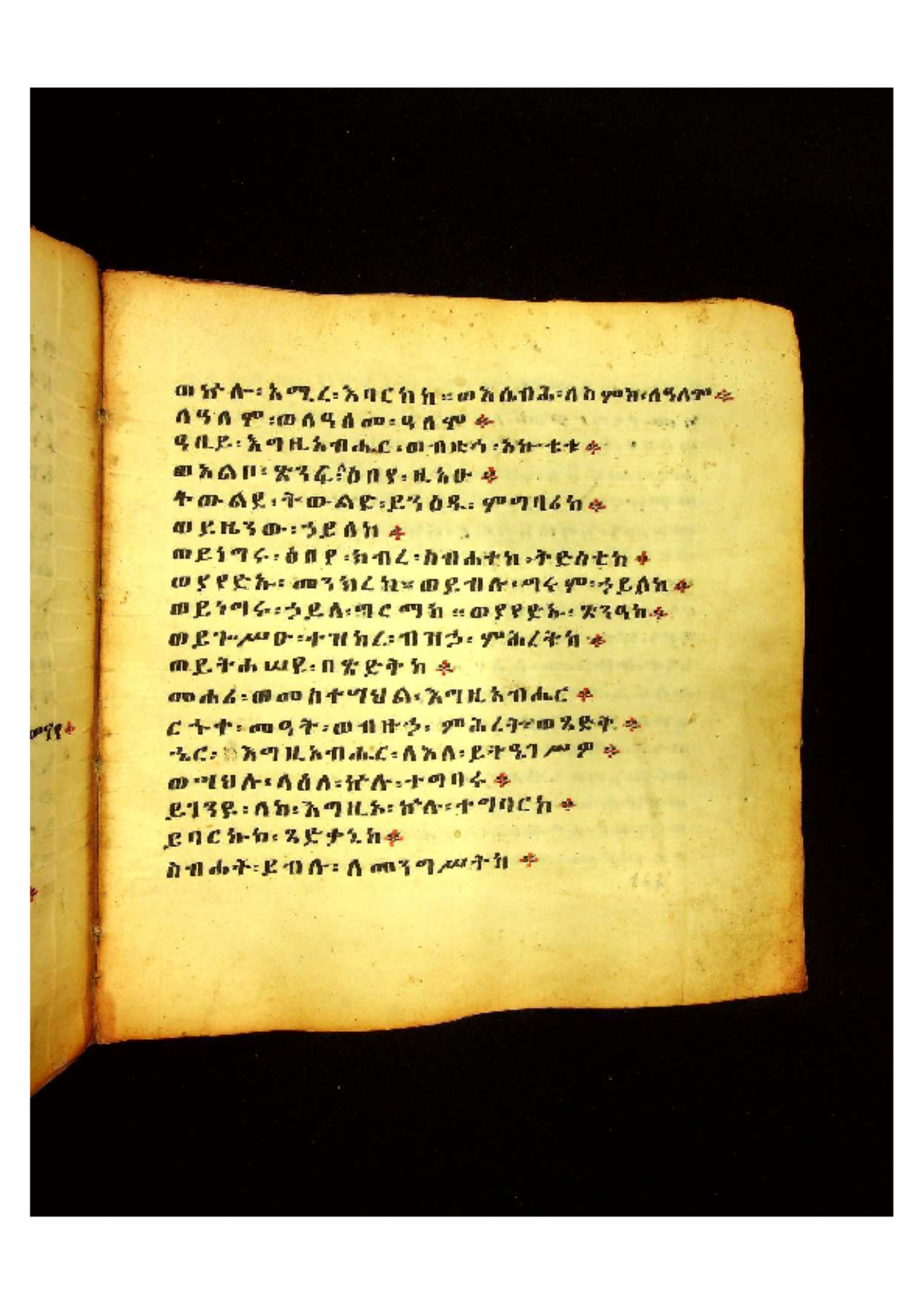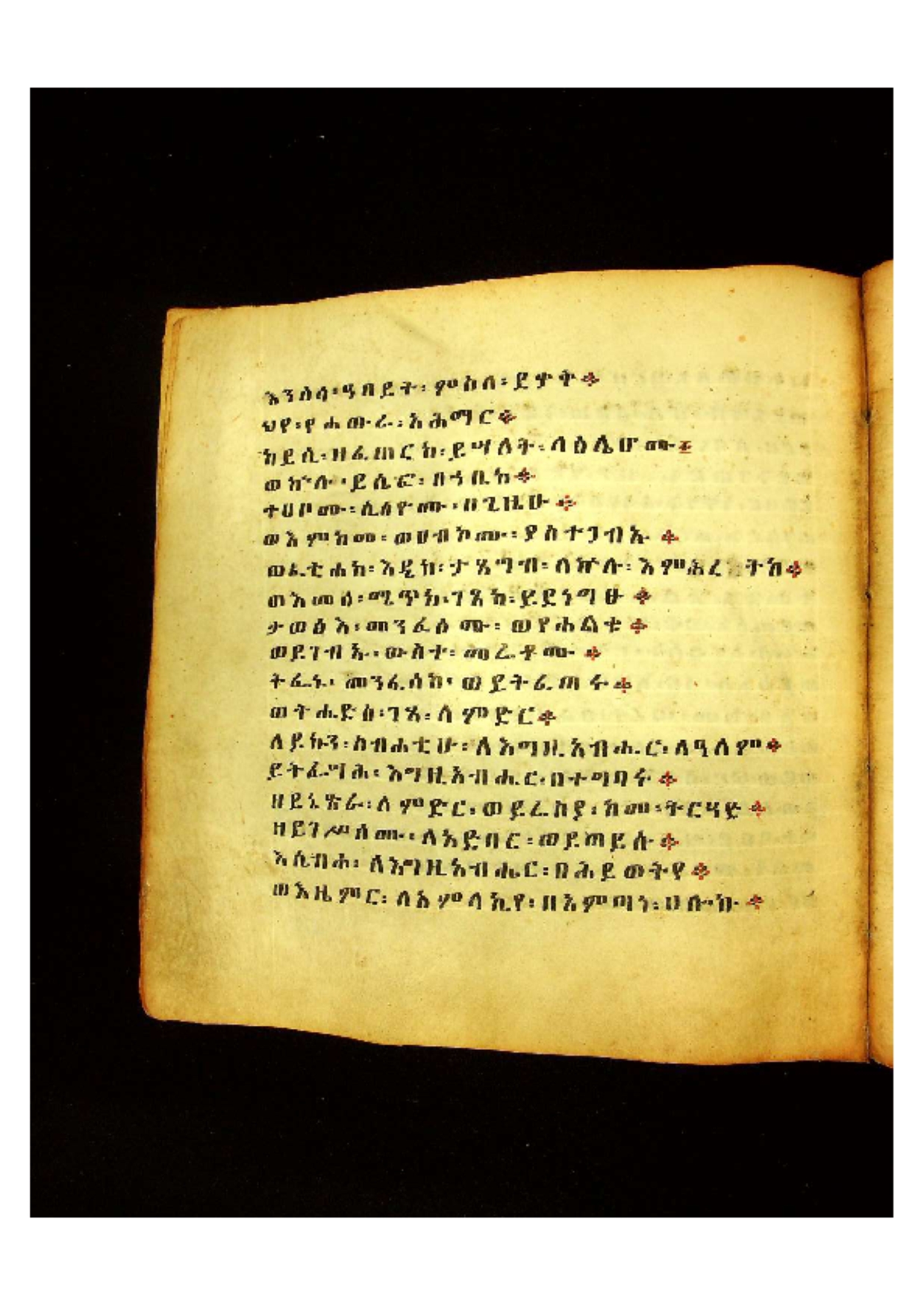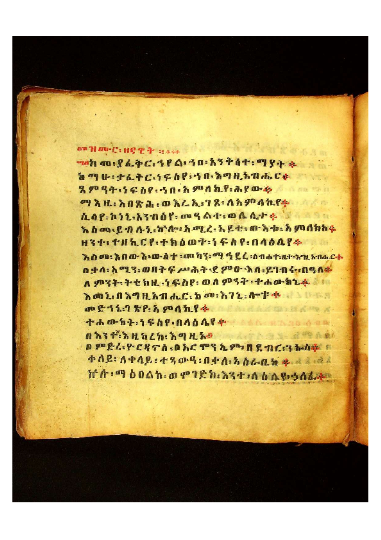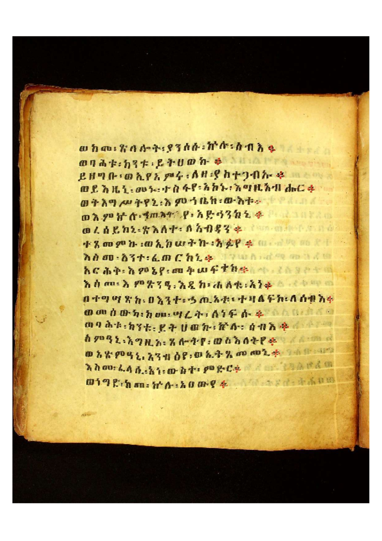 1. F. 2r: donation note written vertically in the outer margin, in black ink: “alla famiglia Bruschettini, Pussy […] Battaglia dell’Amba Aradam il 16 febbraio 1936 XIV”. The note, written in Italian and partly illegible, indicates the Bruschettini family as the receiver of the book and mentions the Battle of Amba Aradam, which took place on 16 February 1936. 2. F. 5r: note written in Italian in the outer upper margin, in red pencil: “Amba Aradam 16/2/XIV ore 17.30 P. Paloboni (?)”. This note also mentions the Battle of Amba Aradam, together with an individual whose name is partially unclear (P. Paloboni?). 3. F. 173v: supplication note written in small script in a mediocre hand, at the end of the “Psalms of David”: ዕቀበኒ፡ እምዓይነ፡ ደዌ፡ ወሞት፡ ለገብርከ፡ ደቅስዮስ፡, “protect me, your servant Däqsəyos, from the eye of infirmity and death”. The note mentions a certain Däqsəyos, indicated as “your servant” (possibly a later owner of the codex). 4. F. 173v: incipit of the Gəʿəz and Amharic prayer, perhaps a writing exercise. The note is written in an inaccurate calligraphy on the outer margin of the folio, next to the prayer. The entire text is የህፂ፡ ኖኅን፡ ከማየ[፡] አይኅ። እስራኤልን፡ ከፈርዖን፡ ዳዊትን፡ ከሳኦል፡ ከኢሎፍሊ። ኤ. 5. F. 190v: donation note, written in black ink in a mediocre hand. Text: ዝመጽሐፍ፡ ዘደብተራ፡ ኪሮስ፡ ዘወሀቦ፡ ለታቦተ፡ ሚካኤል፡ ኢትርስዑኒ፡ በአቡነ፡ ዘበሰማያት፡ ዘአቡየ፡ ገብረ፡ ማርያም፡ ወለእምየ፡ ወለተ፡ ሩፋኤል፡, “This book belongs to däbtära Kiros, who donated it to the tabot of [the church of St] Michael. Do not forget me for our Father who is in heaven. [It also belongs] to my father Gäbrä Maryam and my mother Wälättä Rufaʾel”. 6. F. 199v: writings executed in an inaccurate hand, perhaps the same of note 4. The note includes pen trials (ፈቲነ፡ ብርዕ፡ ዘፈረና፡ etc.), reproduces the explicit of the “Song of the songs” (ስብሐታተኪ፡ ማርያም፡ ከመ፡ እንተ፡ ሕልቀት፡ etc.) and the incipit of the “Praise of Mary” (ውዳሴ፡ ዘሰኑይ፡ ፈቀደ፡ እግዚእ፡ etc., partly rubricated). The writings also mention Däqsəyos, indicated as “your servant” (possibly a later owner of the codex) 7. F. 220ra–va: Genealogic note written on two columns. The note illustrates the family tree of King Yoḥannǝs I, who reigned from 1667 to 1682. The text is acephalous. Incipit: [ወለ]ደ፡ እምሐና፡ ብእሲቱ፡ አሦተ፡ ቅዱሳንሃ፡ ወአሦተ፡ ቅዱሳንኒ፡ እምነ፡ ጳውሊ፡ ብእሲሃ፡ ወለደቶሙ፡ ለአቤተኁን፡ ማእምሮ፡ ወለዘሥላሴ፡ ወአቤተኁን፡ ማእምሮኒ፡ ወለደ፡ አቃርዮስ፡ ወአቃርዮስኒ፡ ወለደ፡ እመቤት፡ እኅተ፡ ክርስቶስሃ፡. The text is published and translated in Proverbio D.V., 2000, ‘Inventario sommario dei manoscritti arabi, ebraici, etiopici – con notizia dei turchi – conservati presso la Biblioteca della Badia di Grottaferrata’. Atti della Accademia nazionale dei Lincei, Memorie, Classe di scienze morali, storiche e filologiche, serie IX, 12 (2000), 468–570 (here pp. 496–97, Appendice III). 8. F. 220va–b: Protective prayer against snakes, written on two columns. Incipit: በስመ፡ አብ፡ … ጸሎት፡ በእንተ፡ ዓርዌ፡ ምድር። ሶበ፡ በጽሐ፡ መልእክት፡ ሐሰውከ፡ በል፡ ፫ጊዜ፡ አኂዘከ፡ ዘፈረ፡ ልብሰ፡ ለእመ፡ ሀሎ፡ ርሑቀ፡ አስትዮ፡. The prayer is probably written in the same hand of note 7. 9. F. 220vb: Unidentified magic prayer containing asmat-names. Incipit: በስመ፡ አብ፡ … ኦላዘላህም፡ አህጉረ፡ ቀዳ[.]፡ ፍሖም፡ ሊስ፡ አፍሊስ፡ ምልክዮስ፡ ዘ[..]ማኤል፡ በዝንቱ፡ አስማቲከ፡ [.]ጽ[..] ኃይለ፡ በረድ፡ ወነፋስ፡ ከማሁ፡. |