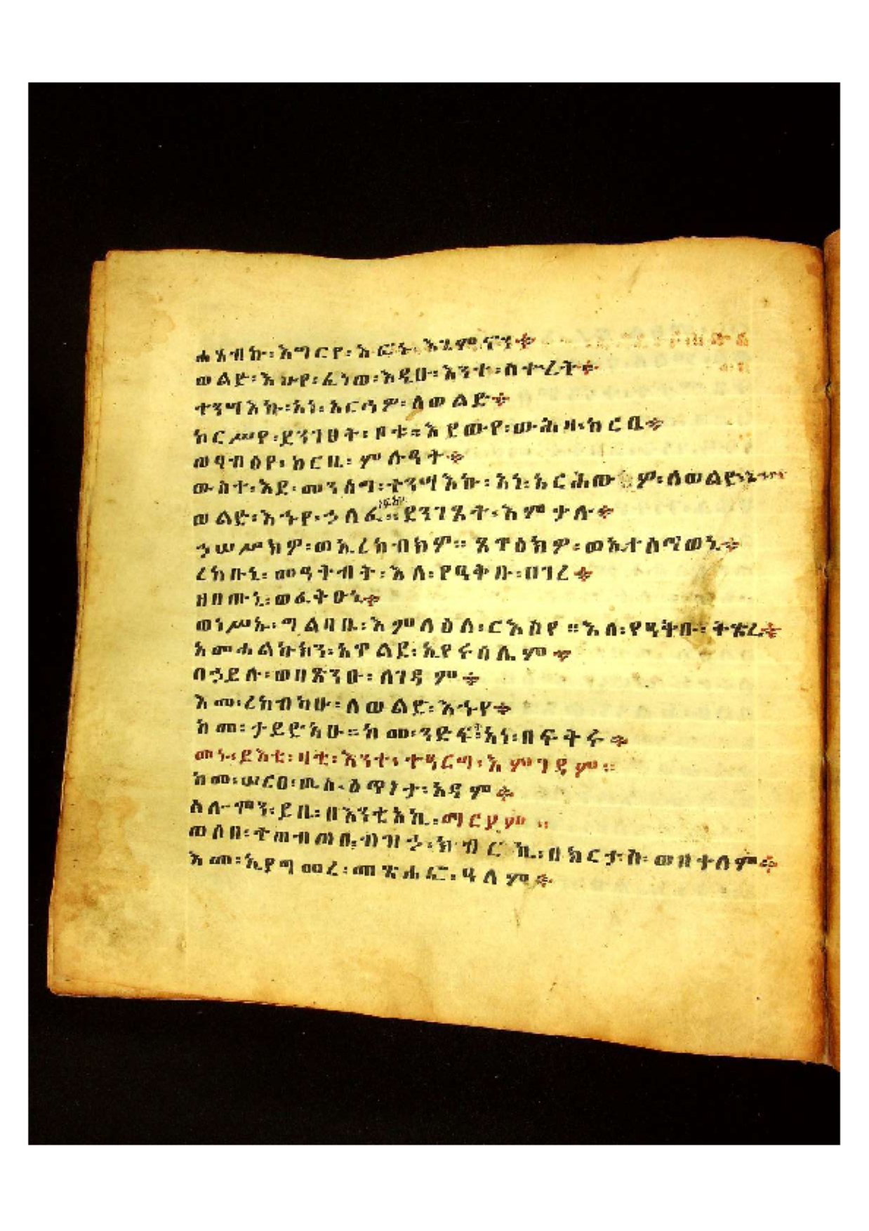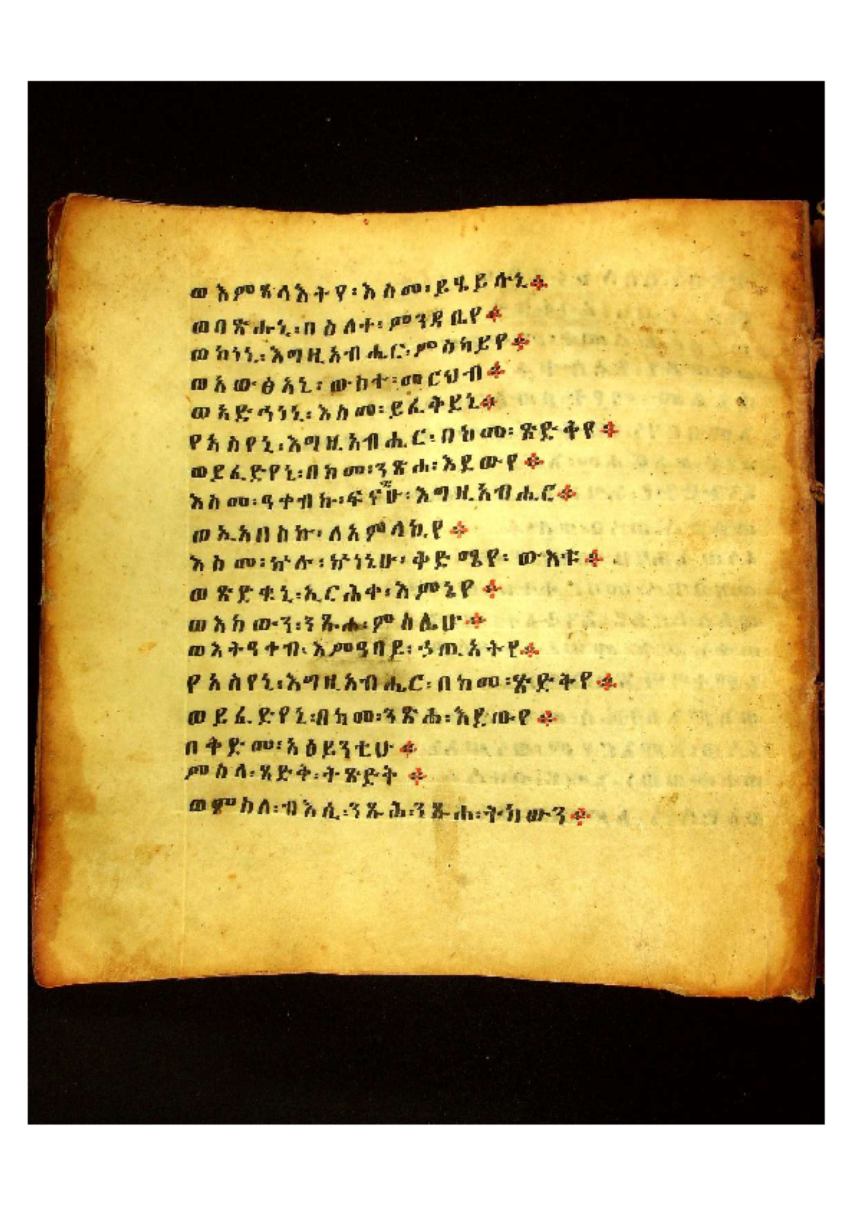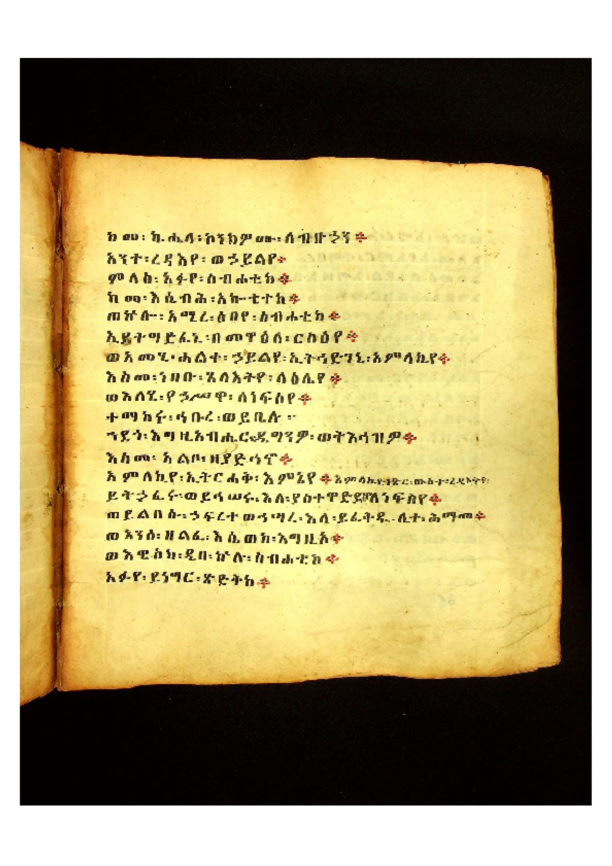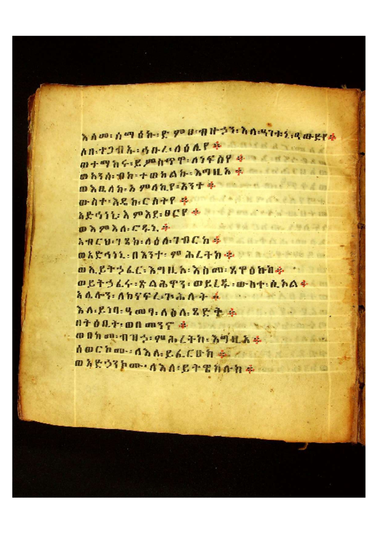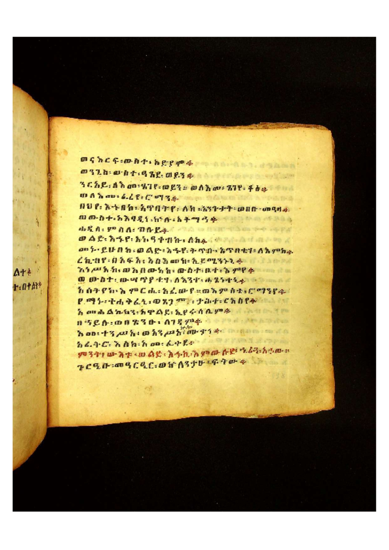 1. F. 2r: donation note written vertically in the outer margin, in black ink: “alla famiglia Bruschettini, Pussy […] Battaglia dell’Amba Aradam il 16 febbraio 1936 XIV”. The note, written in Italian and partly illegible, indicates the Bruschettini family as the receiver of the book and mentions the Battle of Amba Aradam, which took place on 16 February 1936. 2. F. 5r: note written in Italian in the outer upper margin, in red pencil: “Amba Aradam 16/2/XIV ore 17.30 P. Paloboni (?)”. This note also mentions the Battle of Amba Aradam, together with an individual whose name is partially unclear (P. Paloboni?). 3. F. 173v: supplication note written in small script in a mediocre hand, at the end of the “Psalms of David”: ዕቀበኒ፡ እምዓይነ፡ ደዌ፡ ወሞት፡ ለገብርከ፡ ደቅስዮስ፡, “protect me, your servant Däqsəyos, from the eye of infirmity and death”. The note mentions a certain Däqsəyos, indicated as “your servant” (possibly a later owner of the codex). 4. F. 173v: incipit of the Gəʿəz and Amharic prayer, perhaps a writing exercise. The note is written in an inaccurate calligraphy on the outer margin of the folio, next to the prayer. The entire text is የህፂ፡ ኖኅን፡ ከማየ[፡] አይኅ። እስራኤልን፡ ከፈርዖን፡ ዳዊትን፡ ከሳኦል፡ ከኢሎፍሊ። ኤ. 5. F. 190v: donation note, written in black ink in a mediocre hand. Text: ዝመጽሐፍ፡ ዘደብተራ፡ ኪሮስ፡ ዘወሀቦ፡ ለታቦተ፡ ሚካኤል፡ ኢትርስዑኒ፡ በአቡነ፡ ዘበሰማያት፡ ዘአቡየ፡ ገብረ፡ ማርያም፡ ወለእምየ፡ ወለተ፡ ሩፋኤል፡, “This book belongs to däbtära Kiros, who donated it to the tabot of [the church of St] Michael. Do not forget me for our Father who is in heaven. [It also belongs] to my father Gäbrä Maryam and my mother Wälättä Rufaʾel”. 6. F. 199v: writings executed in an inaccurate hand, perhaps the same of note 4. The note includes pen trials (ፈቲነ፡ ብርዕ፡ ዘፈረና፡ etc.), reproduces the explicit of the “Song of the songs” (ስብሐታተኪ፡ ማርያም፡ ከመ፡ እንተ፡ ሕልቀት፡ etc.) and the incipit of the “Praise of Mary” (ውዳሴ፡ ዘሰኑይ፡ ፈቀደ፡ እግዚእ፡ etc., partly rubricated). The writings also mention Däqsəyos, indicated as “your servant” (possibly a later owner of the codex) 7. F. 220ra–va: Genealogic note written on two columns. The note illustrates the family tree of King Yoḥannǝs I, who reigned from 1667 to 1682. The text is acephalous. Incipit: [ወለ]ደ፡ እምሐና፡ ብእሲቱ፡ አሦተ፡ ቅዱሳንሃ፡ ወአሦተ፡ ቅዱሳንኒ፡ እምነ፡ ጳውሊ፡ ብእሲሃ፡ ወለደቶሙ፡ ለአቤተኁን፡ ማእምሮ፡ ወለዘሥላሴ፡ ወአቤተኁን፡ ማእምሮኒ፡ ወለደ፡ አቃርዮስ፡ ወአቃርዮስኒ፡ ወለደ፡ እመቤት፡ እኅተ፡ ክርስቶስሃ፡. The text is published and translated in Proverbio D.V., 2000, ‘Inventario sommario dei manoscritti arabi, ebraici, etiopici – con notizia dei turchi – conservati presso la Biblioteca della Badia di Grottaferrata’. Atti della Accademia nazionale dei Lincei, Memorie, Classe di scienze morali, storiche e filologiche, serie IX, 12 (2000), 468–570 (here pp. 496–97, Appendice III). 8. F. 220va–b: Protective prayer against snakes, written on two columns. Incipit: በስመ፡ አብ፡ … ጸሎት፡ በእንተ፡ ዓርዌ፡ ምድር። ሶበ፡ በጽሐ፡ መልእክት፡ ሐሰውከ፡ በል፡ ፫ጊዜ፡ አኂዘከ፡ ዘፈረ፡ ልብሰ፡ ለእመ፡ ሀሎ፡ ርሑቀ፡ አስትዮ፡. The prayer is probably written in the same hand of note 7. 9. F. 220vb: Unidentified magic prayer containing asmat-names. Incipit: በስመ፡ አብ፡ … ኦላዘላህም፡ አህጉረ፡ ቀዳ[.]፡ ፍሖም፡ ሊስ፡ አፍሊስ፡ ምልክዮስ፡ ዘ[..]ማኤል፡ በዝንቱ፡ አስማቲከ፡ [.]ጽ[..] ኃይለ፡ በረድ፡ ወነፋስ፡ ከማሁ፡. |