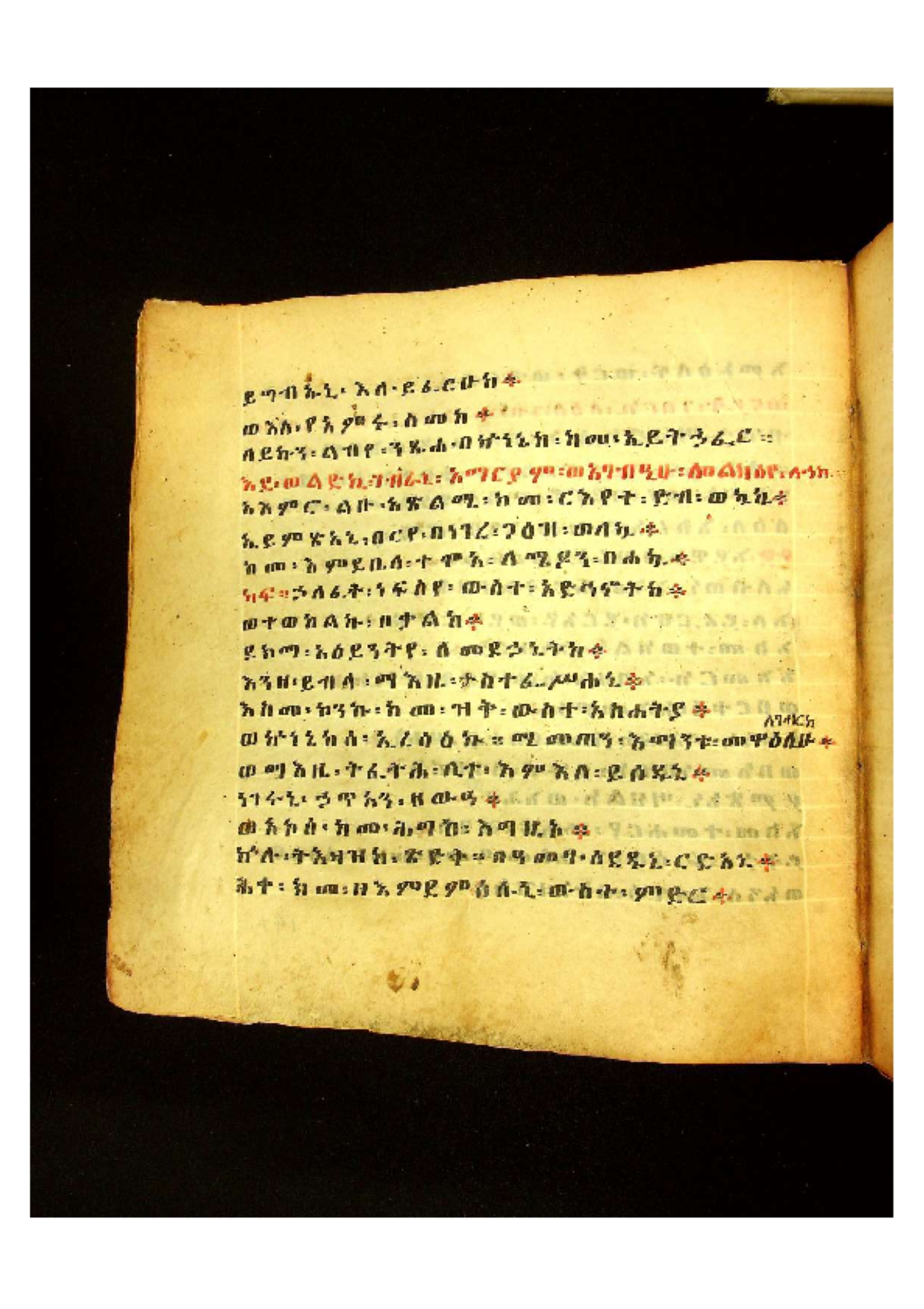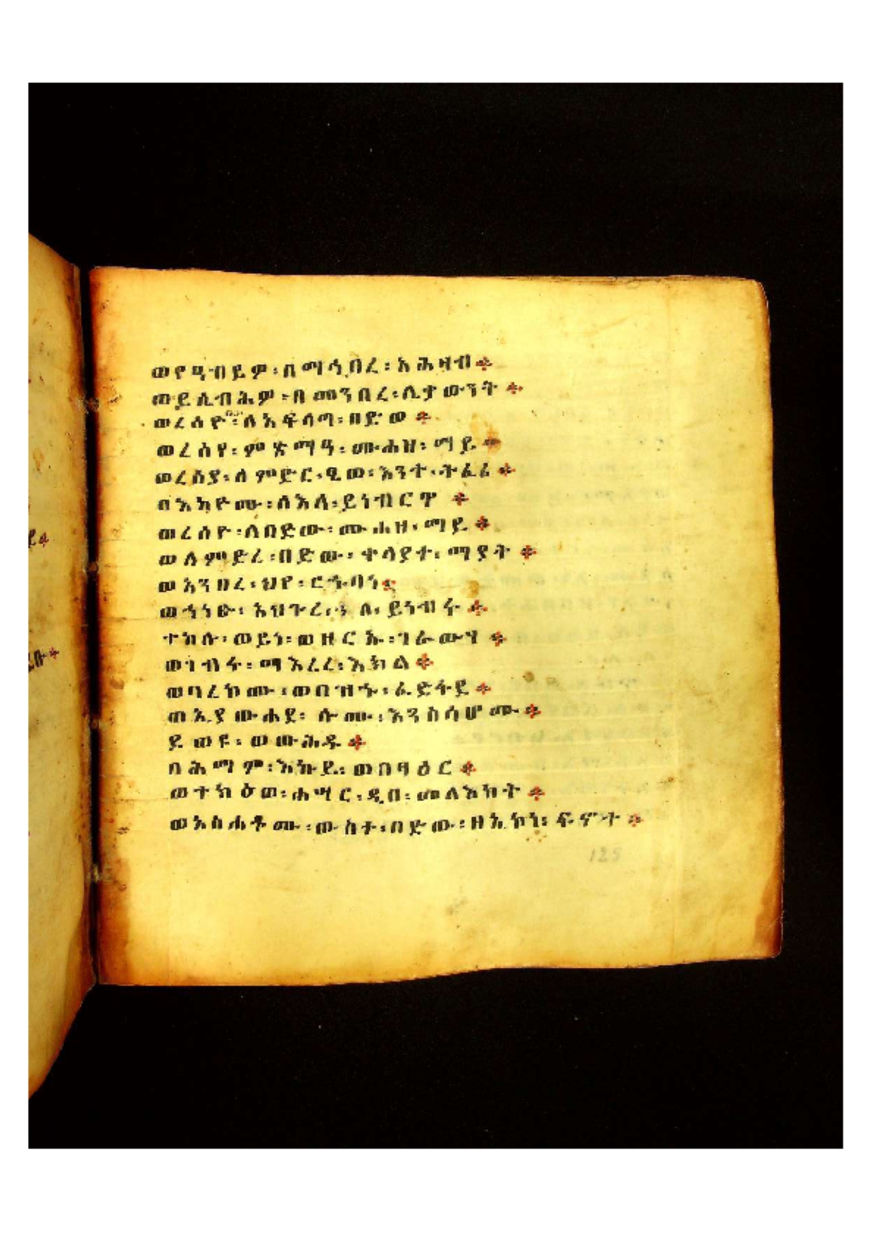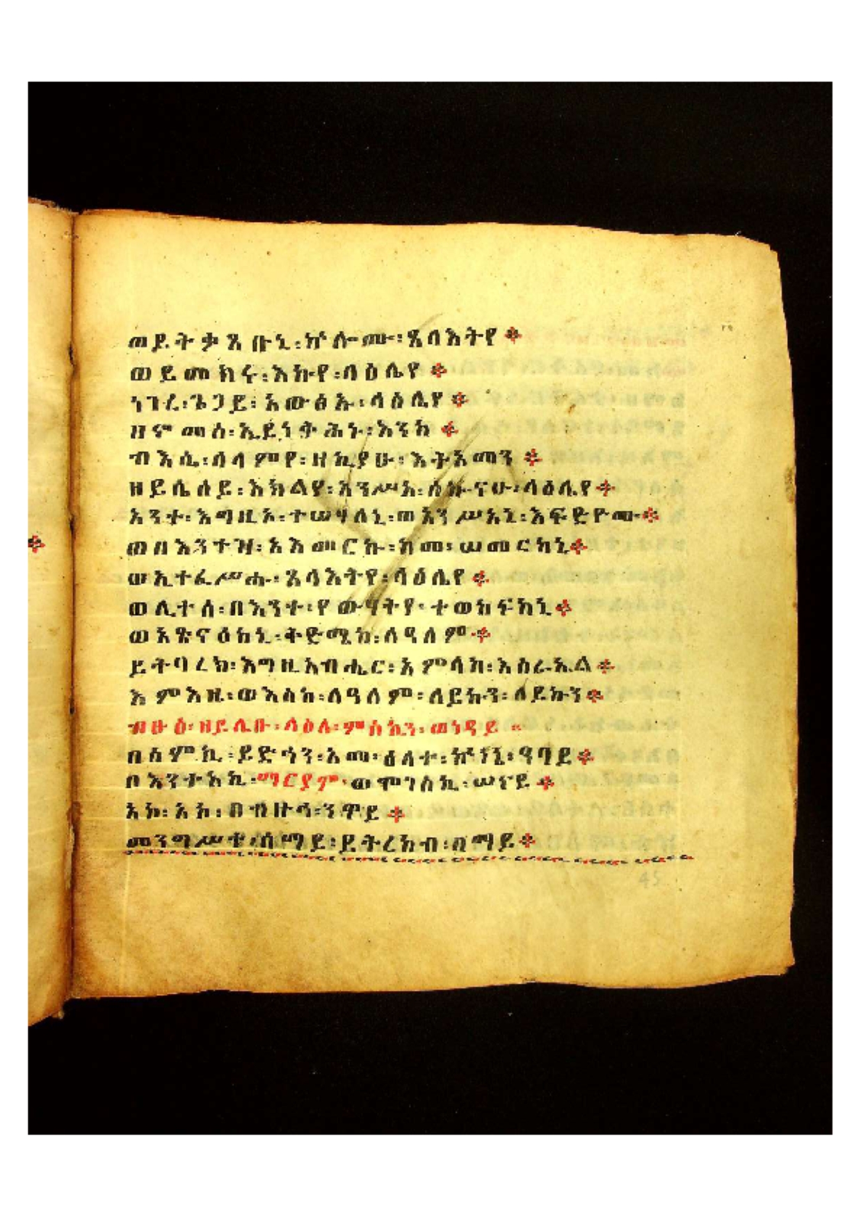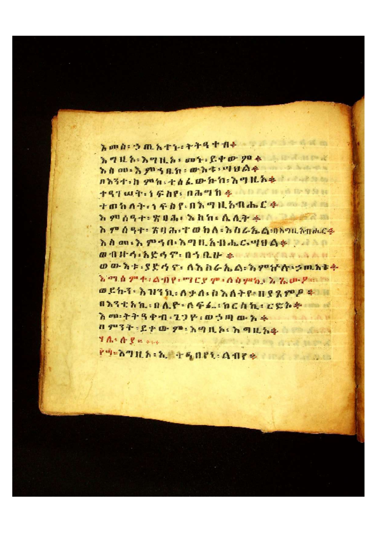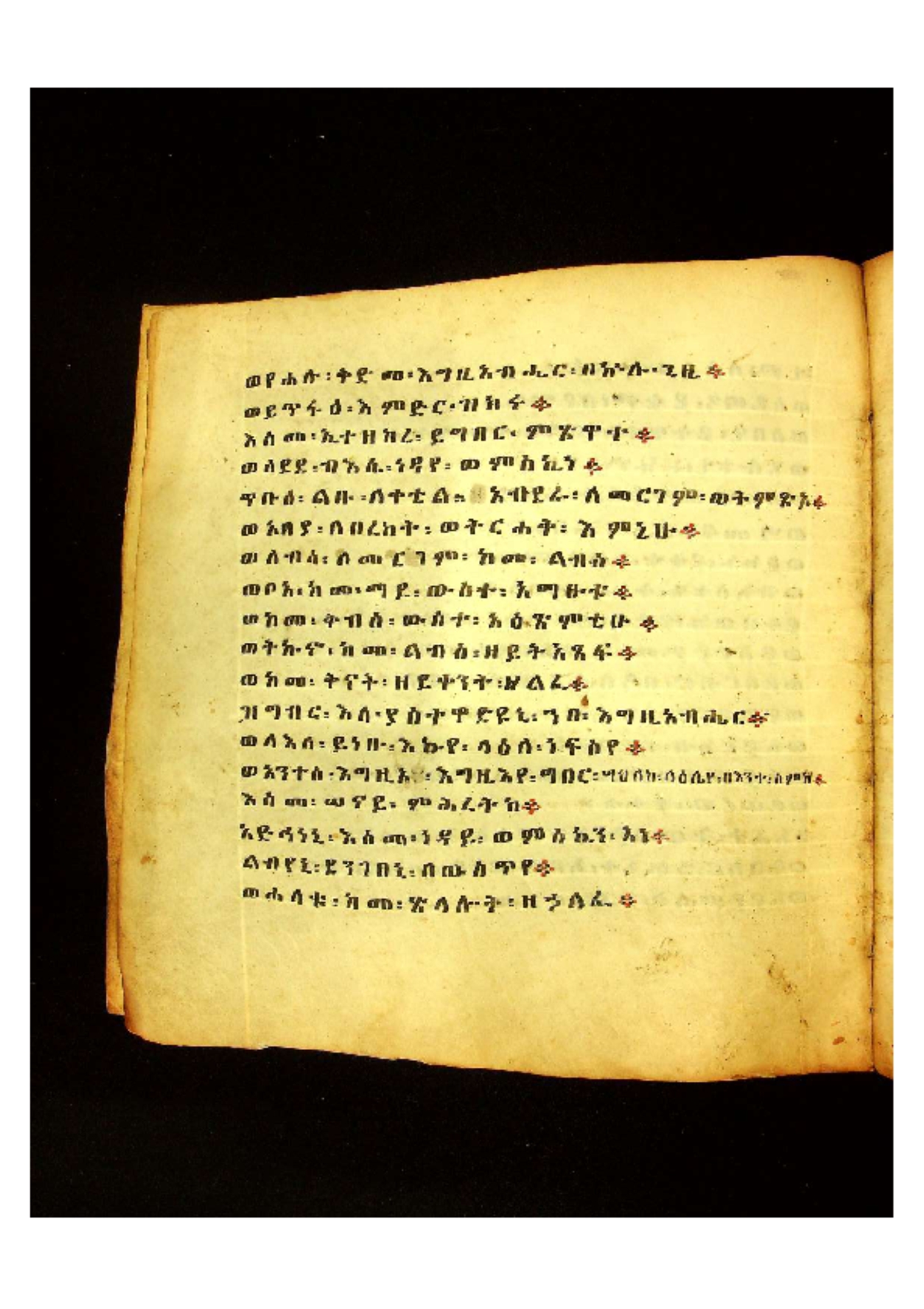 1. F. 2r: donation note written vertically in the outer margin, in black ink: “alla famiglia Bruschettini, Pussy […] Battaglia dell’Amba Aradam il 16 febbraio 1936 XIV”. The note, written in Italian and partly illegible, indicates the Bruschettini family as the receiver of the book and mentions the Battle of Amba Aradam, which took place on 16 February 1936. 2. F. 5r: note written in Italian in the outer upper margin, in red pencil: “Amba Aradam 16/2/XIV ore 17.30 P. Paloboni (?)”. This note also mentions the Battle of Amba Aradam, together with an individual whose name is partially unclear (P. Paloboni?). 3. F. 173v: supplication note written in small script in a mediocre hand, at the end of the “Psalms of David”: ዕቀበኒ፡ እምዓይነ፡ ደዌ፡ ወሞት፡ ለገብርከ፡ ደቅስዮስ፡, “protect me, your servant Däqsəyos, from the eye of infirmity and death”. The note mentions a certain Däqsəyos, indicated as “your servant” (possibly a later owner of the codex). 4. F. 173v: incipit of the Gəʿəz and Amharic prayer, perhaps a writing exercise. The note is written in an inaccurate calligraphy on the outer margin of the folio, next to the prayer. The entire text is የህፂ፡ ኖኅን፡ ከማየ[፡] አይኅ። እስራኤልን፡ ከፈርዖን፡ ዳዊትን፡ ከሳኦል፡ ከኢሎፍሊ። ኤ. 5. F. 190v: donation note, written in black ink in a mediocre hand. Text: ዝመጽሐፍ፡ ዘደብተራ፡ ኪሮስ፡ ዘወሀቦ፡ ለታቦተ፡ ሚካኤል፡ ኢትርስዑኒ፡ በአቡነ፡ ዘበሰማያት፡ ዘአቡየ፡ ገብረ፡ ማርያም፡ ወለእምየ፡ ወለተ፡ ሩፋኤል፡, “This book belongs to däbtära Kiros, who donated it to the tabot of [the church of St] Michael. Do not forget me for our Father who is in heaven. [It also belongs] to my father Gäbrä Maryam and my mother Wälättä Rufaʾel”. 6. F. 199v: writings executed in an inaccurate hand, perhaps the same of note 4. The note includes pen trials (ፈቲነ፡ ብርዕ፡ ዘፈረና፡ etc.), reproduces the explicit of the “Song of the songs” (ስብሐታተኪ፡ ማርያም፡ ከመ፡ እንተ፡ ሕልቀት፡ etc.) and the incipit of the “Praise of Mary” (ውዳሴ፡ ዘሰኑይ፡ ፈቀደ፡ እግዚእ፡ etc., partly rubricated). The writings also mention Däqsəyos, indicated as “your servant” (possibly a later owner of the codex) 7. F. 220ra–va: Genealogic note written on two columns. The note illustrates the family tree of King Yoḥannǝs I, who reigned from 1667 to 1682. The text is acephalous. Incipit: [ወለ]ደ፡ እምሐና፡ ብእሲቱ፡ አሦተ፡ ቅዱሳንሃ፡ ወአሦተ፡ ቅዱሳንኒ፡ እምነ፡ ጳውሊ፡ ብእሲሃ፡ ወለደቶሙ፡ ለአቤተኁን፡ ማእምሮ፡ ወለዘሥላሴ፡ ወአቤተኁን፡ ማእምሮኒ፡ ወለደ፡ አቃርዮስ፡ ወአቃርዮስኒ፡ ወለደ፡ እመቤት፡ እኅተ፡ ክርስቶስሃ፡. The text is published and translated in Proverbio D.V., 2000, ‘Inventario sommario dei manoscritti arabi, ebraici, etiopici – con notizia dei turchi – conservati presso la Biblioteca della Badia di Grottaferrata’. Atti della Accademia nazionale dei Lincei, Memorie, Classe di scienze morali, storiche e filologiche, serie IX, 12 (2000), 468–570 (here pp. 496–97, Appendice III). 8. F. 220va–b: Protective prayer against snakes, written on two columns. Incipit: በስመ፡ አብ፡ … ጸሎት፡ በእንተ፡ ዓርዌ፡ ምድር። ሶበ፡ በጽሐ፡ መልእክት፡ ሐሰውከ፡ በል፡ ፫ጊዜ፡ አኂዘከ፡ ዘፈረ፡ ልብሰ፡ ለእመ፡ ሀሎ፡ ርሑቀ፡ አስትዮ፡. The prayer is probably written in the same hand of note 7. 9. F. 220vb: Unidentified magic prayer containing asmat-names. Incipit: በስመ፡ አብ፡ … ኦላዘላህም፡ አህጉረ፡ ቀዳ[.]፡ ፍሖም፡ ሊስ፡ አፍሊስ፡ ምልክዮስ፡ ዘ[..]ማኤል፡ በዝንቱ፡ አስማቲከ፡ [.]ጽ[..] ኃይለ፡ በረድ፡ ወነፋስ፡ ከማሁ፡. |