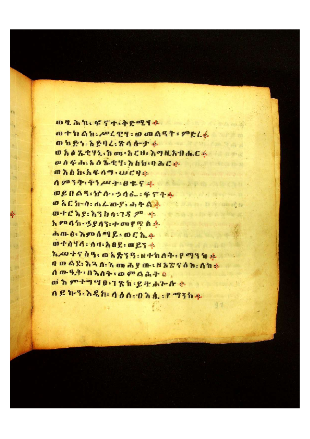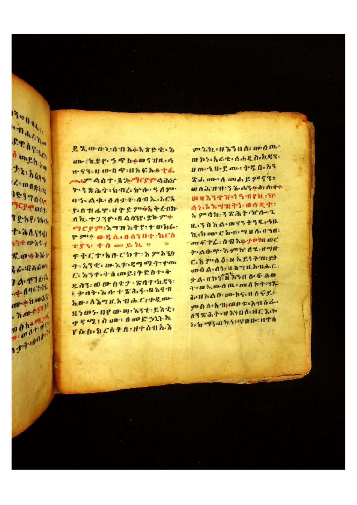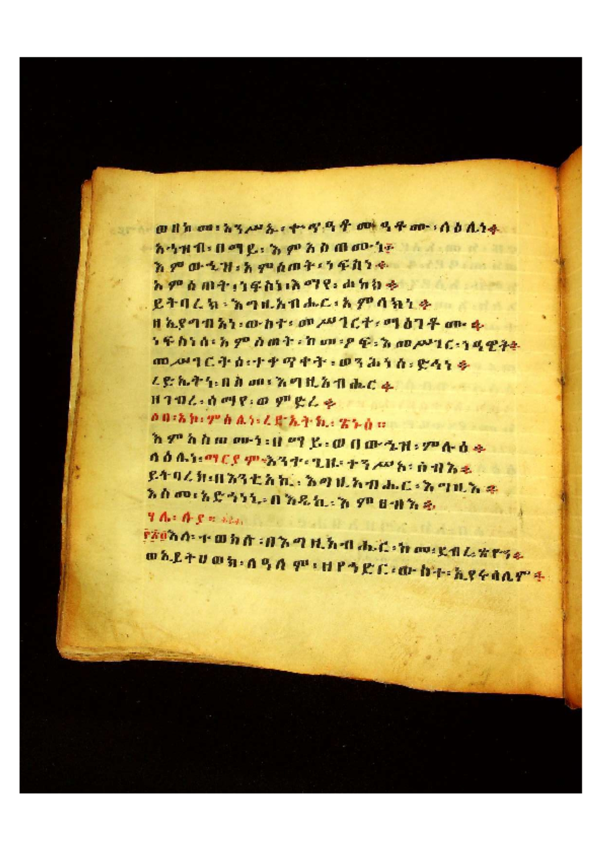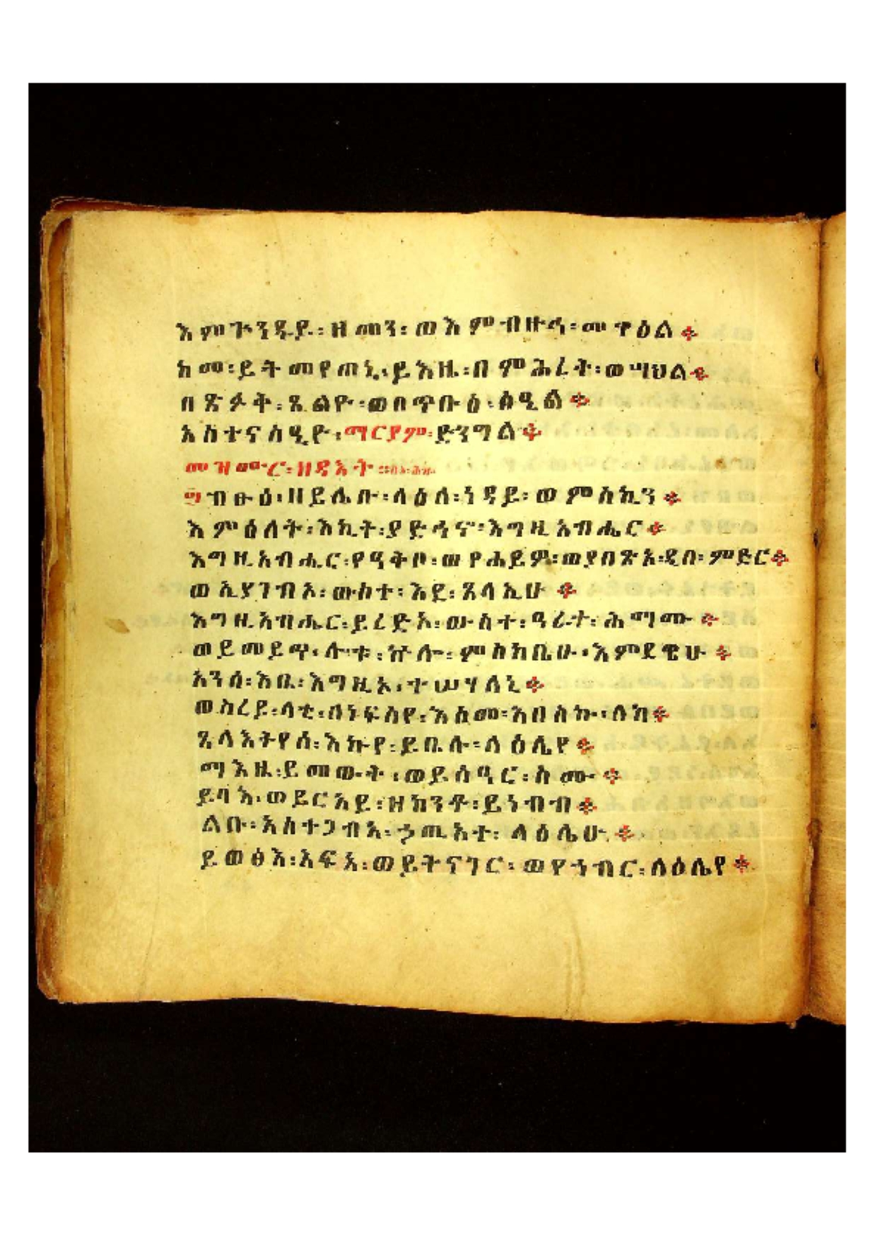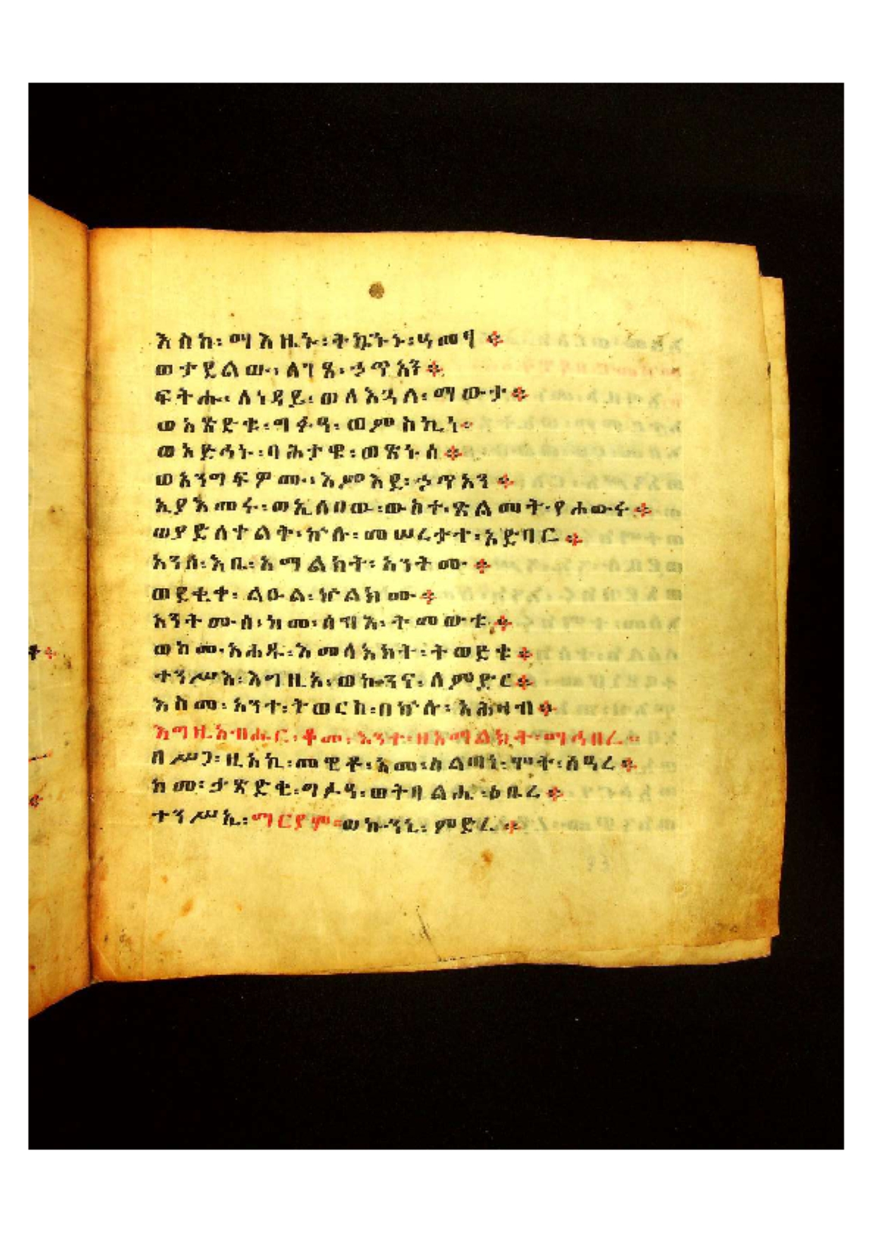 1. F. 2r: donation note written vertically in the outer margin, in black ink: “alla famiglia Bruschettini, Pussy […] Battaglia dell’Amba Aradam il 16 febbraio 1936 XIV”. The note, written in Italian and partly illegible, indicates the Bruschettini family as the receiver of the book and mentions the Battle of Amba Aradam, which took place on 16 February 1936. 2. F. 5r: note written in Italian in the outer upper margin, in red pencil: “Amba Aradam 16/2/XIV ore 17.30 P. Paloboni (?)”. This note also mentions the Battle of Amba Aradam, together with an individual whose name is partially unclear (P. Paloboni?). 3. F. 173v: supplication note written in small script in a mediocre hand, at the end of the “Psalms of David”: ዕቀበኒ፡ እምዓይነ፡ ደዌ፡ ወሞት፡ ለገብርከ፡ ደቅስዮስ፡, “protect me, your servant Däqsəyos, from the eye of infirmity and death”. The note mentions a certain Däqsəyos, indicated as “your servant” (possibly a later owner of the codex). 4. F. 173v: incipit of the Gəʿəz and Amharic prayer, perhaps a writing exercise. The note is written in an inaccurate calligraphy on the outer margin of the folio, next to the prayer. The entire text is የህፂ፡ ኖኅን፡ ከማየ[፡] አይኅ። እስራኤልን፡ ከፈርዖን፡ ዳዊትን፡ ከሳኦል፡ ከኢሎፍሊ። ኤ. 5. F. 190v: donation note, written in black ink in a mediocre hand. Text: ዝመጽሐፍ፡ ዘደብተራ፡ ኪሮስ፡ ዘወሀቦ፡ ለታቦተ፡ ሚካኤል፡ ኢትርስዑኒ፡ በአቡነ፡ ዘበሰማያት፡ ዘአቡየ፡ ገብረ፡ ማርያም፡ ወለእምየ፡ ወለተ፡ ሩፋኤል፡, “This book belongs to däbtära Kiros, who donated it to the tabot of [the church of St] Michael. Do not forget me for our Father who is in heaven. [It also belongs] to my father Gäbrä Maryam and my mother Wälättä Rufaʾel”. 6. F. 199v: writings executed in an inaccurate hand, perhaps the same of note 4. The note includes pen trials (ፈቲነ፡ ብርዕ፡ ዘፈረና፡ etc.), reproduces the explicit of the “Song of the songs” (ስብሐታተኪ፡ ማርያም፡ ከመ፡ እንተ፡ ሕልቀት፡ etc.) and the incipit of the “Praise of Mary” (ውዳሴ፡ ዘሰኑይ፡ ፈቀደ፡ እግዚእ፡ etc., partly rubricated). The writings also mention Däqsəyos, indicated as “your servant” (possibly a later owner of the codex) 7. F. 220ra–va: Genealogic note written on two columns. The note illustrates the family tree of King Yoḥannǝs I, who reigned from 1667 to 1682. The text is acephalous. Incipit: [ወለ]ደ፡ እምሐና፡ ብእሲቱ፡ አሦተ፡ ቅዱሳንሃ፡ ወአሦተ፡ ቅዱሳንኒ፡ እምነ፡ ጳውሊ፡ ብእሲሃ፡ ወለደቶሙ፡ ለአቤተኁን፡ ማእምሮ፡ ወለዘሥላሴ፡ ወአቤተኁን፡ ማእምሮኒ፡ ወለደ፡ አቃርዮስ፡ ወአቃርዮስኒ፡ ወለደ፡ እመቤት፡ እኅተ፡ ክርስቶስሃ፡. The text is published and translated in Proverbio D.V., 2000, ‘Inventario sommario dei manoscritti arabi, ebraici, etiopici – con notizia dei turchi – conservati presso la Biblioteca della Badia di Grottaferrata’. Atti della Accademia nazionale dei Lincei, Memorie, Classe di scienze morali, storiche e filologiche, serie IX, 12 (2000), 468–570 (here pp. 496–97, Appendice III). 8. F. 220va–b: Protective prayer against snakes, written on two columns. Incipit: በስመ፡ አብ፡ … ጸሎት፡ በእንተ፡ ዓርዌ፡ ምድር። ሶበ፡ በጽሐ፡ መልእክት፡ ሐሰውከ፡ በል፡ ፫ጊዜ፡ አኂዘከ፡ ዘፈረ፡ ልብሰ፡ ለእመ፡ ሀሎ፡ ርሑቀ፡ አስትዮ፡. The prayer is probably written in the same hand of note 7. 9. F. 220vb: Unidentified magic prayer containing asmat-names. Incipit: በስመ፡ አብ፡ … ኦላዘላህም፡ አህጉረ፡ ቀዳ[.]፡ ፍሖም፡ ሊስ፡ አፍሊስ፡ ምልክዮስ፡ ዘ[..]ማኤል፡ በዝንቱ፡ አስማቲከ፡ [.]ጽ[..] ኃይለ፡ በረድ፡ ወነፋስ፡ ከማሁ፡. |